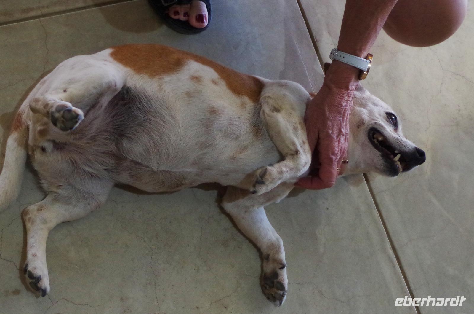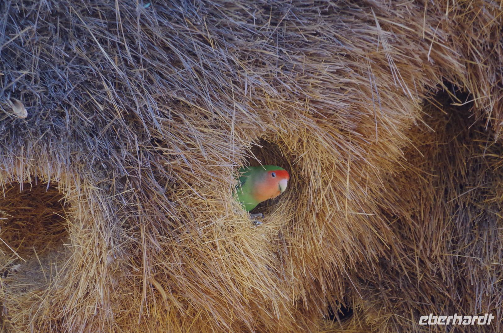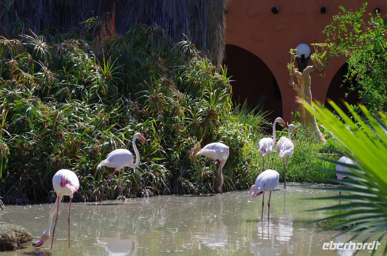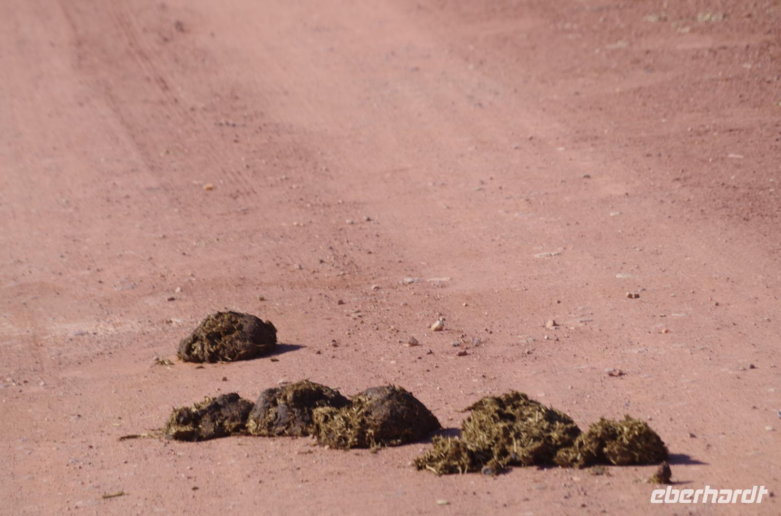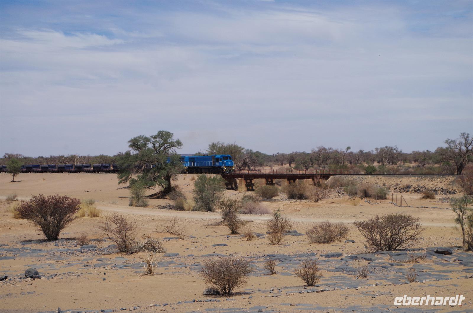 Nach dem Frühstück fuhren wir wieder in südliche Richtung. Wir passierten wir den Veterinärzaun, der sich wie eine rote Linie quer durch Namibia, Botswana und Simbabwe zieht. Eine freundliche Beamtin kontrollierte unsere Vorräte, den der Transport von Fleisch und anderen tierrischen Produkten ist verboten. Via Kamanjab truckten wir wiederum durch Farmgebiet, bis wir das Eoaacha Game Reserve erreichten. Hier wurden wir zugleich von Giraffen begrüßt. Von weiten sahen wir bereits die Eagle Tented Lodge, deren Zelt-Chaltes sich entlang der Bergkette schlängeln. Die Zelte waren komfortabel ausgestattet: Eigene Terrasse mit Ausblick (einige mit Außen-Badewanne), Himmelbett mit Moskitonetz sowie Bad en-suite. An diesem Tag war es wieder ungewöhnlich heiß, über 45 °C und kein Windchen, obwohl wir ober auf dem Berg waren. Entsprechend kuschlig war es in unseren Zelten. Warmes Wasser hatten wir auch ausreichend?? Eine Abkühlung versprach nur das Pool am Hauptgebäude der Lodge, dass einem Dornröschenschloss ähnelte. Auf der Gartenterrasse wurde Kaffee und Kuchen serviert. Abends traf man sich auf einen Sundowner und Giraffen waren auch zu Gast. Denn direkt davor, war eine Wasserstelle, die von den Tieren in dieser Dürre gern genutzt wurde. Ja, Giraffen oder besser Schiraffen gab es hier unzählige. Sie spazierten einfach durch das Gelände, vor unseren Augen. Tagesetappe: 450 km