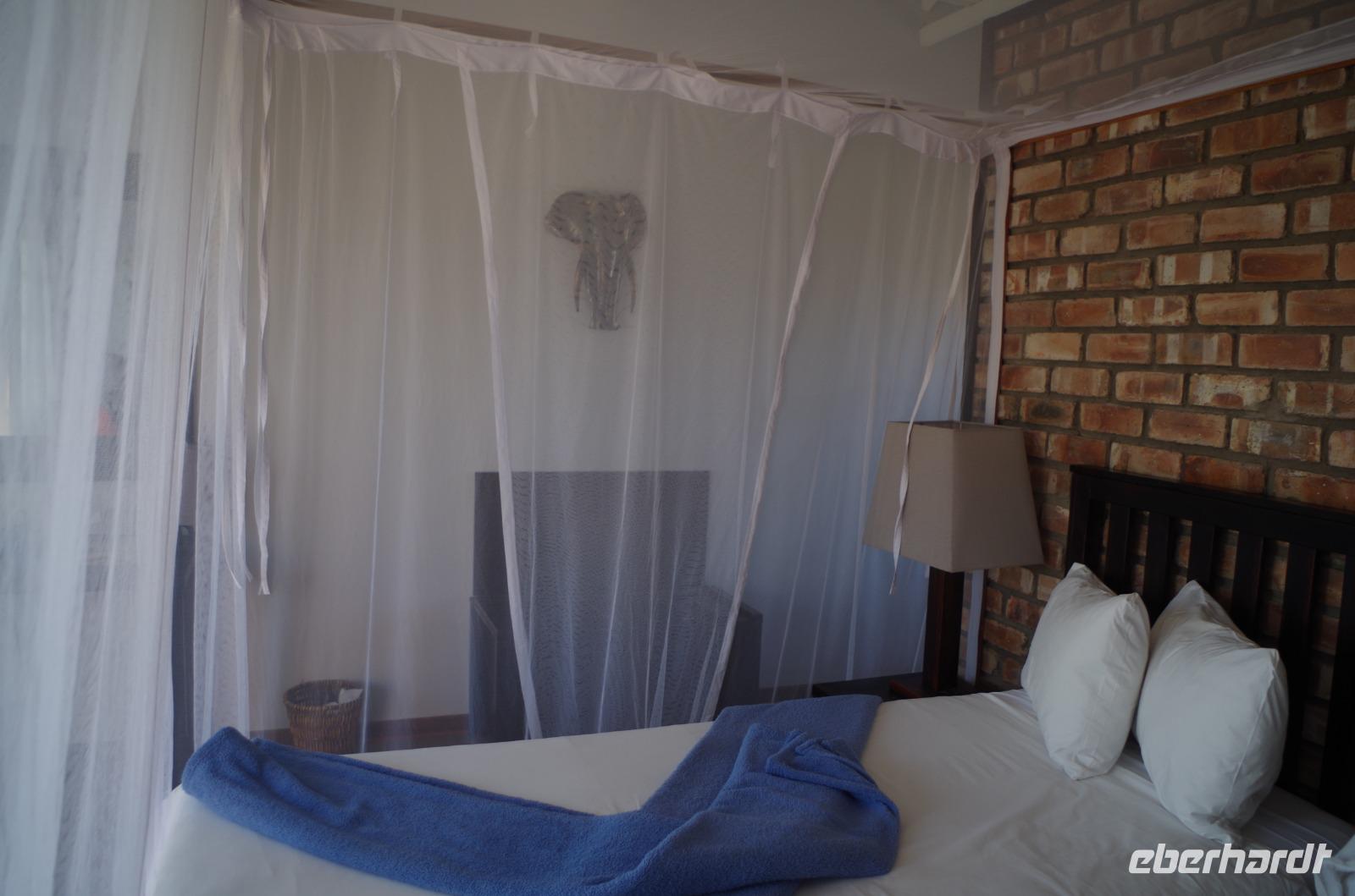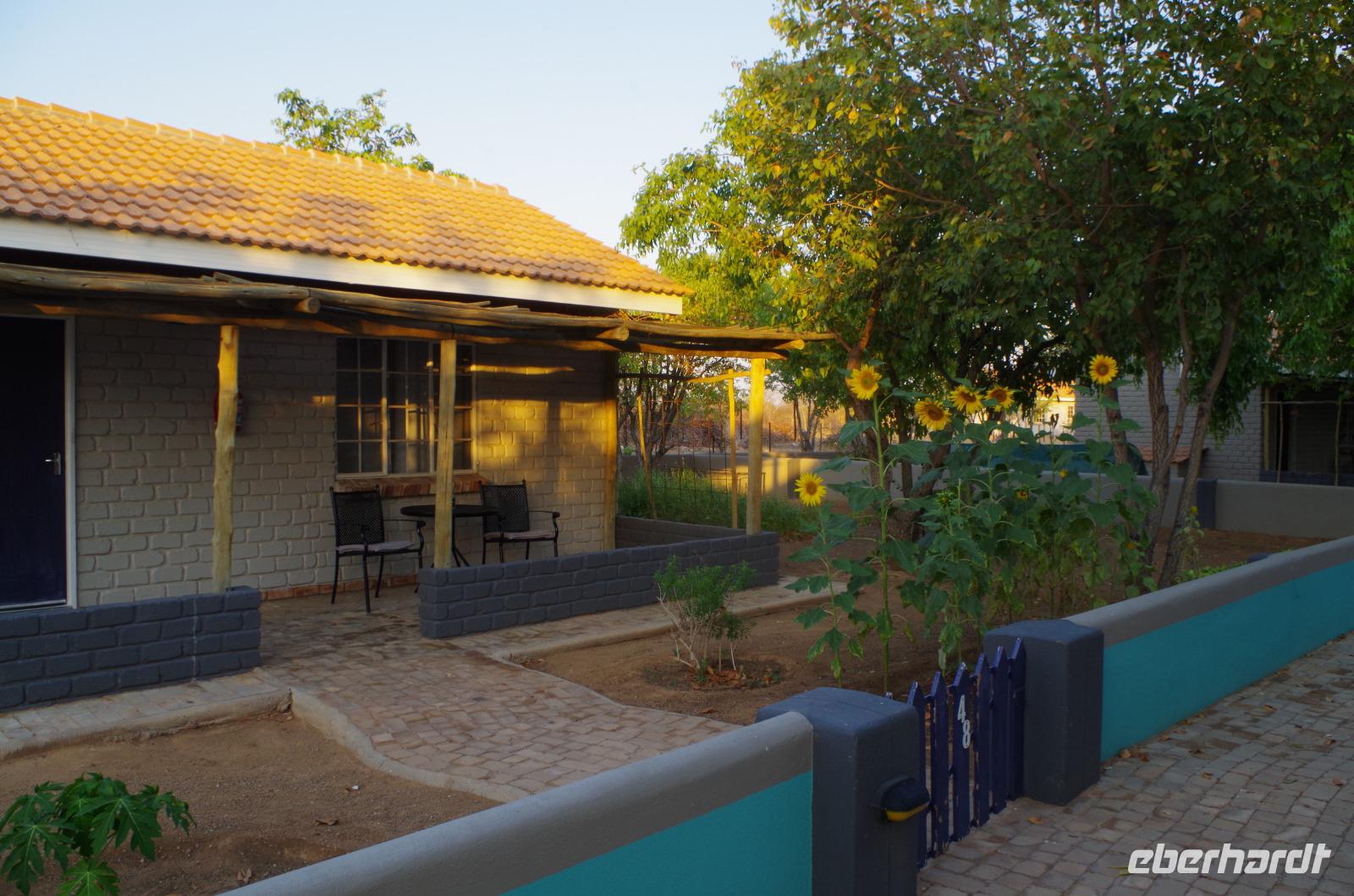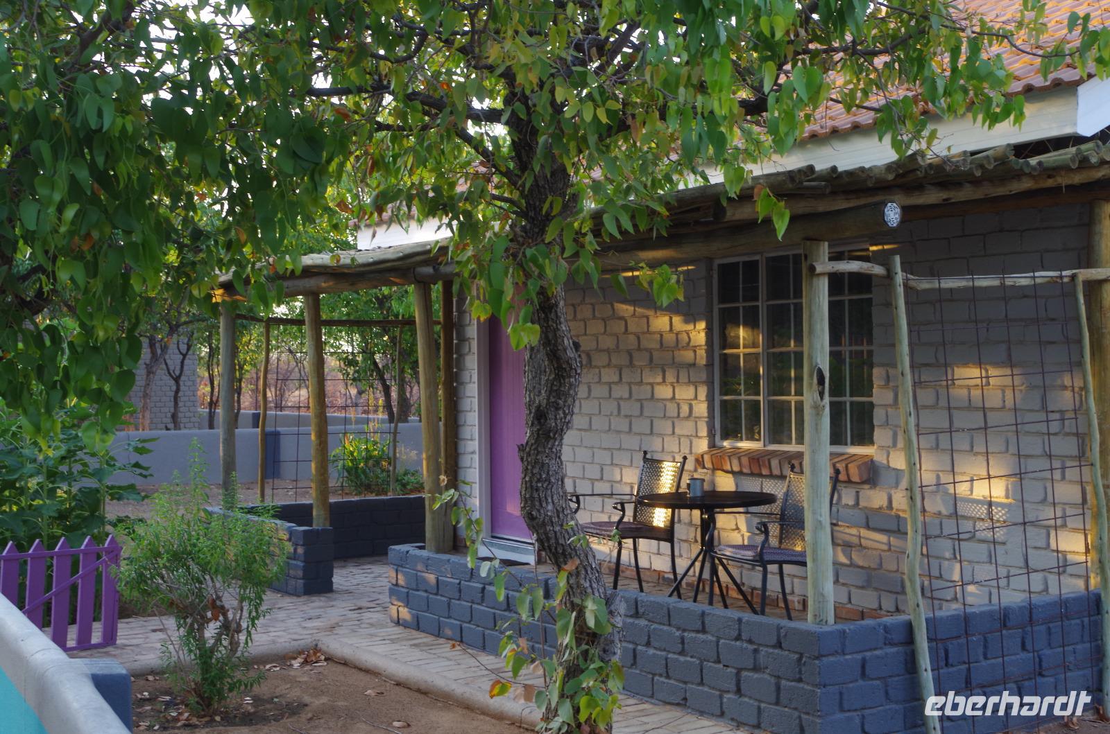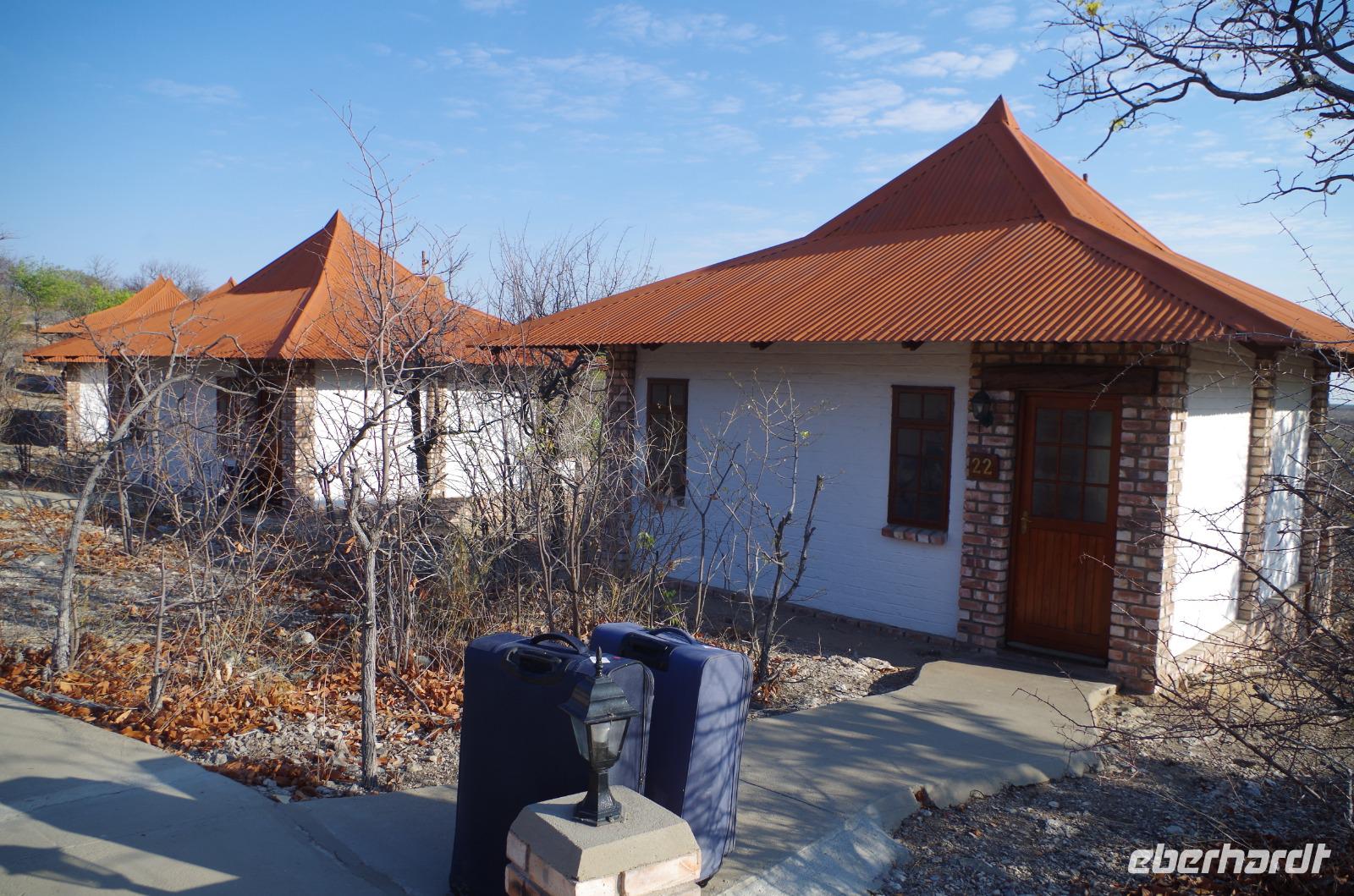 Die zahlreichen Mopane-Bäume auf dem Gelände geben der Lodge ihren Namen. Für diese Nacht wohnten wir in hübschen, komfortablen Lauben mit eigenem Garten, wo Gemüse und Kräuter für den Eigenverbrauch in der Küche angebaut werden. Zum Abendessen bedienten wir uns am großen Buffet, die Vor- und Nachspeise wurde serviert. - Tagesetappe im Truck: 472 Km