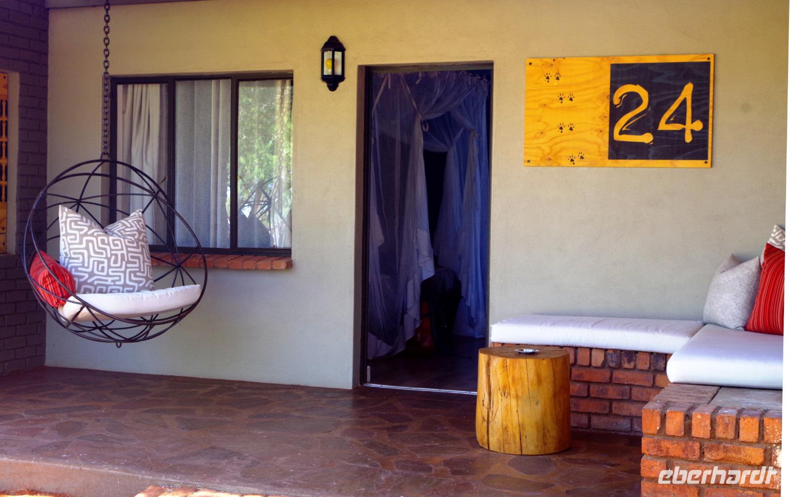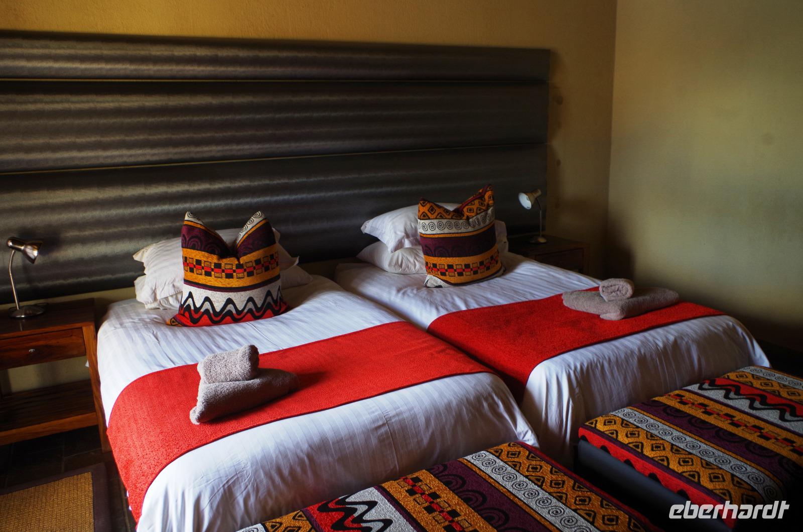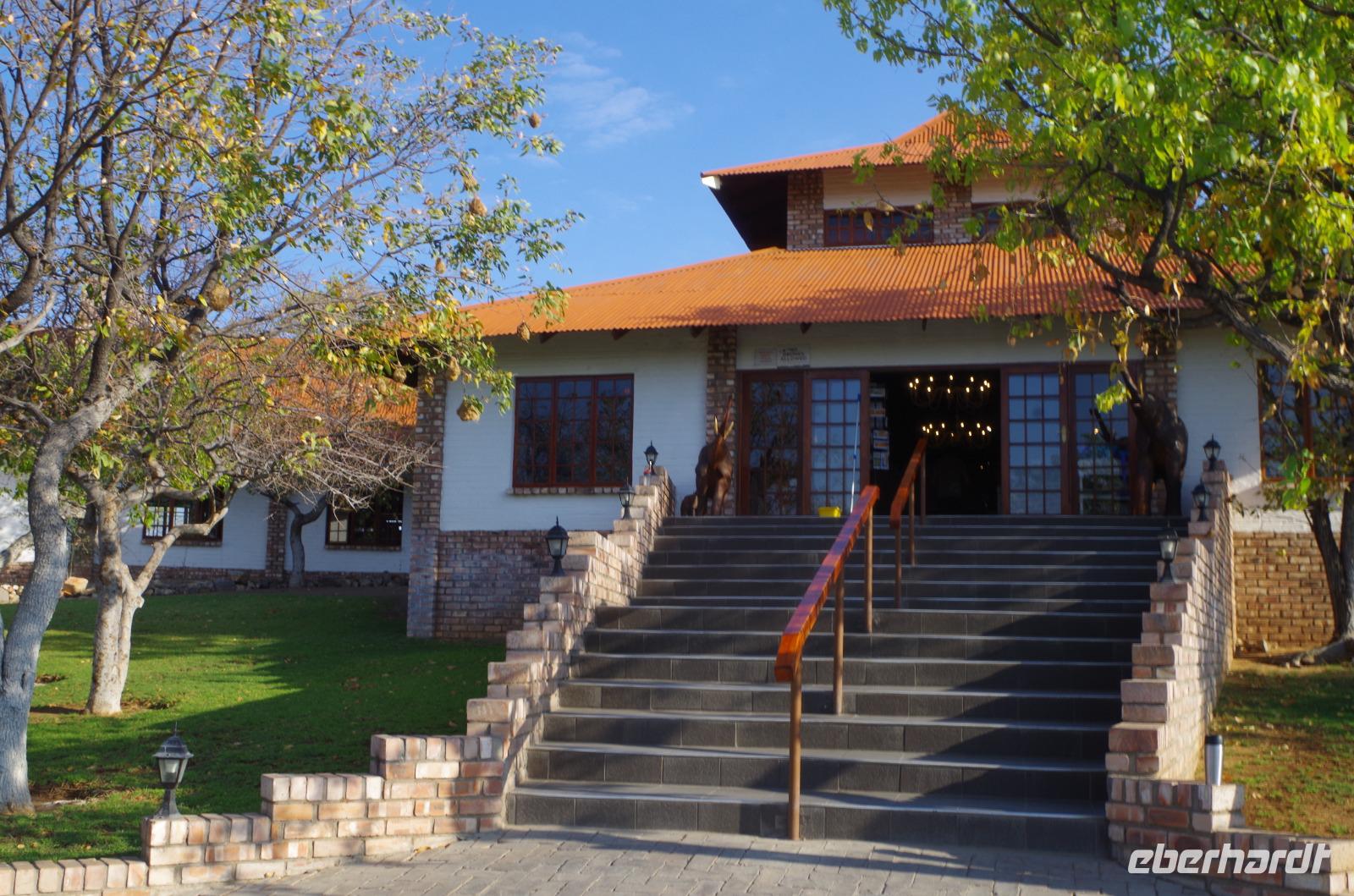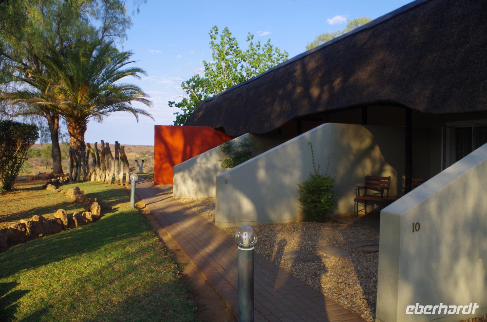 Die zahlreichen Mopane-Bäume auf dem Gelände geben der Lodge ihren Namen. Für diese Nacht wohnten wir in hübschen, komfortablen Lauben mit eigenem Garten, wo Gemüse und Kräuter für den Eigenverbrauch in der Küche angebaut werden. Zum Abendessen bedienten wir uns am großen Buffet, die Vor- und Nachspeise wurde serviert. - Tagesetappe im Truck: 472 Km