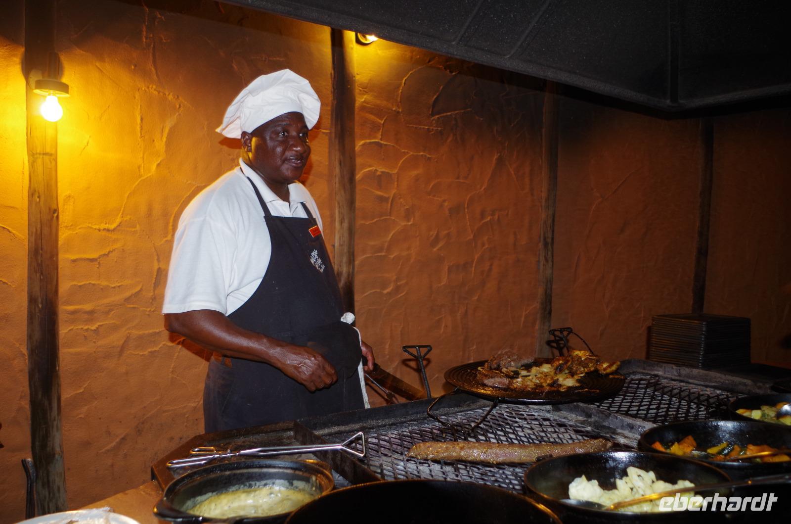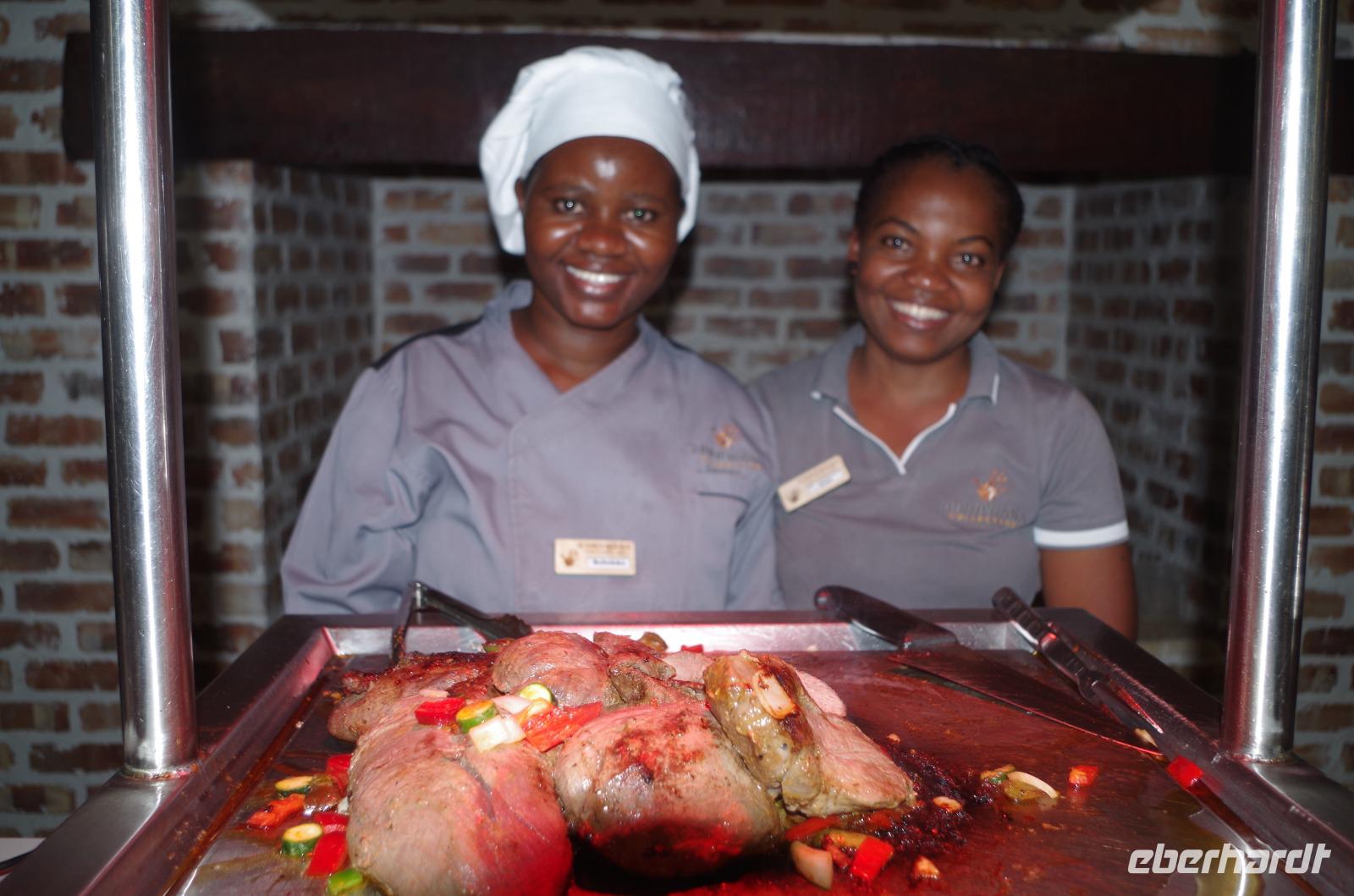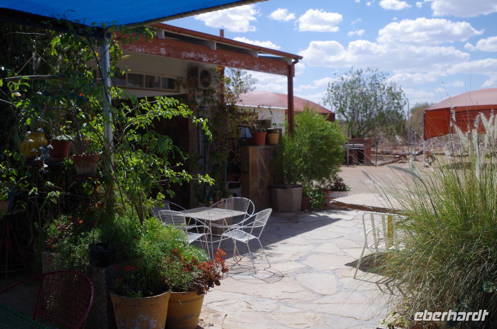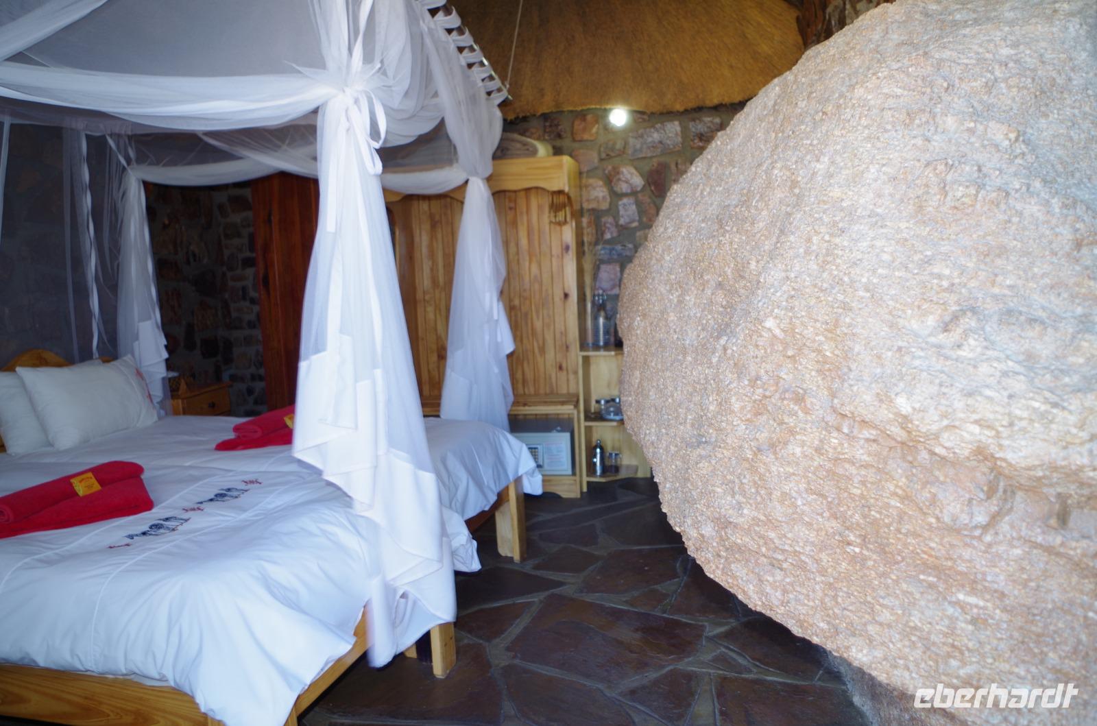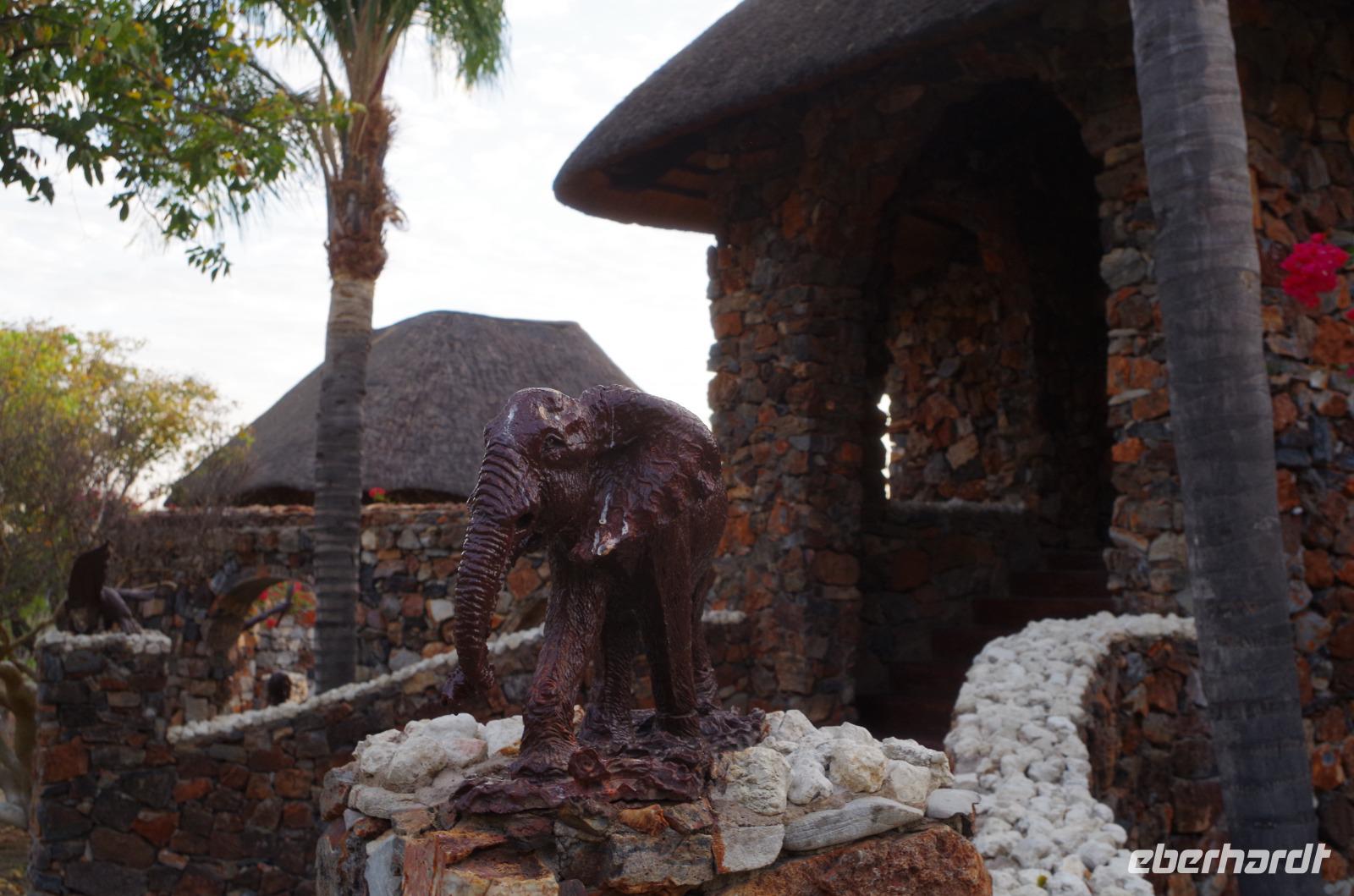 Die zahlreichen Mopane-Bäume auf dem Gelände geben der Lodge ihren Namen. Für diese Nacht wohnten wir in hübschen, komfortablen Lauben mit eigenem Garten, wo Gemüse und Kräuter für den Eigenverbrauch in der Küche angebaut werden. Zum Abendessen bedienten wir uns am großen Buffet, die Vor- und Nachspeise wurde serviert. - Tagesetappe im Truck: 472 Km