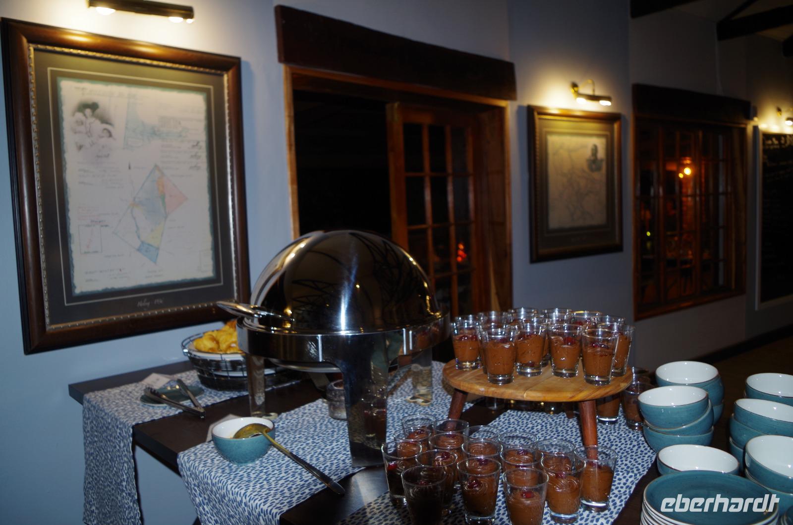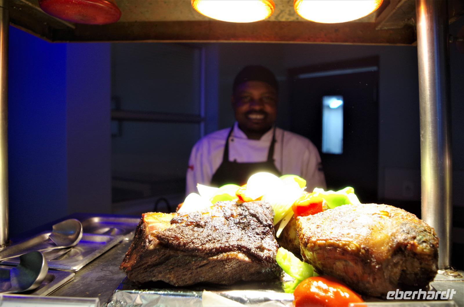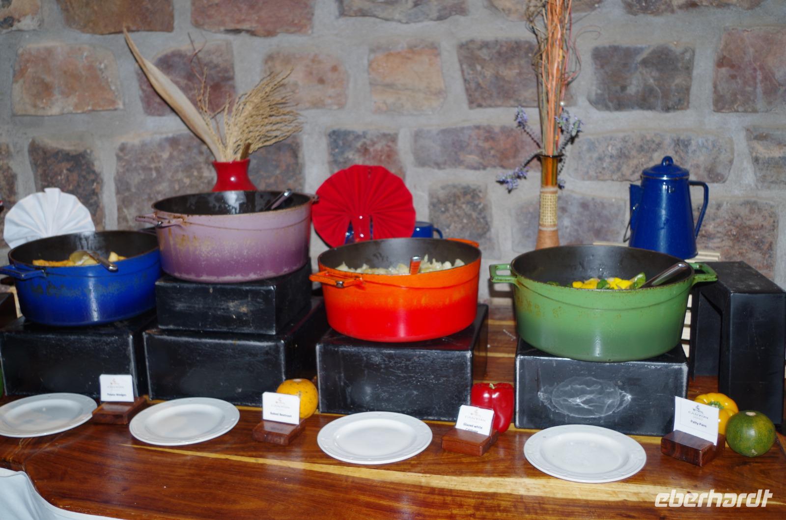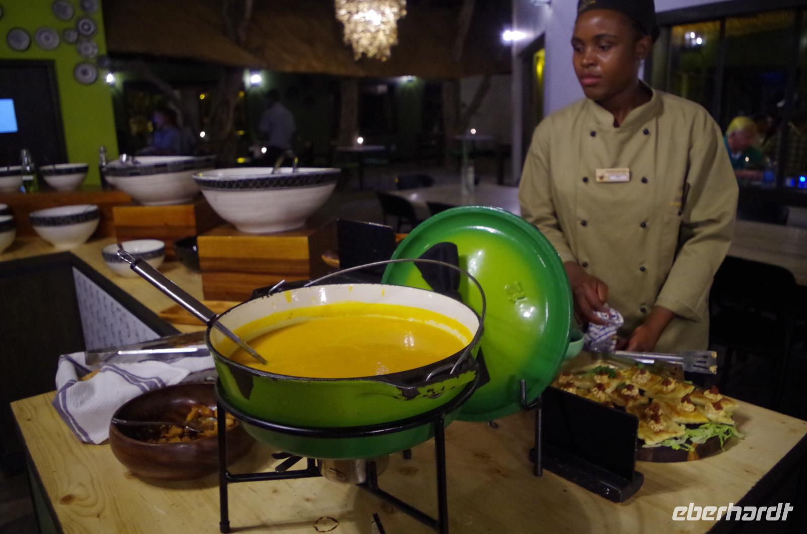 Die zahlreichen Mopane-Bäume auf dem Gelände geben der Lodge ihren Namen. Für diese Nacht wohnten wir in hübschen, komfortablen Lauben mit eigenem Garten, wo Gemüse und Kräuter für den Eigenverbrauch in der Küche angebaut werden. Zum Abendessen bedienten wir uns am großen Buffet, die Vor- und Nachspeise wurde serviert. - Tagesetappe im Truck: 472 Km
