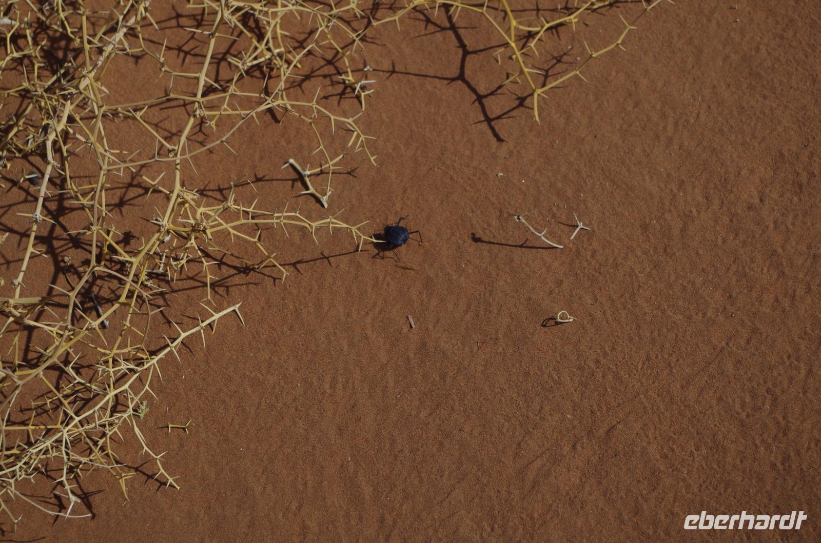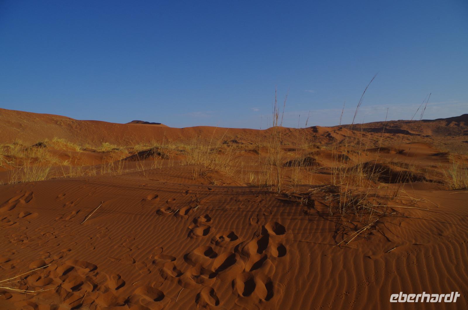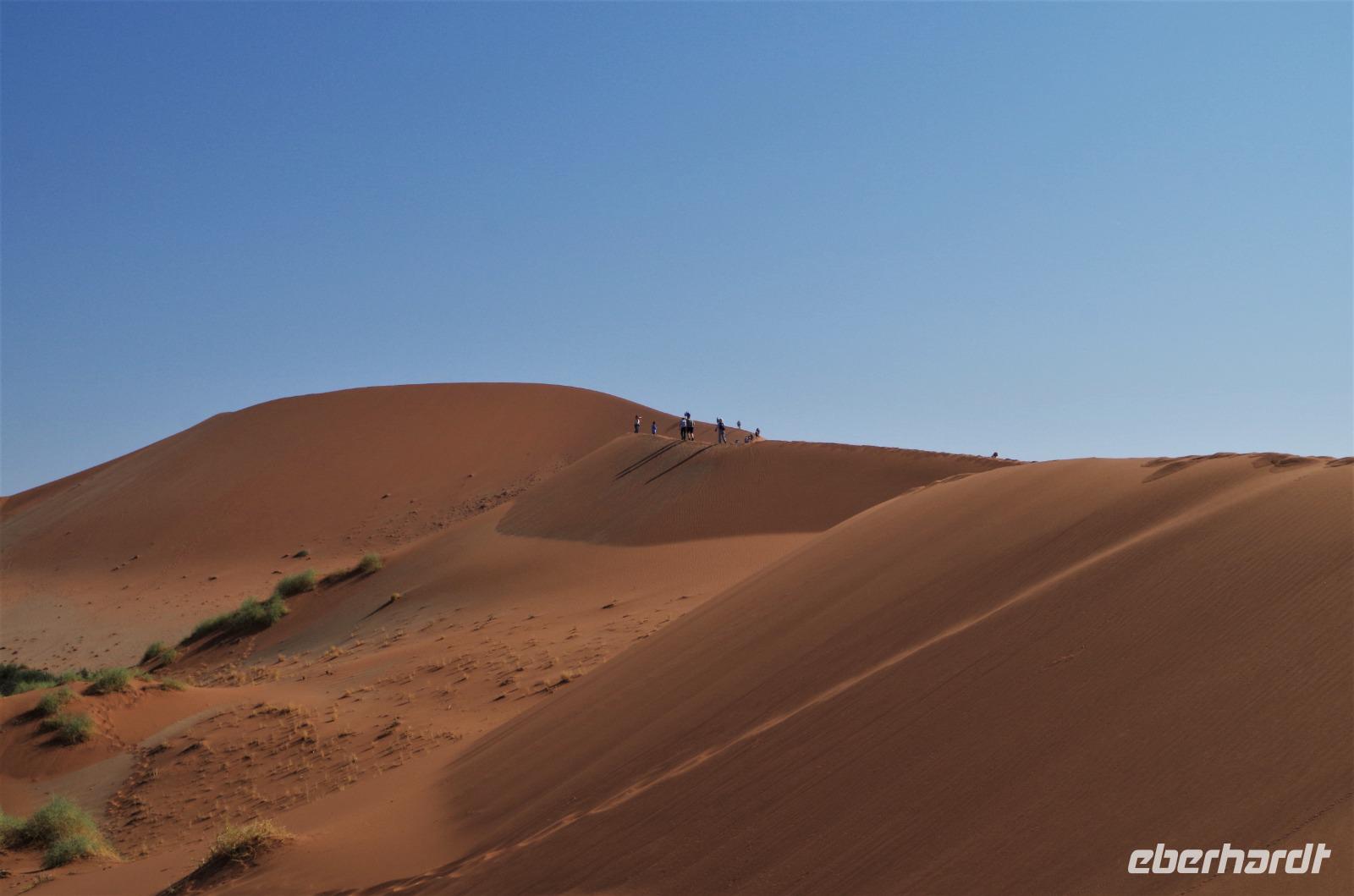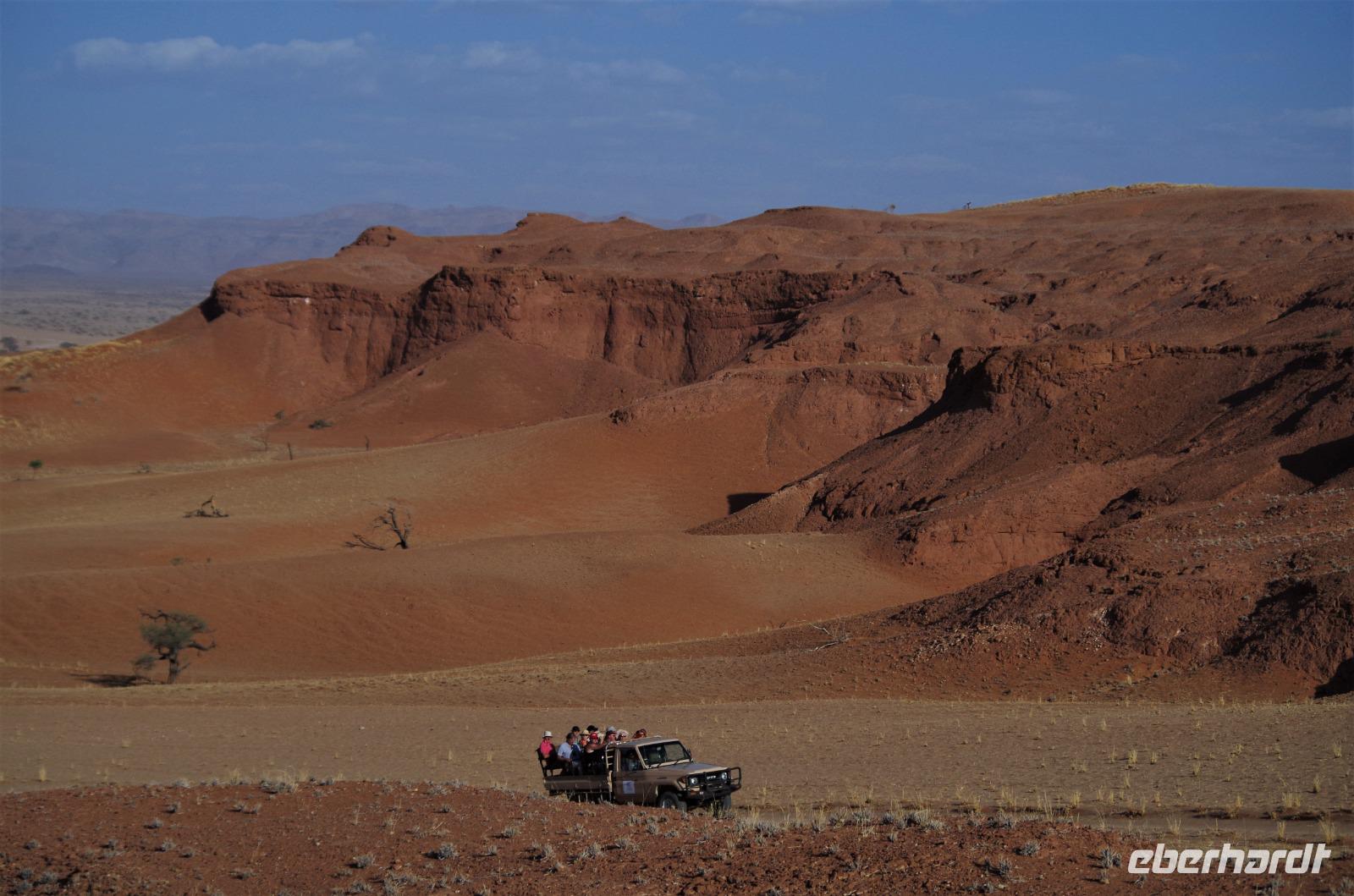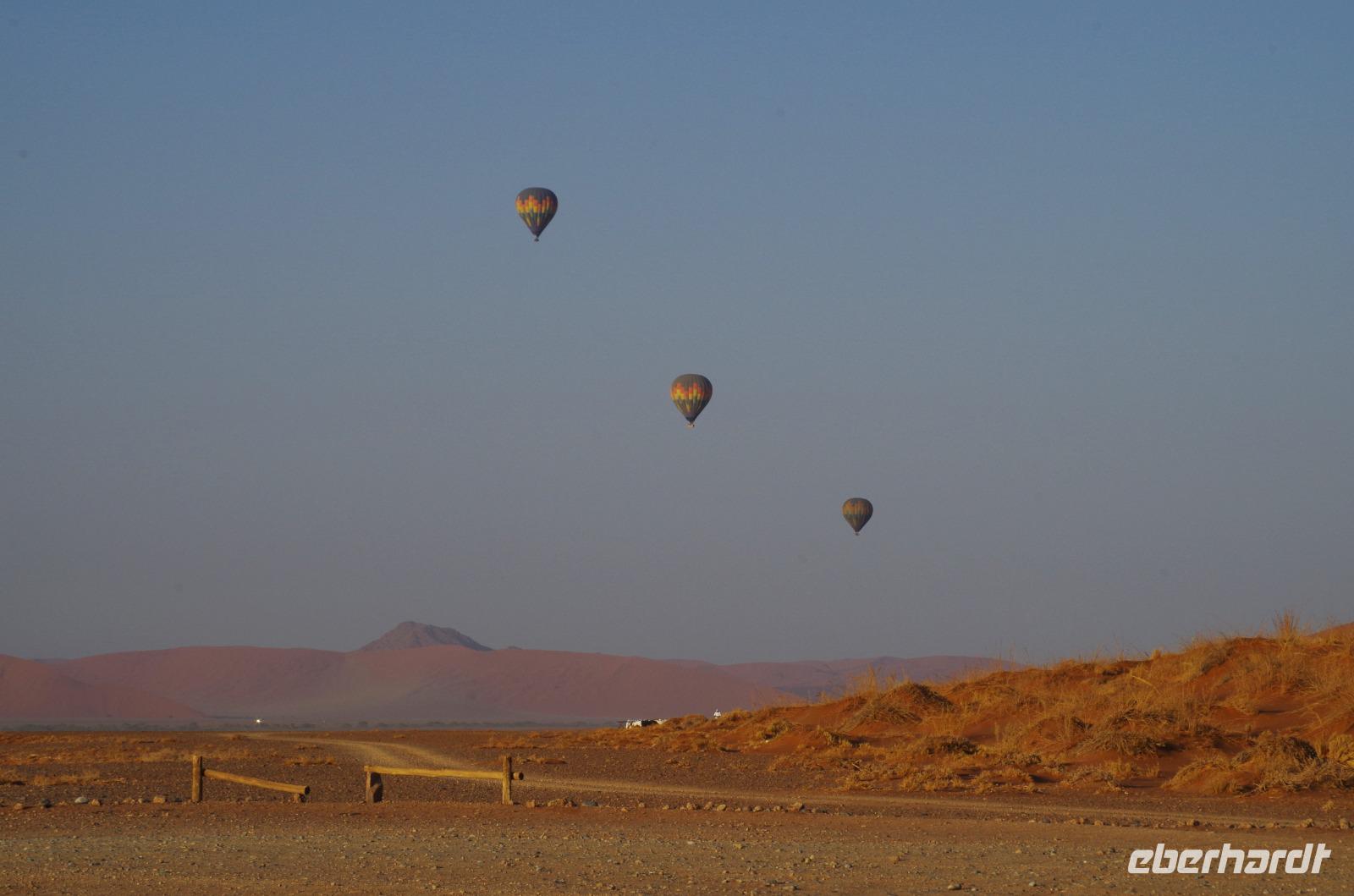 Frühes Aufstehen war heute Pflicht, denn unser Ziel war die Namib, deren Dünen zu den höchsten der Welt gehören. Es war noch dunkel, als wir uns zum Early-Breakfast trafen. Wir verstauten die Lunchpakete im Truck und los ging es. Ein kleines Nickerchen war leider nicht möglich, denn besonders die Zufahrtspad zum Eingang des Sossusvlei ist extrem schlecht. Hier muß dringend was getan werden, wie auf vielen anderen touristischen Strecken. Der Staat hat dazu leider kein Geld und so nehmen es private Menschen in die Hand. Wie Chris Theron, der mit einem einzigartigen Projekt, welches aus Spenden finanziert wird, die Pads saniert. Die Sonne war nun aufgegangen und wir passierten den Eingang. Im frühen Morgenlicht erstrahlen die hohen Dünen (bis ca. 400 m hoch) im satten Rot im Kontrast zum klaren Himmel. Wir sahen auch viele Ballons, die ihren morgendlichen Ausflug über der Namib gerade beendeten. Vorbei an der Düne 45 fuhren zum 4x4-Parkplatz. Dort wappneten wir uns für den sandig-heißen Ausflug. Wir stiegen in offene 4x4-Shuttlefahrzeuge um, die uns rasant durch das sandige Flussbett des ausgetrockneten Tsauchab-Fluss bis zum Sossusvlei (Lehmsenke) fuhren. Dort stiegen wir aus und Fritz erzählte uns viel Interessantes zur Entstehung der Wüste und weihte uns ins Spurenlesen ein. In der Nacht war mächtig Betrieb gewesen, wie man an den Spuren im Sand erkennen konnte: Schlangen, Tok Tok (Nebeltrinker-Käfer), Geckos, Mäuse und Oryxe waren unterwegs. Auch die Botaniker kamen nicht zu kurz. Mitten im heißen Sand wachsen blattlose, dornige, grüne Büsche: die Nara-Pflanzen. Sie sind endemisch, wachsen nur in Namibia, wo unterirdisch, also ganz, ganz weit unten, Wasser zu finden ist. Nur an den weiblichen Pflanzen hängen dann die wasserhaltigen, nahrhaften !Nara-Melonen, die auch als Medizin verwendet werden und die San als Wasserspender zum Überleben in der Wüste nutzen. Später erstürmten einige Eberhardt-Gäste den Gipfel der Düne Sossus, die immerhin fast 100 m hoch. Oben auf dem Grat wurden wir mit einer grandiosen Aussicht auf das Dünenmeer belohnt: Vor uns, in ehrfürchtiger Entfernung sahen wir Big Daddy (mit ca. 350 m die höchste Düne) und hinter uns die etwas kleinere Big Mama. Nur noch 50 km sind es von der Lehmsenke bis zum Atlantik! Doch die gewaltigen Dünen versperren dem Tsauchab den Weg in den Ozean. Etwas schneller als hinauf ging dann der Abstieg. Unterm Schattenbaum trafen wir uns und mußten noch eine kleine Weile auf unsere Shuttle warten. Wir fuhren zurück zum Parkplatz, wo Gerhard ein schattiges Plätzchen gefunden und die Klappstühle ausgegraben hatte. Dort picknickten wir. Mittlerweile hatte das Thermometer die 45 °C Marke erreicht. Im klimatisierten Truck fuhren wir zurück. Letzte Station des Tagesausfluges war der Sesriem Canyon (Sechs Riemen tief). Da er trocken war, stiegen wir hinab und erkundeten diesen auf einem kleinen Spaziergang. Nun war es richtig heiß, von oben knallte die Sonne erbarmungslos auf uns herab - Hitzerekord 48 ° C. Ein kühles, leckeres Eis oder ein Grapetiser war beim kurzen Tankstopp genau das Richtige für uns, bevor wir zu unserer Lpodge zurückschaukelten.