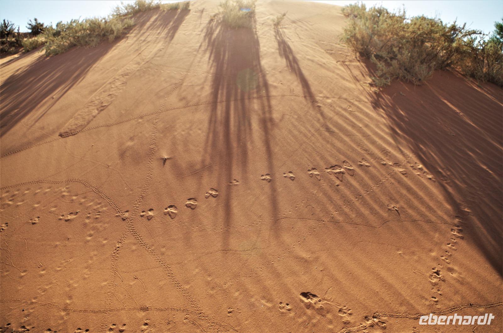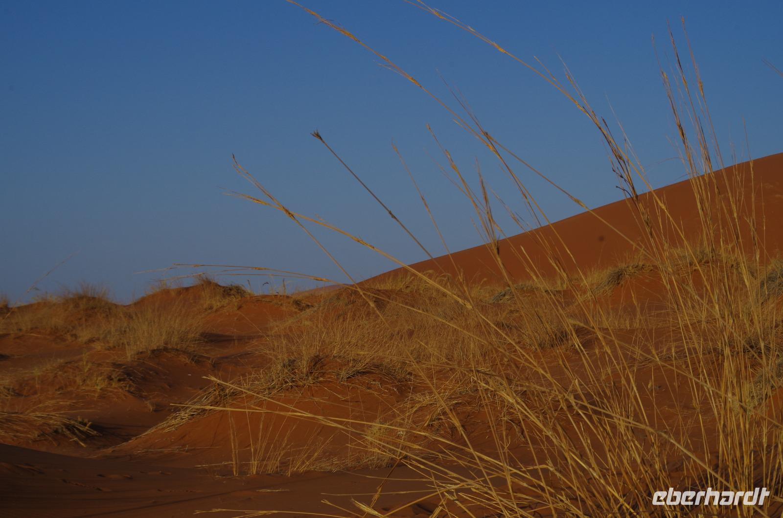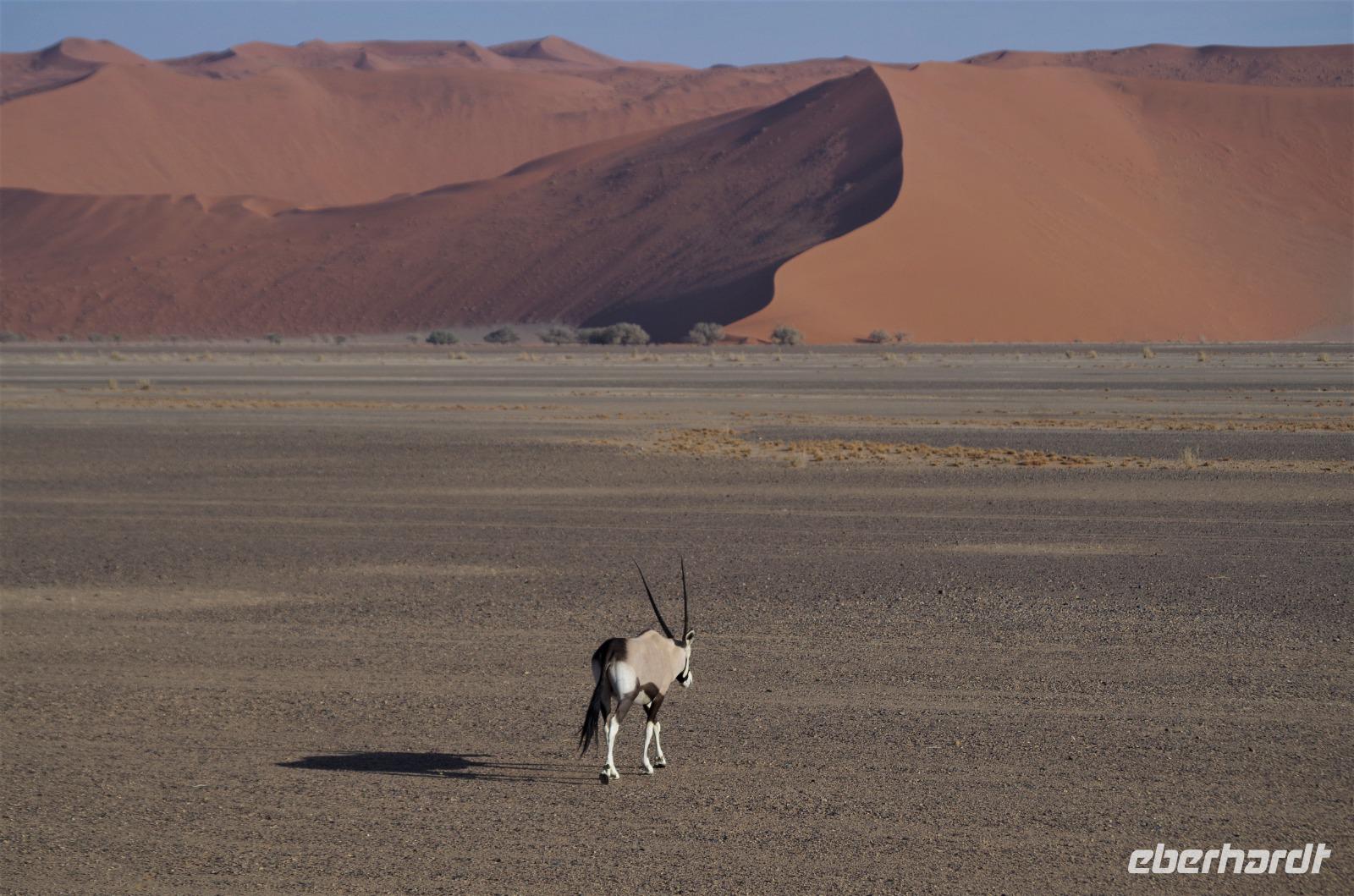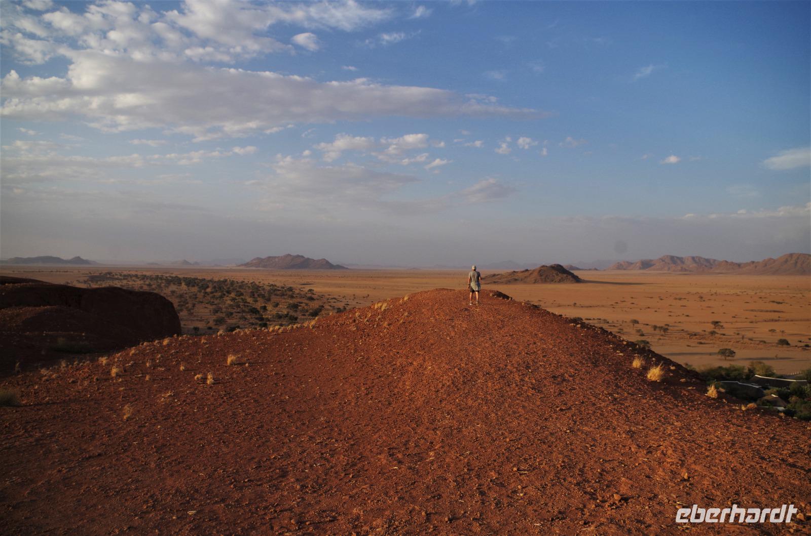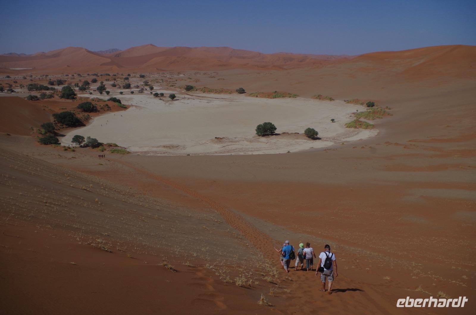 Frühes Aufstehen war heute Pflicht, denn unser Ziel war die Namib, deren Dünen zu den höchsten der Welt gehören. Es war noch dunkel, als wir uns zum Early-Breakfast trafen. Wir verstauten die Lunchpakete im Truck und los ging es. Ein kleines Nickerchen war leider nicht möglich, denn besonders die Zufahrtspad zum Eingang des Sossusvlei ist extrem schlecht. Hier muß dringend was getan werden, wie auf vielen anderen touristischen Strecken. Der Staat hat dazu leider kein Geld und so nehmen es private Menschen in die Hand. Wie Chris Theron, der mit einem einzigartigen Projekt, welches aus Spenden finanziert wird, die Pads saniert. Die Sonne war nun aufgegangen und wir passierten den Eingang. Im frühen Morgenlicht erstrahlen die hohen Dünen (bis ca. 400 m hoch) im satten Rot im Kontrast zum klaren Himmel. Wir sahen auch viele Ballons, die ihren morgendlichen Ausflug über der Namib gerade beendeten. Vorbei an der Düne 45 fuhren zum 4x4-Parkplatz. Dort wappneten wir uns für den sandig-heißen Ausflug. Wir stiegen in offene 4x4-Shuttlefahrzeuge um, die uns rasant durch das sandige Flussbett des ausgetrockneten Tsauchab-Fluss bis zum Sossusvlei (Lehmsenke) fuhren. Dort stiegen wir aus und Fritz erzählte uns viel Interessantes zur Entstehung der Wüste und weihte uns ins Spurenlesen ein. In der Nacht war mächtig Betrieb gewesen, wie man an den Spuren im Sand erkennen konnte: Schlangen, Tok Tok (Nebeltrinker-Käfer), Geckos, Mäuse und Oryxe waren unterwegs. Auch die Botaniker kamen nicht zu kurz. Mitten im heißen Sand wachsen blattlose, dornige, grüne Büsche: die Nara-Pflanzen. Sie sind endemisch, wachsen nur in Namibia, wo unterirdisch, also ganz, ganz weit unten, Wasser zu finden ist. Nur an den weiblichen Pflanzen hängen dann die wasserhaltigen, nahrhaften !Nara-Melonen, die auch als Medizin verwendet werden und die San als Wasserspender zum Überleben in der Wüste nutzen. Später erstürmten einige Eberhardt-Gäste den Gipfel der Düne Sossus, die immerhin fast 100 m hoch. Oben auf dem Grat wurden wir mit einer grandiosen Aussicht auf das Dünenmeer belohnt: Vor uns, in ehrfürchtiger Entfernung sahen wir Big Daddy (mit ca. 350 m die höchste Düne) und hinter uns die etwas kleinere Big Mama. Nur noch 50 km sind es von der Lehmsenke bis zum Atlantik! Doch die gewaltigen Dünen versperren dem Tsauchab den Weg in den Ozean. Etwas schneller als hinauf ging dann der Abstieg. Unterm Schattenbaum trafen wir uns und mußten noch eine kleine Weile auf unsere Shuttle warten. Wir fuhren zurück zum Parkplatz, wo Gerhard ein schattiges Plätzchen gefunden und die Klappstühle ausgegraben hatte. Dort picknickten wir. Mittlerweile hatte das Thermometer die 45 °C Marke erreicht. Im klimatisierten Truck fuhren wir zurück. Letzte Station des Tagesausfluges war der Sesriem Canyon (Sechs Riemen tief). Da er trocken war, stiegen wir hinab und erkundeten diesen auf einem kleinen Spaziergang. Nun war es richtig heiß, von oben knallte die Sonne erbarmungslos auf uns herab - Hitzerekord 48 ° C. Ein kühles, leckeres Eis oder ein Grapetiser war beim kurzen Tankstopp genau das Richtige für uns, bevor wir zu unserer Lpodge zurückschaukelten.