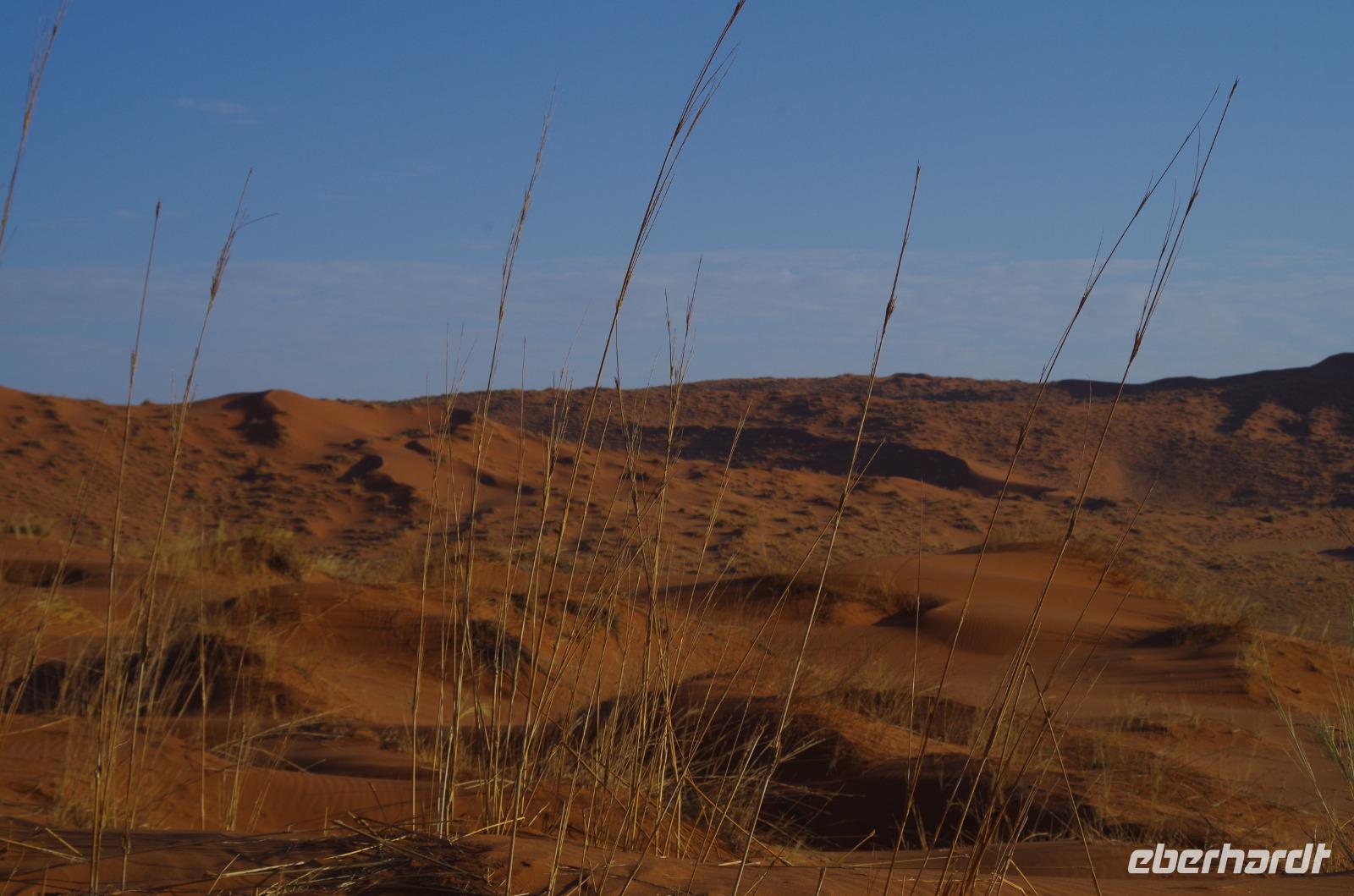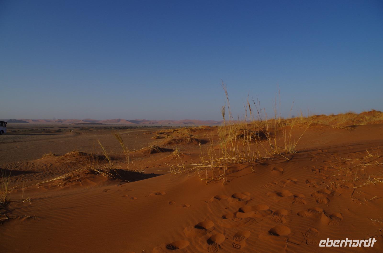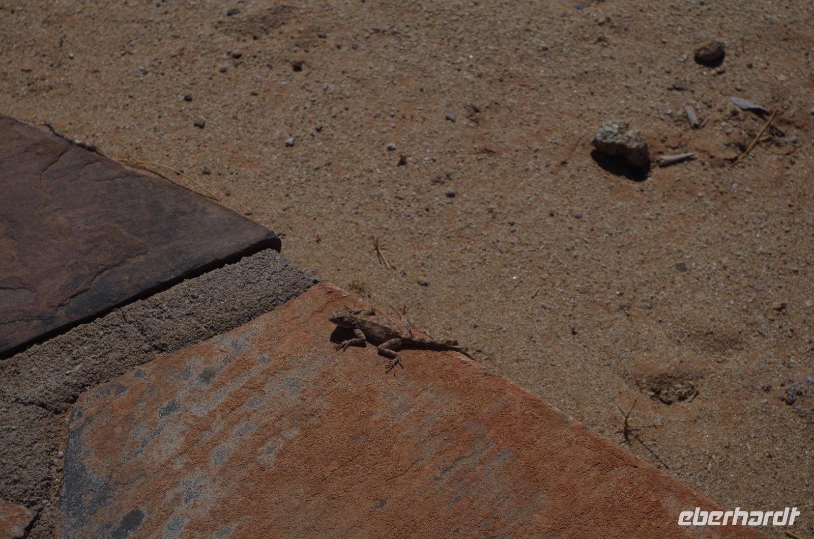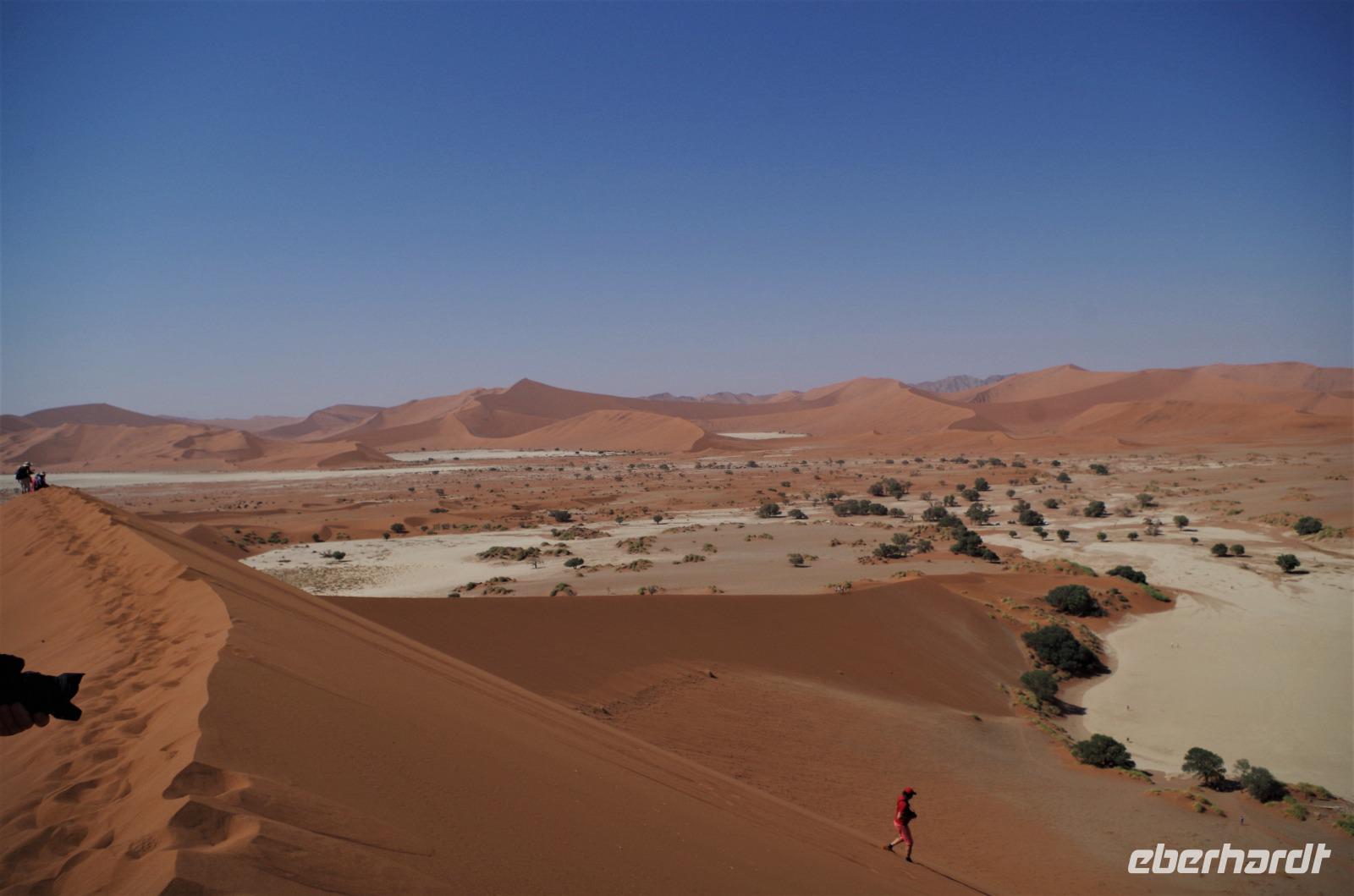 Frühes Aufstehen war heute Pflicht, denn unser Ziel war die Namib, deren Dünen zu den höchsten der Welt gehören. Es war noch dunkel, als wir uns zum Early-Breakfast trafen. Wir verstauten die Lunchpakete im Truck und los ging es. Ein kleines Nickerchen war leider nicht möglich, denn besonders die Zufahrtspad zum Eingang des Sossusvlei ist extrem schlecht. Hier muß dringend was getan werden, wie auf vielen anderen touristischen Strecken. Der Staat hat dazu leider kein Geld und so nehmen es private Menschen in die Hand. Wie Chris Theron, der mit einem einzigartigen Projekt, welches aus Spenden finanziert wird, die Pads saniert. Die Sonne war nun aufgegangen und wir passierten den Eingang. Im frühen Morgenlicht erstrahlen die hohen Dünen (bis ca. 400 m hoch) im satten Rot im Kontrast zum klaren Himmel. Wir sahen auch viele Ballons, die ihren morgendlichen Ausflug über der Namib gerade beendeten. Vorbei an der Düne 45 fuhren zum 4x4-Parkplatz. Dort wappneten wir uns für den sandig-heißen Ausflug. Wir stiegen in offene 4x4-Shuttlefahrzeuge um, die uns rasant durch das sandige Flussbett des ausgetrockneten Tsauchab-Fluss bis zum Sossusvlei (Lehmsenke) fuhren. Dort stiegen wir aus und Fritz erzählte uns viel Interessantes zur Entstehung der Wüste und weihte uns ins Spurenlesen ein. In der Nacht war mächtig Betrieb gewesen, wie man an den Spuren im Sand erkennen konnte: Schlangen, Tok Tok (Nebeltrinker-Käfer), Geckos, Mäuse und Oryxe waren unterwegs. Auch die Botaniker kamen nicht zu kurz. Mitten im heißen Sand wachsen blattlose, dornige, grüne Büsche: die Nara-Pflanzen. Sie sind endemisch, wachsen nur in Namibia, wo unterirdisch, also ganz, ganz weit unten, Wasser zu finden ist. Nur an den weiblichen Pflanzen hängen dann die wasserhaltigen, nahrhaften !Nara-Melonen, die auch als Medizin verwendet werden und die San als Wasserspender zum Überleben in der Wüste nutzen. Später erstürmten einige Eberhardt-Gäste den Gipfel der Düne Sossus, die immerhin fast 100 m hoch. Oben auf dem Grat wurden wir mit einer grandiosen Aussicht auf das Dünenmeer belohnt: Vor uns, in ehrfürchtiger Entfernung sahen wir Big Daddy (mit ca. 350 m die höchste Düne) und hinter uns die etwas kleinere Big Mama. Nur noch 50 km sind es von der Lehmsenke bis zum Atlantik! Doch die gewaltigen Dünen versperren dem Tsauchab den Weg in den Ozean. Etwas schneller als hinauf ging dann der Abstieg. Unterm Schattenbaum trafen wir uns und mußten noch eine kleine Weile auf unsere Shuttle warten. Wir fuhren zurück zum Parkplatz, wo Gerhard ein schattiges Plätzchen gefunden und die Klappstühle ausgegraben hatte. Dort picknickten wir. Mittlerweile hatte das Thermometer die 45 °C Marke erreicht. Im klimatisierten Truck fuhren wir zurück. Letzte Station des Tagesausfluges war der Sesriem Canyon (Sechs Riemen tief). Da er trocken war, stiegen wir hinab und erkundeten diesen auf einem kleinen Spaziergang. Nun war es richtig heiß, von oben knallte die Sonne erbarmungslos auf uns herab - Hitzerekord 48 ° C. Ein kühles, leckeres Eis oder ein Grapetiser war beim kurzen Tankstopp genau das Richtige für uns, bevor wir zu unserer Lpodge zurückschaukelten.