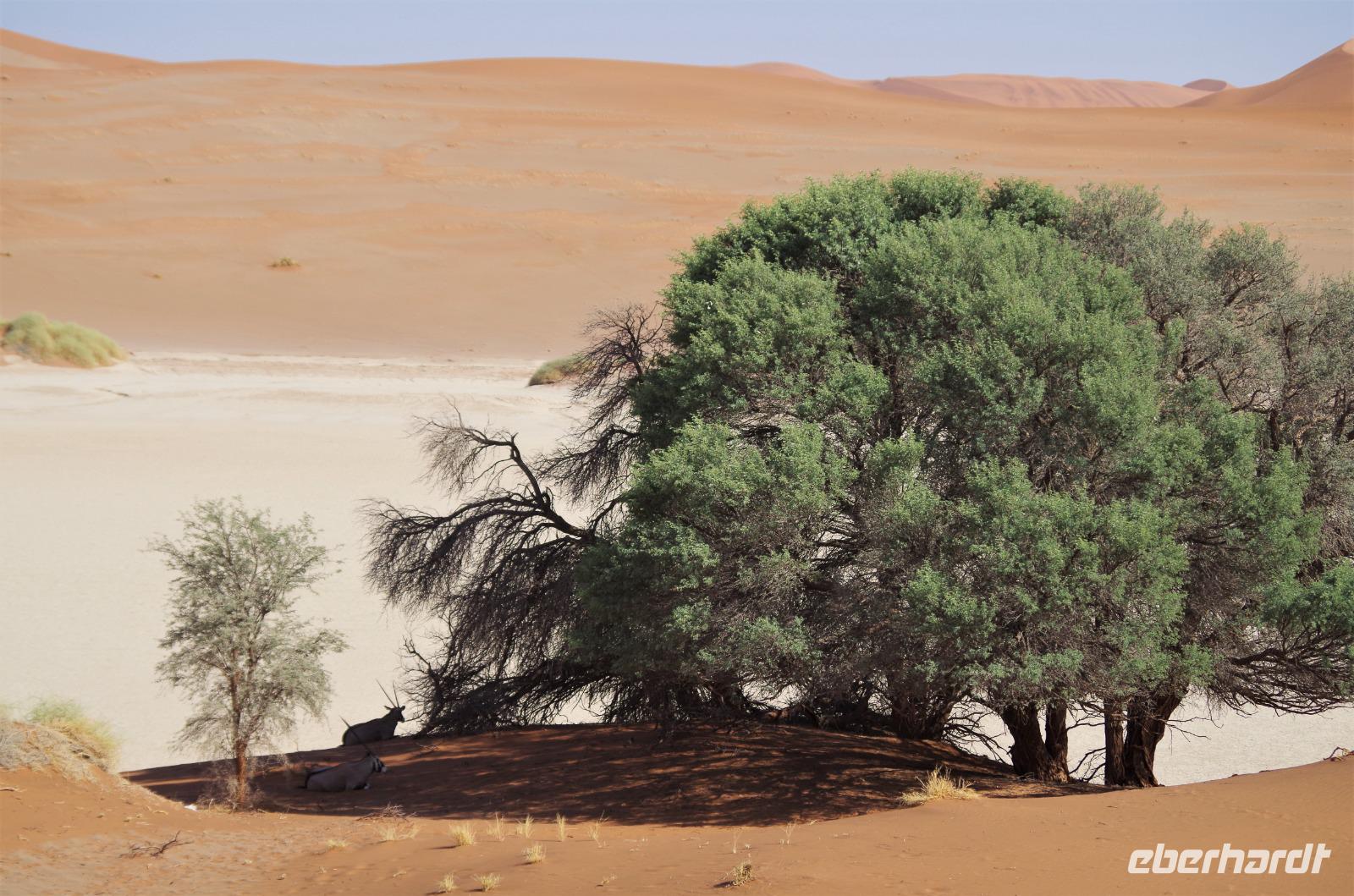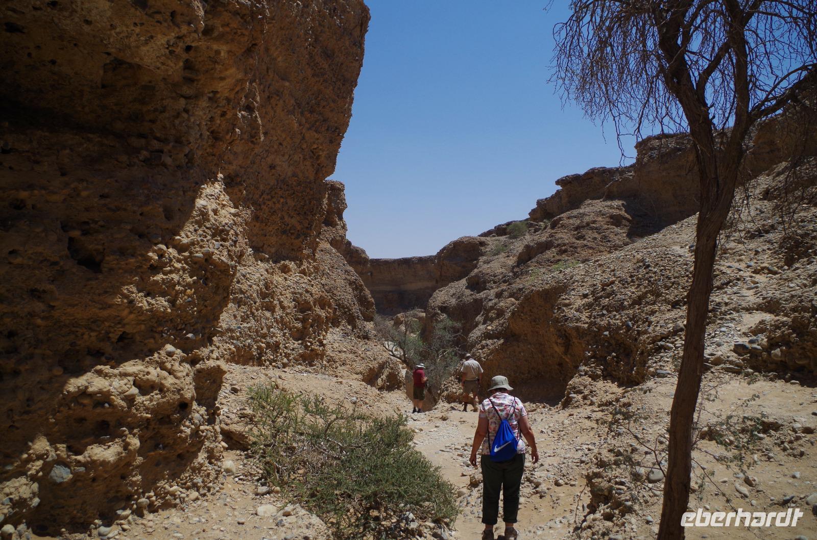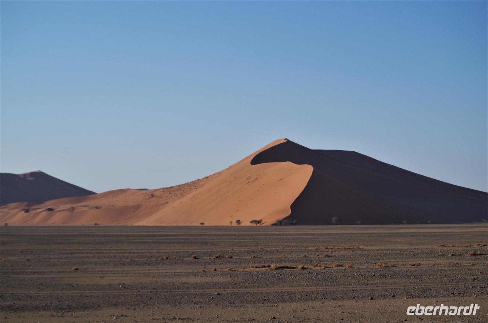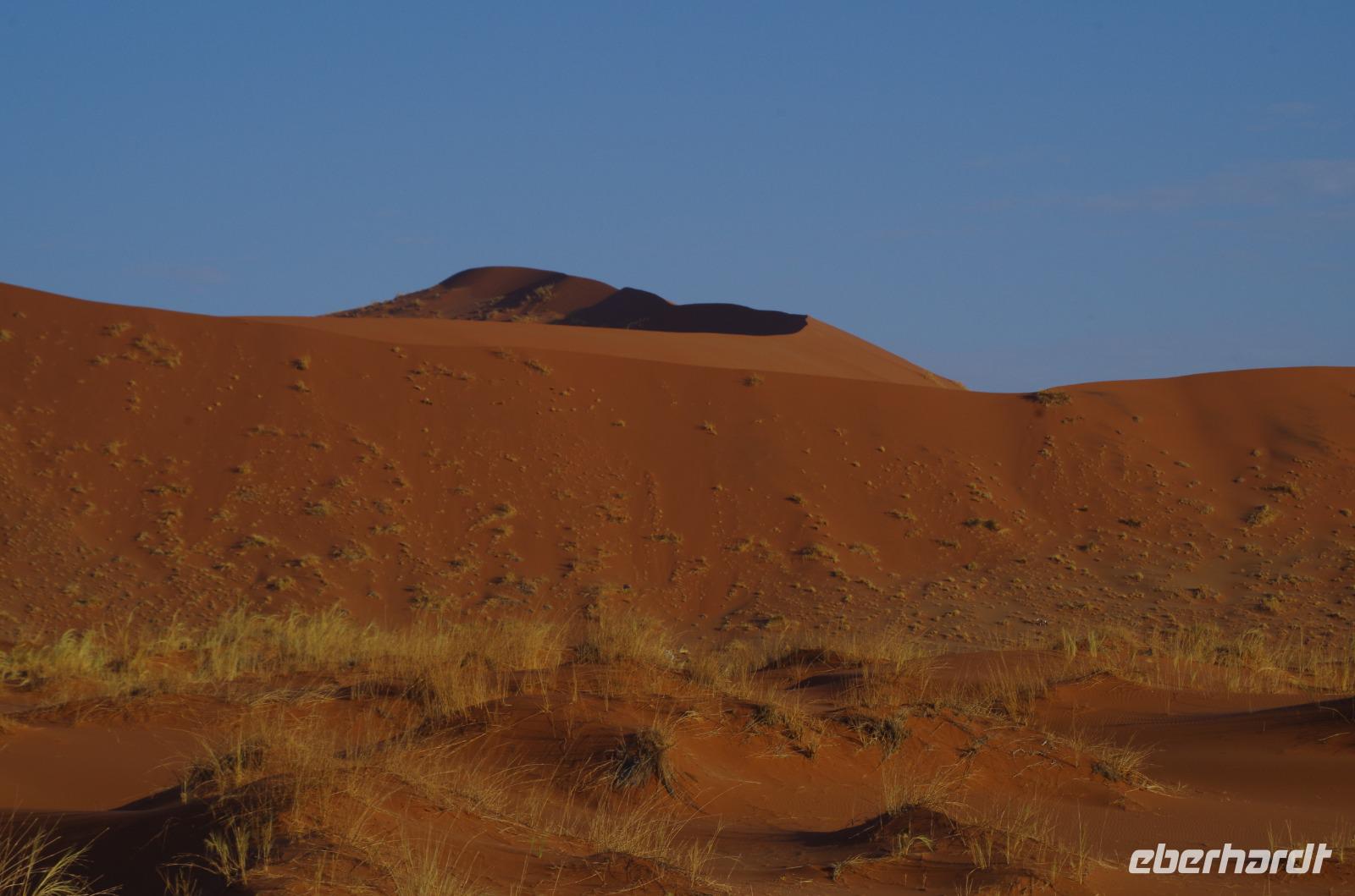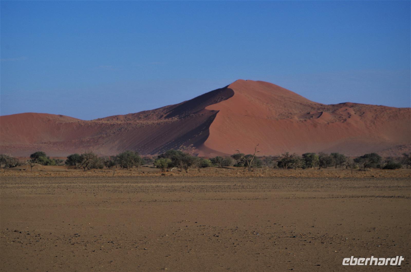 Frühes Aufstehen war heute Pflicht, denn unser Ziel war die Namib, deren Dünen zu den höchsten der Welt gehören. Es war noch dunkel, als wir uns zum Early-Breakfast trafen. Wir verstauten die Lunchpakete im Truck und los ging es. Ein kleines Nickerchen war leider nicht möglich, denn besonders die Zufahrtspad zum Eingang des Sossusvlei ist extrem schlecht. Hier muß dringend was getan werden, wie auf vielen anderen touristischen Strecken. Der Staat hat dazu leider kein Geld und so nehmen es private Menschen in die Hand. Wie Chris Theron, der mit einem einzigartigen Projekt, welches aus Spenden finanziert wird, die Pads saniert. Die Sonne war nun aufgegangen und wir passierten den Eingang. Im frühen Morgenlicht erstrahlen die hohen Dünen (bis ca. 400 m hoch) im satten Rot im Kontrast zum klaren Himmel. Wir sahen auch viele Ballons, die ihren morgendlichen Ausflug über der Namib gerade beendeten. Vorbei an der Düne 45 fuhren zum 4x4-Parkplatz. Dort wappneten wir uns für den sandig-heißen Ausflug. Wir stiegen in offene 4x4-Shuttlefahrzeuge um, die uns rasant durch das sandige Flussbett des ausgetrockneten Tsauchab-Fluss bis zum Sossusvlei (Lehmsenke) fuhren. Dort stiegen wir aus und Fritz erzählte uns viel Interessantes zur Entstehung der Wüste und weihte uns ins Spurenlesen ein. In der Nacht war mächtig Betrieb gewesen, wie man an den Spuren im Sand erkennen konnte: Schlangen, Tok Tok (Nebeltrinker-Käfer), Geckos, Mäuse und Oryxe waren unterwegs. Auch die Botaniker kamen nicht zu kurz. Mitten im heißen Sand wachsen blattlose, dornige, grüne Büsche: die Nara-Pflanzen. Sie sind endemisch, wachsen nur in Namibia, wo unterirdisch, also ganz, ganz weit unten, Wasser zu finden ist. Nur an den weiblichen Pflanzen hängen dann die wasserhaltigen, nahrhaften !Nara-Melonen, die auch als Medizin verwendet werden und die San als Wasserspender zum Überleben in der Wüste nutzen. Später erstürmten einige Eberhardt-Gäste den Gipfel der Düne Sossus, die immerhin fast 100 m hoch. Oben auf dem Grat wurden wir mit einer grandiosen Aussicht auf das Dünenmeer belohnt: Vor uns, in ehrfürchtiger Entfernung sahen wir Big Daddy (mit ca. 350 m die höchste Düne) und hinter uns die etwas kleinere Big Mama. Nur noch 50 km sind es von der Lehmsenke bis zum Atlantik! Doch die gewaltigen Dünen versperren dem Tsauchab den Weg in den Ozean. Etwas schneller als hinauf ging dann der Abstieg. Unterm Schattenbaum trafen wir uns und mußten noch eine kleine Weile auf unsere Shuttle warten. Wir fuhren zurück zum Parkplatz, wo Gerhard ein schattiges Plätzchen gefunden und die Klappstühle ausgegraben hatte. Dort picknickten wir. Mittlerweile hatte das Thermometer die 45 °C Marke erreicht. Im klimatisierten Truck fuhren wir zurück. Letzte Station des Tagesausfluges war der Sesriem Canyon (Sechs Riemen tief). Da er trocken war, stiegen wir hinab und erkundeten diesen auf einem kleinen Spaziergang. Nun war es richtig heiß, von oben knallte die Sonne erbarmungslos auf uns herab - Hitzerekord 48 ° C. Ein kühles, leckeres Eis oder ein Grapetiser war beim kurzen Tankstopp genau das Richtige für uns, bevor wir zu unserer Lpodge zurückschaukelten.