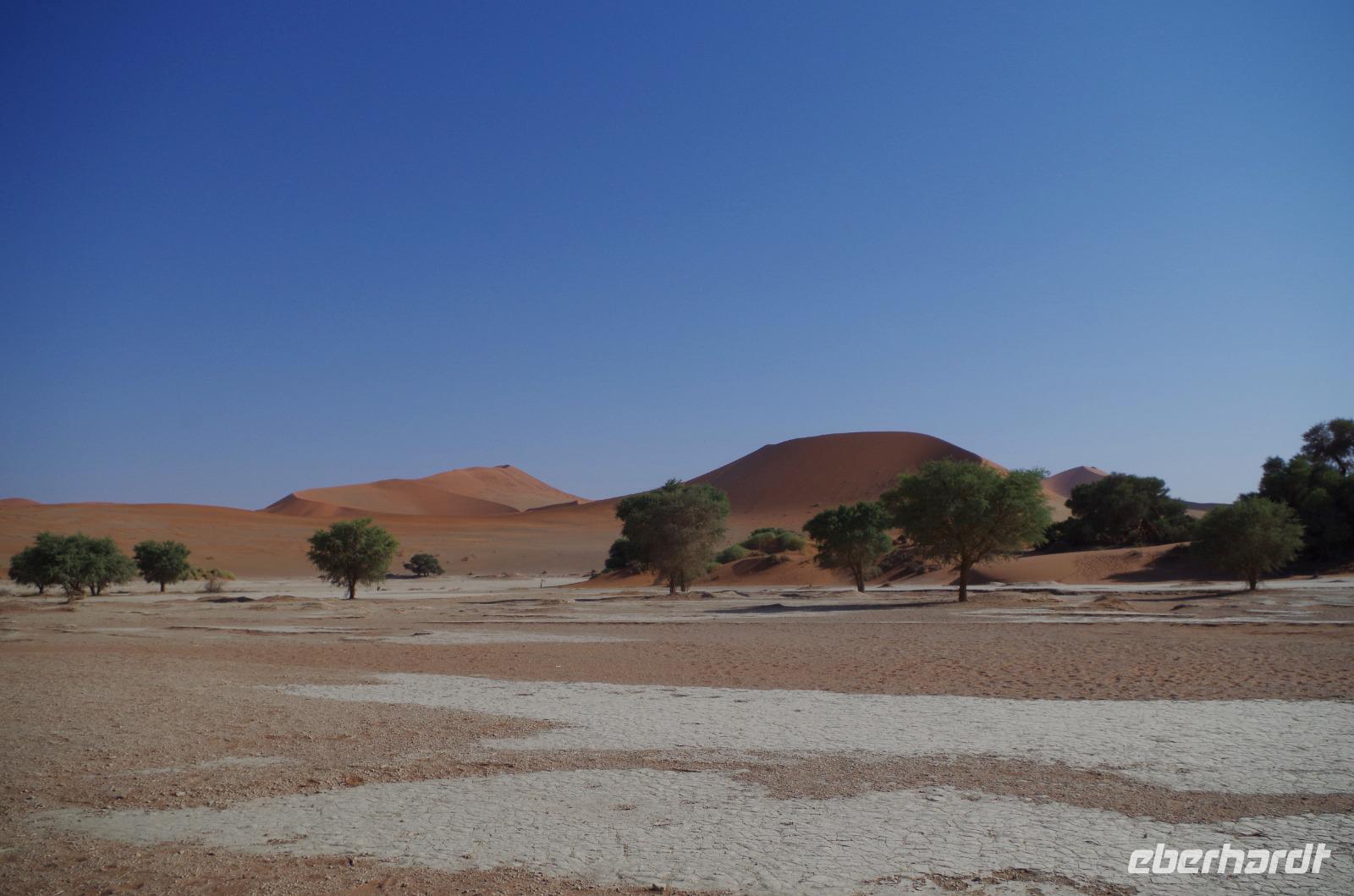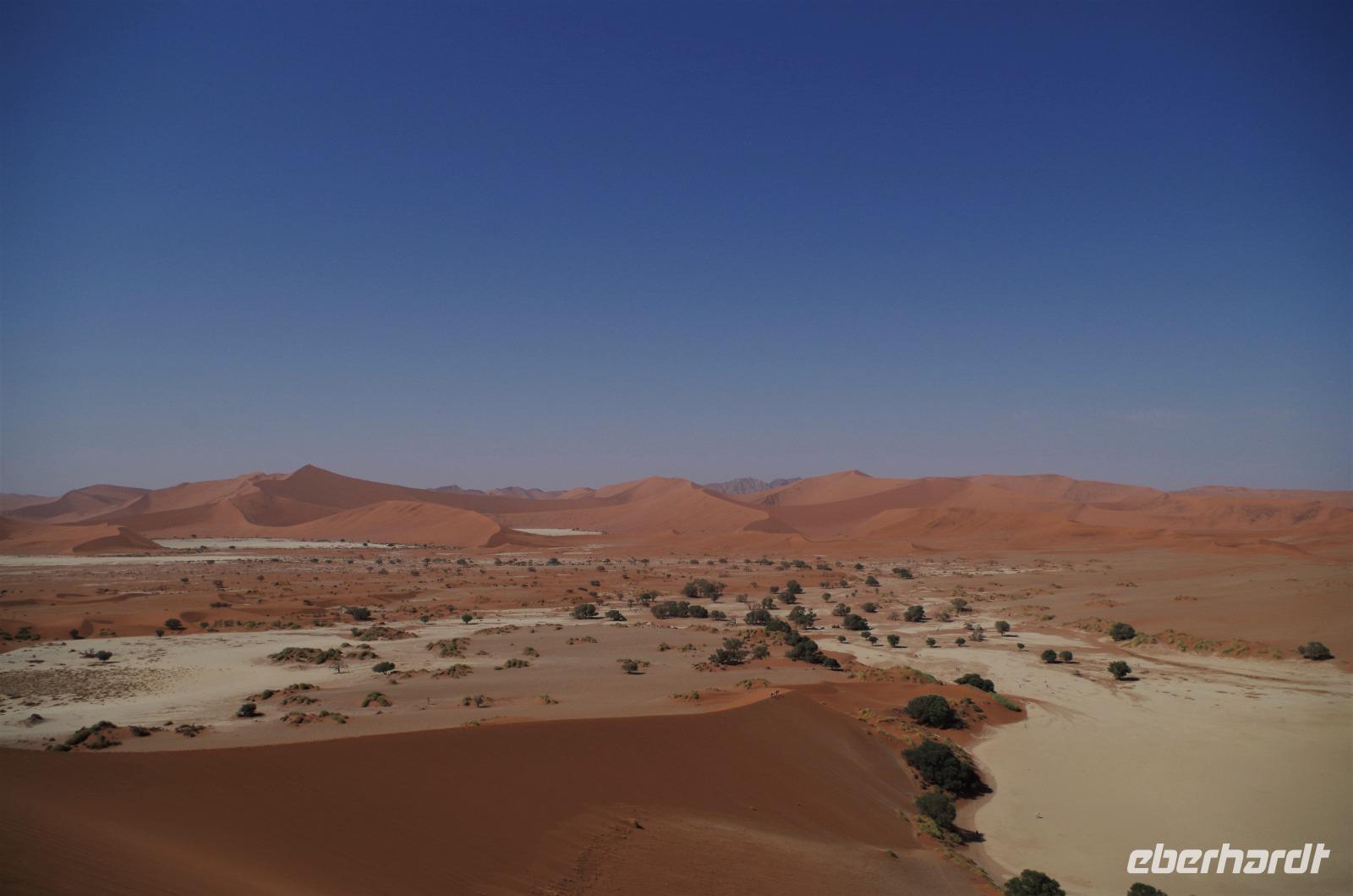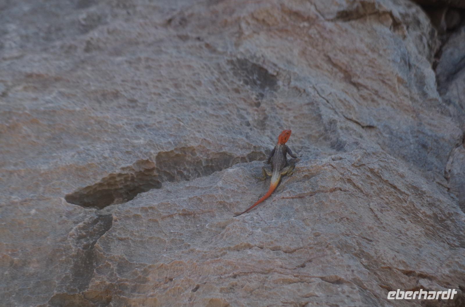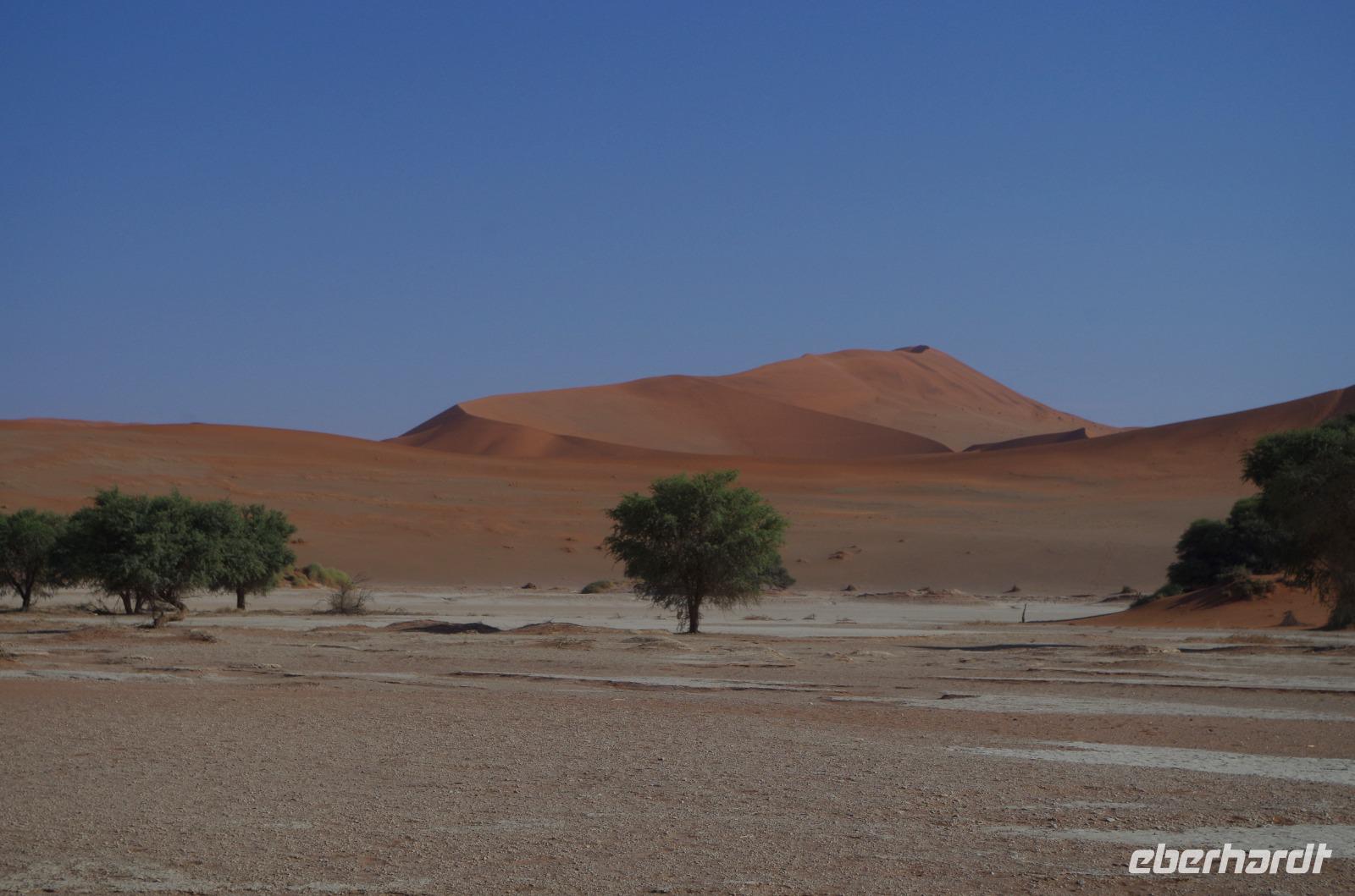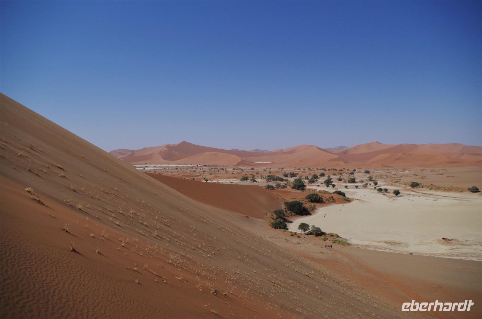 Frühes Aufstehen war heute Pflicht, denn unser Ziel war die Namib, deren Dünen zu den höchsten der Welt gehören. Es war noch dunkel, als wir uns zum Early-Breakfast trafen. Wir verstauten die Lunchpakete im Truck und los ging es. Ein kleines Nickerchen war leider nicht möglich, denn besonders die Zufahrtspad zum Eingang des Sossusvlei ist extrem schlecht. Hier muß dringend was getan werden, wie auf vielen anderen touristischen Strecken. Der Staat hat dazu leider kein Geld und so nehmen es private Menschen in die Hand. Wie Chris Theron, der mit einem einzigartigen Projekt, welches aus Spenden finanziert wird, die Pads saniert. Die Sonne war nun aufgegangen und wir passierten den Eingang. Im frühen Morgenlicht erstrahlen die hohen Dünen (bis ca. 400 m hoch) im satten Rot im Kontrast zum klaren Himmel. Wir sahen auch viele Ballons, die ihren morgendlichen Ausflug über der Namib gerade beendeten. Vorbei an der Düne 45 fuhren zum 4x4-Parkplatz. Dort wappneten wir uns für den sandig-heißen Ausflug. Wir stiegen in offene 4x4-Shuttlefahrzeuge um, die uns rasant durch das sandige Flussbett des ausgetrockneten Tsauchab-Fluss bis zum Sossusvlei (Lehmsenke) fuhren. Dort stiegen wir aus und Fritz erzählte uns viel Interessantes zur Entstehung der Wüste und weihte uns ins Spurenlesen ein. In der Nacht war mächtig Betrieb gewesen, wie man an den Spuren im Sand erkennen konnte: Schlangen, Tok Tok (Nebeltrinker-Käfer), Geckos, Mäuse und Oryxe waren unterwegs. Auch die Botaniker kamen nicht zu kurz. Mitten im heißen Sand wachsen blattlose, dornige, grüne Büsche: die Nara-Pflanzen. Sie sind endemisch, wachsen nur in Namibia, wo unterirdisch, also ganz, ganz weit unten, Wasser zu finden ist. Nur an den weiblichen Pflanzen hängen dann die wasserhaltigen, nahrhaften !Nara-Melonen, die auch als Medizin verwendet werden und die San als Wasserspender zum Überleben in der Wüste nutzen. Später erstürmten einige Eberhardt-Gäste den Gipfel der Düne Sossus, die immerhin fast 100 m hoch. Oben auf dem Grat wurden wir mit einer grandiosen Aussicht auf das Dünenmeer belohnt: Vor uns, in ehrfürchtiger Entfernung sahen wir Big Daddy (mit ca. 350 m die höchste Düne) und hinter uns die etwas kleinere Big Mama. Nur noch 50 km sind es von der Lehmsenke bis zum Atlantik! Doch die gewaltigen Dünen versperren dem Tsauchab den Weg in den Ozean. Etwas schneller als hinauf ging dann der Abstieg. Unterm Schattenbaum trafen wir uns und mußten noch eine kleine Weile auf unsere Shuttle warten. Wir fuhren zurück zum Parkplatz, wo Gerhard ein schattiges Plätzchen gefunden und die Klappstühle ausgegraben hatte. Dort picknickten wir. Mittlerweile hatte das Thermometer die 45 °C Marke erreicht. Im klimatisierten Truck fuhren wir zurück. Letzte Station des Tagesausfluges war der Sesriem Canyon (Sechs Riemen tief). Da er trocken war, stiegen wir hinab und erkundeten diesen auf einem kleinen Spaziergang. Nun war es richtig heiß, von oben knallte die Sonne erbarmungslos auf uns herab - Hitzerekord 48 ° C. Ein kühles, leckeres Eis oder ein Grapetiser war beim kurzen Tankstopp genau das Richtige für uns, bevor wir zu unserer Lpodge zurückschaukelten.