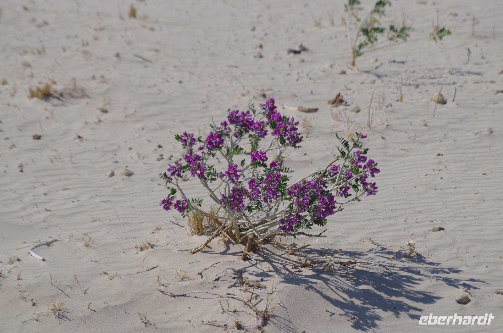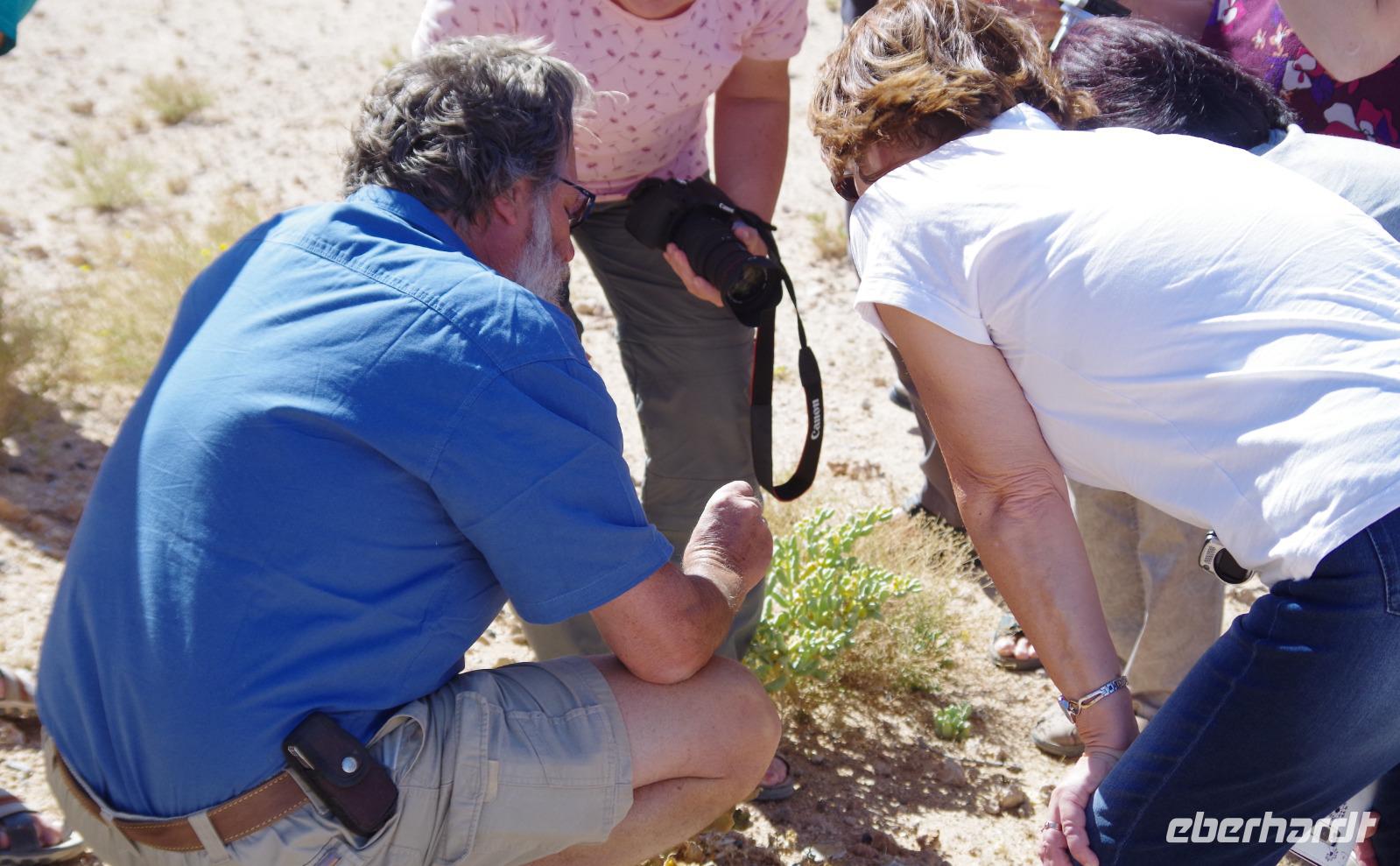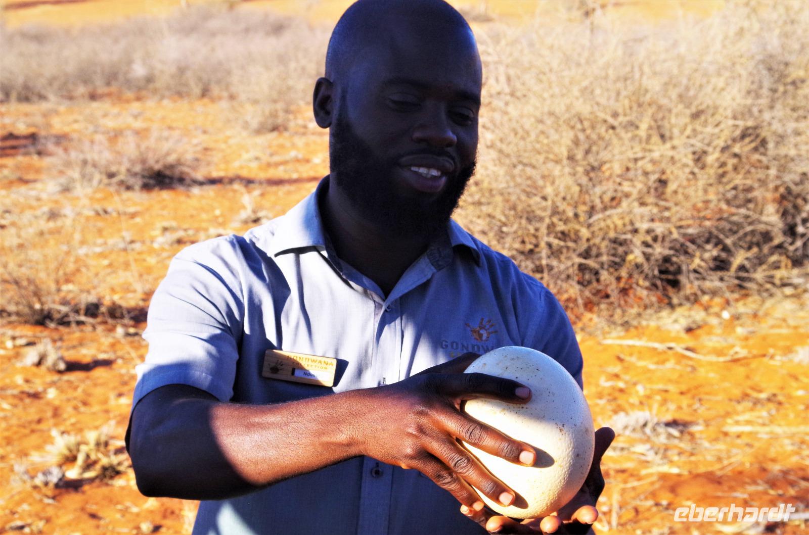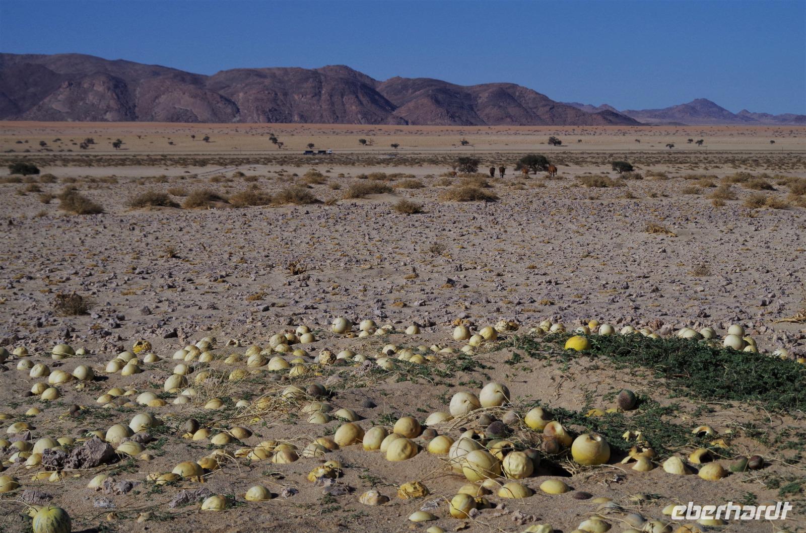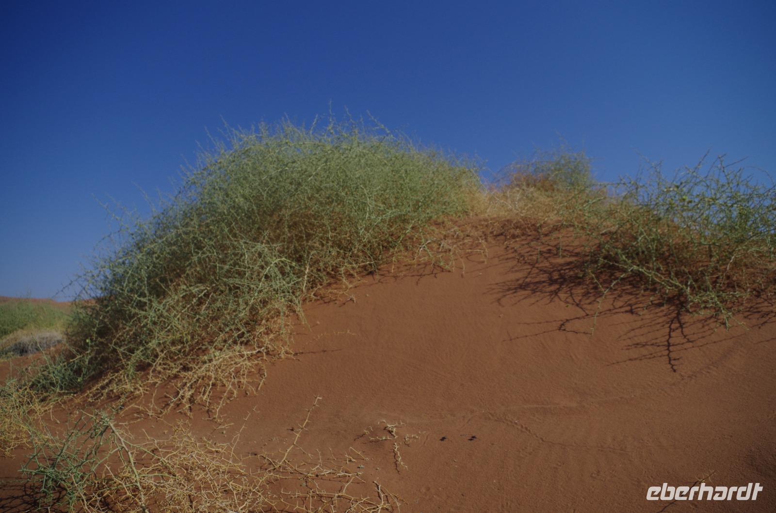 Frühes Aufstehen war heute Pflicht, denn unser Ziel war die Namib, deren Dünen zu den höchsten der Welt gehören. Es war noch dunkel, als wir uns zum Early-Breakfast trafen. Wir verstauten die Lunchpakete im Truck und los ging es. Ein kleines Nickerchen war leider nicht möglich, denn besonders die Zufahrtspad zum Eingang des Sossusvlei ist extrem schlecht. Hier muß dringend was getan werden, wie auf vielen anderen touristischen Strecken. Der Staat hat dazu leider kein Geld und so nehmen es private Menschen in die Hand. Wie Chris Theron, der mit einem einzigartigen Projekt, welches aus Spenden finanziert wird, die Pads saniert. Die Sonne war nun aufgegangen und wir passierten den Eingang. Im frühen Morgenlicht erstrahlen die hohen Dünen (bis ca. 400 m hoch) im satten Rot im Kontrast zum klaren Himmel. Wir sahen auch viele Ballons, die ihren morgendlichen Ausflug über der Namib gerade beendeten. Vorbei an der Düne 45 fuhren zum 4x4-Parkplatz. Dort wappneten wir uns für den sandig-heißen Ausflug. Wir stiegen in offene 4x4-Shuttlefahrzeuge um, die uns rasant durch das sandige Flussbett des ausgetrockneten Tsauchab-Fluss bis zum Sossusvlei (Lehmsenke) fuhren. Dort stiegen wir aus und Fritz erzählte uns viel Interessantes zur Entstehung der Wüste und weihte uns ins Spurenlesen ein. In der Nacht war mächtig Betrieb gewesen, wie man an den Spuren im Sand erkennen konnte: Schlangen, Tok Tok (Nebeltrinker-Käfer), Geckos, Mäuse und Oryxe waren unterwegs. Auch die Botaniker kamen nicht zu kurz. Mitten im heißen Sand wachsen blattlose, dornige, grüne Büsche: die Nara-Pflanzen. Sie sind endemisch, wachsen nur in Namibia, wo unterirdisch, also ganz, ganz weit unten, Wasser zu finden ist. Nur an den weiblichen Pflanzen hängen dann die wasserhaltigen, nahrhaften !Nara-Melonen, die auch als Medizin verwendet werden und die San als Wasserspender zum Überleben in der Wüste nutzen. Später erstürmten einige Eberhardt-Gäste den Gipfel der Düne Sossus, die immerhin fast 100 m hoch. Oben auf dem Grat wurden wir mit einer grandiosen Aussicht auf das Dünenmeer belohnt: Vor uns, in ehrfürchtiger Entfernung sahen wir Big Daddy (mit ca. 350 m die höchste Düne) und hinter uns die etwas kleinere Big Mama. Nur noch 50 km sind es von der Lehmsenke bis zum Atlantik! Doch die gewaltigen Dünen versperren dem Tsauchab den Weg in den Ozean. Etwas schneller als hinauf ging dann der Abstieg. Unterm Schattenbaum trafen wir uns und mußten noch eine kleine Weile auf unsere Shuttle warten. Wir fuhren zurück zum Parkplatz, wo Gerhard ein schattiges Plätzchen gefunden und die Klappstühle ausgegraben hatte. Dort picknickten wir. Mittlerweile hatte das Thermometer die 45 °C Marke erreicht. Im klimatisierten Truck fuhren wir zurück. Letzte Station des Tagesausfluges war der Sesriem Canyon (Sechs Riemen tief). Da er trocken war, stiegen wir hinab und erkundeten diesen auf einem kleinen Spaziergang. Nun war es richtig heiß, von oben knallte die Sonne erbarmungslos auf uns herab - Hitzerekord 48 ° C. Ein kühles, leckeres Eis oder ein Grapetiser war beim kurzen Tankstopp genau das Richtige für uns, bevor wir zu unserer Lpodge zurückschaukelten.