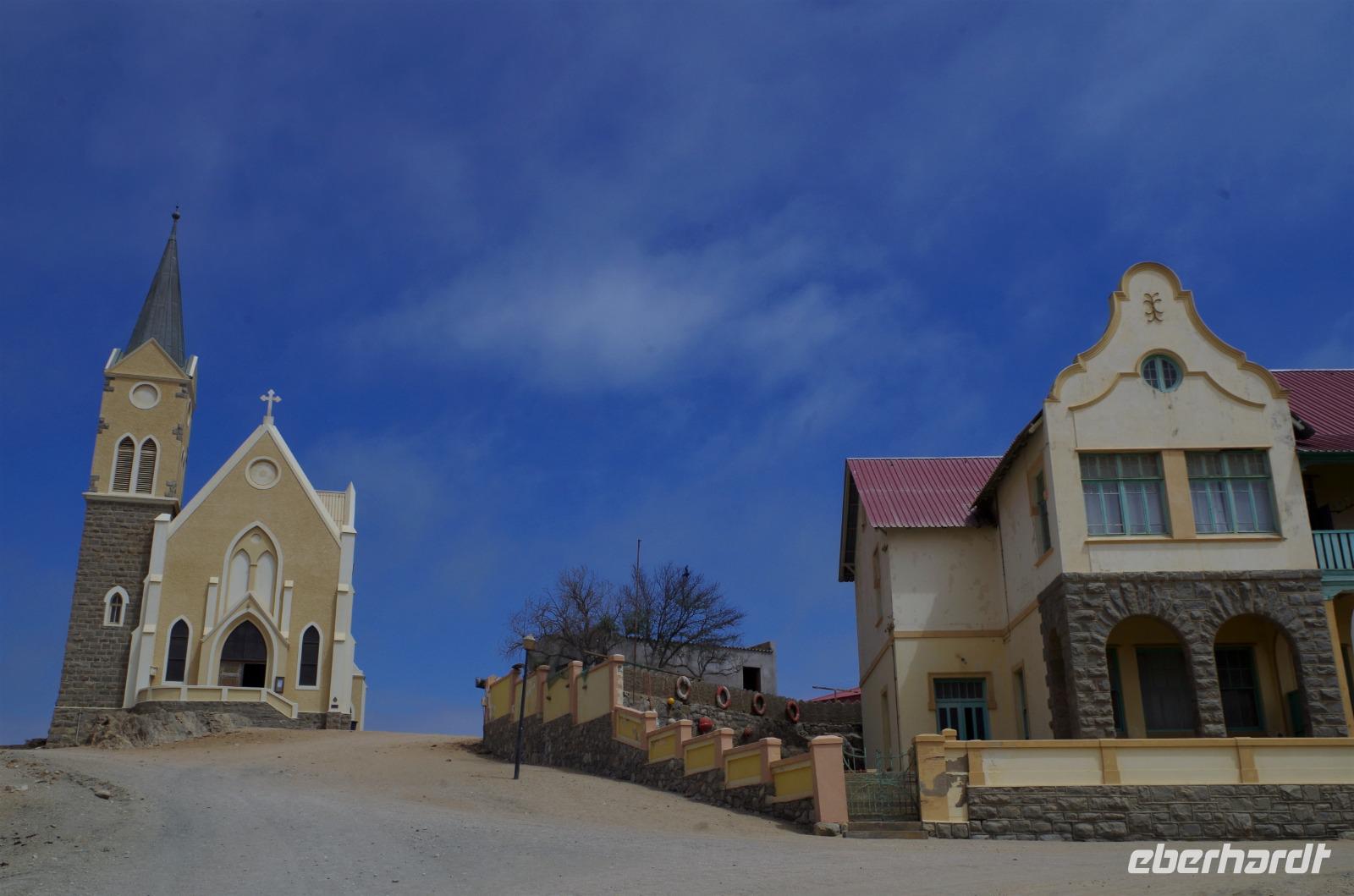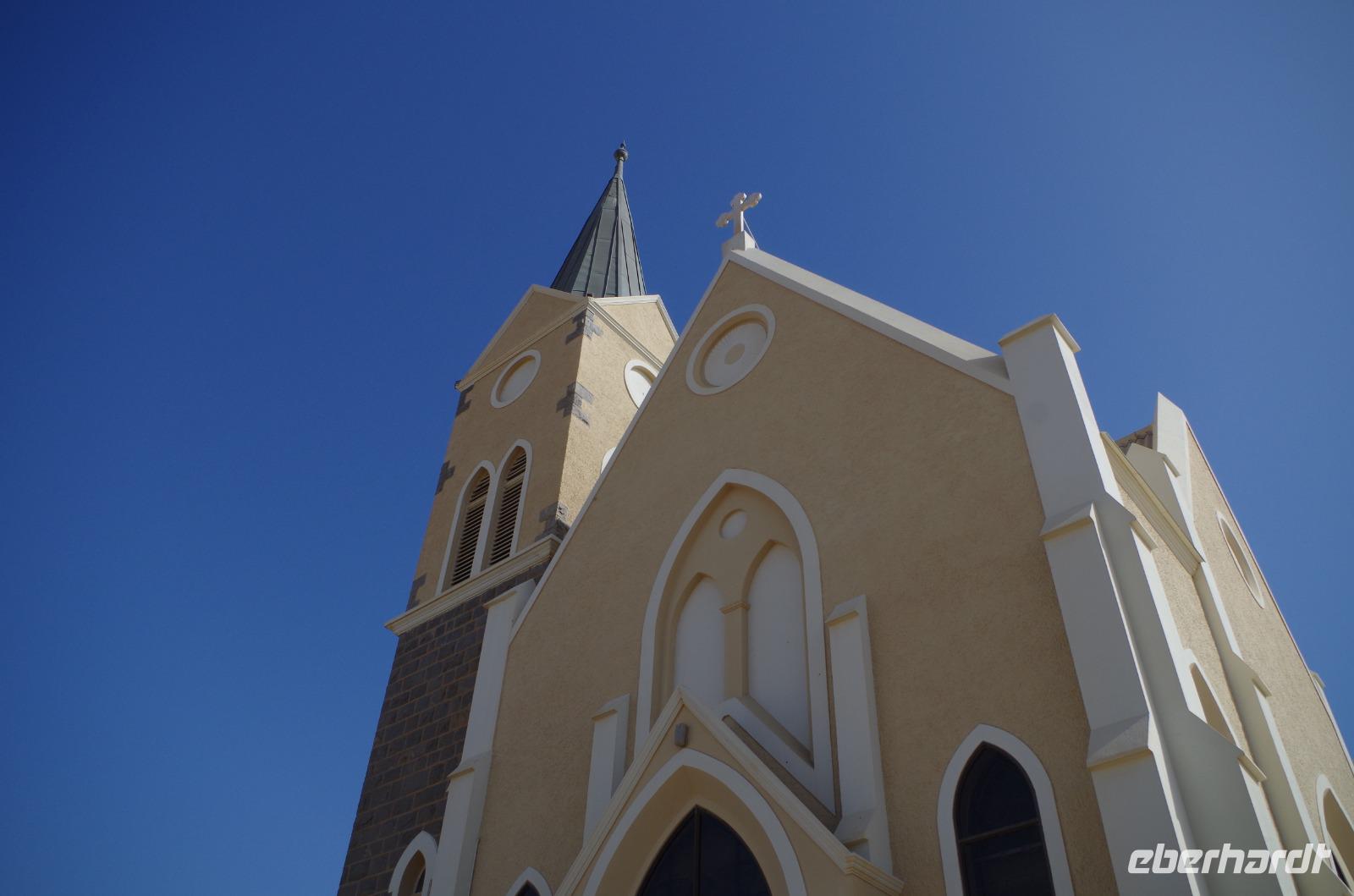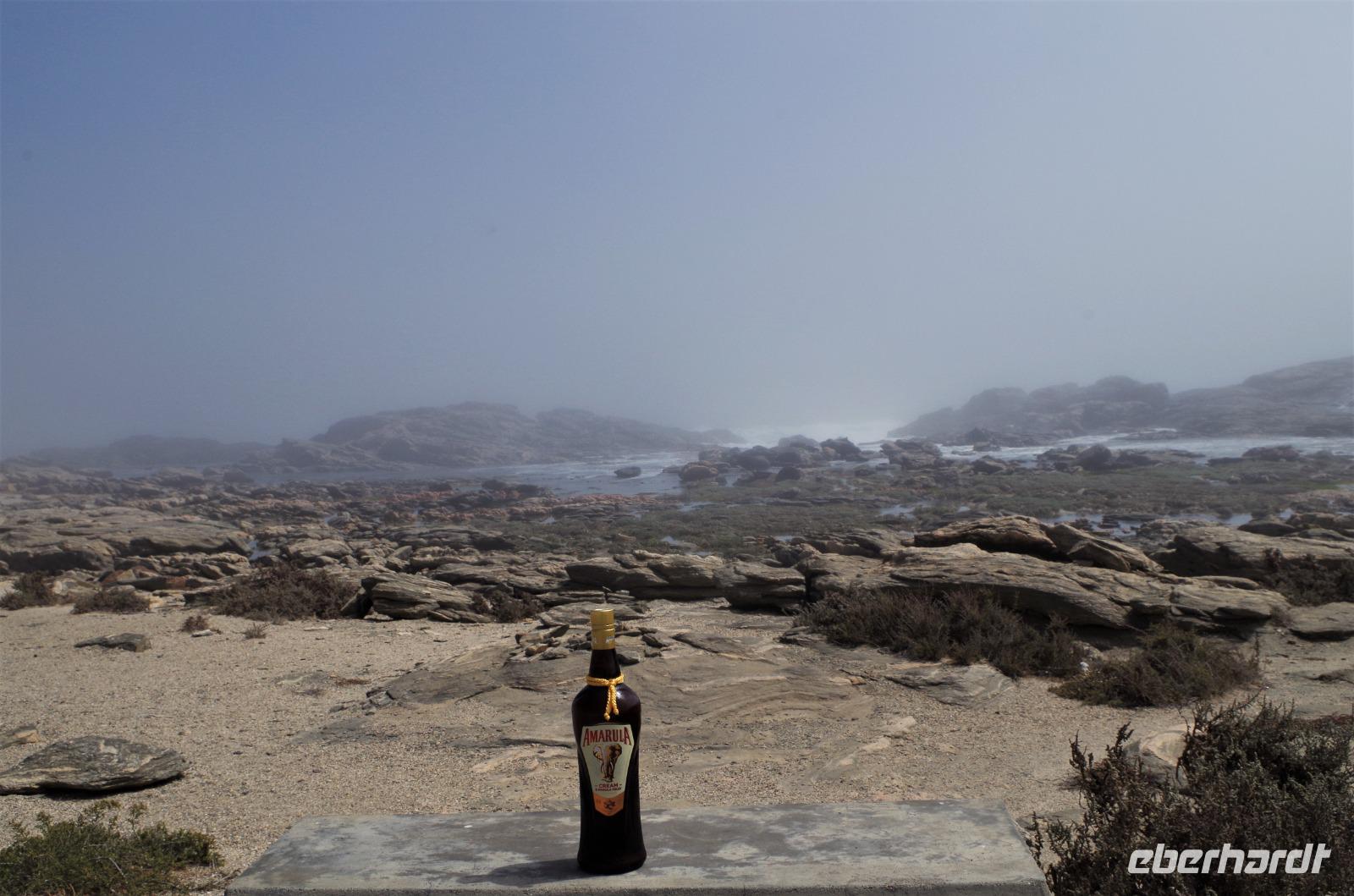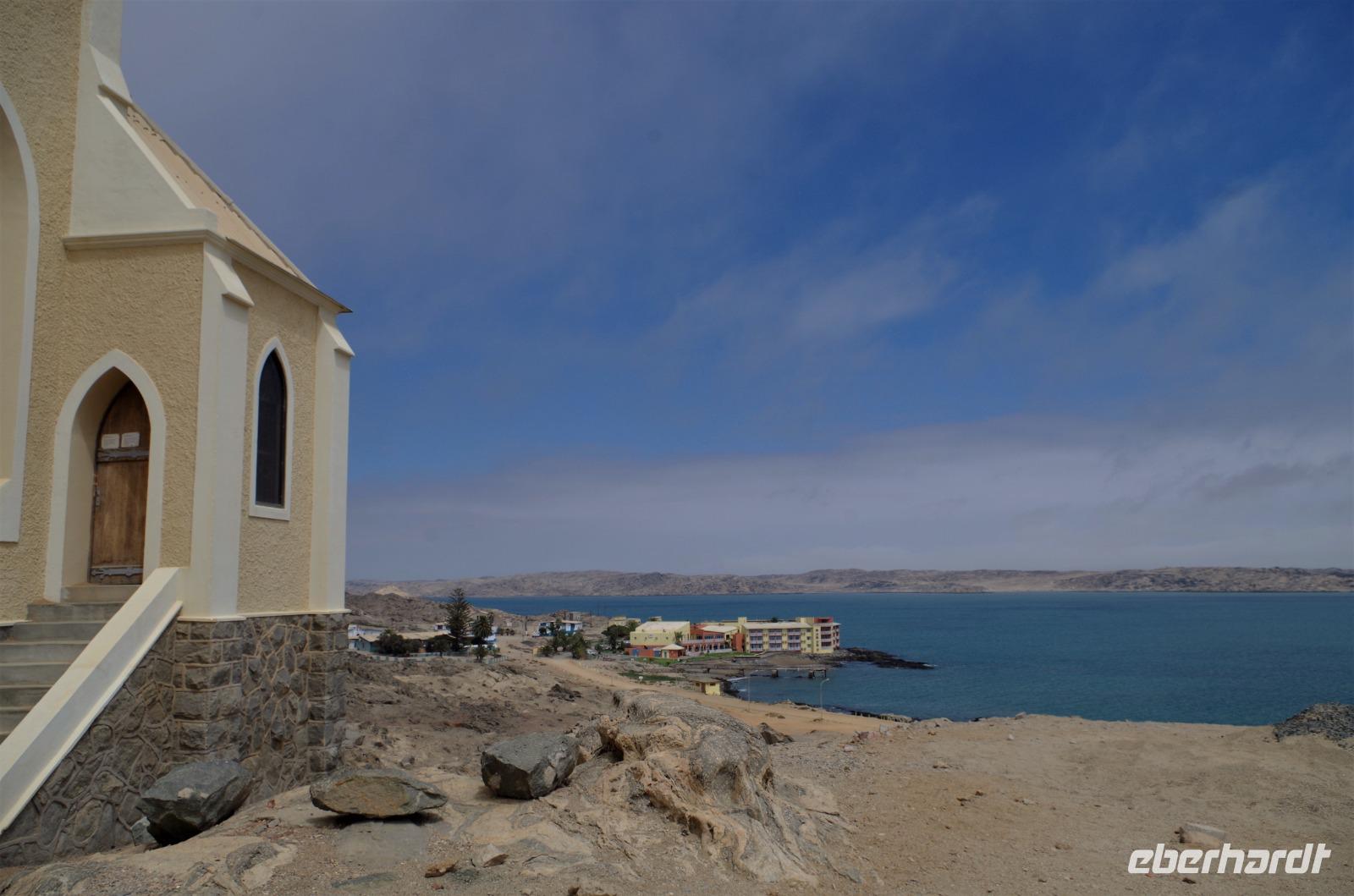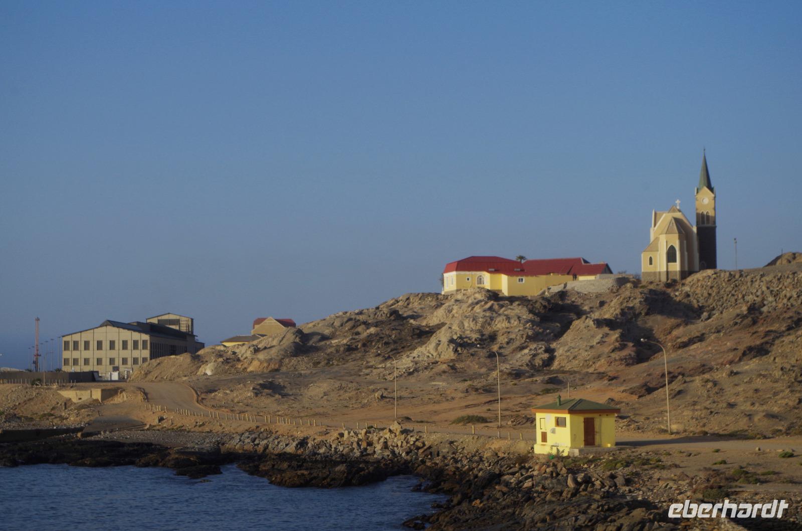 Nach einer Mittagspause im Cafe unternahmen wir eine Buchtenrundfahrt, die uns an die Atlantikküste brachte. Wir fuhren durch eine besonders karge, steinige Landschaft am Diamentensperrgebietes, vorbei an Salzfeldern und sahen viele Flamingos in den Buchten. Anders als erwartet, waren die Temperaturen recht mild und es war kaum stürmisch. An der Küste stiegen wir aus und blickten Pinguin-Insel Halifax hinüber. Am Diaz Point zog etwas Nebel auf. Leider konnten wir nicht zur Insel mit dem Diaz Kreuz hinüber. Die Brücke zum Diaz- Kreuz ist nun schon seit Jahren zerstört und es war Flut. 1488 ging portugisische Seefahrer Diaz bei seiner Erkundung des Seeweges nach dem Osten als erster Europäer an Land. Das oben aufgestellte Diaz Kreuz ist nur eine Kopie, Teile des Original Kreuzes befinden sich im Deutschen Historischen Museum in Berlin. Anschließend fuhren wir zum Nest-Hotel in Lüderitz, welches sich direkt am Wasser befindet. Alle Zimmer haben Meerblick. Nach einer kurzen Pause starteten wir zu einem Spaziergang durch das übersichtliche, farbenfrohe Lüderitz mit Annett. Wir erklommen den Diamantberg (fanden aber keine), sahen das Goerke-Haus und bummelten zur Waterfront, in dessen Hafen bald die AIDAmira auf Reede liegt. Zum Abschluss besuchten wir die Felsenkirche, die als eines der Wahrzeichen der Stadt gilt. Siggi war wie immer in der Kirche und verkaufte gern seine Postkarten. Vor der Kirche freute sich ein älterer Herr aus Lüderitz mit uns etwas schwatzen zu können. Am Abend speisten wir lecker vom Buffet im Hotelrestaurant. - Tagesetappe im Truck: 176 km