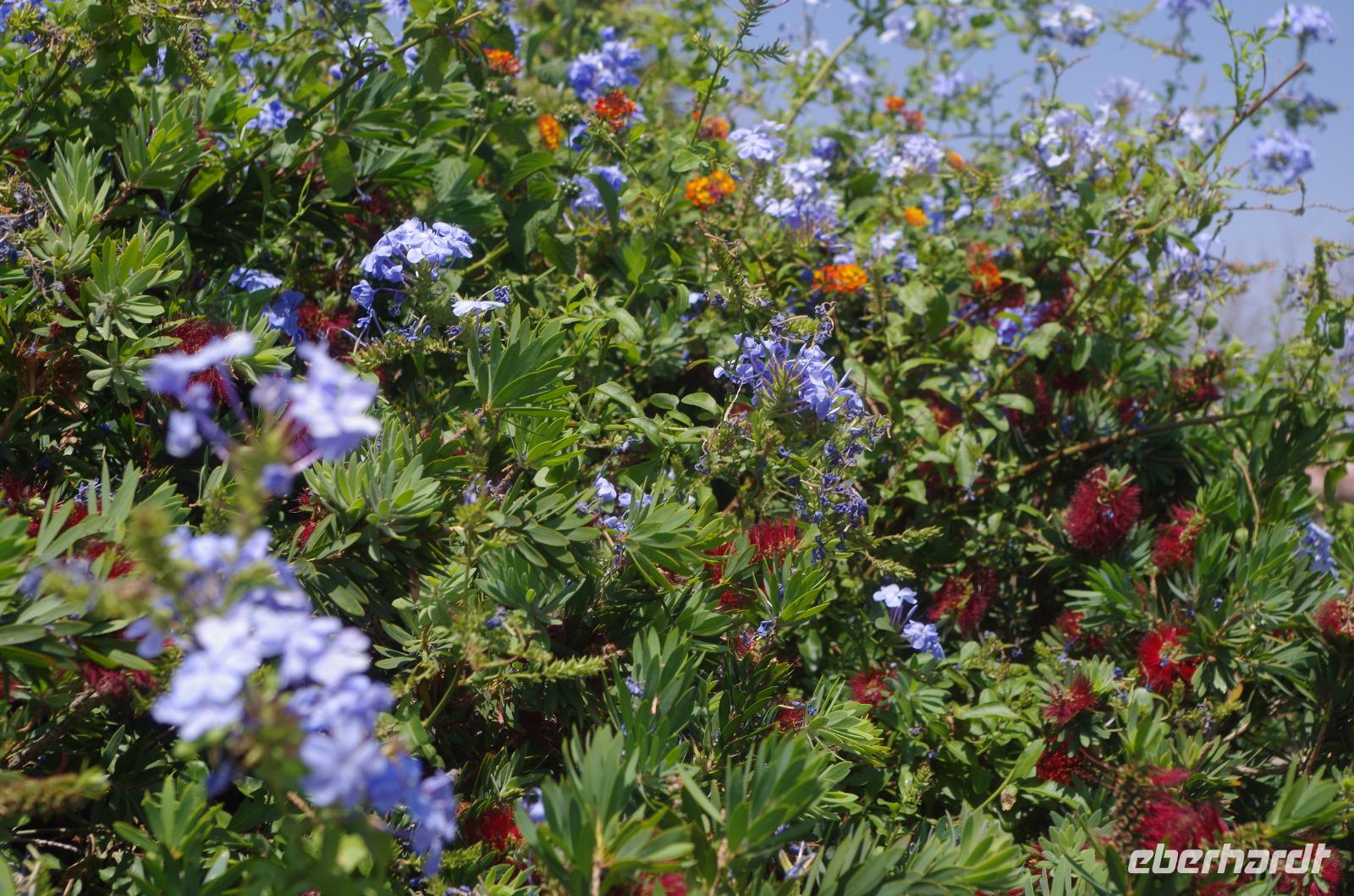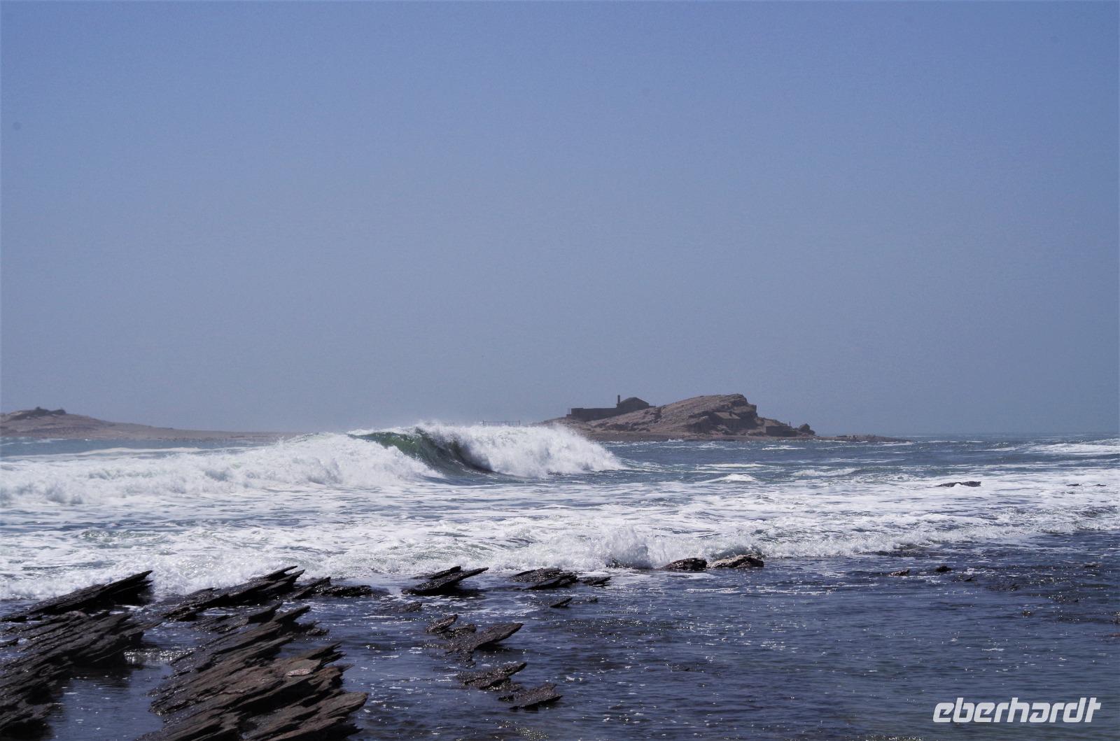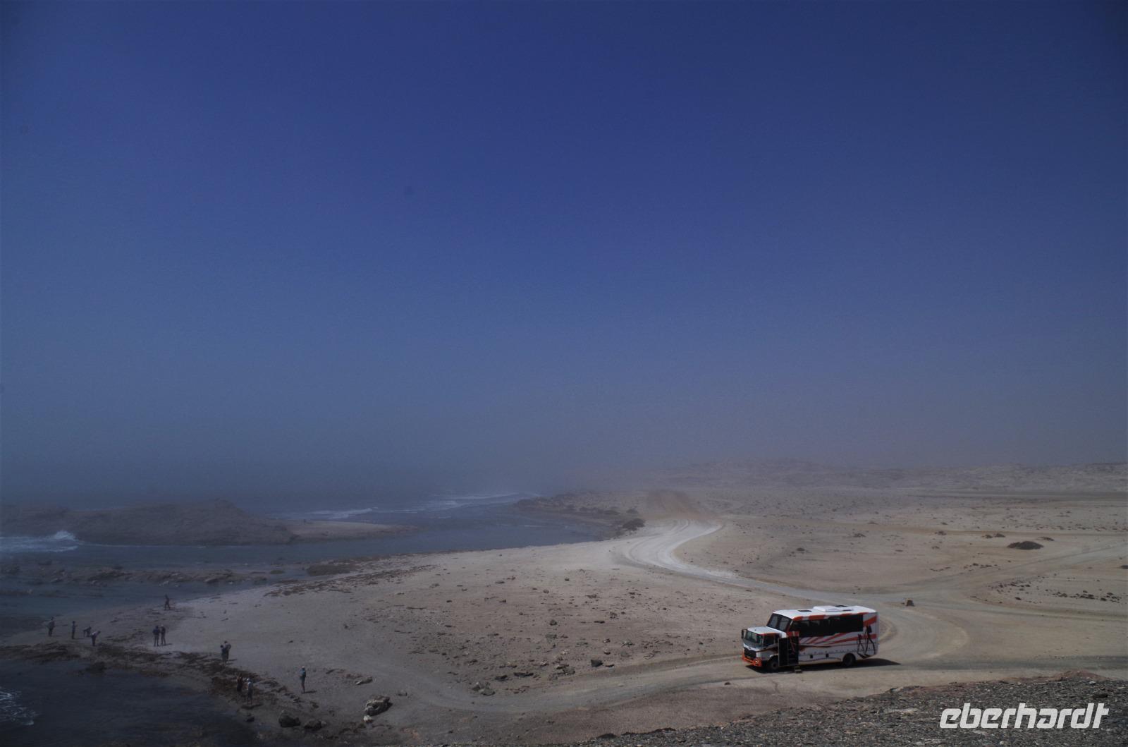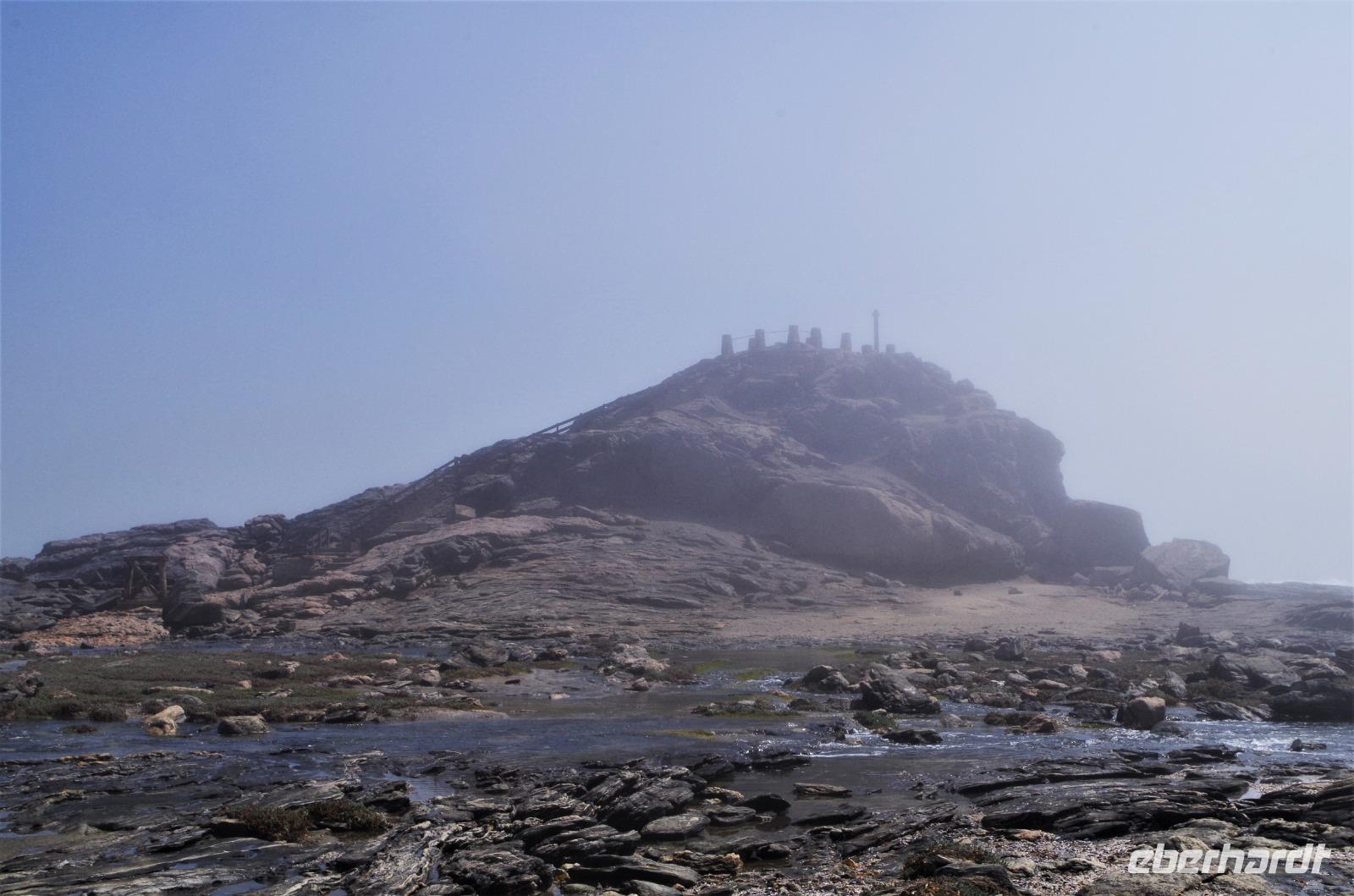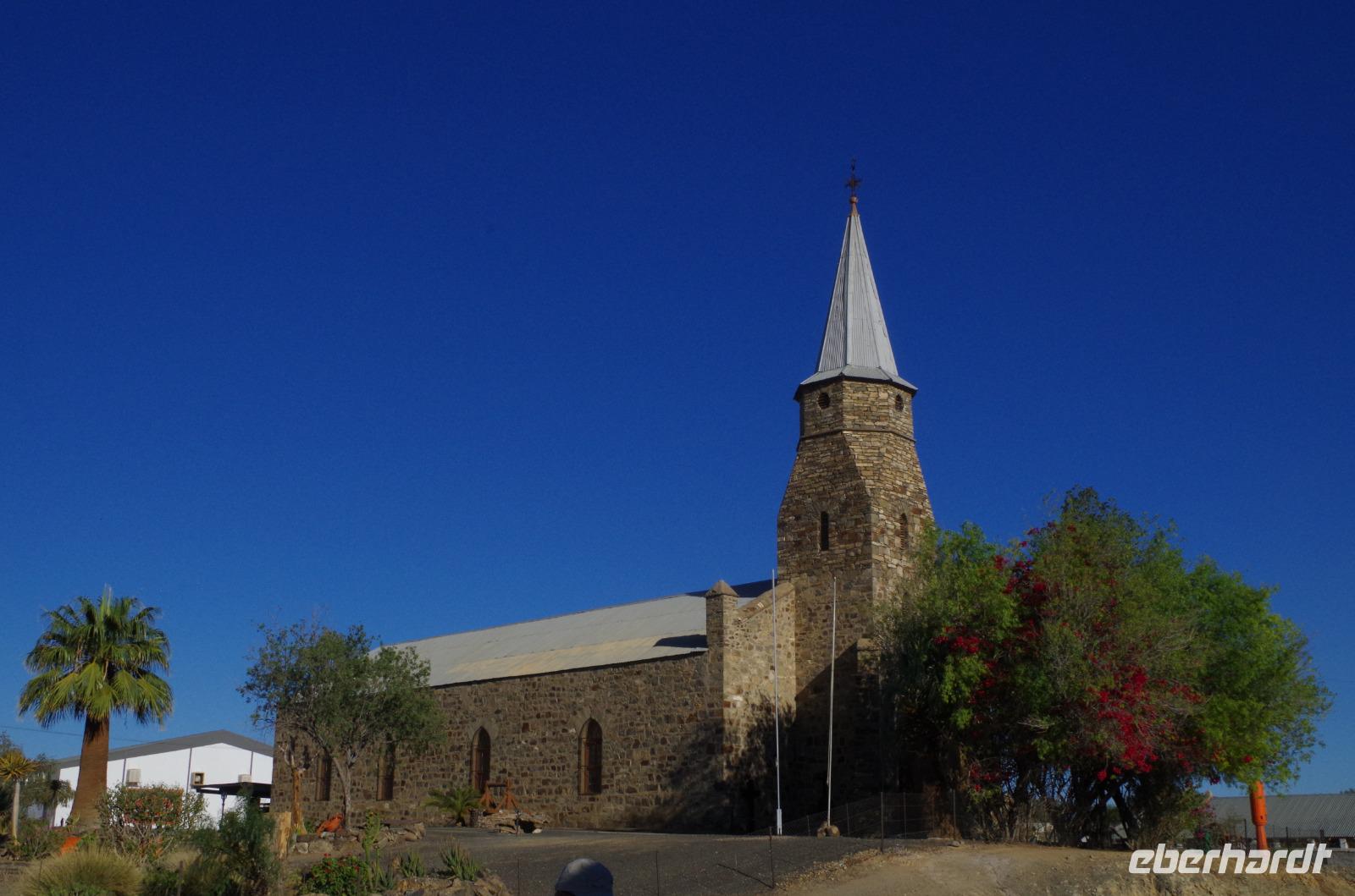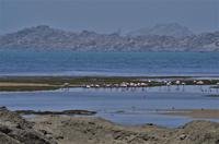Nach einer Mittagspause im Cafe unternahmen wir eine Buchtenrundfahrt, die uns an die Atlantikküste brachte. Wir fuhren durch eine besonders karge, steinige Landschaft am Diamentensperrgebietes, vorbei an Salzfeldern und sahen viele Flamingos in den Buchten. Anders als erwartet, waren die Temperaturen recht mild und es war kaum stürmisch. An der Küste stiegen wir aus und blickten Pinguin-Insel Halifax hinüber. Am Diaz Point zog etwas Nebel auf. Leider konnten wir nicht zur Insel mit dem Diaz Kreuz hinüber. Die Brücke zum Diaz- Kreuz ist nun schon seit Jahren zerstört und es war Flut. 1488 ging portugisische Seefahrer Diaz bei seiner Erkundung des Seeweges nach dem Osten als erster Europäer an Land. Das oben aufgestellte Diaz Kreuz ist nur eine Kopie, Teile des Original Kreuzes befinden sich im Deutschen Historischen Museum in Berlin. Anschließend fuhren wir zum Nest-Hotel in Lüderitz, welches sich direkt am Wasser befindet. Alle Zimmer haben Meerblick. Nach einer kurzen Pause starteten wir zu einem Spaziergang durch das übersichtliche, farbenfrohe Lüderitz mit Annett. Wir erklommen den Diamantberg (fanden aber keine), sahen das Goerke-Haus und bummelten zur Waterfront, in dessen Hafen bald die AIDAmira auf Reede liegt. Zum Abschluss besuchten wir die Felsenkirche, die als eines der Wahrzeichen der Stadt gilt. Siggi war wie immer in der Kirche und verkaufte gern seine Postkarten. Vor der Kirche freute sich ein älterer Herr aus Lüderitz mit uns etwas schwatzen zu können. Am Abend speisten wir lecker vom Buffet im Hotelrestaurant. - Tagesetappe im Truck: 176 km