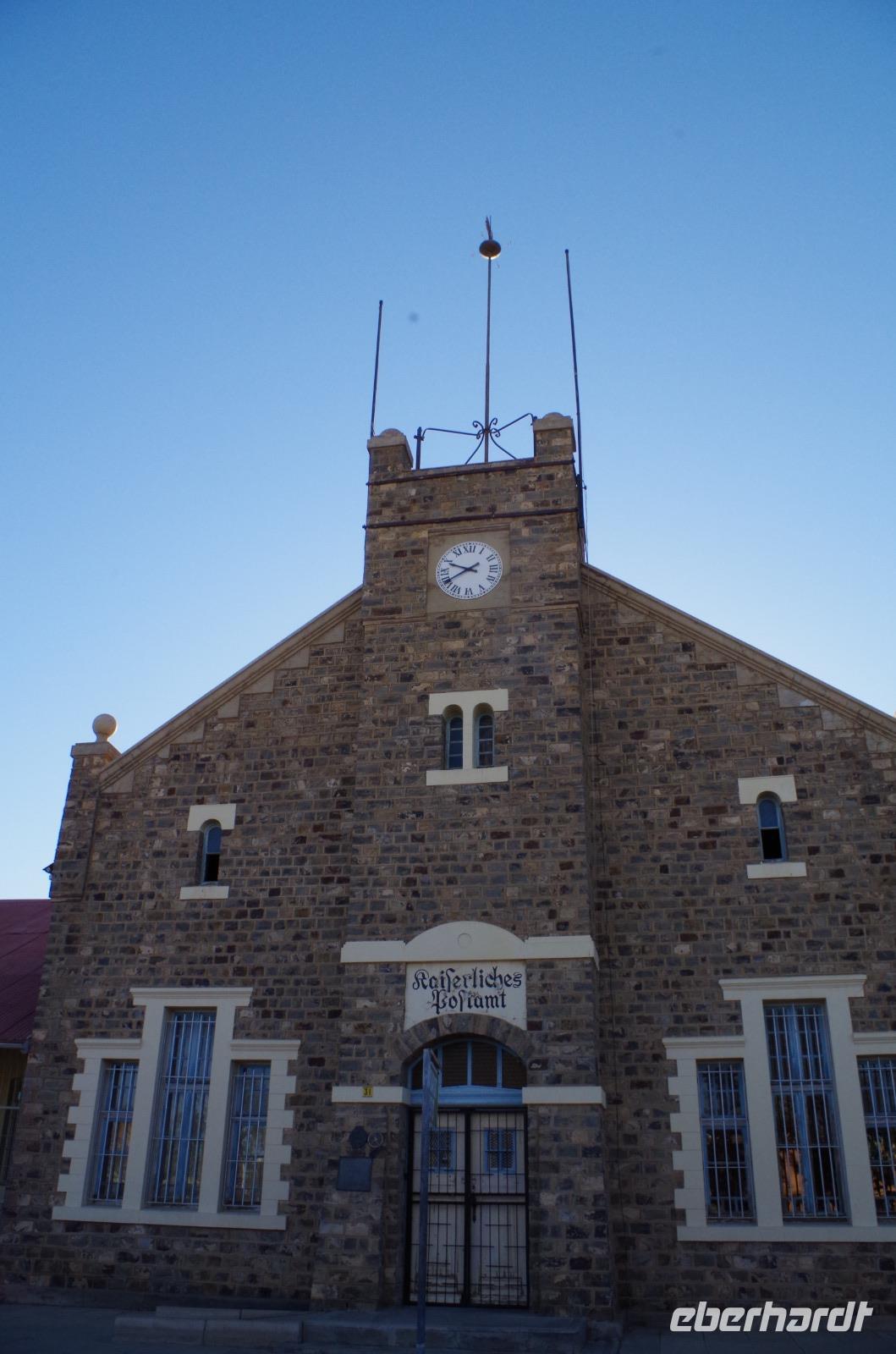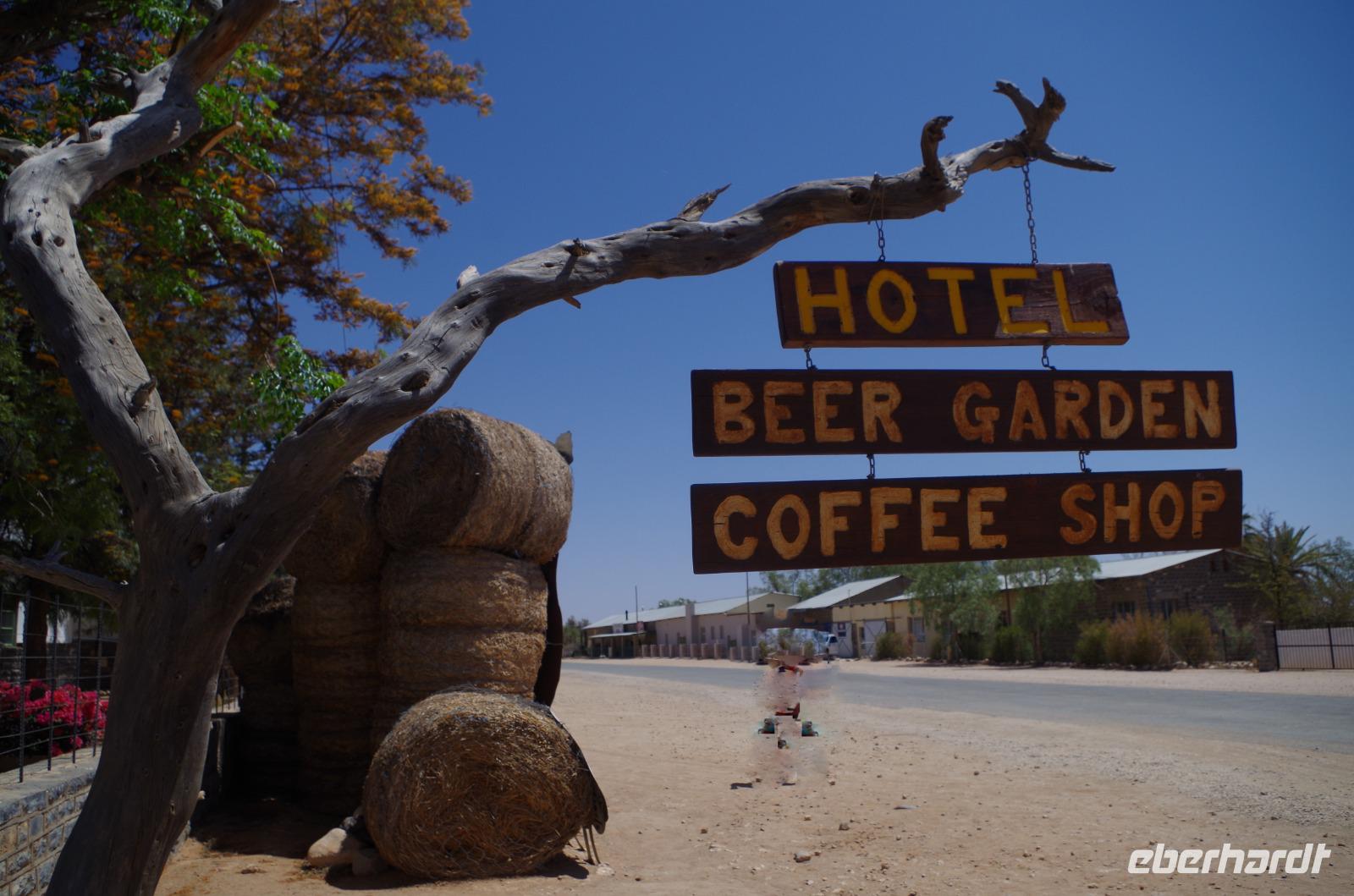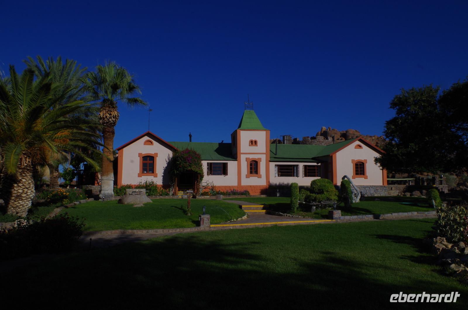 Nach einer Mütze Schlaf und einem guten Frühstück ging es auf Pad. Zur Mittagszeit erreichten wir die Region Keetmanshoop. In der Nähe befindet sich die private Farm Gariganus, wo sich der Köcherbaumwald und der Spielplatz der Riesen befindet. Zunächst fuhren wir zum Spielplatz der Riesen, "Giants Playground". Nach einem Mittagspicknick spazierten wir durch das Gelände, welches aussah wie ein unaufgeräumter Baumarkt. Enorme Temperaturunterschiede sprengten die Dolerit-Felsen auf und formten bizzare Gesteinsformationen. Fritz brachte nun auch sein geologisches Wissen an die Frau und den Mann: ca. 170 Mill. soll das Basaltgestein vulkanischen Ursprungs alt sein. Einzelne Gesteine waren mit schwarzem Wüstenlack (besteht aus Tonmineralien, die von Eisen- und Mangan-Oxiden zusammengehalten werden). Auf diesem Farmgebiet ist auch die Konzentration an Köcherbäumen so hoch, dass ein kleiner Wald gewachsen ist, den wir anschließend besuchten. Der Köcherbaum ist eine Aloen-Art, die ca. 8 m hoch werden kann, also kein Baum. Der Name stammt von den San, die aus den hohlen Ästen Pfeilköcher schnitzten. Fritz erzählte uns viel Interessantes dazu, auch seine Theorie, woher der Name stammen könnte. Viele Aloen sind hier ca. 200-300 Jahre alt und stehen unter Naturschutz. Am frühen Nachmittag kamen wir in Keetmanshoop an. Ursprünglich gegründet von der Rheinischen Mission, die den hier lebenden Namas den christlichen Glauben brachte. Später wurde der Ort nach dem deutschen Kaufmann und Bankier Johann Keetman benannt, der damals Direktor der Rheinischen Missionsgesellschaft war und viel Geld investierte, aber niemals hier war. Heute nächtigten wir im kultigen Schützenhaus, das älteste deutsche Klubhaus in Namibia. Den hiesigen Knobelklub gibt es heute noch! Nach dem Check In bummelten die Gäste mit Annett durch das Farmer-Städtchen mit der alten Felsenkirche und dem kaiserlichem Postamt, einen Central Park gibt es hier auch.