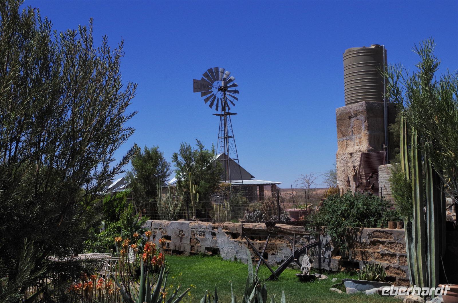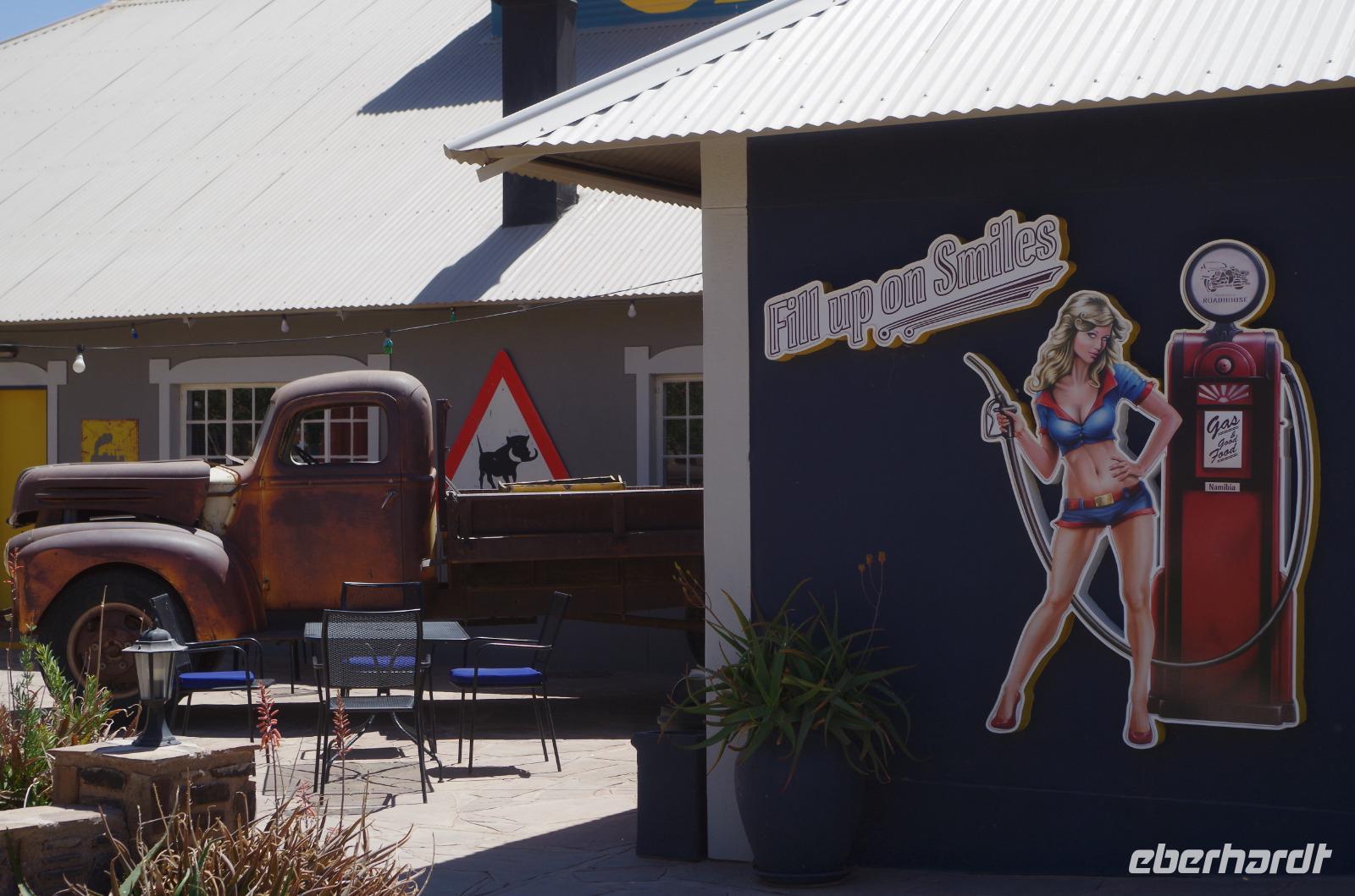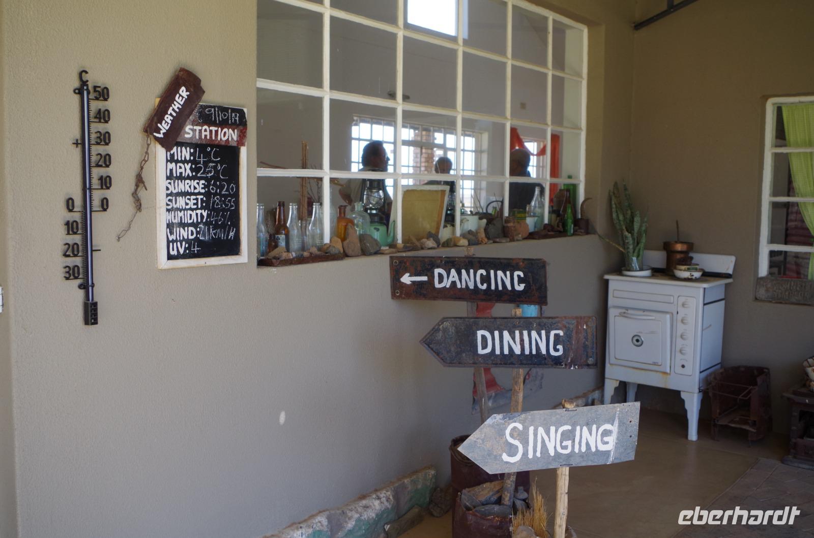 Nach dem Frühstück starteten wir in Richtung Süden. Am Naute-Staudamm, der reichlich Wasser staute, machten wir einen Fotostopp. Der Wasserspeicher versorgt die Region um Keetmanshoop mit Wasser. Und überall, wo Wasser reichlich vorhanden ist, entstehen kleine Oasen in der sonst kargen, trockenen Landschaft. Hier blickten wir auf grüne Tafeltrauben-Felder und Dattelpalmenhaine. Die Dattelplantage wird von einem arabischen Unternehmen geführt, die Datteln dann im Orient vermarktet. Die Weintrauben verbleiben meist im Land und werden zur Wein- und Schnapsherstellung genommen. Kein Wunder also, dass sich die deutsch-namibische Familie Weder hier ein 2. Standbein aufbaute. In Omaruru betreiben sie schon seit langem die Kristall-Kellerei, wo man Weine aus eigenem Anbau verkosten kann. Vor einigen Jahren entstand am Naute-Damm die Destillerie Naute-Kristall. Die Chefin lud zugleich zur Verkostung der erlesenen Brände wie Teufelskrallen Gin ein. Die edlen Brände werden auch bis nach Deutschland verschifft. Auch der Kaffee und der Kuchen ist hier total lecker. Gut gelaunt truckten wir entlang der Eisenbahnstrecke nach Holoog weiter. Dort besichtigten wir einen alten Kalkbrennofen. Unterwegs versuchte uns Fritz mit der Klicksprache der San vertraut zu machen. Beim Versuch, die Schnalzlaute zu formen (es gibt bis zu 5) verknoteten sich unsere Zungen. Später erreichten wir das urige und kultige Canon Roadhouse, ein Rasthaus mitten in der Wüste, dekoriert mit rostigen Oldtimern, die zugleich Pflanzkübel für Sukkulenten sind, der alten Tanke, die heute als Bar ihren Zweck erfüllt und Oryxen, die einsam durch das Gelände streifen. Hier wurden wir von einem Sandsturm überrascht. Am Nachmittag erreichten wir die fantastische Canon Lodge am Fish River Park und bezogen unsere exklusiven Häuschen rings um die Felsen. Die Lodge befindet sich auf dem Gelände einer alten Farm aus Deutsch Südwest, also Geschichte pur.