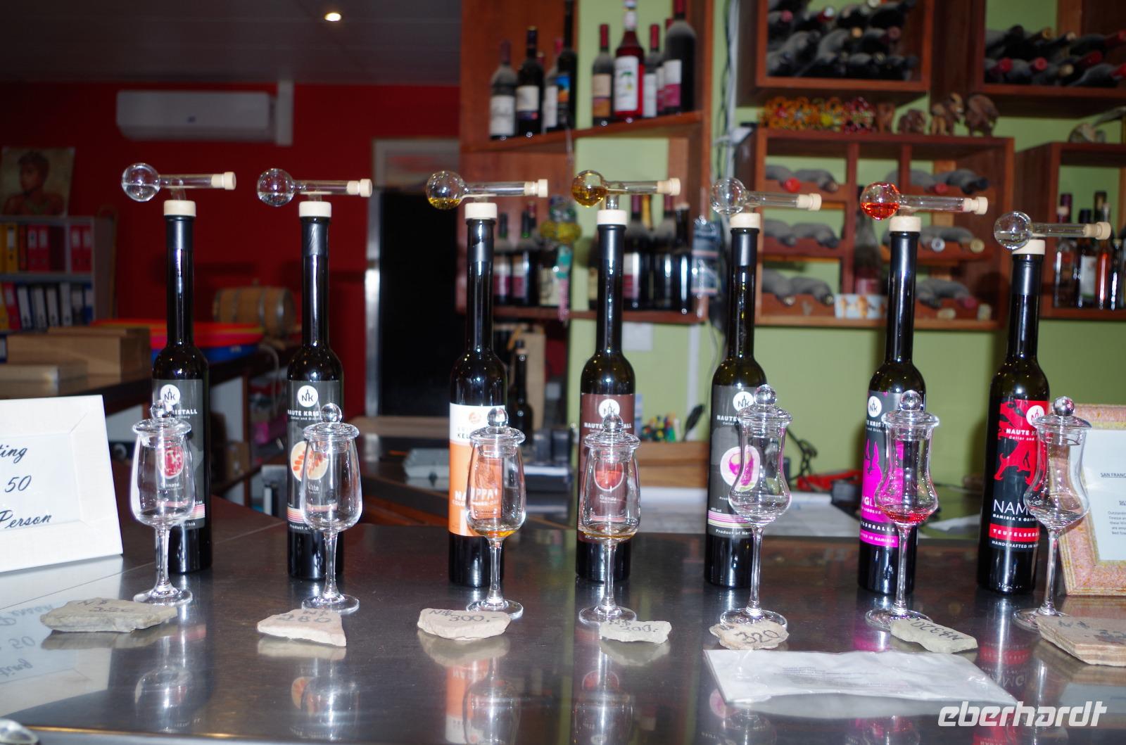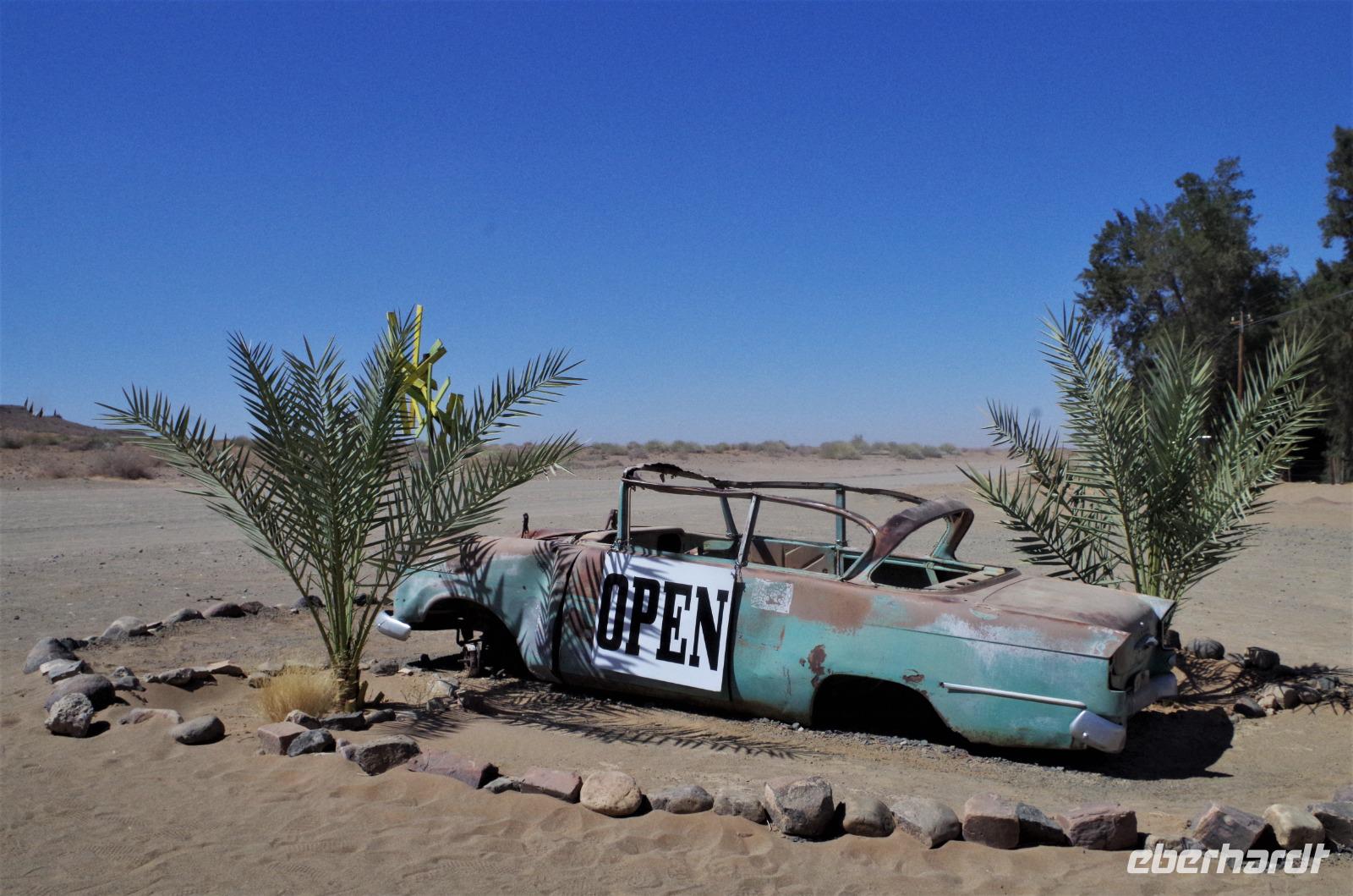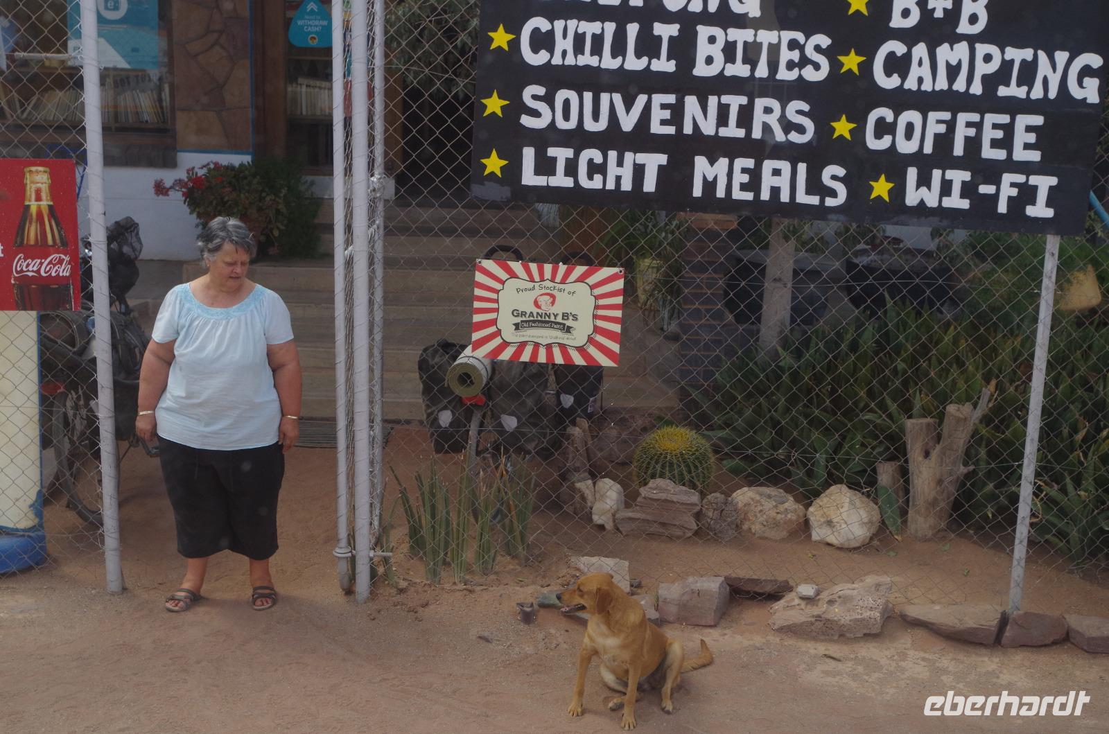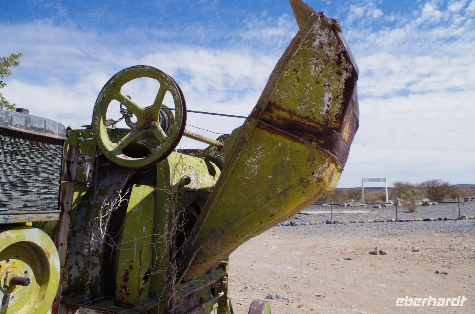 Nach dem Frühstück starteten wir in Richtung Süden. Am Naute-Staudamm, der reichlich Wasser staute, machten wir einen Fotostopp. Der Wasserspeicher versorgt die Region um Keetmanshoop mit Wasser. Und überall, wo Wasser reichlich vorhanden ist, entstehen kleine Oasen in der sonst kargen, trockenen Landschaft. Hier blickten wir auf grüne Tafeltrauben-Felder und Dattelpalmenhaine. Die Dattelplantage wird von einem arabischen Unternehmen geführt, die Datteln dann im Orient vermarktet. Die Weintrauben verbleiben meist im Land und werden zur Wein- und Schnapsherstellung genommen. Kein Wunder also, dass sich die deutsch-namibische Familie Weder hier ein 2. Standbein aufbaute. In Omaruru betreiben sie schon seit langem die Kristall-Kellerei, wo man Weine aus eigenem Anbau verkosten kann. Vor einigen Jahren entstand am Naute-Damm die Destillerie Naute-Kristall. Die Chefin lud zugleich zur Verkostung der erlesenen Brände wie Teufelskrallen Gin ein. Die edlen Brände werden auch bis nach Deutschland verschifft. Auch der Kaffee und der Kuchen ist hier total lecker. Gut gelaunt truckten wir entlang der Eisenbahnstrecke nach Holoog weiter. Dort besichtigten wir einen alten Kalkbrennofen. Unterwegs versuchte uns Fritz mit der Klicksprache der San vertraut zu machen. Beim Versuch, die Schnalzlaute zu formen (es gibt bis zu 5) verknoteten sich unsere Zungen. Später erreichten wir das urige und kultige Canon Roadhouse, ein Rasthaus mitten in der Wüste, dekoriert mit rostigen Oldtimern, die zugleich Pflanzkübel für Sukkulenten sind, der alten Tanke, die heute als Bar ihren Zweck erfüllt und Oryxen, die einsam durch das Gelände streifen. Hier wurden wir von einem Sandsturm überrascht. Am Nachmittag erreichten wir die fantastische Canon Lodge am Fish River Park und bezogen unsere exklusiven Häuschen rings um die Felsen. Die Lodge befindet sich auf dem Gelände einer alten Farm aus Deutsch Südwest, also Geschichte pur.