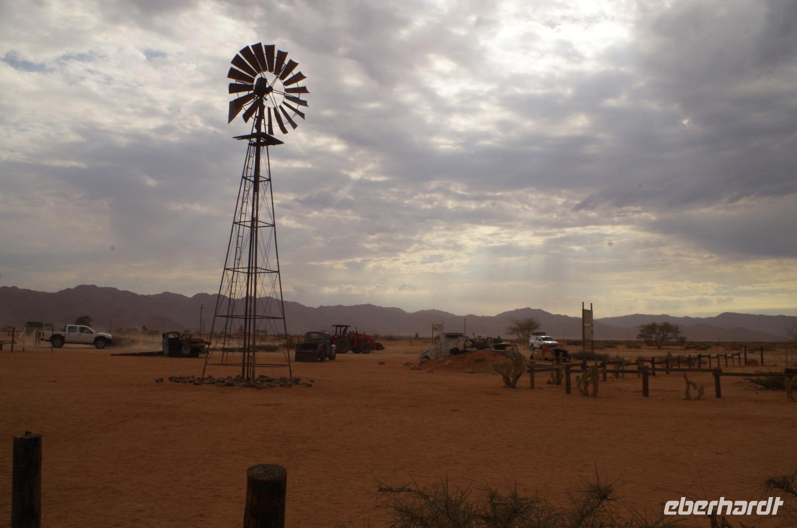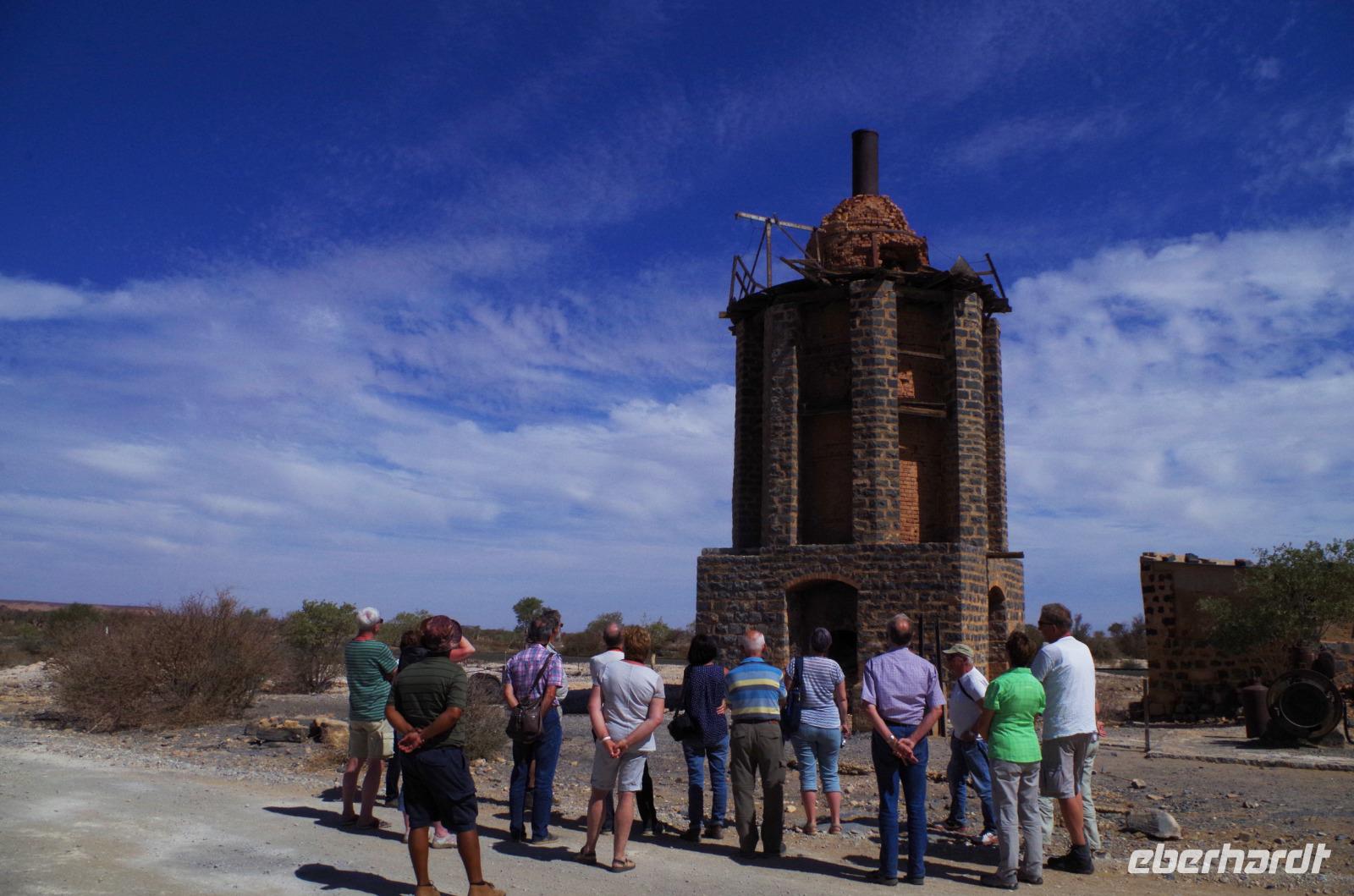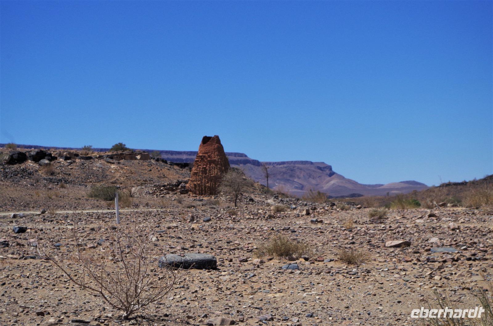 An der Strecke lag der fast verlassene Ort Seeheim, der früher Station der deutschen Schutztruppe war und durch den Bau der Eisenbahn ein wichtiger Verkehrsknotenpunkt war. Wir überquerten den trockenen Fisch-Fluss. Am Mittag erreichten wir Goageb und verbrachten unsere Pause bei Frikkie und Hilde auf der ihrer urigen Lodge Alte Kalköfen. Auf dem Farmgelände steht noch ein alter Brennofen, in dem früher der Kalk gebrannt wurde. Die Lodge befindet sich auf der ehemaligen Farm Simplon und ist mit viel Liebe zum Details ausgestattet. Natürlich zeigte uns Frikkie seine berühmten Lebenden Steine, die Lithops. Das Ehepaar besitzt die einzige offizielle Lizenz in Namibia, diese seltenen und geschützten Wüstenpflanzen zu sammeln. Danach ging es weiter zur Klein Aus Vista Lodge, unserer nächsten Unterkunft in Aus. Tagesetappe im Truck: 347 km