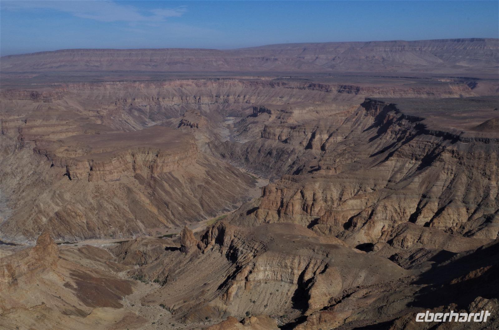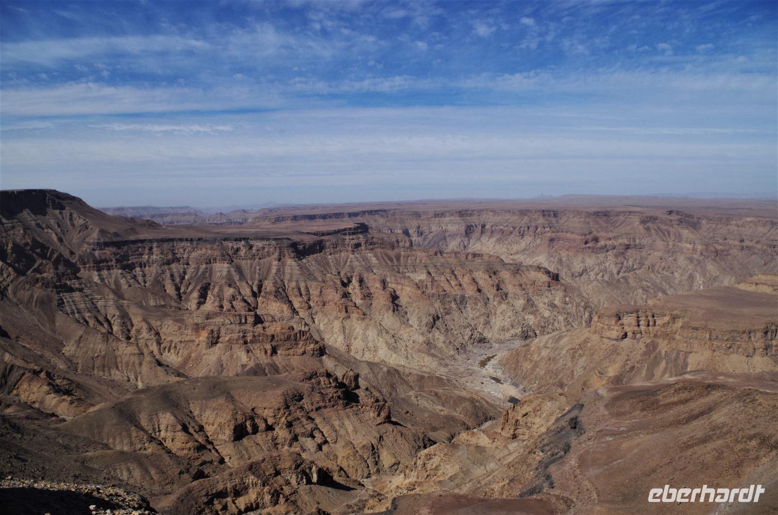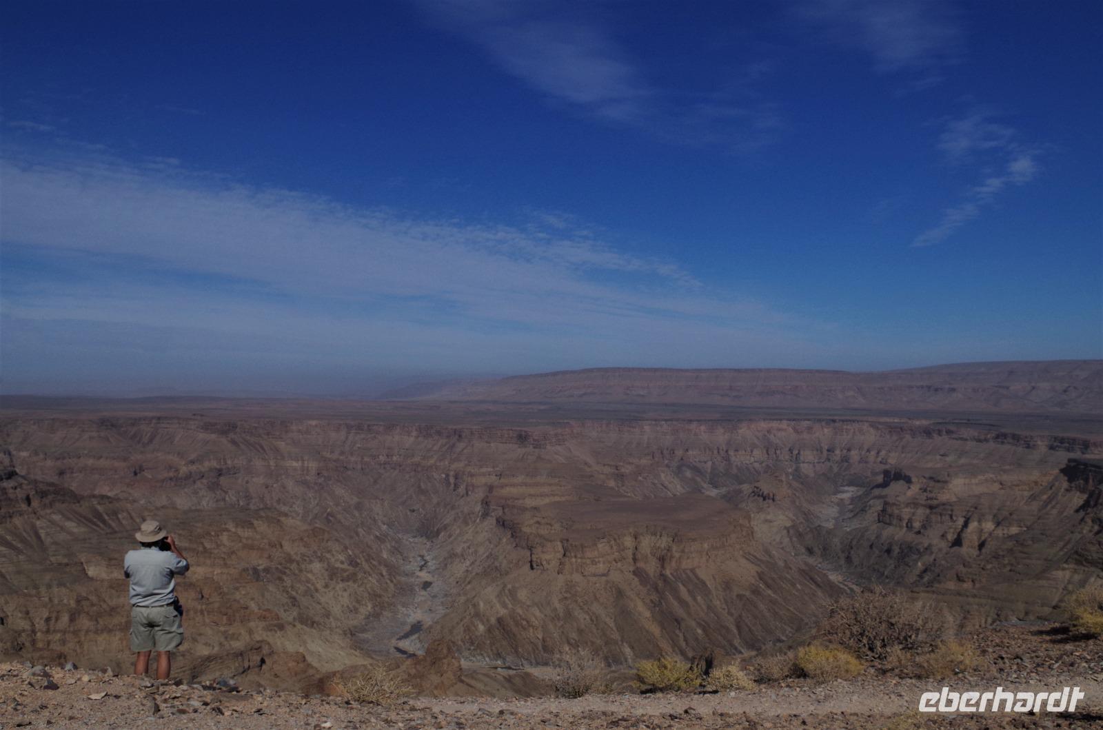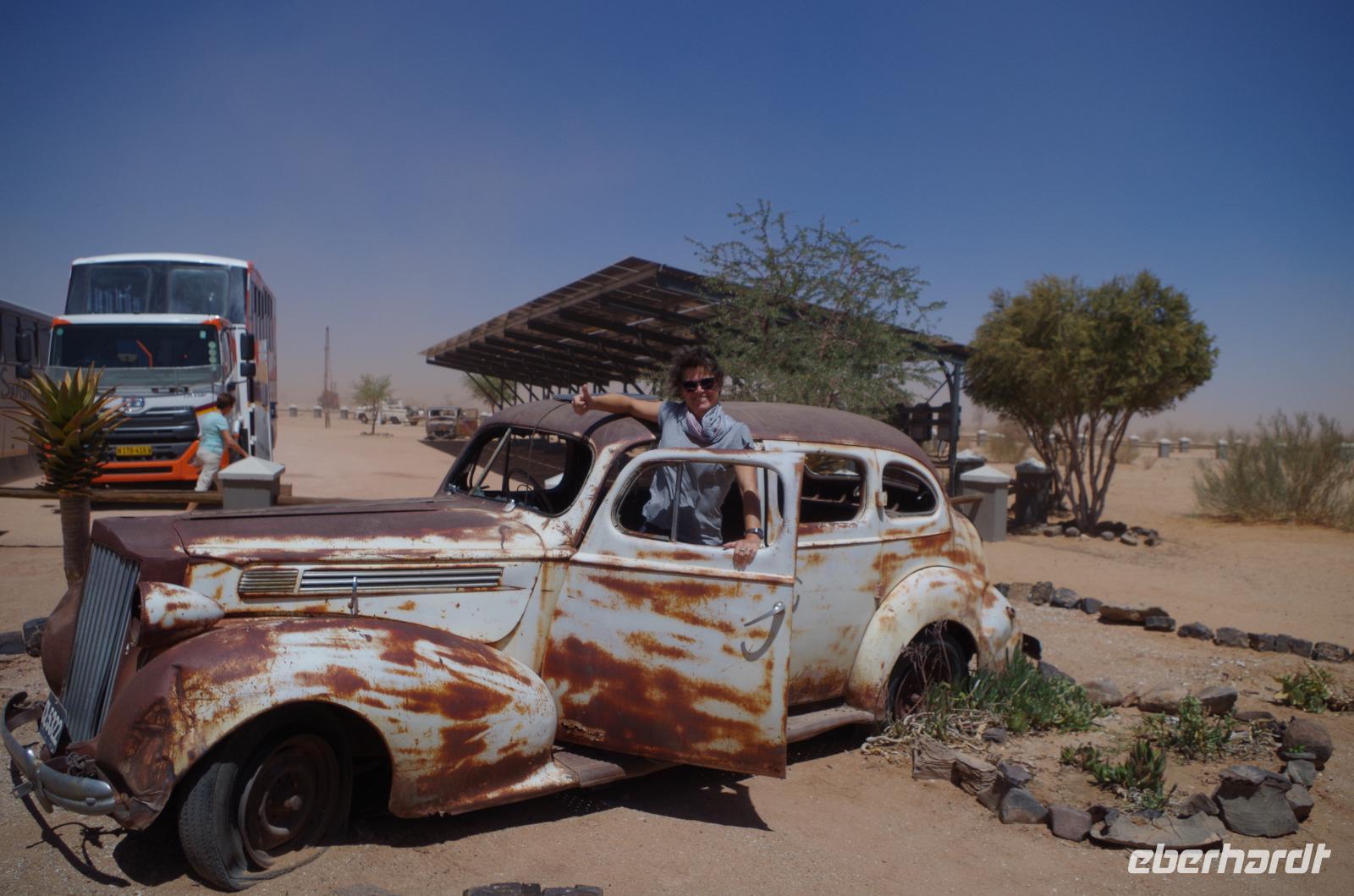 Herrlich wie die Sonne in dieser einzigartigen Landschaft aufging und die Felsen golden anstrahlte. Am Vormittag fuhren zum Fish River Canyon. Am obersten Aussichtpunkt stiegen wir aus dem Truck. Vor unseren Augen tauchte plötzlich als großes, langes Loch im Boden auf - eine spektakuläre Aussicht auf den Canyon. Der Fish River windet sich, wenn er Wasser führt, durch den 550 Meter tiefen Canyon und bildet somit die zweitgrößte Schluchtenlandschaft der Erde. Zu unsere Reisezeit war er vollkommen ausgetrocknet. Wir spazierten entlang der Kante, immer wieder boten sich andere Fotomotive. Am Ende unseres Spazierganges, dort wo der Einstieg zur mehrtägigen Wanderung in den Canyon ist, erzählte uns Fritz noch Interessantes zur Geologie und den sogenannten Stromatolithen. Dort bestiegen wir auch wieder unseren Truck. Am Ausgang des Nationalparks klapperte der Truck und es wurde staubig. Mit vereinten Kräften und „Beschwörungen" machte es nach kurzer Zeit „Klack" und wieder konnten weiter fahren.