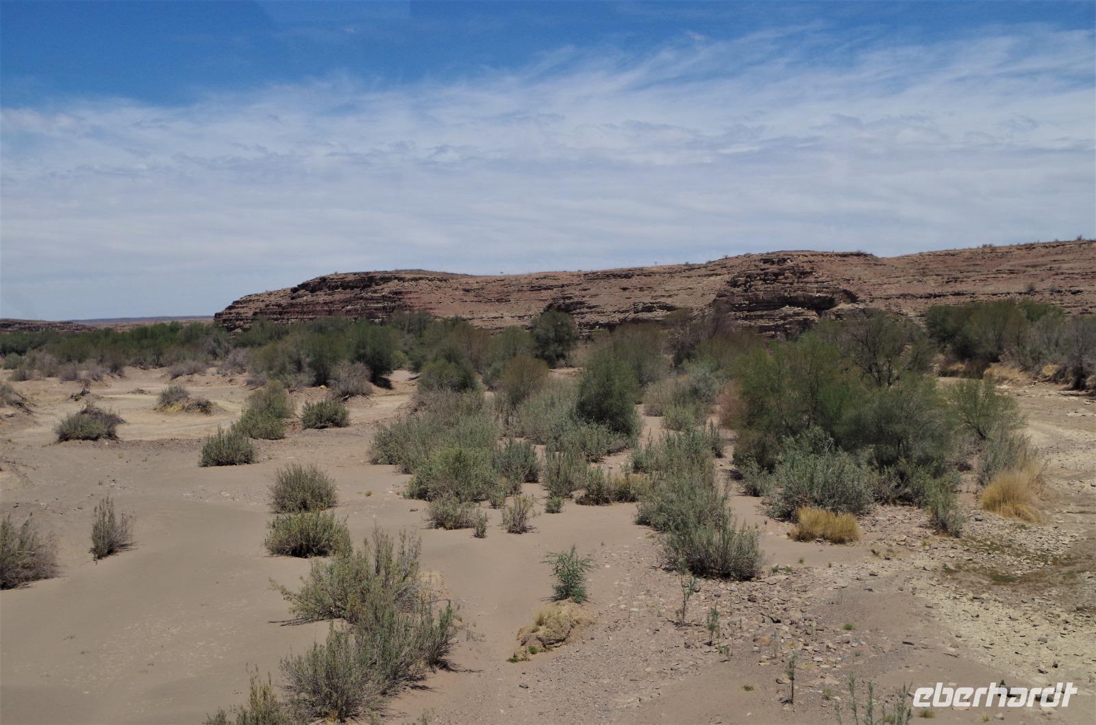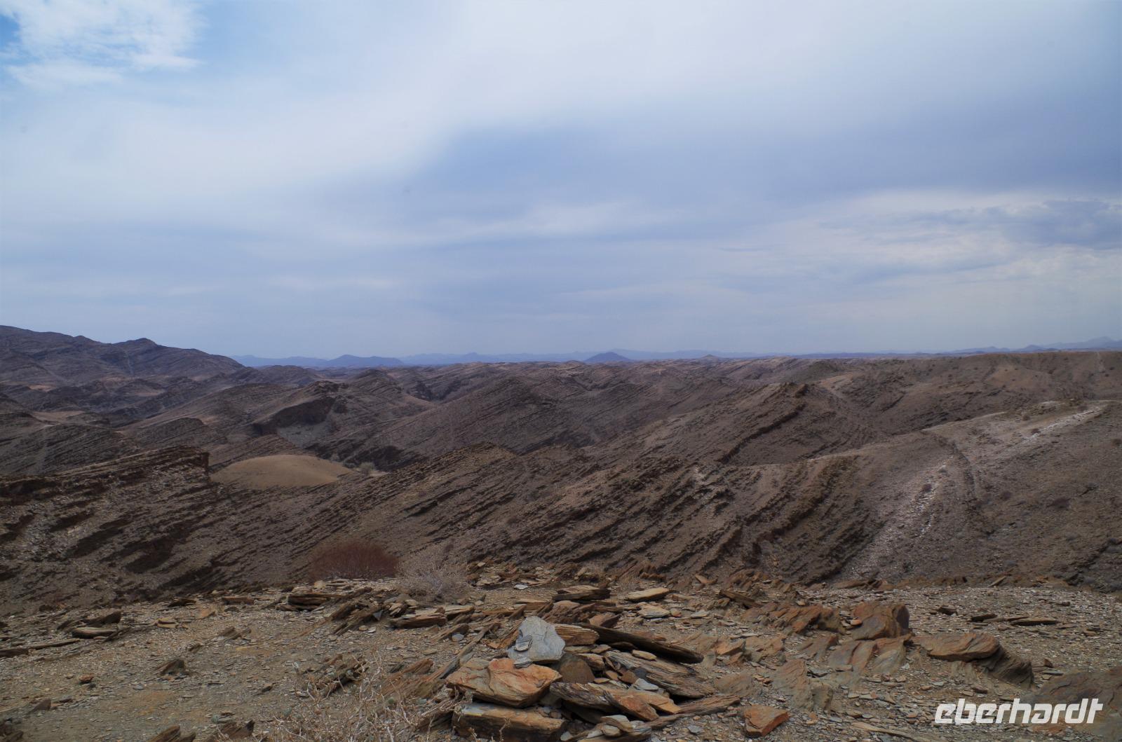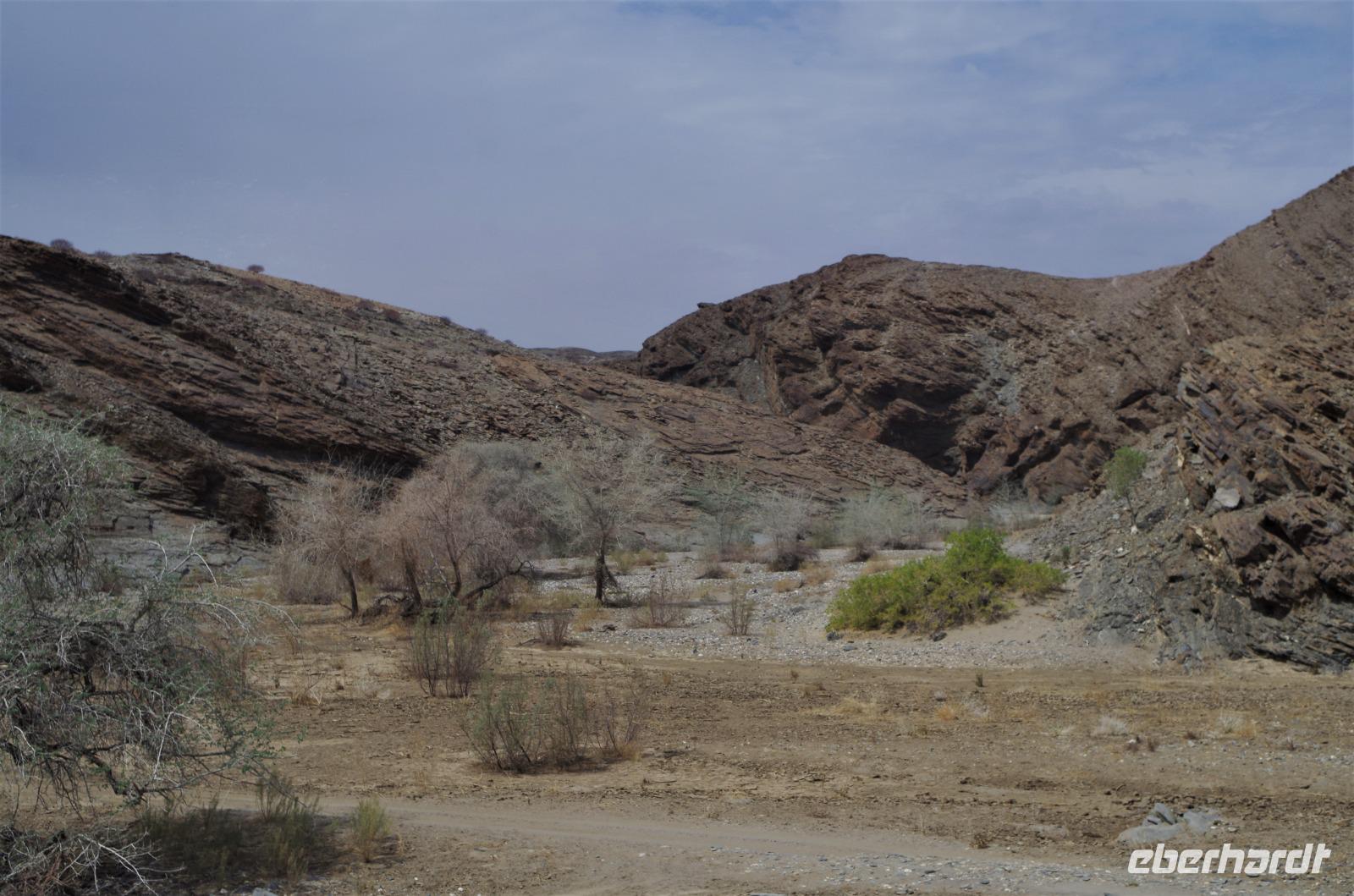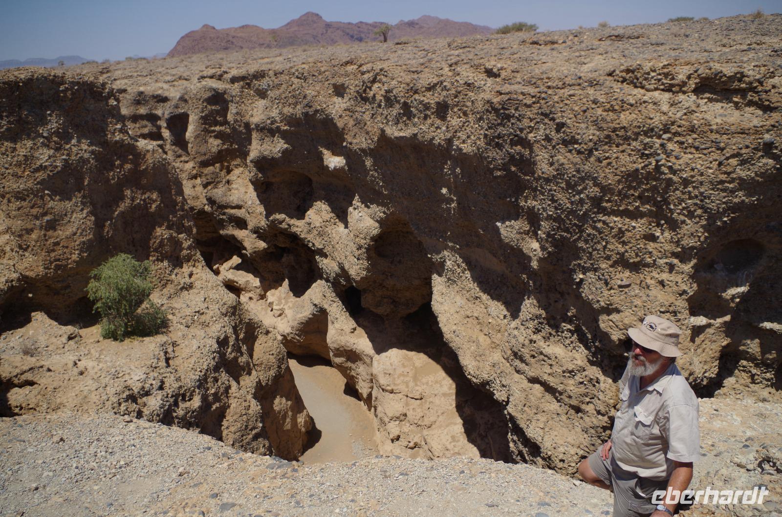 Herrlich wie die Sonne in dieser einzigartigen Landschaft aufging und die Felsen golden anstrahlte. Am Vormittag fuhren zum Fish River Canyon. Am obersten Aussichtpunkt stiegen wir aus dem Truck. Vor unseren Augen tauchte plötzlich als großes, langes Loch im Boden auf - eine spektakuläre Aussicht auf den Canyon. Der Fish River windet sich, wenn er Wasser führt, durch den 550 Meter tiefen Canyon und bildet somit die zweitgrößte Schluchtenlandschaft der Erde. Zu unsere Reisezeit war er vollkommen ausgetrocknet. Wir spazierten entlang der Kante, immer wieder boten sich andere Fotomotive. Am Ende unseres Spazierganges, dort wo der Einstieg zur mehrtägigen Wanderung in den Canyon ist, erzählte uns Fritz noch Interessantes zur Geologie und den sogenannten Stromatolithen. Dort bestiegen wir auch wieder unseren Truck. Am Ausgang des Nationalparks klapperte der Truck und es wurde staubig. Mit vereinten Kräften und „Beschwörungen" machte es nach kurzer Zeit „Klack" und wieder konnten weiter fahren.