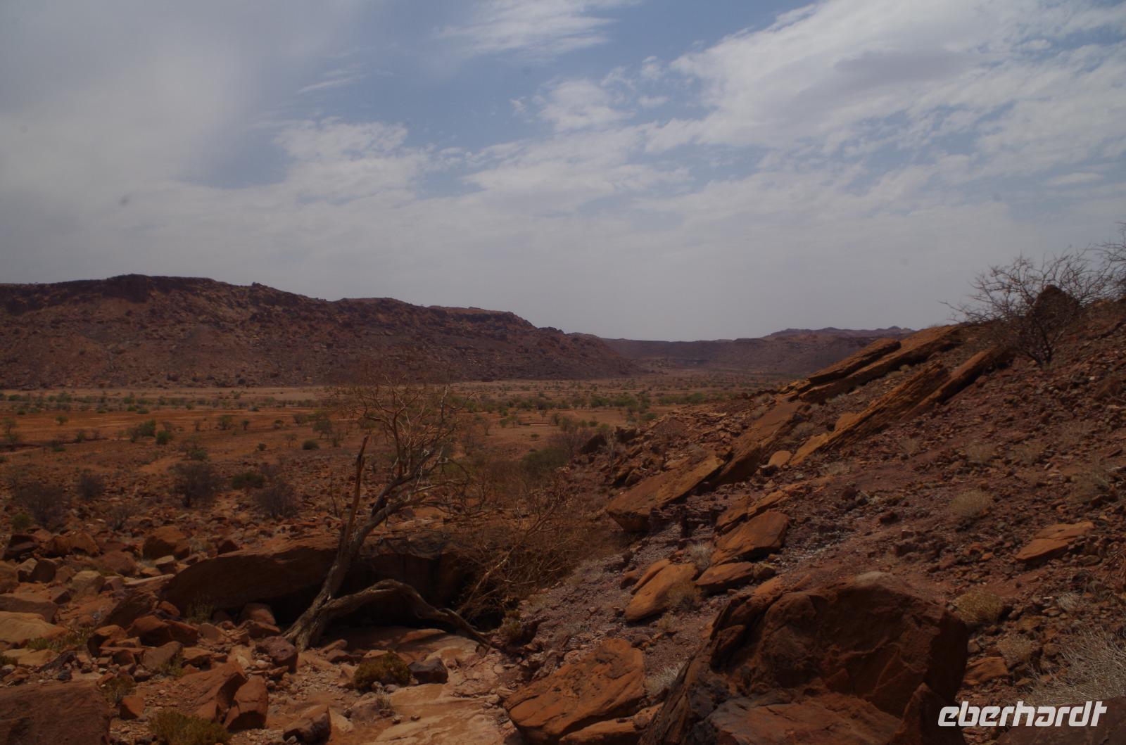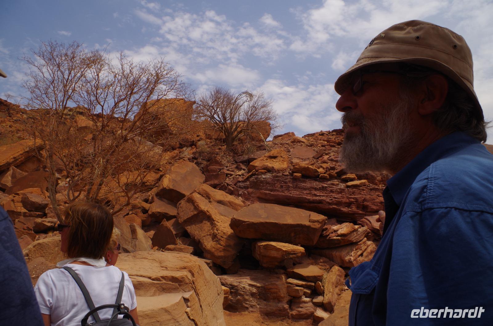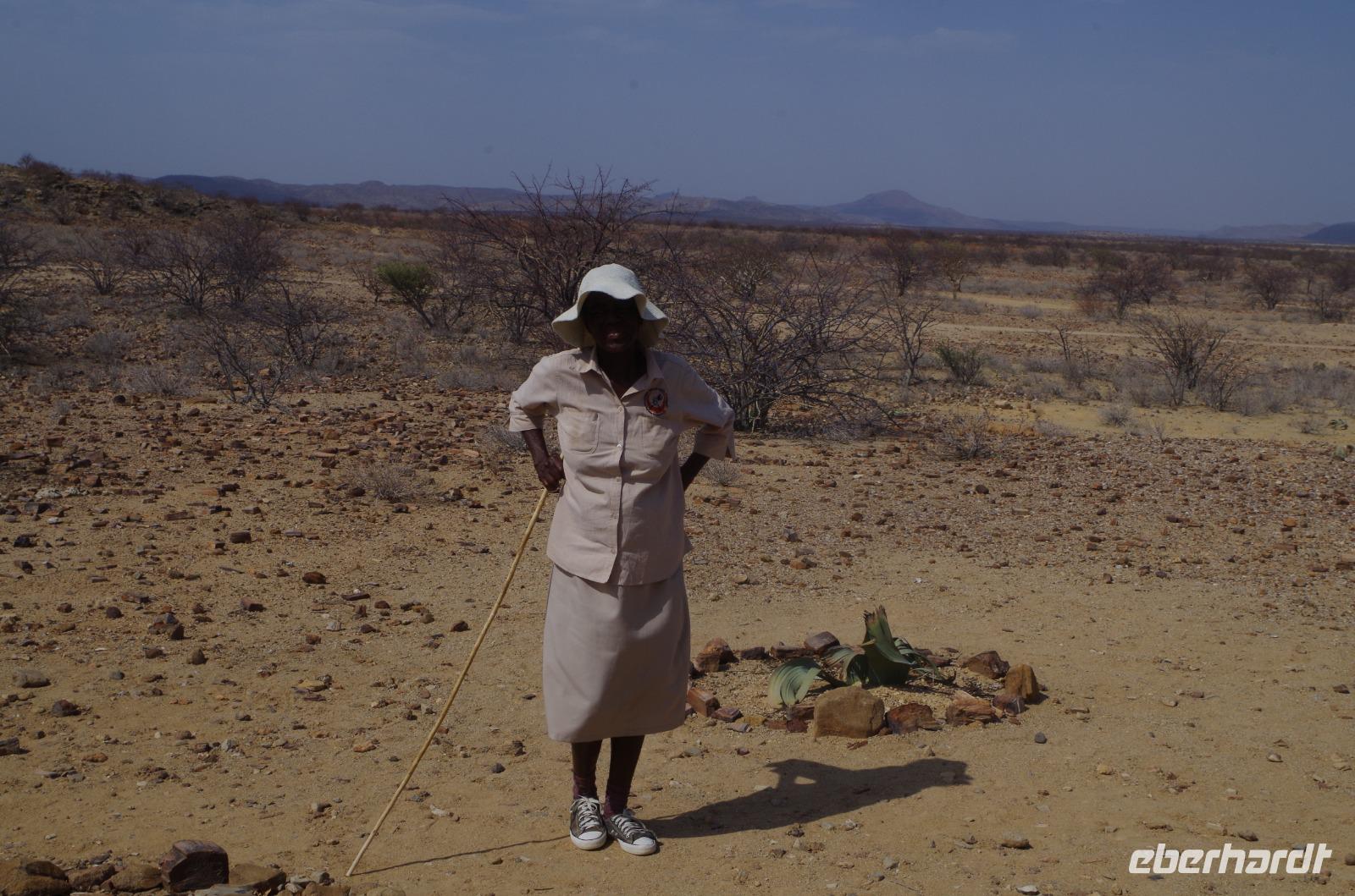 Da die Pad auf der touristischen Route via Twyfelfontein nach Khorixas in einem äußerst schlechten Zustand ist, haben wir uns entschieden, sehr früh loszufahren. Auf Salz-Pad truckten wir in nördliche Richtung, immer parallel am Atlantik entlang. In Henties Bay machten wir einen kurzen Tankstopp bevor wir dann gen Osten abbogen. Nach einem kurzen Zwischenstopp in Uis, einem alten Zinnminenort fuhren wir weiter durch die trockene, sehr dünn besiedelte Gegend. In der Ferne sehen wir den höchsten Berg Namibias, den Brandberg (2.574 m). Bald ging es auf der Rüttelpiste weiter. Schilder mit Achtung Elefanten! Standen am Wegesrand, live gesehen haben wir leider keine Wüstenelefanten, die in dieser Gegend leben. Bei Sorris Sorris hielten wir bei den Ständen der Herero-Damen an. Die Hereros, besonders die Damen sind gute Geschäftsleute und haben sich hier ein kleines Business aufgebaut haben. Aus bunten Stoffen fertigen sie mit ihren alten Singer-Nähmaschinen Taschen und kleine Püppchen. Das ein oder andere Souvenir wechselte seinen Besitzer. Die stolzen Herero-Frauen tragen traditionell üppige, bunte Kleider im viktorianischen Stil, die sie selbst schneidern und den dazugehörigen Kopfschmuck mit den stilisierten Hörnern von Rindern. Manchmal sind es bis zu 16 Unterröcke, die sie unter den Kleidern tragen. Huch, und das tragen sie bei 40° C und mehr! Auch heute ist es wieder extrem heiß! Wir fahren weiter durch das Damara-Land. Unser Ziel: Twyfelfontein, das erste unter Schutz gestellte Nationalmonument Namibias. Bekannt ist Twyfelfontein (zweifelhafte Quelle) für seine Felsgravuren. Dort empfängt uns zunächst ein heftiger, heißer Sandsturm. Fritz begleitet uns auf dem Rundweg durch die Felsenlandschaft. In dem orange-rotem, heißen Gestein bestaunen wir 2.000-6.000 Jahre alte, gut erhaltene Felsgravuren mit Tiermotiven, die zum UNESCO-Weltkulturerbe zählen. Besonders wertvoll ist die Gravur des Löwen. Diese hat eine sehr spirituelle Bedeutung für die Buschleute, stellt es doch die Verbindung zwischen Erde und Himmel dar. Aufgrund der Hitze war die, eigentlich kleine Wanderung doch etwas anstrengend und wir sind froh wieder im Truck zu sitzen, obwohl es immer noch kräftig schüttelt. Wir fahren weiter zum Versteinerten Wald, wo uns Suzanne, eine zierliche Damara erwartet. Sie spricht sogar etwas deutsch und singt mit uns deutsche Volkslieder. Ein Männlein steht im Walde, so los geht's...... Sie begleitet uns auf dem kurzweiligen Spaziergang und Fritz erklärt uns, wie das versteinerte Holz durch Erosion entstand und über dessen Millionen alte Geschichte. Auch entdeckten wir hier die Welwitschia, die Nationalpflanze, die auch auf dem namibischen Wappen zu sehen ist. Mittlerweile war es nicht mehr so heiß und ein winziges Lüftchen wehte. Am Nachmittag hatten wir dann endlich wieder Asphalt unterm Hintern und checkten in der Damara Mopane Lodge mit echter Schrebergartenidylle ein.