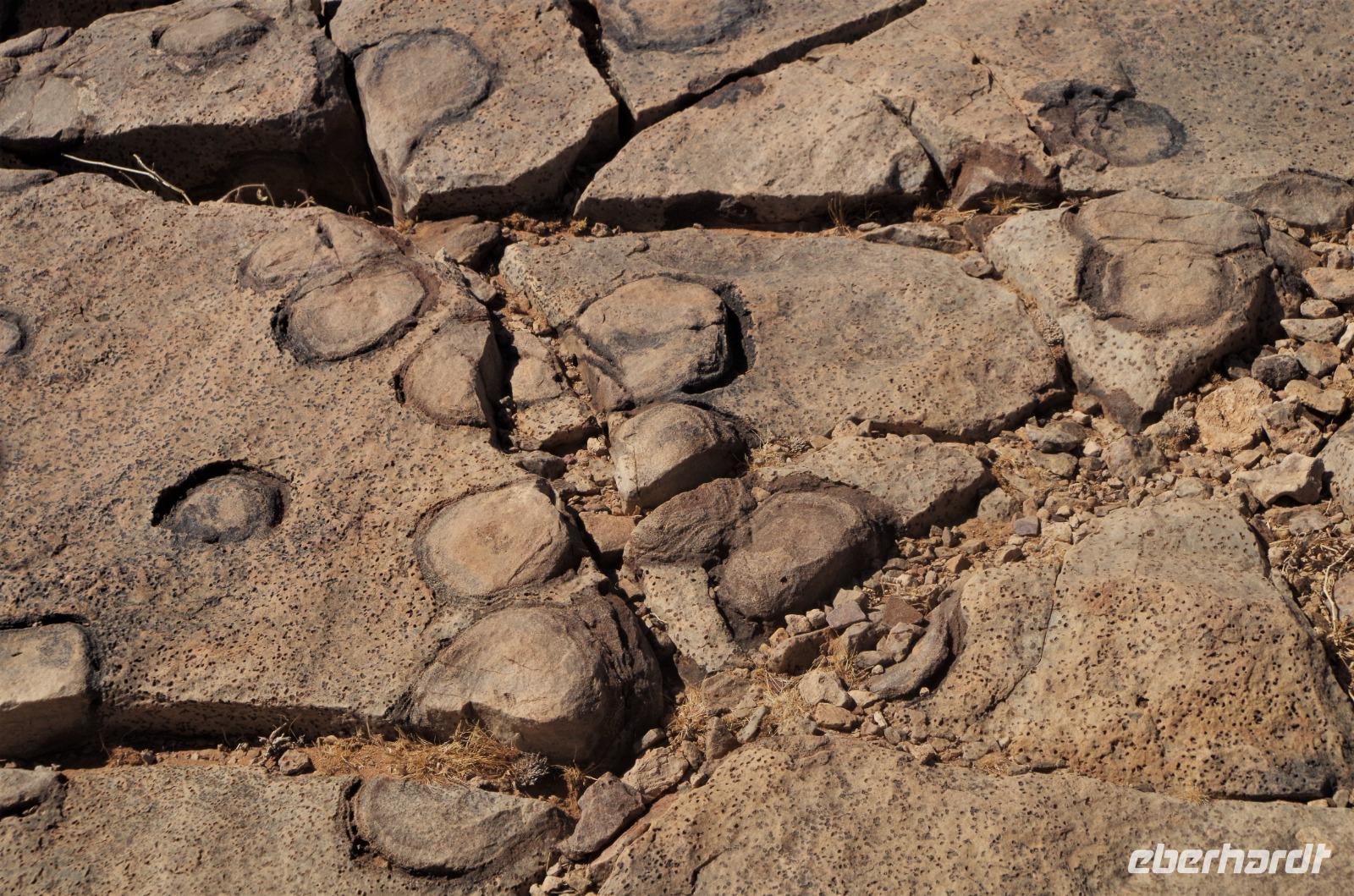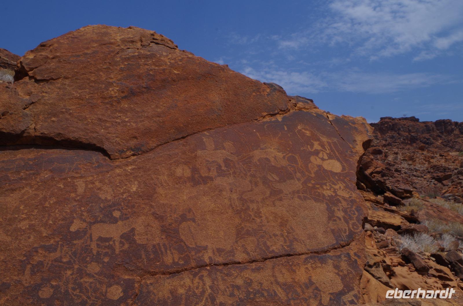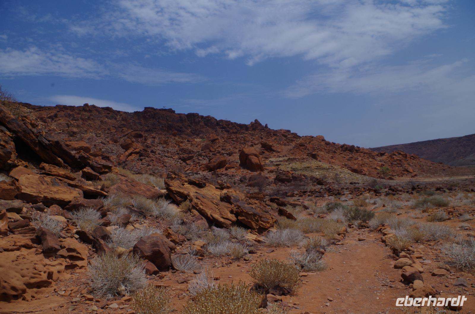 Da die Pad auf der touristischen Route via Twyfelfontein nach Khorixas in einem äußerst schlechten Zustand ist, haben wir uns entschieden, sehr früh loszufahren. Auf Salz-Pad truckten wir in nördliche Richtung, immer parallel am Atlantik entlang. In Henties Bay machten wir einen kurzen Tankstopp bevor wir dann gen Osten abbogen. Nach einem kurzen Zwischenstopp in Uis, einem alten Zinnminenort fuhren wir weiter durch die trockene, sehr dünn besiedelte Gegend. In der Ferne sehen wir den höchsten Berg Namibias, den Brandberg (2.574 m). Bald ging es auf der Rüttelpiste weiter. Schilder mit Achtung Elefanten! Standen am Wegesrand, live gesehen haben wir leider keine Wüstenelefanten, die in dieser Gegend leben. Bei Sorris Sorris hielten wir bei den Ständen der Herero-Damen an. Die Hereros, besonders die Damen sind gute Geschäftsleute und haben sich hier ein kleines Business aufgebaut haben. Aus bunten Stoffen fertigen sie mit ihren alten Singer-Nähmaschinen Taschen und kleine Püppchen. Das ein oder andere Souvenir wechselte seinen Besitzer. Die stolzen Herero-Frauen tragen traditionell üppige, bunte Kleider im viktorianischen Stil, die sie selbst schneidern und den dazugehörigen Kopfschmuck mit den stilisierten Hörnern von Rindern. Manchmal sind es bis zu 16 Unterröcke, die sie unter den Kleidern tragen. Huch, und das tragen sie bei 40° C und mehr! Auch heute ist es wieder extrem heiß! Wir fahren weiter durch das Damara-Land. Unser Ziel: Twyfelfontein, das erste unter Schutz gestellte Nationalmonument Namibias. Bekannt ist Twyfelfontein (zweifelhafte Quelle) für seine Felsgravuren. Dort empfängt uns zunächst ein heftiger, heißer Sandsturm. Fritz begleitet uns auf dem Rundweg durch die Felsenlandschaft. In dem orange-rotem, heißen Gestein bestaunen wir 2.000-6.000 Jahre alte, gut erhaltene Felsgravuren mit Tiermotiven, die zum UNESCO-Weltkulturerbe zählen. Besonders wertvoll ist die Gravur des Löwen. Diese hat eine sehr spirituelle Bedeutung für die Buschleute, stellt es doch die Verbindung zwischen Erde und Himmel dar. Aufgrund der Hitze war die, eigentlich kleine Wanderung doch etwas anstrengend und wir sind froh wieder im Truck zu sitzen, obwohl es immer noch kräftig schüttelt. Wir fahren weiter zum Versteinerten Wald, wo uns Suzanne, eine zierliche Damara erwartet. Sie spricht sogar etwas deutsch und singt mit uns deutsche Volkslieder. Ein Männlein steht im Walde, so los geht's...... Sie begleitet uns auf dem kurzweiligen Spaziergang und Fritz erklärt uns, wie das versteinerte Holz durch Erosion entstand und über dessen Millionen alte Geschichte. Auch entdeckten wir hier die Welwitschia, die Nationalpflanze, die auch auf dem namibischen Wappen zu sehen ist. Mittlerweile war es nicht mehr so heiß und ein winziges Lüftchen wehte. Am Nachmittag hatten wir dann endlich wieder Asphalt unterm Hintern und checkten in der Damara Mopane Lodge mit echter Schrebergartenidylle ein.