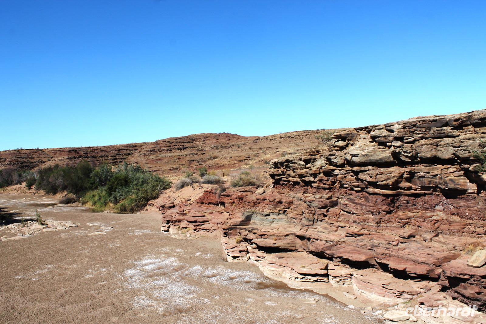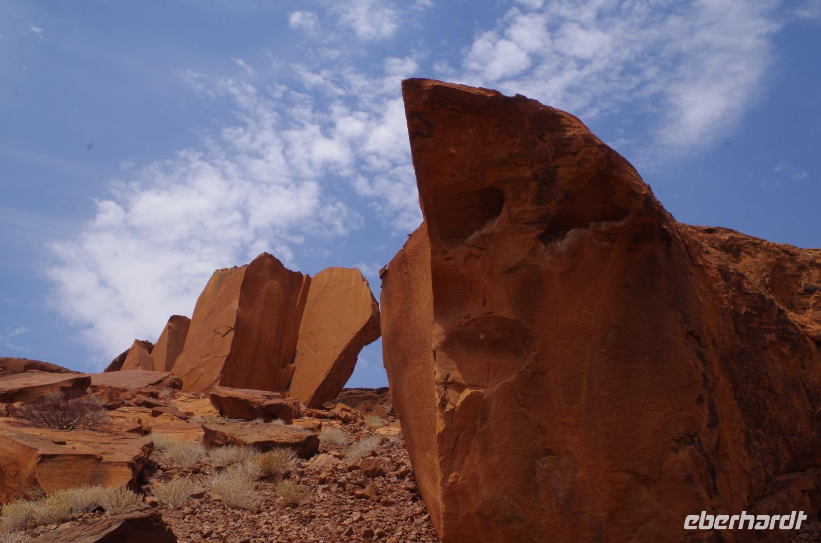 Am Nachmittag entspannten wir beim Nichtstun und genossen diese einmalige Landschaft zwischen roten Felsgestein, gelben Sand und blauen Himmel. Der versteckte Felsenpool mit weitem Ausblick war das Highlight. Trotz des kräftigen Windes wagten einige Gäste ein Bad. Am Abend speisten wir gemeinsam im alten Farmhaus und schlemmten vom leckeren Buffet. Danach erfreuten uns die Mitarbeiter der Lodge noch mit einer Musik- und Gesangseinlage. Tagesetappe im Truck: 158 km