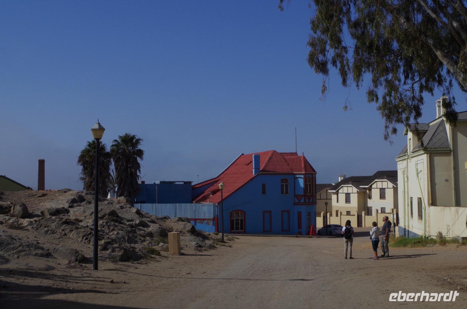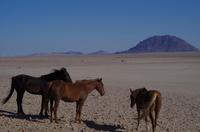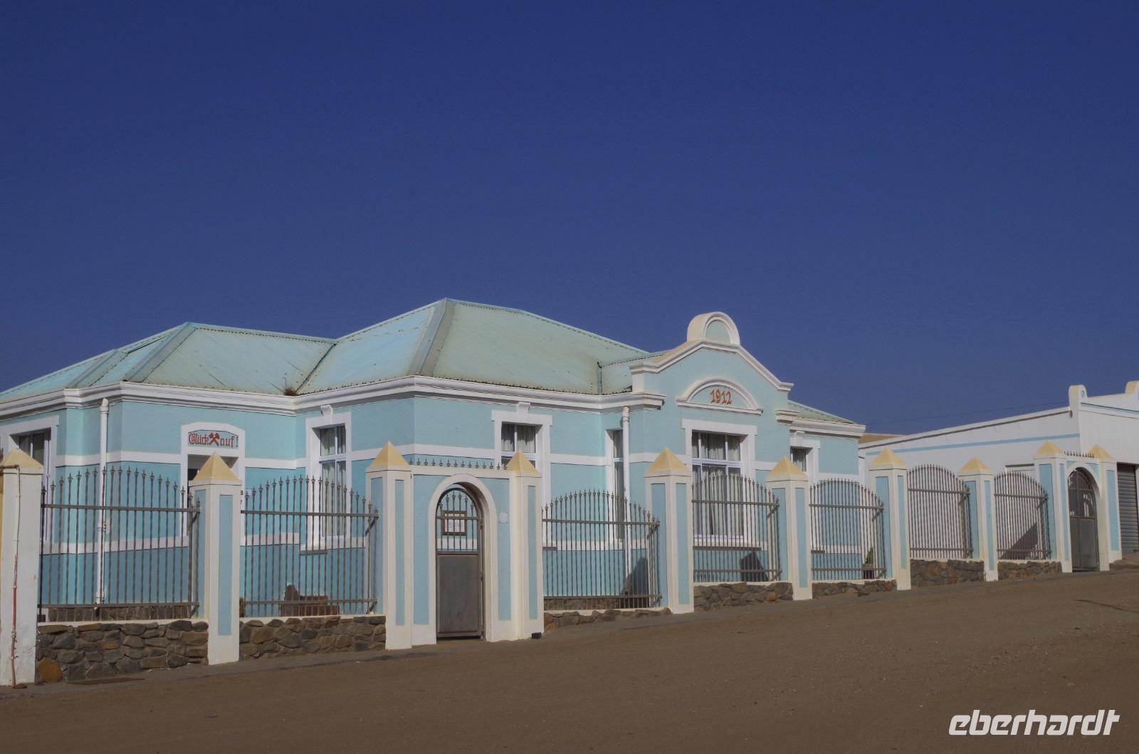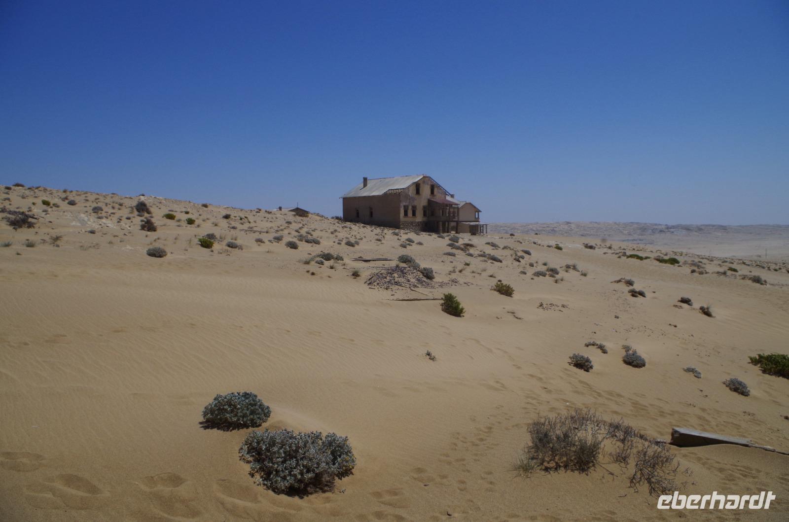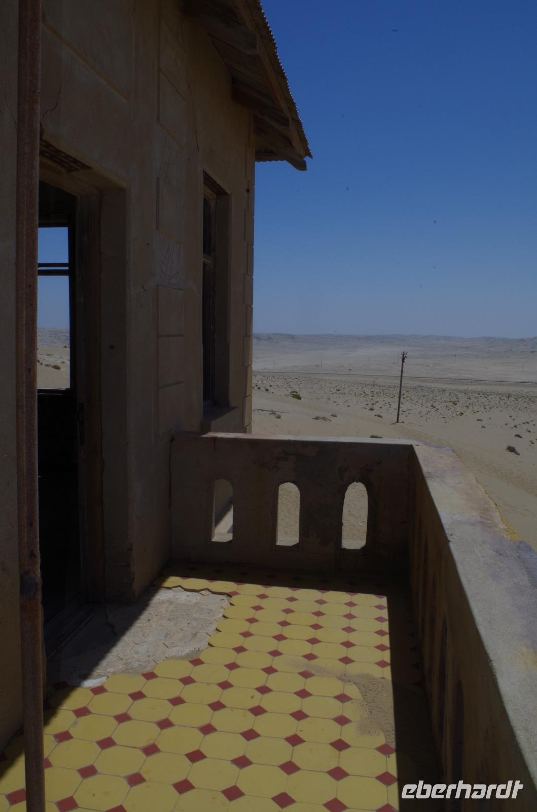 Wir fuhren aus Aus raus (schönes Wortspiel). Kurz vorm Garub-Wasserloch sahen wir die ersten Wildpferde, welch ein Glück. Die vergangenen, sehr trockenen Jahre hatten die Zahl der Wildpferde stark dezumiert. Direkt am Wasserloch hatten wir noch mehr Glück. Hier versammelten sich viele Wildpferde zum alkoholfreien „Frühschoppen". Ich selbst war sehr froh, auch zwei Fohlen zu sehen, den die Fohlen aus dem vergangenen Jahr hatten nicht überlebt. Entlang der Eisenbahnlinie, die seit kurzen wieder in Betrieb ist, fuhren auf einem schnurgeraden, schwarzen Asphaltstreifen weiter. Zu beiden Seiten erstreckt sich eine karge, weite Landschaft, die nur durch ein paar Inselberge durchbrochen wird, links das Diamantensperrgebiet und rechts die Randstufe. Unterwegs gab uns Fritz eine Einführung in die Pflanzenkunde der Wüste. Später sahen wir die alte Bahnstation Grasplatz, wo die Eisenbahnmitarbeiter Stauch und Lewala den ersten Diamanten fanden. Danach brach in dieser Gegend ein regelrechter Diamantenrausch aus, ähnlich wie das Klondike-Fieber in Alaska. So entstand innerhalb weniger Jahre Kolmanskop (Kolmannskuppe). Im Jahr 1908 lebten dort schon 1.200 Menschen. Bei einer kurzweiligen Führung erfuhren wir von Gisela, die in Lüderitz geboren ist, viel über die Geschichte, zuerst anhand von Fotos und Dokumenten im kleinen Museum, dann beim Rundgang durch die restaurierten oder die vom Sande verwehten Häuser. Sie erzählte sehr anschaulich wie sich die deutsche Siedlung weitgehend autark versorgte: Wohnungen, Läden, Schlachterei, Wurstfabrik, Eisfabrik, Krankenhaus, sogar ein Schwimmbad ... alles war vorhanden! Damals war Kolmanskop eine der fortschrittlichsten Siedlungen. Heute ist Kolmanskop nur noch eine Geisterstadt, die sich der Wüstensand langsam zurückholt. Der letzte Bewohner lebte hier bis Ende der 60ziger Jahre. Wir stapften durch den Wüstensand und erkundeten restaurierte Gebäude wie die Kegelbahn, die Turnhalle und das Haus der Verwalterin sowie verfallene Villen auf der Kaiserstraße.