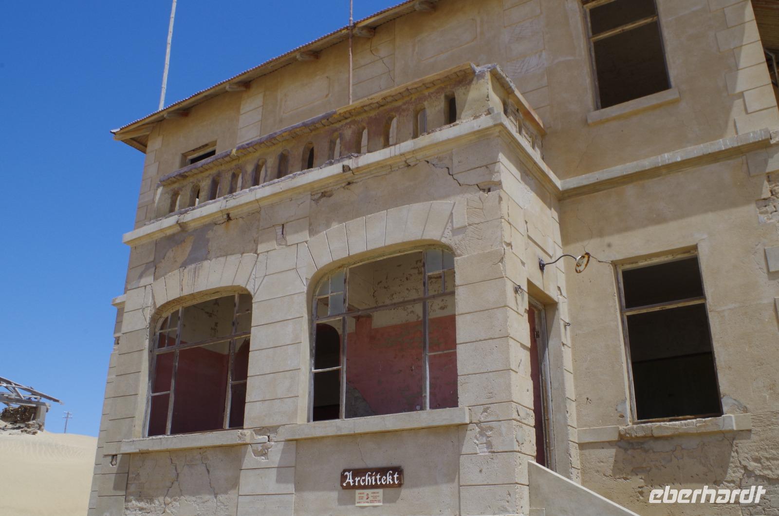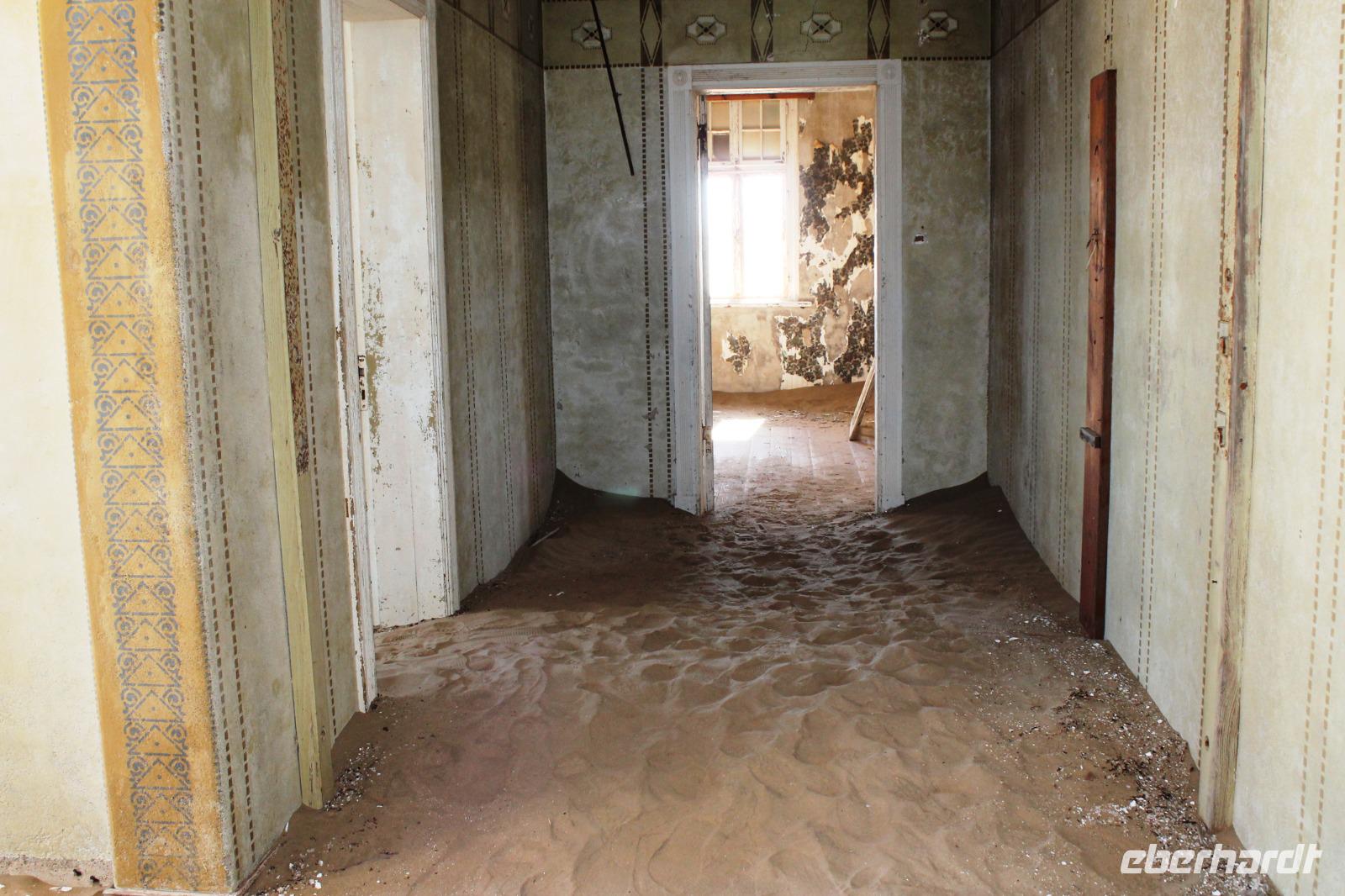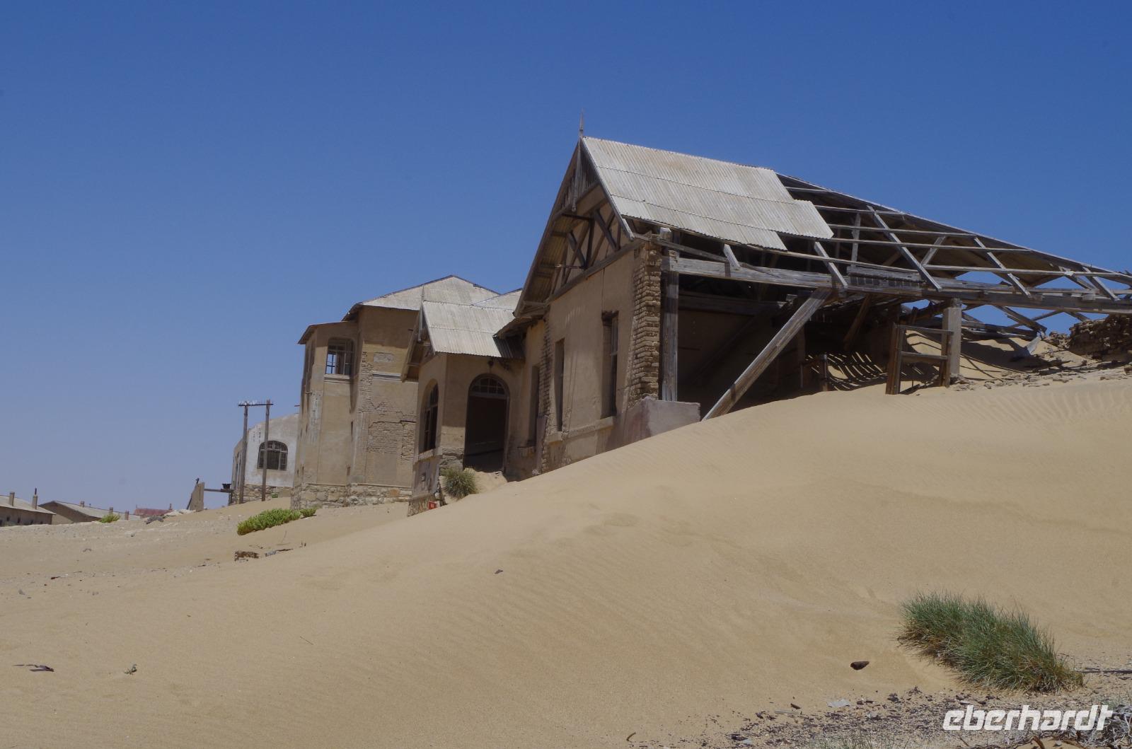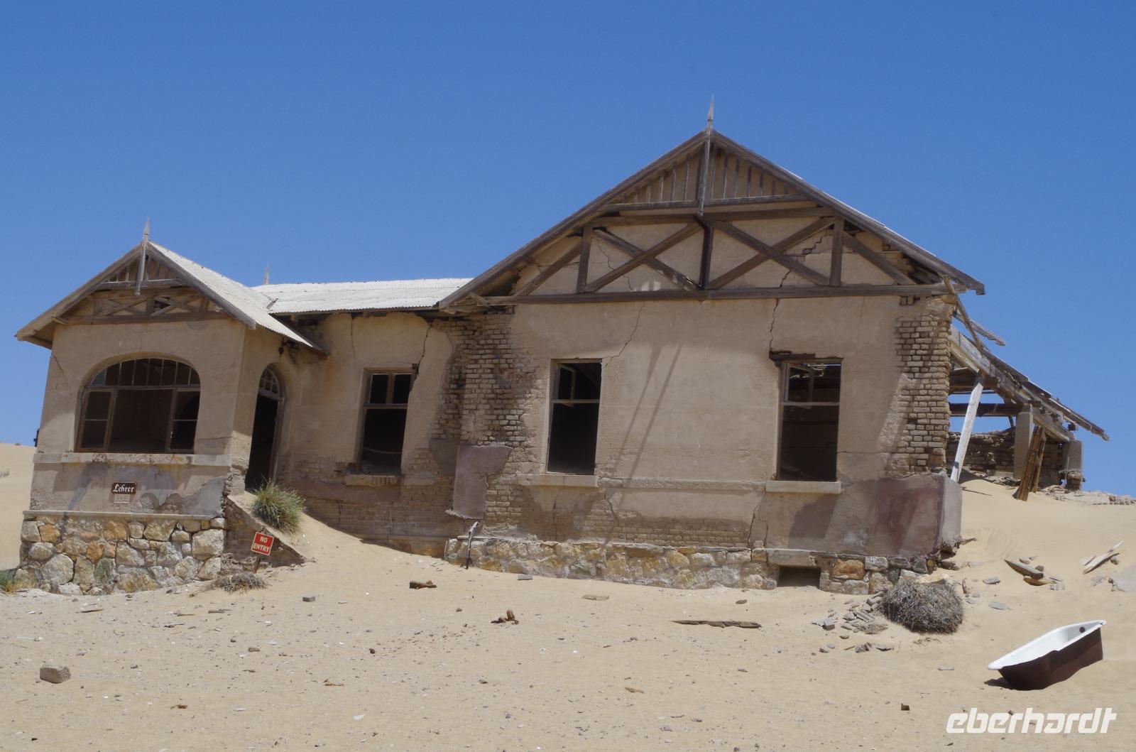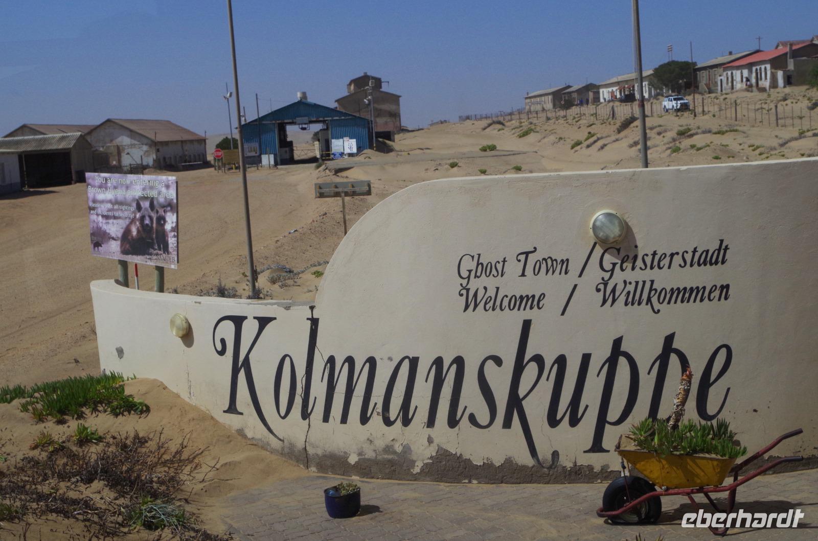 Wir fuhren aus Aus raus (schönes Wortspiel). Kurz vorm Garub-Wasserloch sahen wir die ersten Wildpferde, welch ein Glück. Die vergangenen, sehr trockenen Jahre hatten die Zahl der Wildpferde stark dezumiert. Direkt am Wasserloch hatten wir noch mehr Glück. Hier versammelten sich viele Wildpferde zum alkoholfreien „Frühschoppen". Ich selbst war sehr froh, auch zwei Fohlen zu sehen, den die Fohlen aus dem vergangenen Jahr hatten nicht überlebt. Entlang der Eisenbahnlinie, die seit kurzen wieder in Betrieb ist, fuhren auf einem schnurgeraden, schwarzen Asphaltstreifen weiter. Zu beiden Seiten erstreckt sich eine karge, weite Landschaft, die nur durch ein paar Inselberge durchbrochen wird, links das Diamantensperrgebiet und rechts die Randstufe. Unterwegs gab uns Fritz eine Einführung in die Pflanzenkunde der Wüste. Später sahen wir die alte Bahnstation Grasplatz, wo die Eisenbahnmitarbeiter Stauch und Lewala den ersten Diamanten fanden. Danach brach in dieser Gegend ein regelrechter Diamantenrausch aus, ähnlich wie das Klondike-Fieber in Alaska. So entstand innerhalb weniger Jahre Kolmanskop (Kolmannskuppe). Im Jahr 1908 lebten dort schon 1.200 Menschen. Bei einer kurzweiligen Führung erfuhren wir von Gisela, die in Lüderitz geboren ist, viel über die Geschichte, zuerst anhand von Fotos und Dokumenten im kleinen Museum, dann beim Rundgang durch die restaurierten oder die vom Sande verwehten Häuser. Sie erzählte sehr anschaulich wie sich die deutsche Siedlung weitgehend autark versorgte: Wohnungen, Läden, Schlachterei, Wurstfabrik, Eisfabrik, Krankenhaus, sogar ein Schwimmbad ... alles war vorhanden! Damals war Kolmanskop eine der fortschrittlichsten Siedlungen. Heute ist Kolmanskop nur noch eine Geisterstadt, die sich der Wüstensand langsam zurückholt. Der letzte Bewohner lebte hier bis Ende der 60ziger Jahre. Wir stapften durch den Wüstensand und erkundeten restaurierte Gebäude wie die Kegelbahn, die Turnhalle und das Haus der Verwalterin sowie verfallene Villen auf der Kaiserstraße.