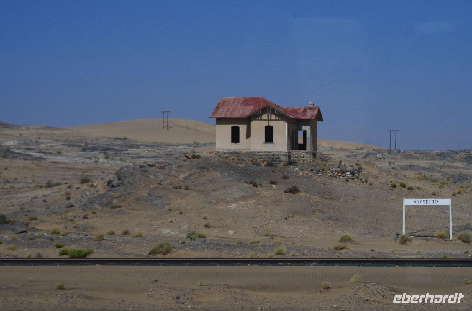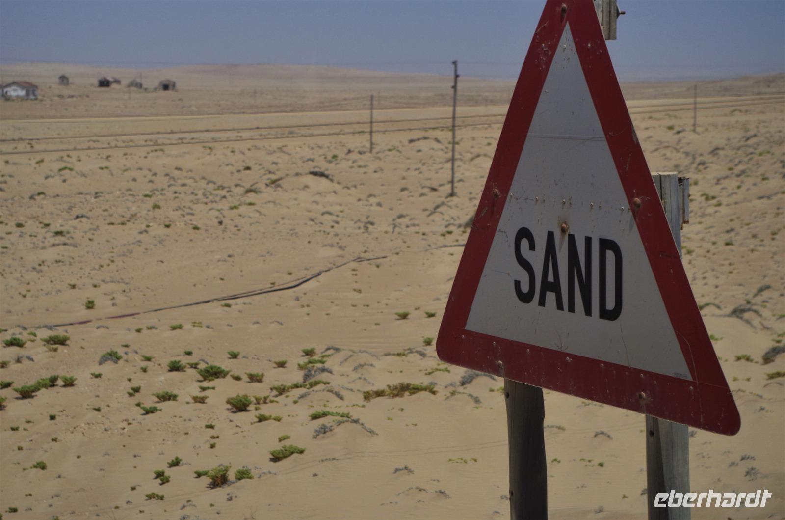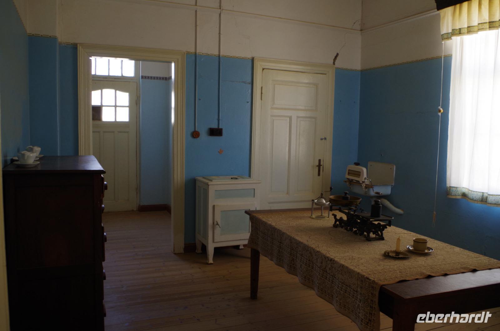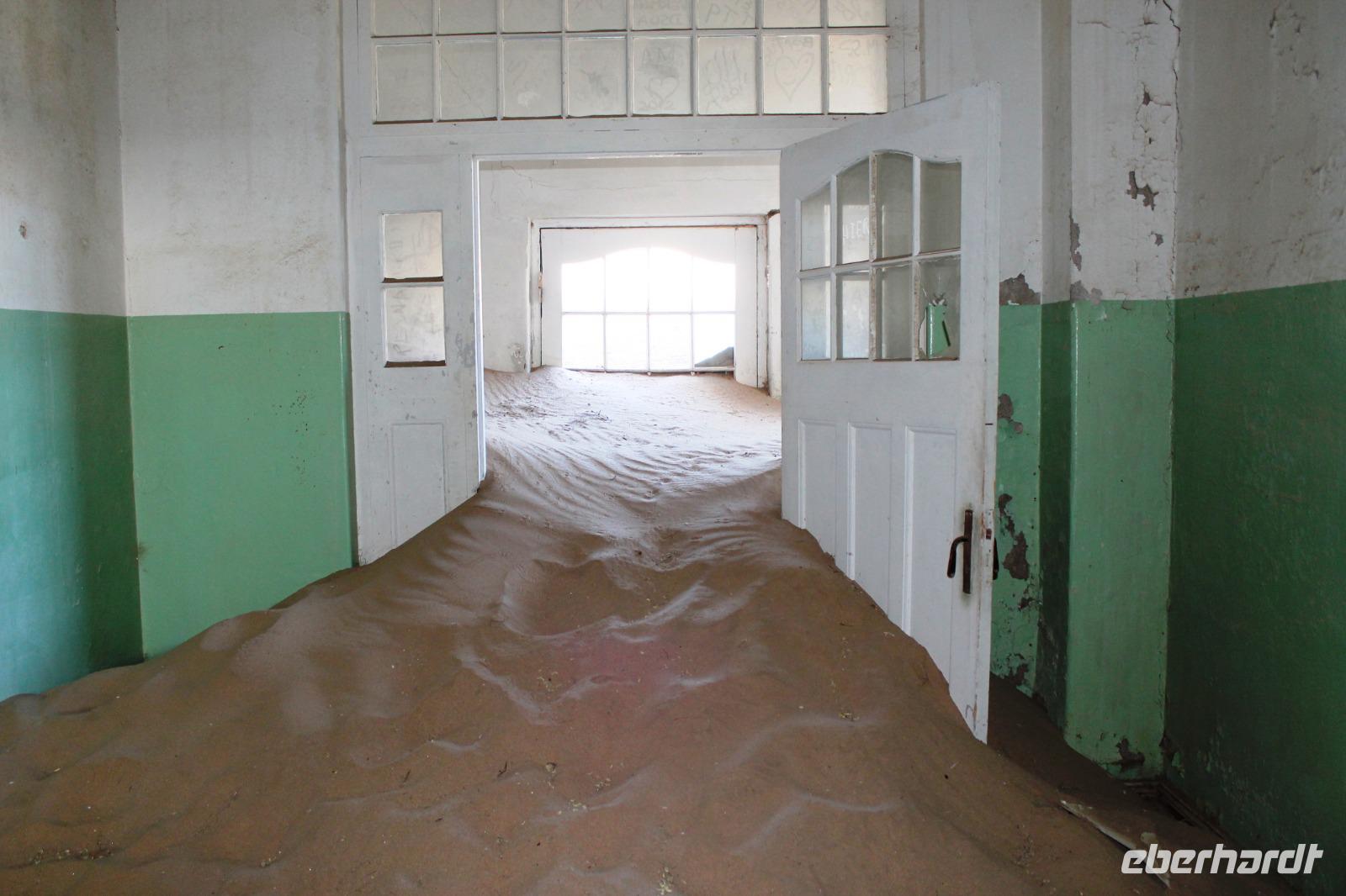 Wir fuhren aus Aus raus (schönes Wortspiel). Kurz vorm Garub-Wasserloch sahen wir die ersten Wildpferde, welch ein Glück. Die vergangenen, sehr trockenen Jahre hatten die Zahl der Wildpferde stark dezumiert. Direkt am Wasserloch hatten wir noch mehr Glück. Hier versammelten sich viele Wildpferde zum alkoholfreien „Frühschoppen". Ich selbst war sehr froh, auch zwei Fohlen zu sehen, den die Fohlen aus dem vergangenen Jahr hatten nicht überlebt. Entlang der Eisenbahnlinie, die seit kurzen wieder in Betrieb ist, fuhren auf einem schnurgeraden, schwarzen Asphaltstreifen weiter. Zu beiden Seiten erstreckt sich eine karge, weite Landschaft, die nur durch ein paar Inselberge durchbrochen wird, links das Diamantensperrgebiet und rechts die Randstufe. Unterwegs gab uns Fritz eine Einführung in die Pflanzenkunde der Wüste. Später sahen wir die alte Bahnstation Grasplatz, wo die Eisenbahnmitarbeiter Stauch und Lewala den ersten Diamanten fanden. Danach brach in dieser Gegend ein regelrechter Diamantenrausch aus, ähnlich wie das Klondike-Fieber in Alaska. So entstand innerhalb weniger Jahre Kolmanskop (Kolmannskuppe). Im Jahr 1908 lebten dort schon 1.200 Menschen. Bei einer kurzweiligen Führung erfuhren wir von Gisela, die in Lüderitz geboren ist, viel über die Geschichte, zuerst anhand von Fotos und Dokumenten im kleinen Museum, dann beim Rundgang durch die restaurierten oder die vom Sande verwehten Häuser. Sie erzählte sehr anschaulich wie sich die deutsche Siedlung weitgehend autark versorgte: Wohnungen, Läden, Schlachterei, Wurstfabrik, Eisfabrik, Krankenhaus, sogar ein Schwimmbad ... alles war vorhanden! Damals war Kolmanskop eine der fortschrittlichsten Siedlungen. Heute ist Kolmanskop nur noch eine Geisterstadt, die sich der Wüstensand langsam zurückholt. Der letzte Bewohner lebte hier bis Ende der 60ziger Jahre. Wir stapften durch den Wüstensand und erkundeten restaurierte Gebäude wie die Kegelbahn, die Turnhalle und das Haus der Verwalterin sowie verfallene Villen auf der Kaiserstraße.