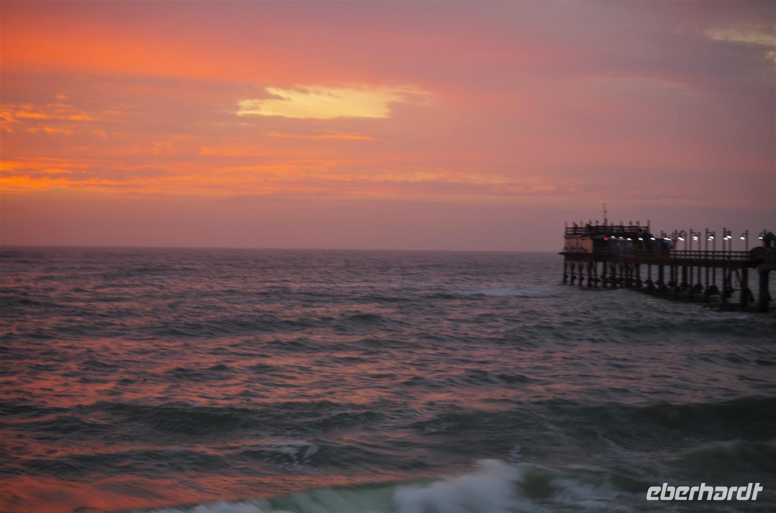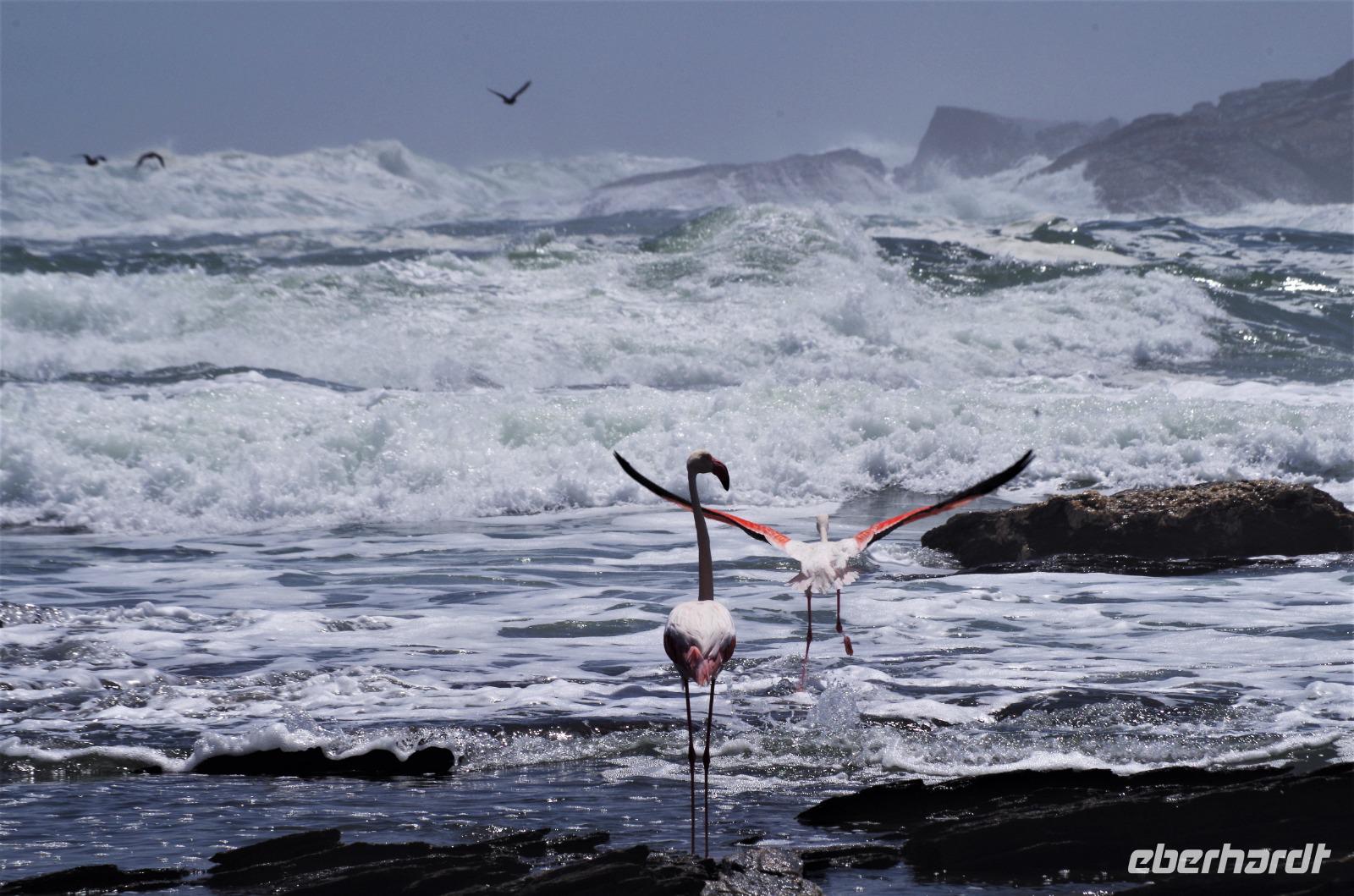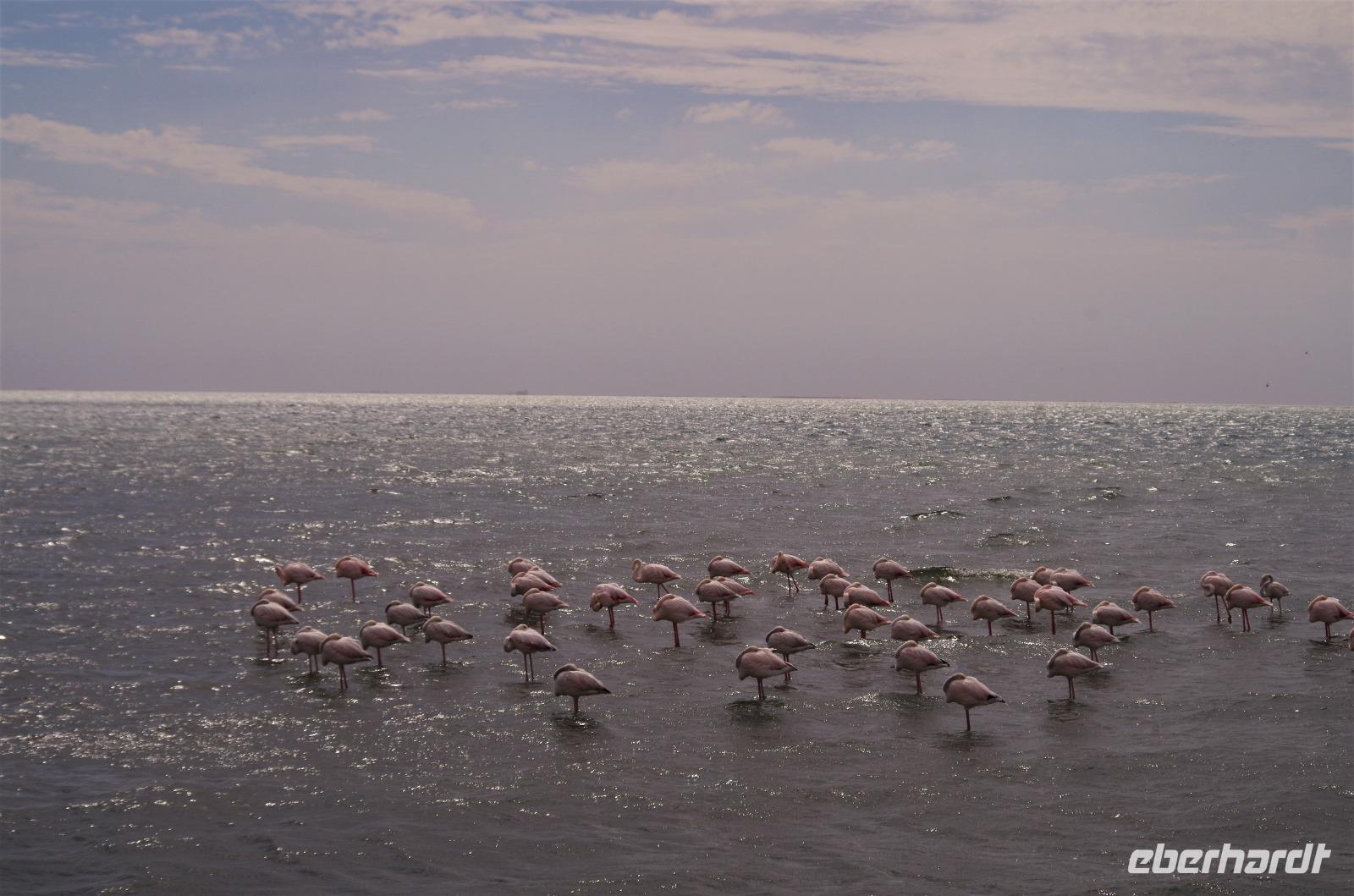 Wir verließen die Wüste und fuhren weiter durch das karge Naukluft Gebirge (über 1.000 m hoch). In Solitaire, einem weiteren wichtigen und bekannten Verkehrsknotenpunkt, machten wir noch einen Tankstopp. Dort befindet sich die bekannte Bäckerei von Moose Mc Gregor, der vor einigen Jahren verstarb. Doch die Tradition der Bäckerei wird fortgeführt. Hier gibt es neben dem über die Landesgrenzen hinaus bekannten Apfelkuchen, auch Schweinsohren und andere, süße Leckereien. Über den Gaub Pass (ca. 800 m hoch) passierten wir abermals den südlichen Wendekreis des Steinbocks (Tropic of capricorn). Landschaftlich rauh, aber wunderschöne empfanden wir diese Strecke, die wir mit verschiedenen Fotostopps auflockerten. Später passierten wir Kuiseb Canyon und fuhren über die kleine Brücke über den ausgetrockneten Kuiseb. Hier in dieser Region hielt sich Prof. Dr. Henno Martin (Geologe und Autor des Bestsellers "Wenn es Krieg gibt, gehen wir in die Wüste") mit seinem Freund während des 2. Weltkriegs versteckt. Unterwegs picknickten wir, bevor wir am frühen Nachmittag die Teerstraße in Walvis Bay erreichten. Nach der Hitze der Wüste freuten wir uns auf etwas Frische. Wir machten noch mal kurz Halt an der neuen Shopping Mall und besuchten die Lagune, wo wir große und kleine Flamigos sahen. Anschließend mußte unser Truck noch auf die Waage, GsD wir nicht..... Ca. 30 km trennen Walvis Bay und Swakopmund. Die Straße führt direkt am Atlantik entlang. Viele Ferienorte sind hier entstanden. So z.B. Langstrand, wo Angelinas und Brads erstes gemeinsames Kind 2016 zur Welt kam. Nach einer Orientierungsrunde durch Swakop checkten wir in unseren Hotel, in der Nähe der Seebrücke ein. Am Abend spazierten wir zur Seebrücke "Jetty", wo wir den Sonnenuntergang genossen. Im Restaurant "The Tug" verbrachten wir den Abend. Das Restaurant war wie immer gut besucht und dadurch etwas sehr geräuschvoll, aber das Essen war wie immer vorzüglich. Danach unternahmen einige Gäste einen Verdauungsspaziergang am Strand zum Hotel zurück und andere bummelten noch durch das abendliche Swakopmund inklusive Schlummertrunk in einer urigen Bar. Tagesetappe im Truck: 320 km