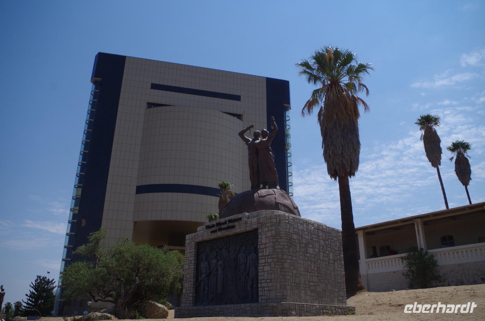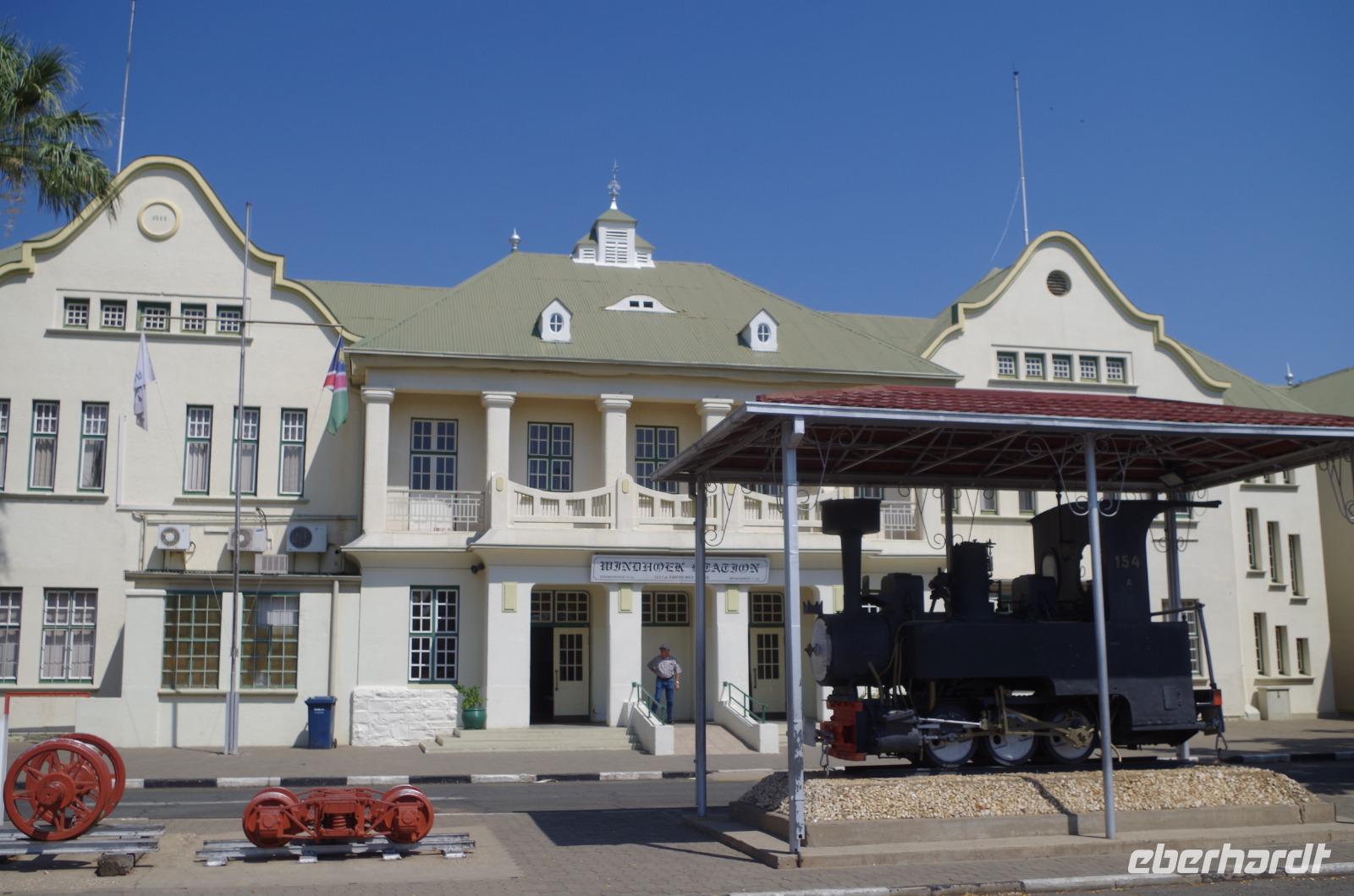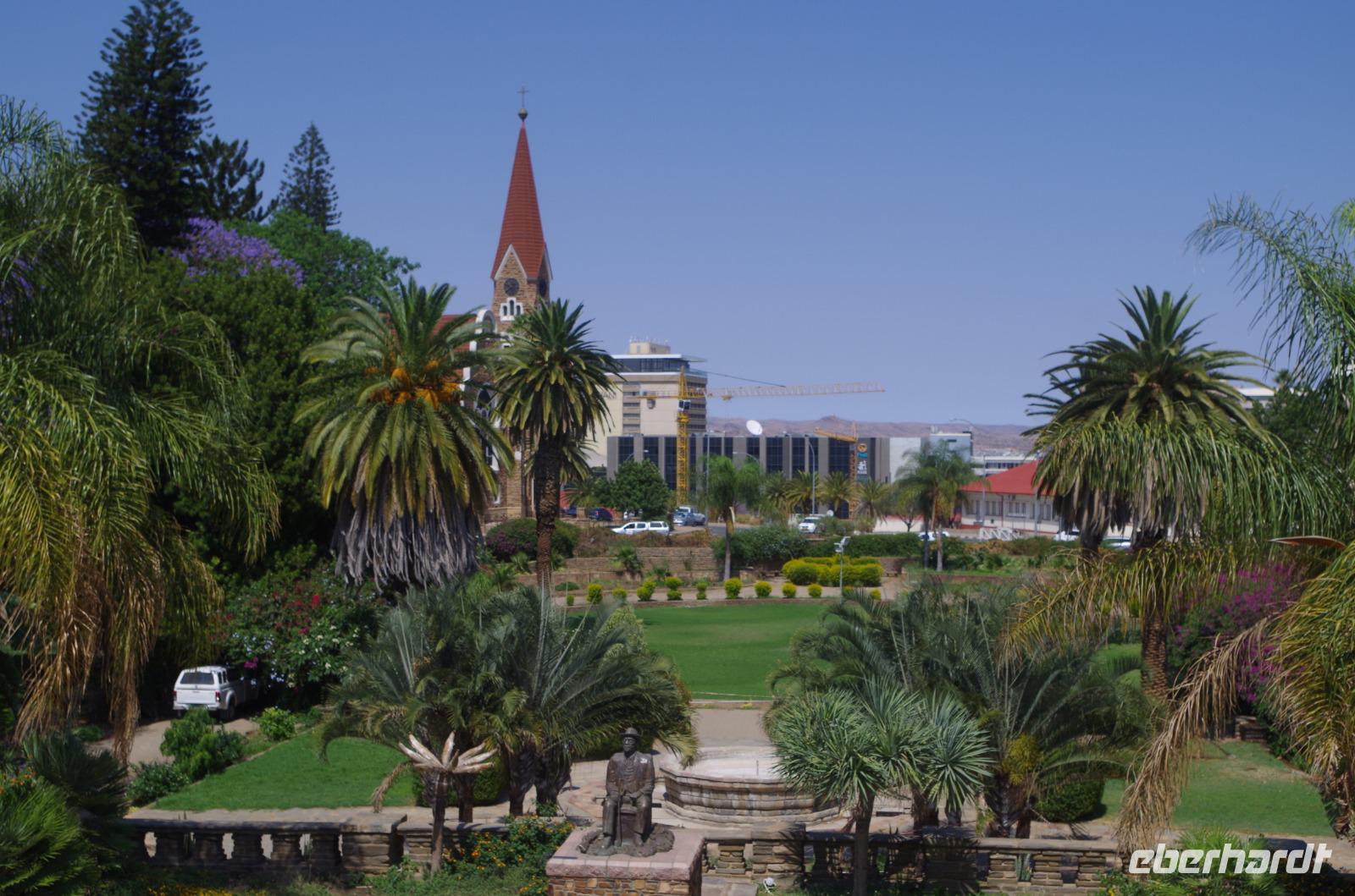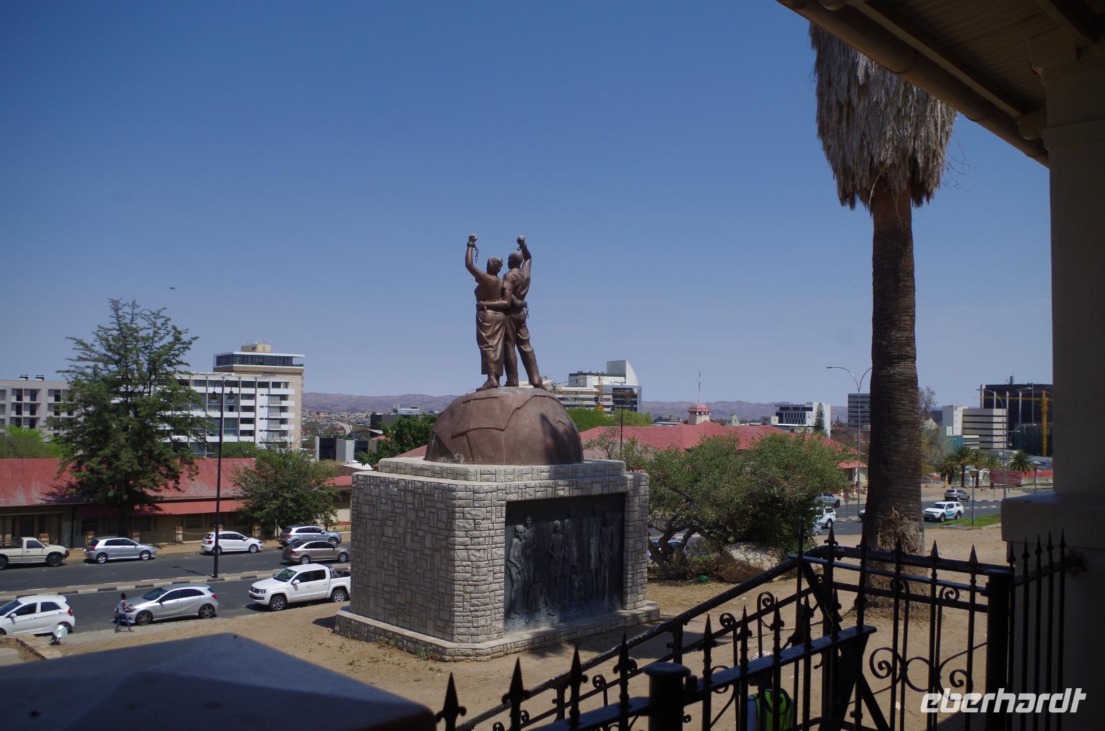 Der letzte Tag unserer Reise war angebrochen. Doch bevor wir von Namibia Abschied nahmen, wollten wir die Hauptstadt Windhoek auf einer Rundfahrt noch ein wenig näher kennenlernen. In den letzten Jahren ist Windhoek gewachsen und moderner geworden. Viele neue Gebäude entstanden und Straßen wurden umbenannt. Von der alten Zeit gibt es immer weniger zu sehen. Unser erstes Ziel ist der Alte Bahnhof. Das Gebäude, innen wie außen, ist sehr sehenswert und erinnert an die alte Zeit. Vor dem Bahnhof stehen alte Eisenbahnen und es fuhr sogar ein Passagierzug in den Bahnhof ein - eine Premiere für mich. Wir stoppen am Tintenpalast, Sitz des Unterhauses des Parlaments. Dieses Gebäude wurde vom Architekten Redecker entworfen und 1913 fertiggestellt. Der Name Tintenpalast ist eine kleine Anspielung auf die deutsche Bürokratie, den damals verbrauchten die vielen Schreiberlinge viel Tinte. Unterhalb befindet sich der schöne Parlamentsgarten, der leider geschlossen ist. Davor stehen Statuen von wichtigen Persönlichkeiten Namibias, in der Mitte Hosea Kutako, nach dem auch der Internationale Flughafen benannt ist. An der Christuskirche, einem Wahrzeichen der Stadt, steigen wir aus. Die Kirche ist offen, so dass wir sie auch von innen besichtigen können. Ein kleiner Spaziergang führt uns zur Erhebung gegenüber. Hier thront der futuristische Bau des neuen Unabhängigkeitsmuseums (gebaut von Nordkoreanern) mit der Statue von Sam Nujoma, dem 1. Präsidenten von Namibia davor. Im Volksmund heißt dieser Bau „Kaffeemaschine". Früher stand hier der Südwester Reiter, der vor einigen Jahren vor die Feste umgesetzt wurde. Von da mußte er auch verschwinden, denn dort steht jetzt das Genozid Denkmal. Ein sehr schönes Gebäude der alten Zeit steht daneben - die Alte Feste, in dessen Innenhof der Südwester abgelegt wurde. Leider ist die Alte Feste verschlossen und verfällt immer mehr. Der Südwester reitet nun nicht mehr, sondern wurde im Innenhof der Alten Feste abgelegt. Anschließend besuchen wir noch kurz das Craft Center, wo wir unser letztes namibisches Geld ausgeben. Dann fuhren wir zum Flughafen und verabschiedeten Gerhard, unseren umsichtigen und freundlichen Fahrer und unseren Reiseleiter Fritz. Tagesetappe im Truck: 101 km