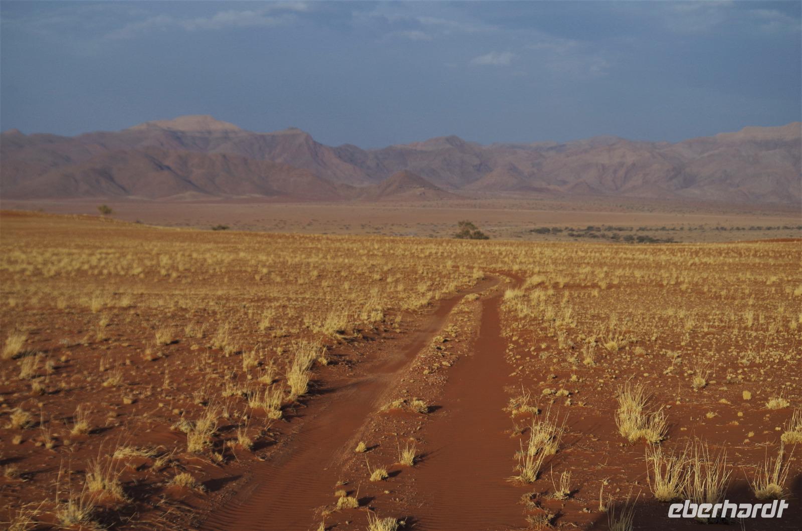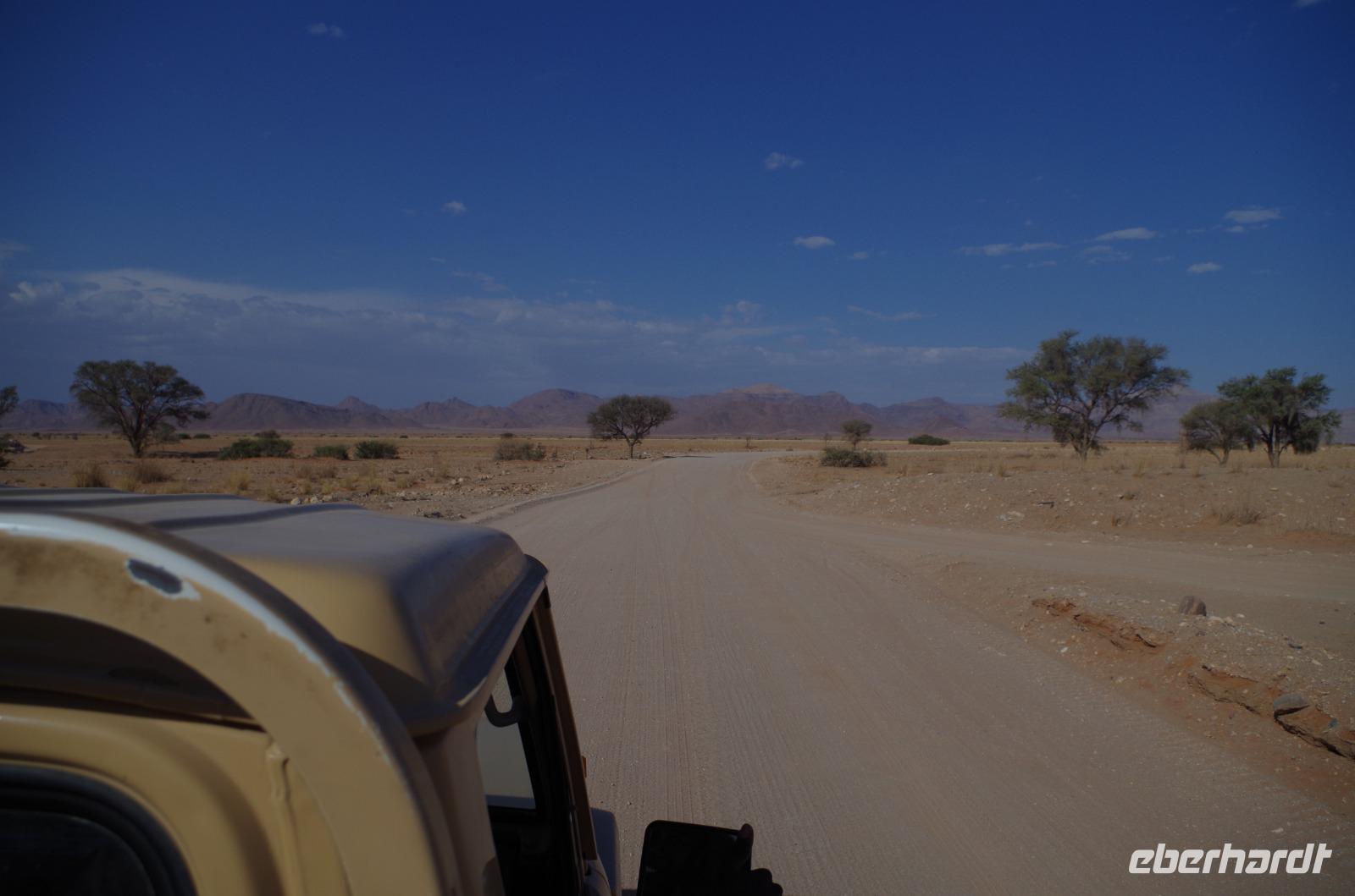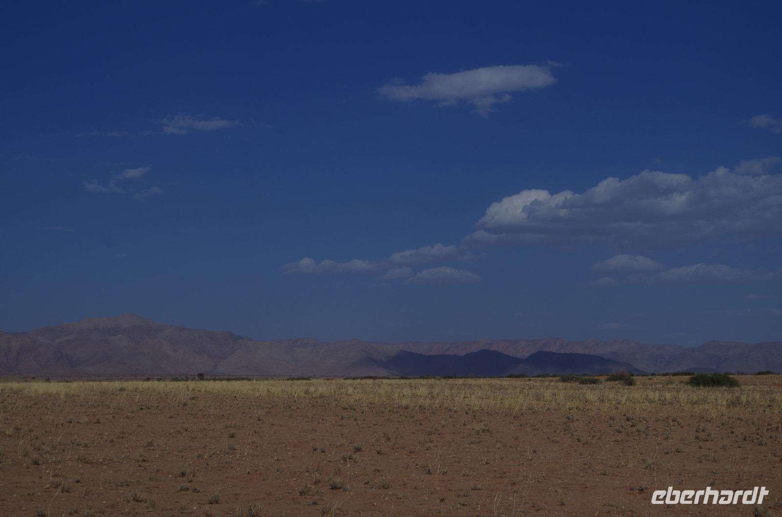 An diesem Tag hatten wir eine längere Strecke zu bewältigen, die uns in den Namib Naukluft Park führte. Zunächst fuhren wir die Asphaltstraße nach Aus zurück. Dort bogen wir auf Schotterpad gen Norden ab. Rechts und links alles Farmland. Die Landschaft wirkte vertrocknet und schrie nach Wasser. Doch an einigen Stellen blinzelten kleine grüne Halme aus der Erde, eine Vorankündigung auf den langersehnten Regen. Einsam truckten wir auf der staubigen Pad. Wieder zeigte sich, wie dünn das Land besiedelt ist, Einsamkeit pur. Vereinzelt sahen wir Strauße und Oryxe. Entlang der Schwarzrandbergkette und der Tirasberge gelangten wir nach Helmeringhausen. Zwei Handvoll Einwohner leben hier vorrangig von der Rinder- und Schafszucht. Wie erfuhren, woher der Name stammt. 1908 kam die deutsche Schutztruppe an diesen Ort. Ein Soldat stammte aus einer gleichnamigen Ortschaft aus Deutschland. Später kaufte dieser Herr hier Farmland und nannte es nach seinem Geburtsort. Nicht zu glauben, dass es hier auch ein Hotel gibt, wo u.a. man eine leckere Bratwurst bekommt. Wir verließen die Karas-Region und gelangten nach Maltahöhe in der Hardap-Region. Rund um Maltahöhe leben ca. 2.000 Menschen. Auch dieser Ort hat eine Geschichte. Ganz in der Nähe befindet sich die Farm Burgsdorff. Während der Kolonialzeit leitete Herr Burgsdorff hier eine Polizeistation und nannten den Ort nach seiner Frau Malta. Im urigen Farmstall von Henriette machten wir unsere Mittagspause. Hier trafen wir auf zwei Sportstudenten aus Deutschland, die mit dem Fahrrad auf großer Afrika-Tour waren. Ihr Ziel Tansania, da staunten wir nicht schlecht. Je näher wir der Namib kamen, wurden die Pads immer schlechter. Wir wurden kräftig durchgeschüttelt, auch unser Truck fing an zu klappern und wir mußten einen Reparaturstopp einlegen. Doch Dank Gerhard und Fritz und einem gut ausgestatteten Werkzeugkoffer konnten wir weiterfahren. Wir durchquerten die Naukluft. Wahnsinn, wie rechts und links die Naukluftberge fast 2.000 Meter emporragen. Der Namib Naukluft Parks, dem größten Naturschutzgebiet Namibias in der ältesten Wüste der Welt, umfasst fast 50.000 km². Der Namib Naukluft Park wurde 1979 als Schutzzone für die gefährdeten Bergzebras proklamiert wurde. Am Nachmittag erreichten wir endlich unser Ziel: Die Namib Naukluft Lodge. Nach einem Begrüßungdrink beziehen unsere kleinen Steinhäuschen unter grünen, Schatten spendenden Bäumen mit Blick auf eine fossile Sanddüne, die in den Abendstunden romantisch beleuchtet wird. Auch viele Oryxe und Perlühner sind auf dem Gelände zu sehen. Zum Abendessen trafen wir uns auf der Terrasse des Restaurants und bedienten uns am großen Buffet. An diesem Tag war es wieder sehr heiß und morgen sollte es noch heißer werden. Also gingen wir schnell in unsere klimatisierten Häuschen und fielen ins Traumland. - Tagesetappe im Truck: 556 km