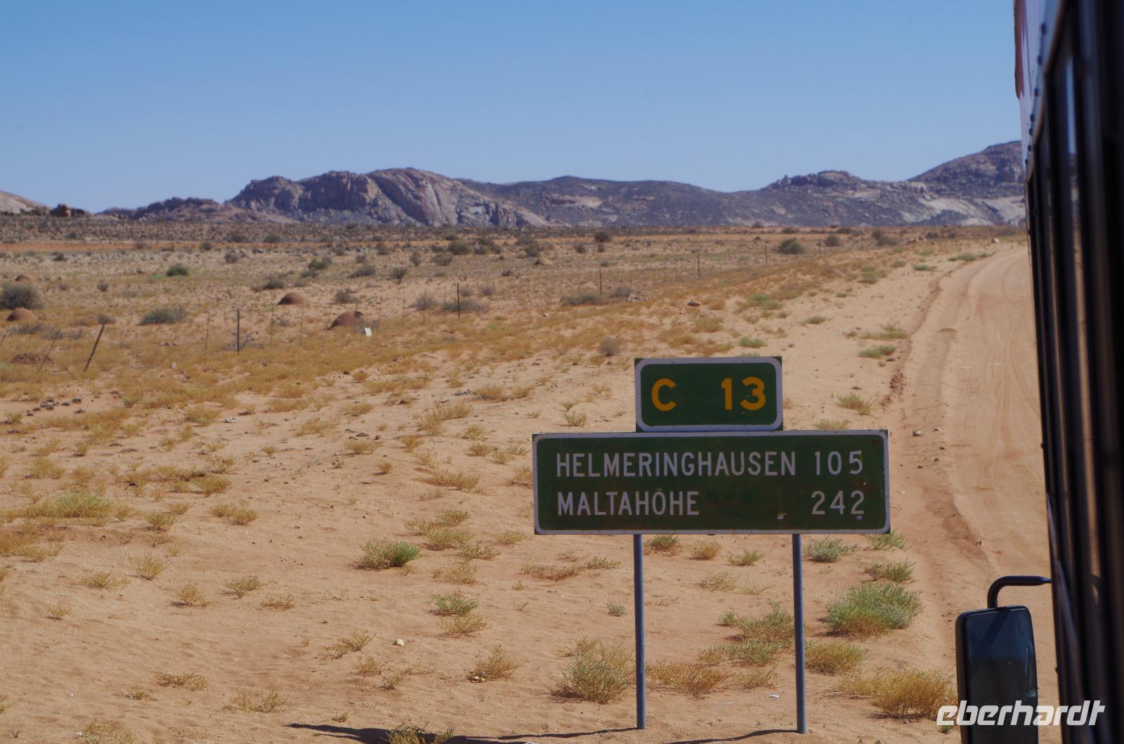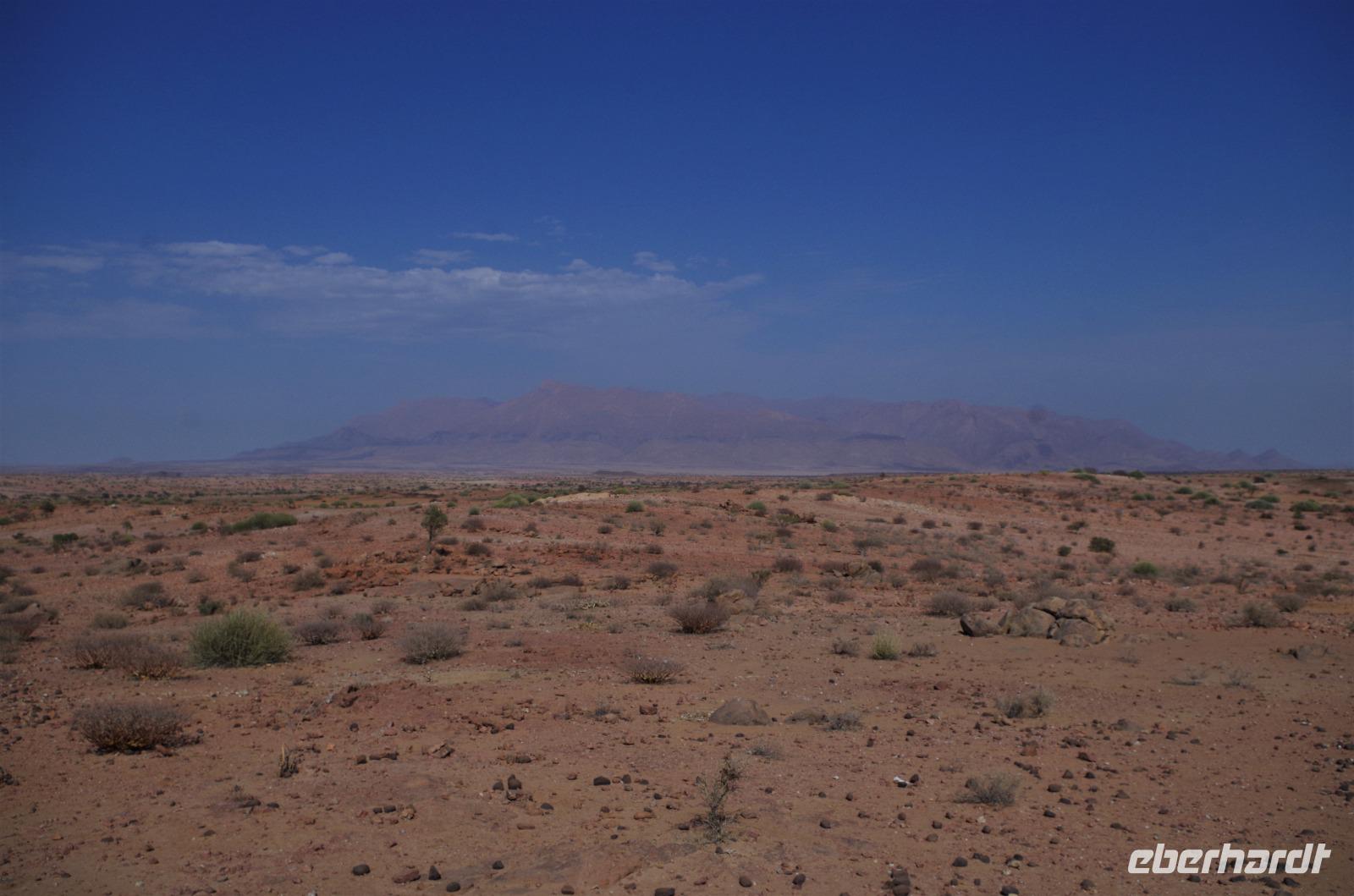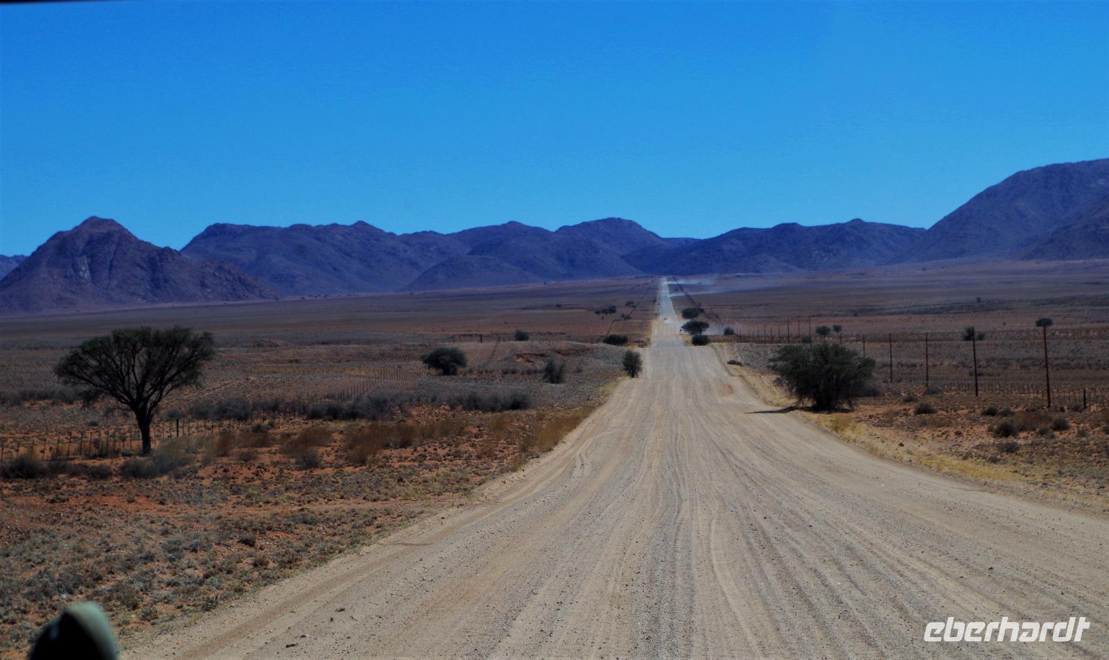 An diesem Tag hatten wir eine längere Strecke zu bewältigen, die uns in den Namib Naukluft Park führte. Zunächst fuhren wir die Asphaltstraße nach Aus zurück. Dort bogen wir auf Schotterpad gen Norden ab. Rechts und links alles Farmland. Die Landschaft wirkte vertrocknet und schrie nach Wasser. Doch an einigen Stellen blinzelten kleine grüne Halme aus der Erde, eine Vorankündigung auf den langersehnten Regen. Einsam truckten wir auf der staubigen Pad. Wieder zeigte sich, wie dünn das Land besiedelt ist, Einsamkeit pur. Vereinzelt sahen wir Strauße und Oryxe. Entlang der Schwarzrandbergkette und der Tirasberge gelangten wir nach Helmeringhausen. Zwei Handvoll Einwohner leben hier vorrangig von der Rinder- und Schafszucht. Wie erfuhren, woher der Name stammt. 1908 kam die deutsche Schutztruppe an diesen Ort. Ein Soldat stammte aus einer gleichnamigen Ortschaft aus Deutschland. Später kaufte dieser Herr hier Farmland und nannte es nach seinem Geburtsort. Nicht zu glauben, dass es hier auch ein Hotel gibt, wo u.a. man eine leckere Bratwurst bekommt. Wir verließen die Karas-Region und gelangten nach Maltahöhe in der Hardap-Region. Rund um Maltahöhe leben ca. 2.000 Menschen. Auch dieser Ort hat eine Geschichte. Ganz in der Nähe befindet sich die Farm Burgsdorff. Während der Kolonialzeit leitete Herr Burgsdorff hier eine Polizeistation und nannten den Ort nach seiner Frau Malta. Im urigen Farmstall von Henriette machten wir unsere Mittagspause. Hier trafen wir auf zwei Sportstudenten aus Deutschland, die mit dem Fahrrad auf großer Afrika-Tour waren. Ihr Ziel Tansania, da staunten wir nicht schlecht. Je näher wir der Namib kamen, wurden die Pads immer schlechter. Wir wurden kräftig durchgeschüttelt, auch unser Truck fing an zu klappern und wir mußten einen Reparaturstopp einlegen. Doch Dank Gerhard und Fritz und einem gut ausgestatteten Werkzeugkoffer konnten wir weiterfahren. Wir durchquerten die Naukluft. Wahnsinn, wie rechts und links die Naukluftberge fast 2.000 Meter emporragen. Der Namib Naukluft Parks, dem größten Naturschutzgebiet Namibias in der ältesten Wüste der Welt, umfasst fast 50.000 km². Der Namib Naukluft Park wurde 1979 als Schutzzone für die gefährdeten Bergzebras proklamiert wurde. Am Nachmittag erreichten wir endlich unser Ziel: Die Namib Naukluft Lodge. Nach einem Begrüßungdrink beziehen unsere kleinen Steinhäuschen unter grünen, Schatten spendenden Bäumen mit Blick auf eine fossile Sanddüne, die in den Abendstunden romantisch beleuchtet wird. Auch viele Oryxe und Perlühner sind auf dem Gelände zu sehen. Zum Abendessen trafen wir uns auf der Terrasse des Restaurants und bedienten uns am großen Buffet. An diesem Tag war es wieder sehr heiß und morgen sollte es noch heißer werden. Also gingen wir schnell in unsere klimatisierten Häuschen und fielen ins Traumland. - Tagesetappe im Truck: 556 km