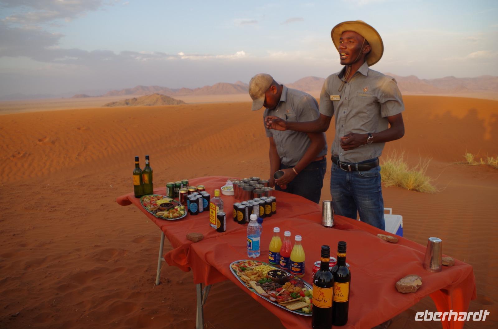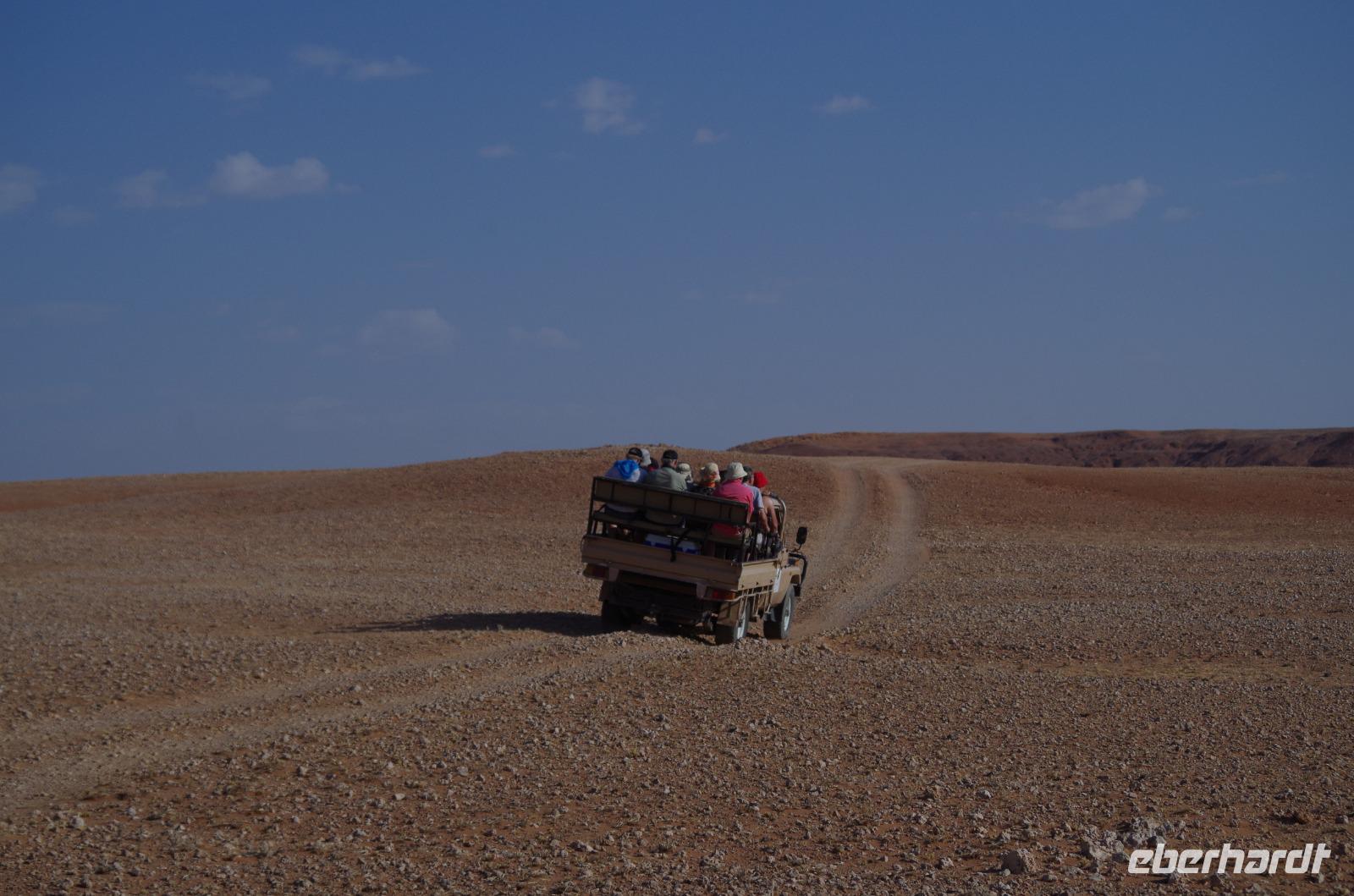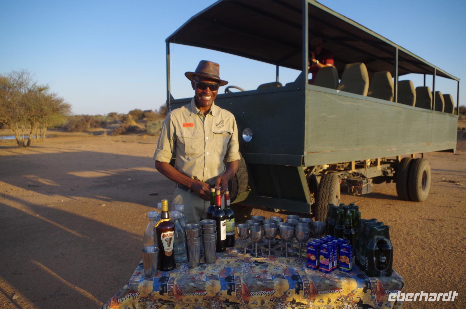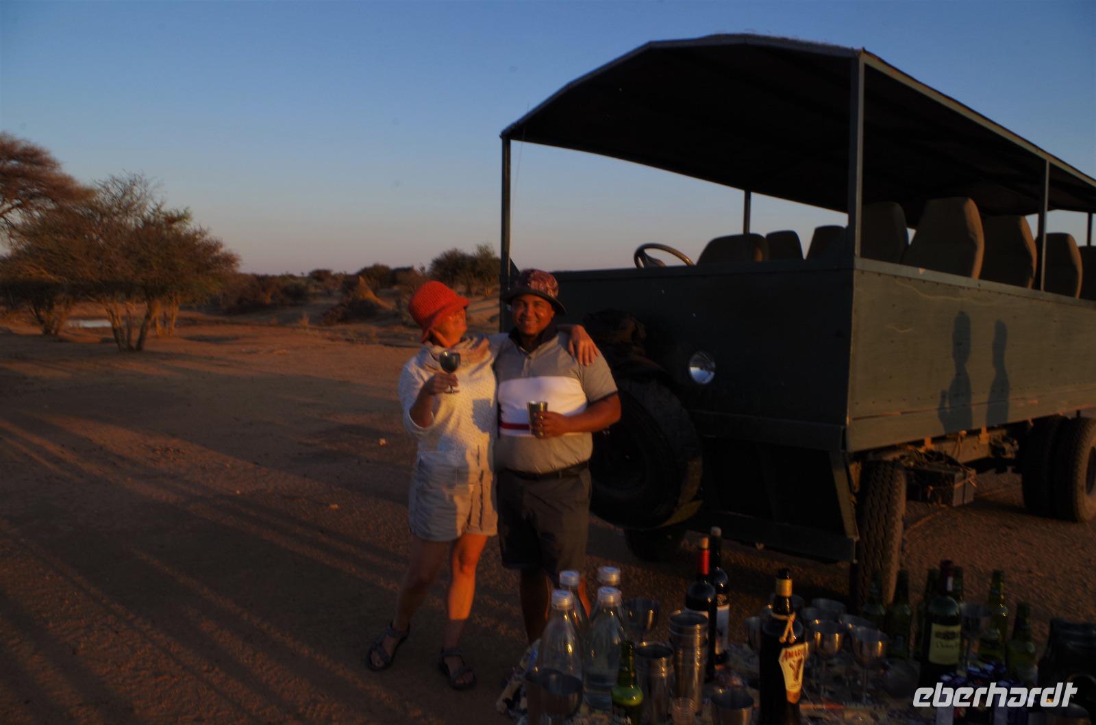 Am späten Nachmittag unternahmen wir eine Ausfahrt durch den ca. 10.000 Hektar großen Gondwana Namib Park. Unsere charmanten Ranger erklärten uns viel zu den versteinerten Ur-Dünen der ältesten Wüste der Welt. Wir sahen viele, viele Oryxe, sogar mit Baby; Strauße und gerieten in einen kleinen Sandsturm, dennoch begeisterte uns diese Landschaft wieder einmal mehr. Auf einer Anhöhe wurde dann mobile Bar aufgebaut. Wir genossen die untergehende Sonne, diese atemberaubende Kulisse mit einem Sundowner, die meisten wählten G & T. Diese alte Safari-Tradition gehört einfach dazu: Leben und Leben lassen, genießen! - Tagesetappe im Truck: 270 km