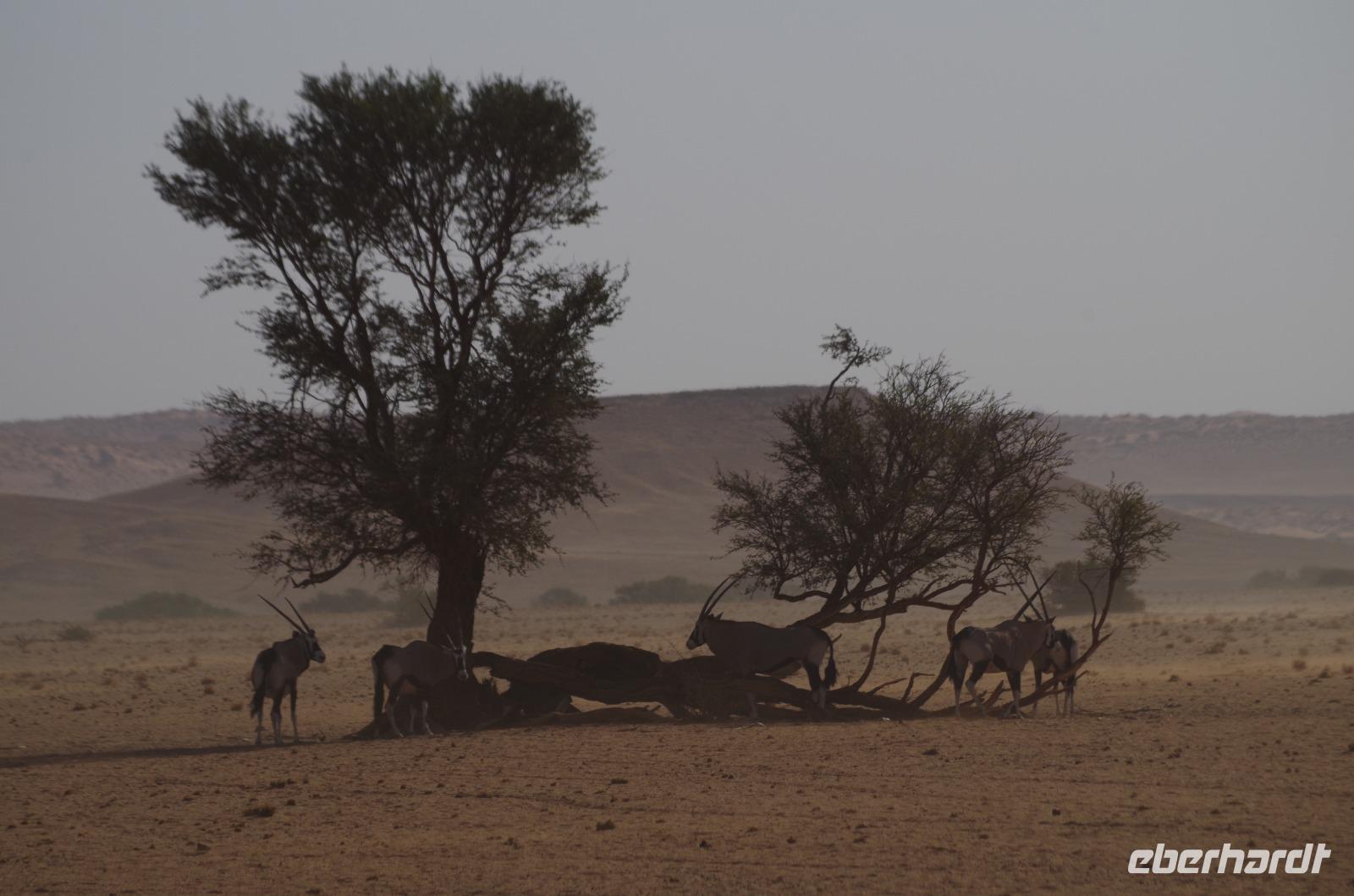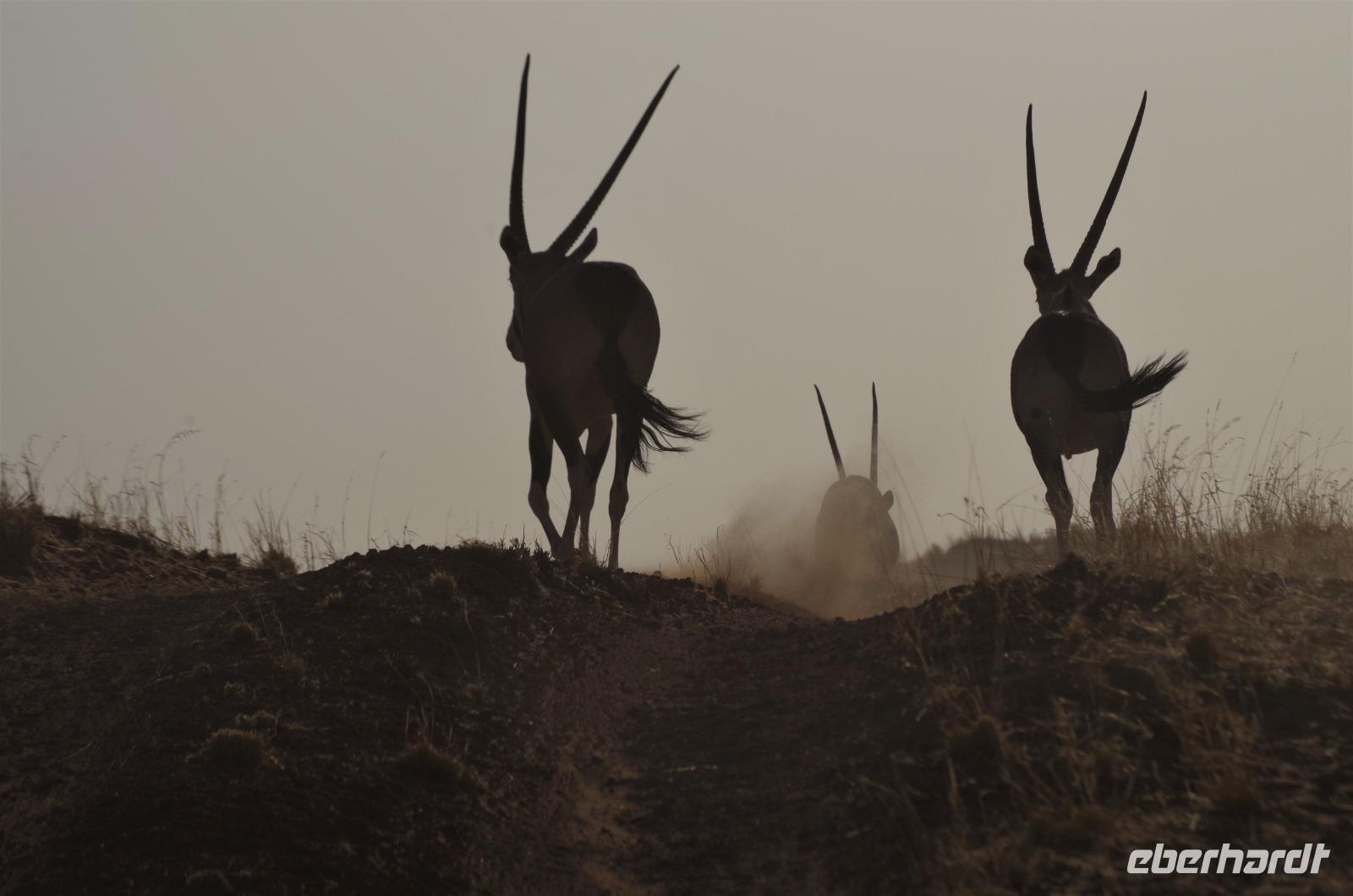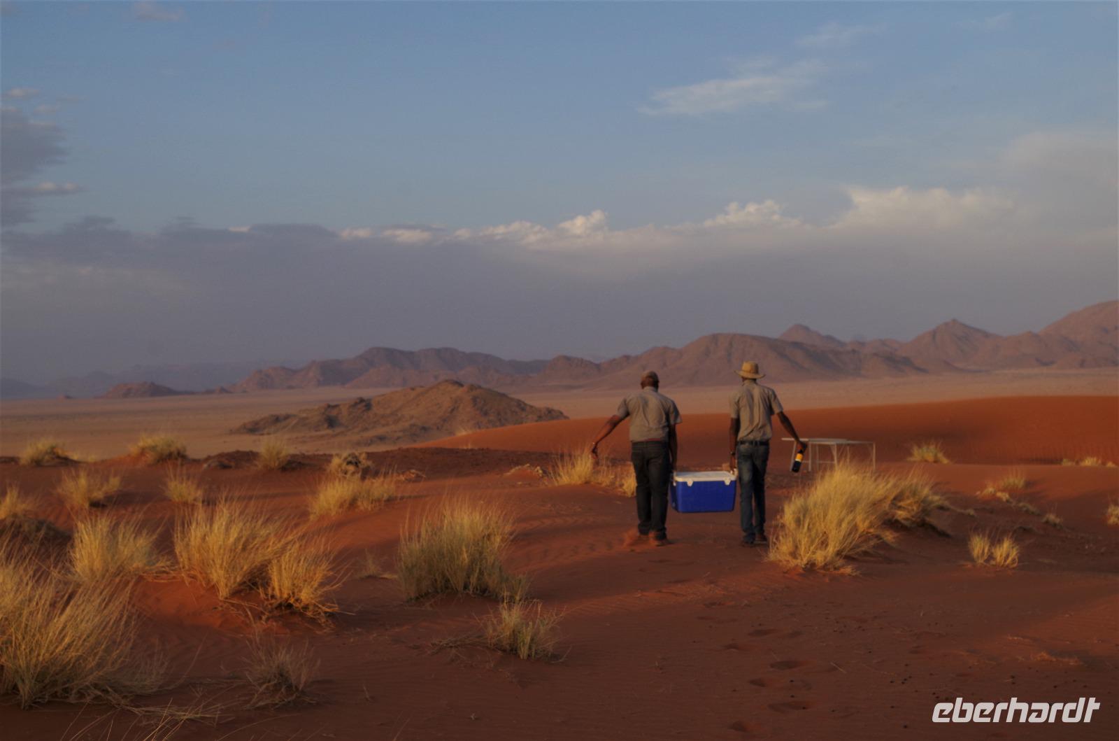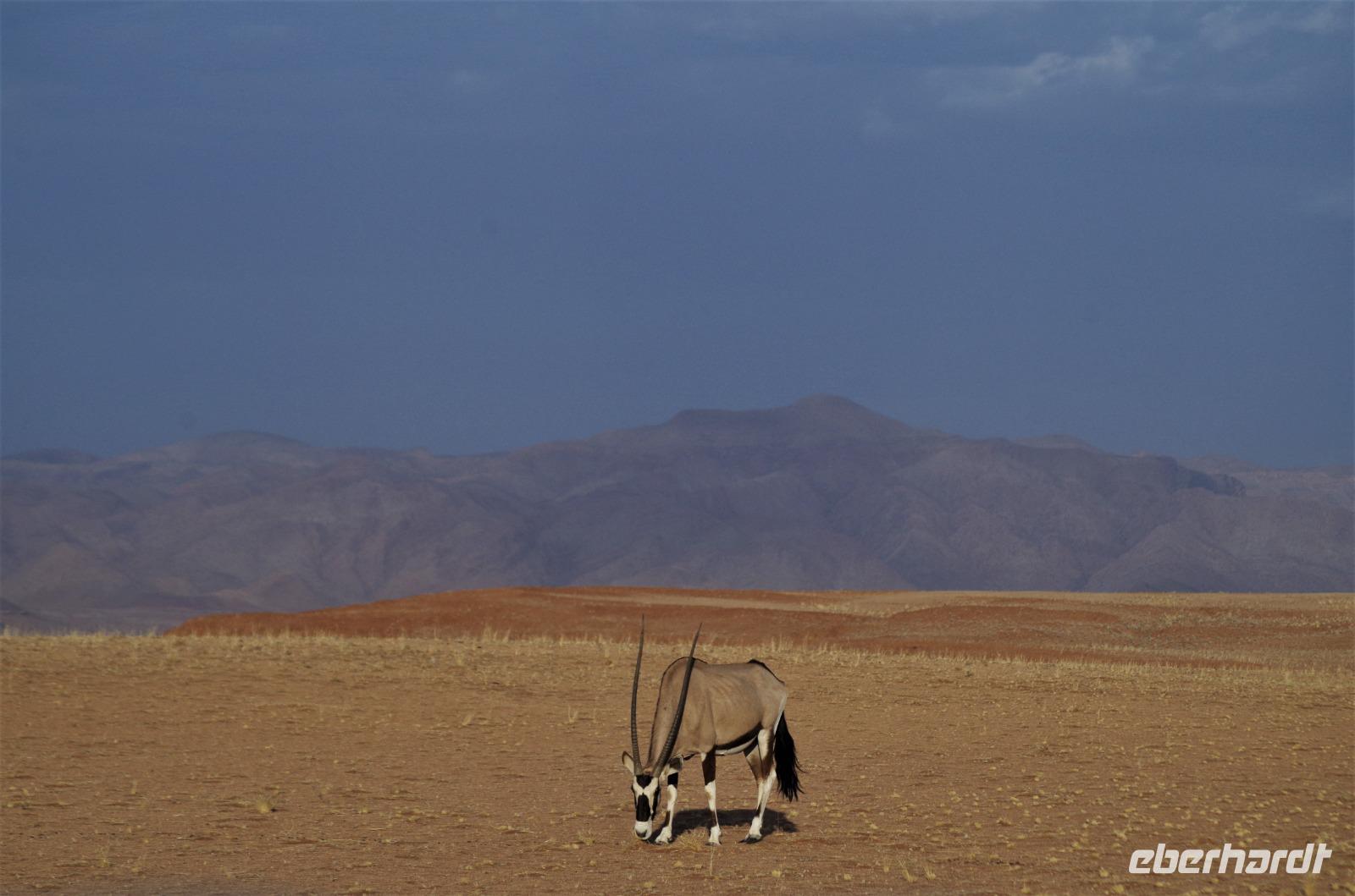 Am späten Nachmittag unternahmen wir eine Ausfahrt durch den ca. 10.000 Hektar großen Gondwana Namib Park. Unsere charmanten Ranger erklärten uns viel zu den versteinerten Ur-Dünen der ältesten Wüste der Welt. Wir sahen viele, viele Oryxe, sogar mit Baby; Strauße und gerieten in einen kleinen Sandsturm, dennoch begeisterte uns diese Landschaft wieder einmal mehr. Auf einer Anhöhe wurde dann mobile Bar aufgebaut. Wir genossen die untergehende Sonne, diese atemberaubende Kulisse mit einem Sundowner, die meisten wählten G & T. Diese alte Safari-Tradition gehört einfach dazu: Leben und Leben lassen, genießen! - Tagesetappe im Truck: 270 km
