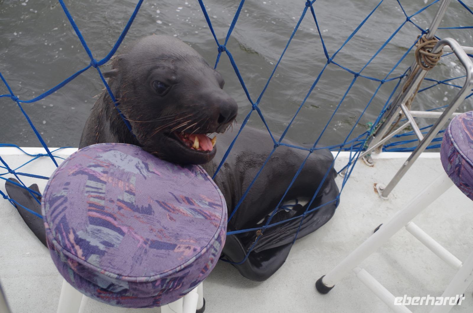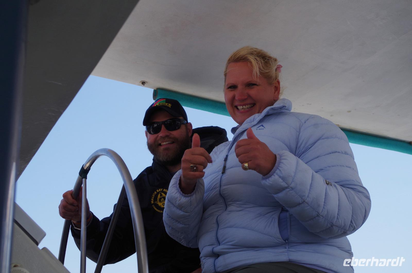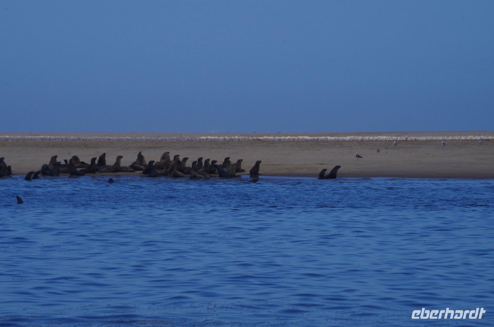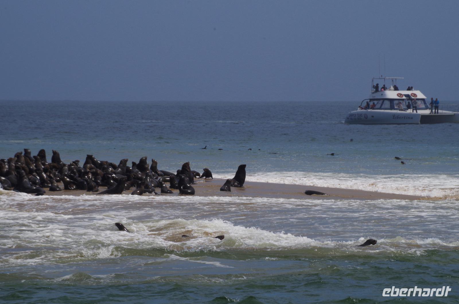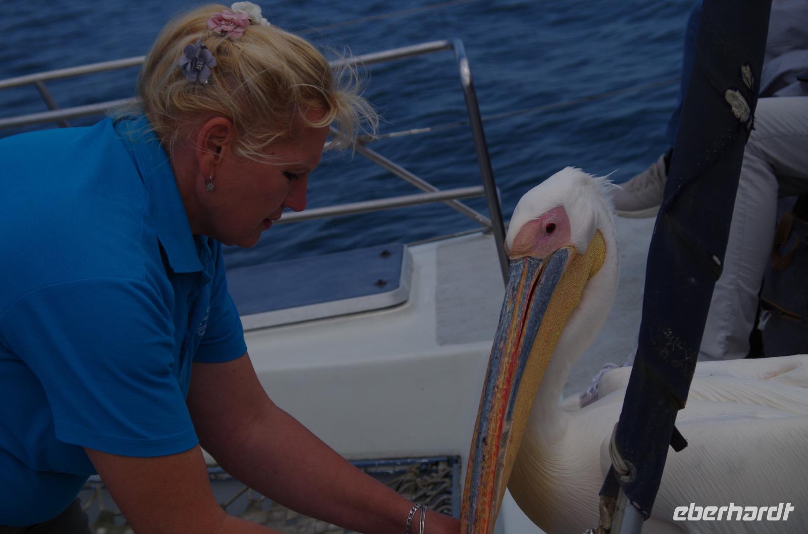 Am Morgen fuhren alle Gäste noch einmal nach Walvis Bay. Eine Catamaranfahrt durch die Lagune von Walvis Bay stand auf dem Programm und das bei Sonnenschein und sanfter See. Pelikan-Mama Carol-Ann empfing uns an der Jetty. Sie ist die einzige Kapitänin hier! Eine freche Möwe begrüßte uns aus luftiger Höhe, wenn auch etwas anders als erwartet. Pelikane und Robben kamen an Bord, natürlich, weil es auch ein paar Streicheleinheiten und Leckerlis gab. Von Carol-Ann erfuhren wir Lustiges und Wissenswertes über die Bucht und seine Bewohner sowie über die Austernzucht hier. Während Pelikan & Co mit frischen Fisch verwöhnt wurden, wurden wir mit heißen Kaffee und einen Good "Old Brown" Sherry bewirtet. Vorbei an den Austernfarmen schipperten wir zur Halbinsel, wo auch der schwarz-weiße Leuchtturm steht. Bald entdeckten wir die vielen Robbenkolonien, die es sich hier bequem gemacht haben, auf der Sandbank dahinter die großen Nistplätze der Flamigos. Auf der Rückfahrt besuchten uns blinde Passagiere, auch Robbe Bubble, die mittlerweile erwachsen geworden ist, kam an Bord. Mit südafrikanischen Sekt stießen wir auf diesen wunderschönen Vormittag an. Carol-Ann und Annett zeigten, wie man Austern richtig verspeist, nämlich mit Zitrone, Tabasco und einen Schuss Sekt. Aber auch für die Nicht-Austern-Esser war gesorgt. Alle schlemmten vom köstlichen Häppchen mit Meeresfrüchten, Fisch, Fleisch und Süßem. Es war im wahrsten Sinne des Wortes ein tierisch lekker Ausflug, denn auch auf der Rückfahrt wollten uns die Robben einfach nicht gehen lassen.