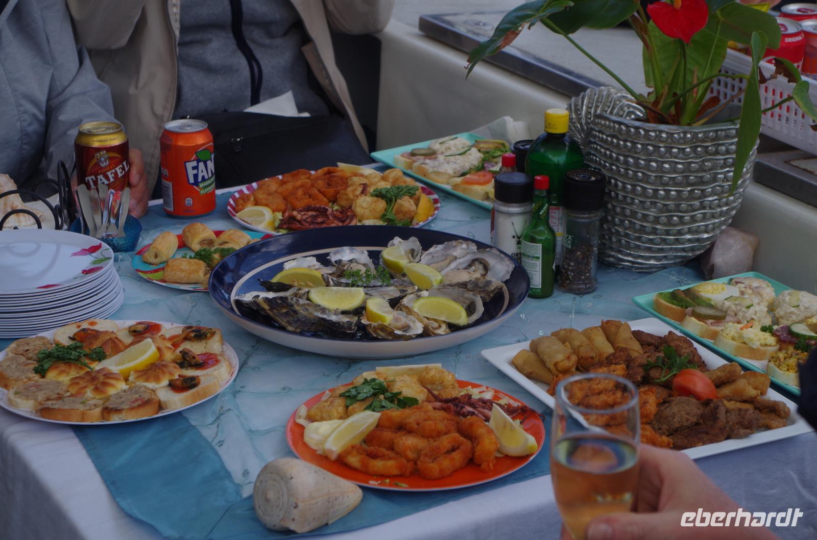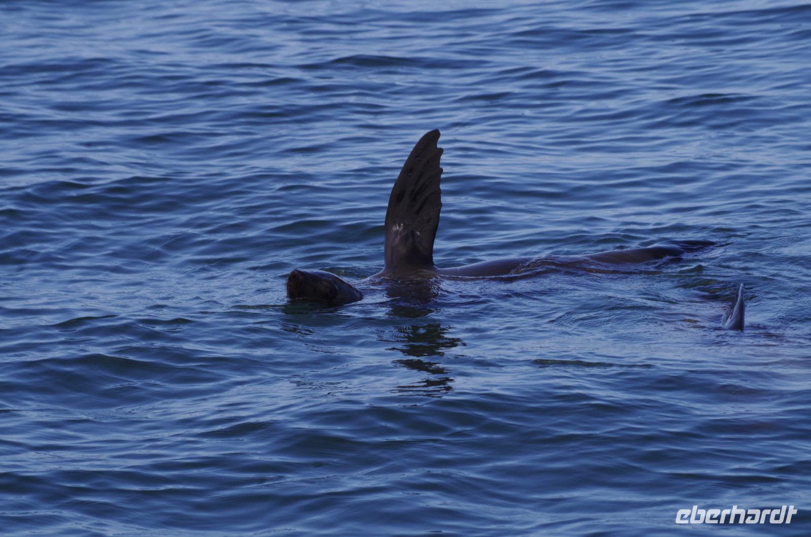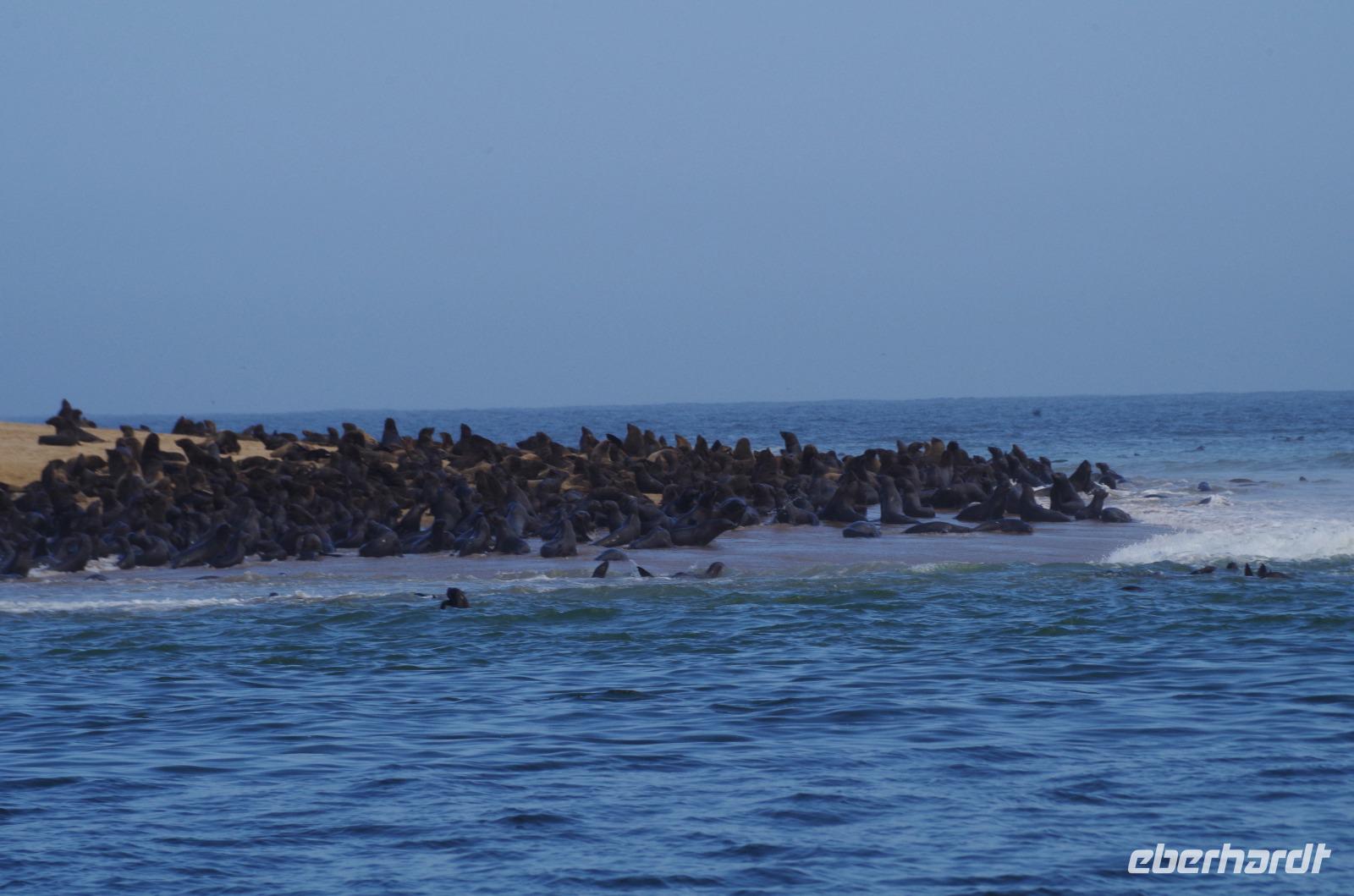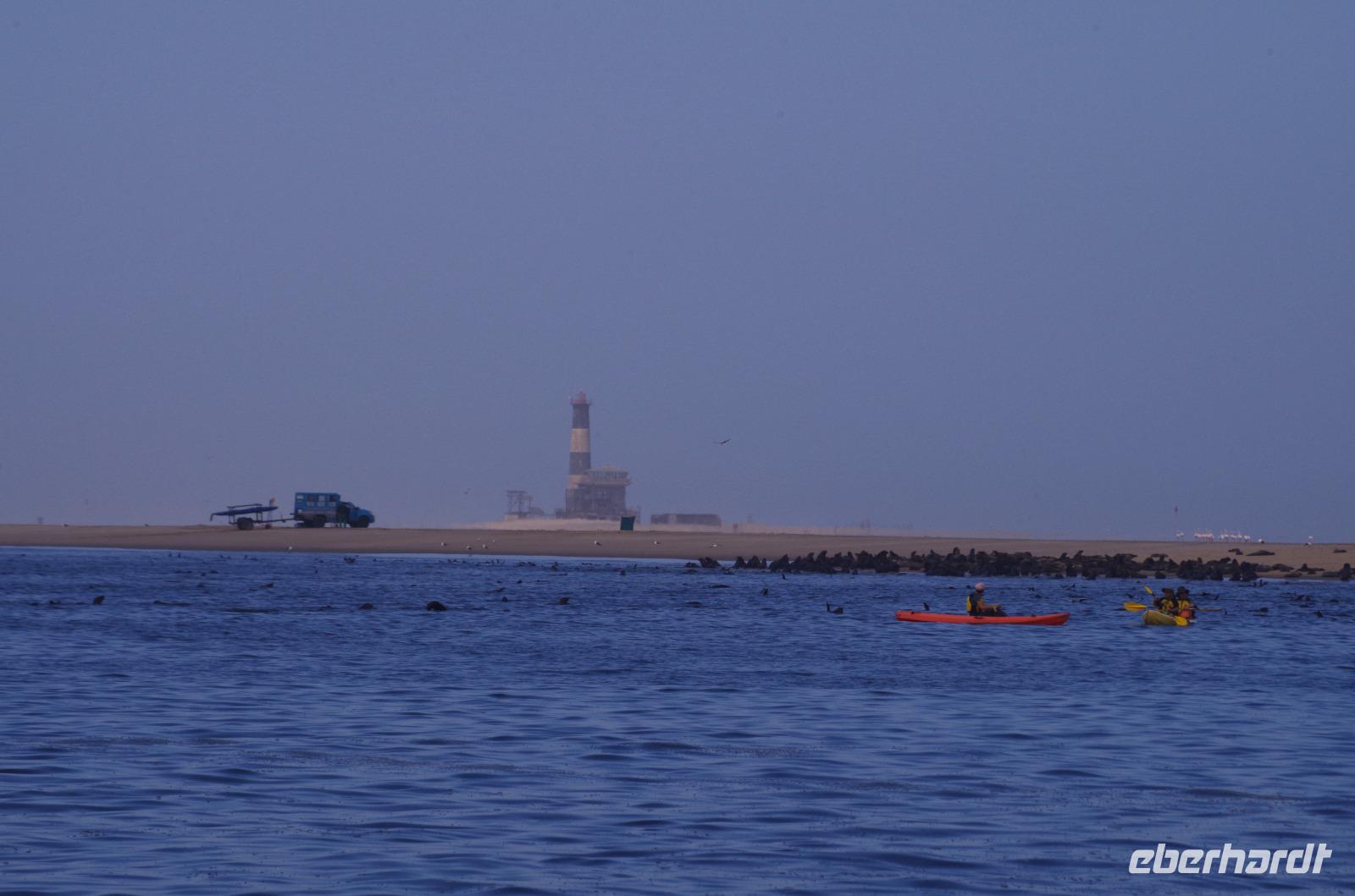 Am Morgen fuhren alle Gäste noch einmal nach Walvis Bay. Eine Catamaranfahrt durch die Lagune von Walvis Bay stand auf dem Programm und das bei Sonnenschein und sanfter See. Pelikan-Mama Carol-Ann empfing uns an der Jetty. Sie ist die einzige Kapitänin hier! Eine freche Möwe begrüßte uns aus luftiger Höhe, wenn auch etwas anders als erwartet. Pelikane und Robben kamen an Bord, natürlich, weil es auch ein paar Streicheleinheiten und Leckerlis gab. Von Carol-Ann erfuhren wir Lustiges und Wissenswertes über die Bucht und seine Bewohner sowie über die Austernzucht hier. Während Pelikan & Co mit frischen Fisch verwöhnt wurden, wurden wir mit heißen Kaffee und einen Good "Old Brown" Sherry bewirtet. Vorbei an den Austernfarmen schipperten wir zur Halbinsel, wo auch der schwarz-weiße Leuchtturm steht. Bald entdeckten wir die vielen Robbenkolonien, die es sich hier bequem gemacht haben, auf der Sandbank dahinter die großen Nistplätze der Flamigos. Auf der Rückfahrt besuchten uns blinde Passagiere, auch Robbe Bubble, die mittlerweile erwachsen geworden ist, kam an Bord. Mit südafrikanischen Sekt stießen wir auf diesen wunderschönen Vormittag an. Carol-Ann und Annett zeigten, wie man Austern richtig verspeist, nämlich mit Zitrone, Tabasco und einen Schuss Sekt. Aber auch für die Nicht-Austern-Esser war gesorgt. Alle schlemmten vom köstlichen Häppchen mit Meeresfrüchten, Fisch, Fleisch und Süßem. Es war im wahrsten Sinne des Wortes ein tierisch lekker Ausflug, denn auch auf der Rückfahrt wollten uns die Robben einfach nicht gehen lassen.