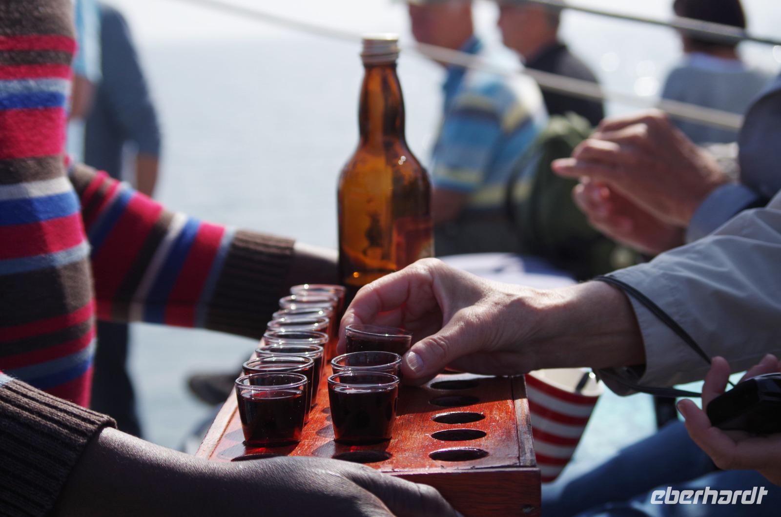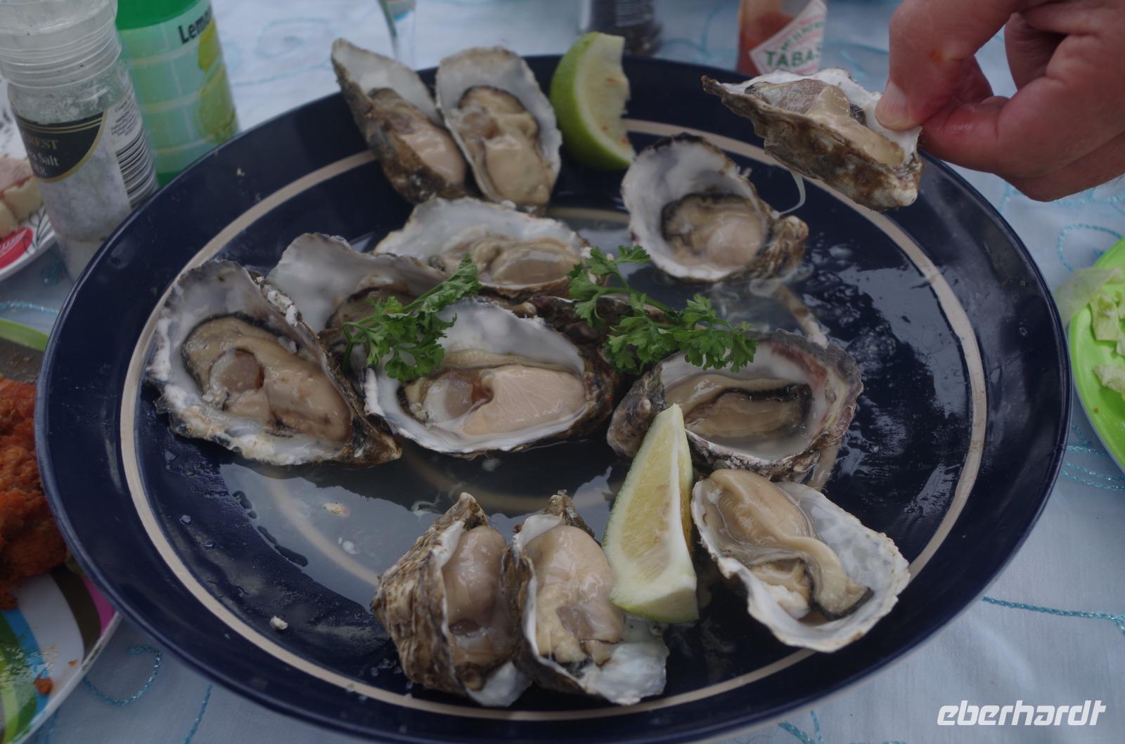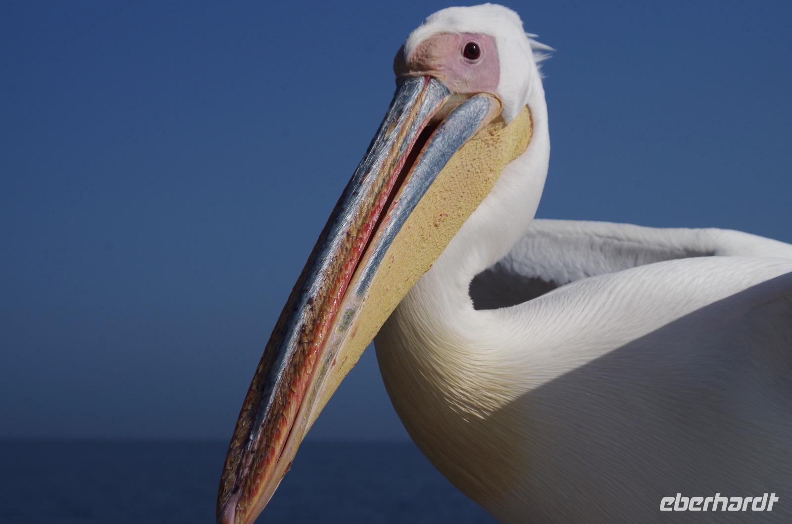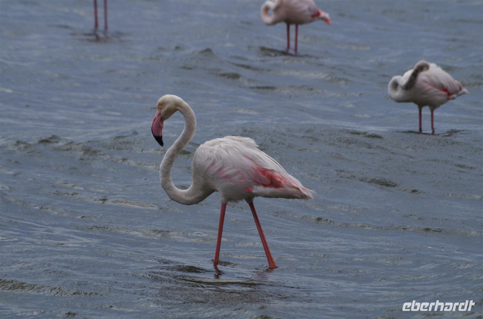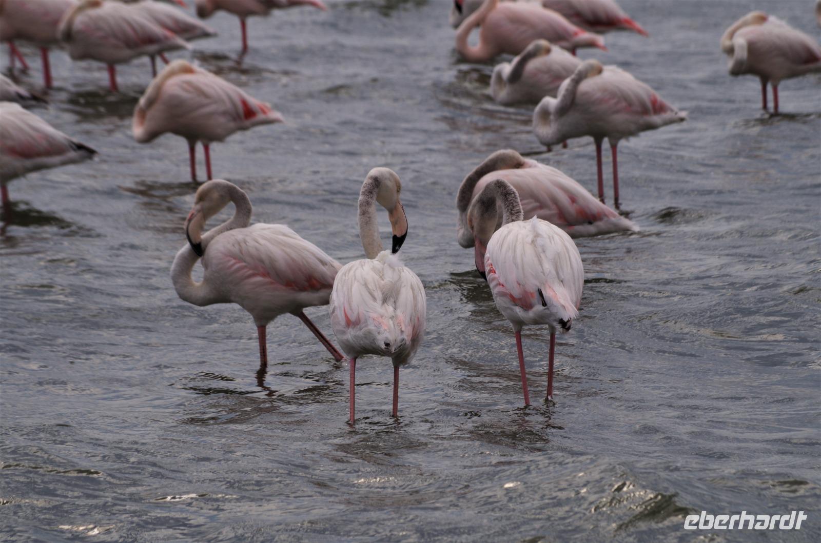 Am Morgen fuhren alle Gäste noch einmal nach Walvis Bay. Eine Catamaranfahrt durch die Lagune von Walvis Bay stand auf dem Programm und das bei Sonnenschein und sanfter See. Pelikan-Mama Carol-Ann empfing uns an der Jetty. Sie ist die einzige Kapitänin hier! Eine freche Möwe begrüßte uns aus luftiger Höhe, wenn auch etwas anders als erwartet. Pelikane und Robben kamen an Bord, natürlich, weil es auch ein paar Streicheleinheiten und Leckerlis gab. Von Carol-Ann erfuhren wir Lustiges und Wissenswertes über die Bucht und seine Bewohner sowie über die Austernzucht hier. Während Pelikan & Co mit frischen Fisch verwöhnt wurden, wurden wir mit heißen Kaffee und einen Good "Old Brown" Sherry bewirtet. Vorbei an den Austernfarmen schipperten wir zur Halbinsel, wo auch der schwarz-weiße Leuchtturm steht. Bald entdeckten wir die vielen Robbenkolonien, die es sich hier bequem gemacht haben, auf der Sandbank dahinter die großen Nistplätze der Flamigos. Auf der Rückfahrt besuchten uns blinde Passagiere, auch Robbe Bubble, die mittlerweile erwachsen geworden ist, kam an Bord. Mit südafrikanischen Sekt stießen wir auf diesen wunderschönen Vormittag an. Carol-Ann und Annett zeigten, wie man Austern richtig verspeist, nämlich mit Zitrone, Tabasco und einen Schuss Sekt. Aber auch für die Nicht-Austern-Esser war gesorgt. Alle schlemmten vom köstlichen Häppchen mit Meeresfrüchten, Fisch, Fleisch und Süßem. Es war im wahrsten Sinne des Wortes ein tierisch lekker Ausflug, denn auch auf der Rückfahrt wollten uns die Robben einfach nicht gehen lassen.