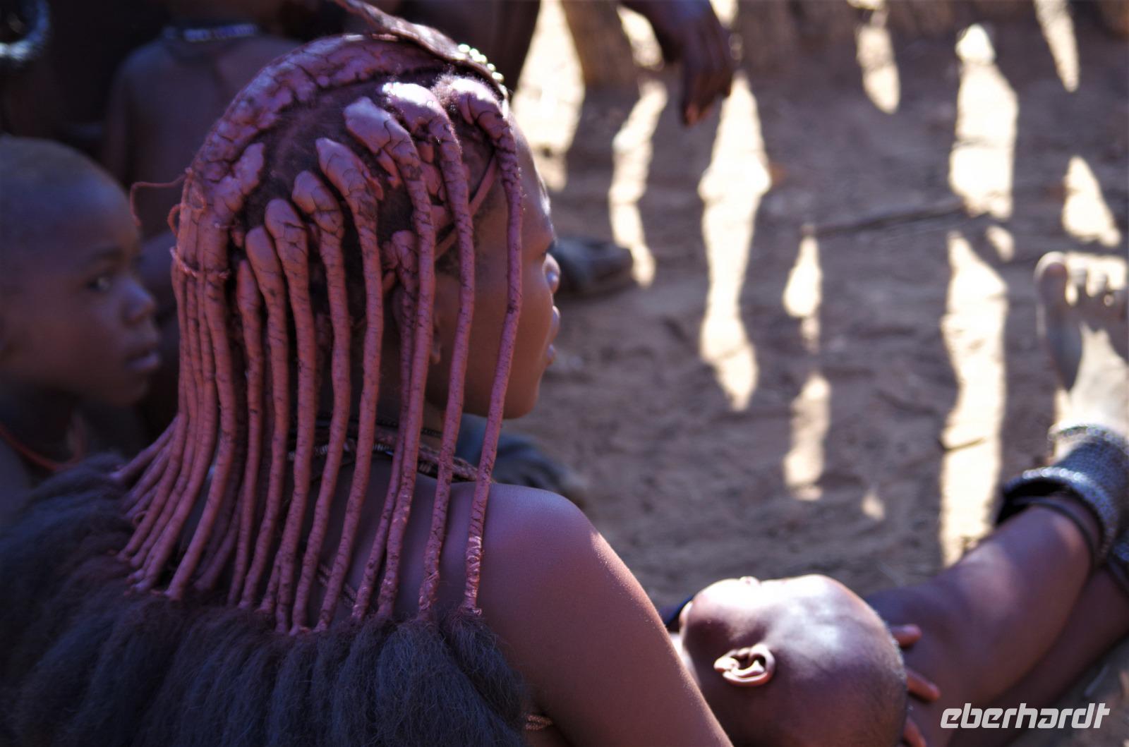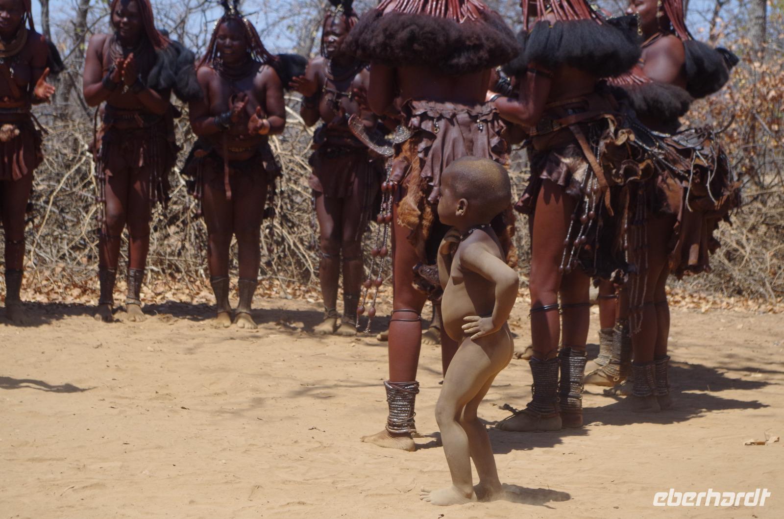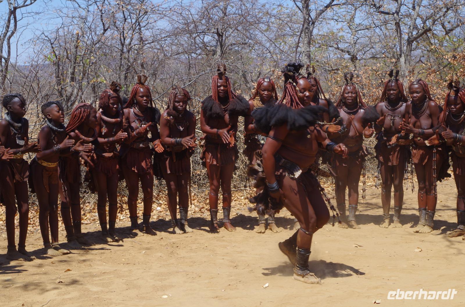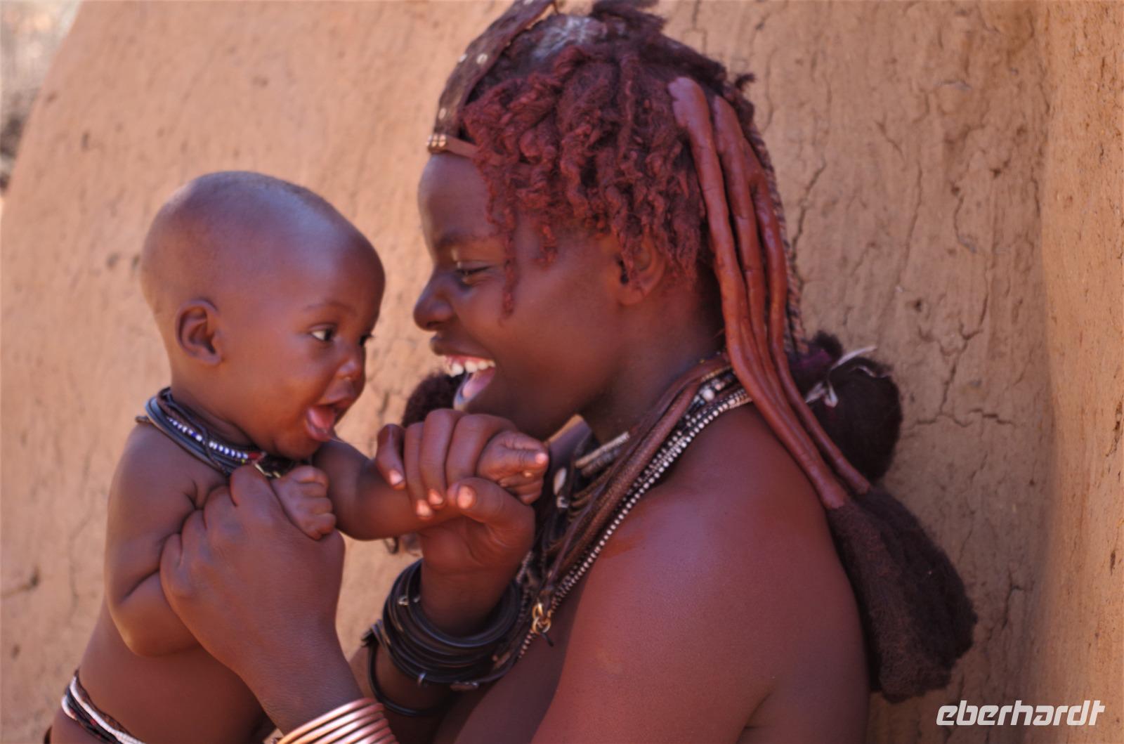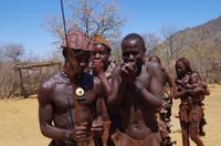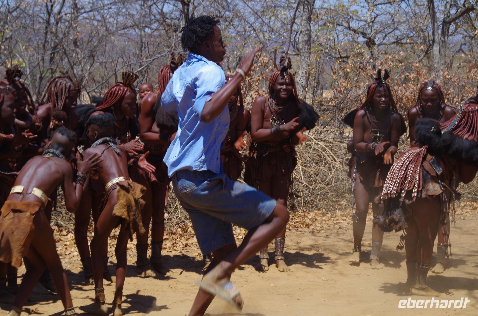 Alle haben gut geschlafen und freuen sich auf einen entspannten Ausflug ins Himabland. In dieser Region leben Himbas, Hereros sowie die aus Angola stammenden Zemba. Himbas und Hereros stammen aus der gleichen Volksgruppe. Bei der Wanderung der Bantuvölker trennten sich dann ihre Wege. Während die Himbas gen Nordwesten wanderten, sind die Hereros weiter nach Süden gegangen. Später sind wir am Dorf der Ovahimba angekommen. Es ist ein richtiges Dorf, aber auch ein sogenanntes lebendes Museum. Neugierig begrüßt man uns - wir sind willkommen! Chief des Dorfes ist Robert, der sich extra europäisch für uns schick gemacht hat. Er begrüßt uns im guten englisch. Sein Vater ist Herero und seine Mutter Himba, deshalb sind sie alle relativ groß gewachsen. Der Dorfälteste und viele Männer sind nicht anwesend, denn sie sind zu Trauerfeierlichkeiten in ein weit entferntes Dorf aufgebrochen oder hüten draußen die Rinder. Moro, Moro, periwi? Naua, okukepa! Das heißt soviel wie: Hallo, wie geht es Dir? Danke, gut. Robert erklärt uns wie die Himbas traditionell leben, so fast ohne die moderne Welt. Für uns fremd und unvorstellbar. Doch das Eis zwischen den Kulturen ist schnell gebrochen. Trotz Sprachdefiziten kommt man sich näher. Kein Wunder! Uns faszinieren sofort die künstlerischen Haartrachten der Frauen. Hübsche Gesichter lächeln uns entgegen. Ja, gutes Aussehen ist auch für die Himba-Frauen wichtig. So erkennt man beispielsweise an den Frisuren das Alter und den Familienstand und am Schmuck der Frauen, besonders an den Füßen, ob man bereits Kinder sie bereits zur Welt gebracht haben. Uns wird alles gezeigt und erklärt und wir dürfen auch fotografieren. Was mir sofort auffällt, sind die glücklichen Gesichter. Eine junge Mutter scherzt mit ihrem Baby - kleine Kinder spielen im Schatten der Lehmhütte und streiten sich natürlich auch mal ein wenig dabei..... Der heilige Kraal steht in der Mitte des Dorfes, kleine Kälber springen herum. Ein Rinderhirt bläst auf einem Kuduhorn eine Melodie. Fast scheint es, als ob er den Kälbchen ein Ständchen bringt. Uns wird erklärt, dass es wichtig ist, die Kälber an diese spezielle Melodie zu gewöhnen, um zurück zu finden, falls sie sich mal verlaufen. Man zeigt uns die Dorfküche und wie Maismehl mit einem Stein zermahlen wird. Das ist Aufgabe der Frauen, doch Robert kann das auch und schneller. Zwischen Kraal und der Chief-Hütte brennt das Heilige Feuer, diese imaginäre Linie darf nicht übertreten werden. Wir werden eingeladen, die Lehmhütte zu betreten und finden alle zusammen Platz. Die Frauen zeigen uns, wie sie sich pflegen, Wasser dürfen sie nicht benutzen. Typisch auch deren die rote Färbung der Haut, die durch das Einreiben mit einem eisenhaltigen Steinmehl und Butterfett (heute Vaseline) entsteht. Die Hauptfrau hat Klein-Himba-Elvis auf dem Schoss, der uns mit leuchtenden Augen anschaut. Annett darf das stählerne Röckchen anziehen, was einem Keuchheitsgürtel aus dem Mittelalter ähnelt. Zum Schluß Singen und Tanzen die Himbas für uns, eine ganz private Veranstaltung, nur für uns. Das scheint ihnen besonders großen Spaß zu machen und uns natürlich auch. Jedes Lied, jeder Tanz hat eine Bedeutung und ist einem besonderen Anlass gewidmet. Manchmal können Männer und Frauen zusammen tanzen und singen, manchmal ist es nur den Frauen vorbehalten. Nach fast 3 h verabschieden wir uns herzlich bei den freundlichen Himbas. Nach jedem Besuch bei den Himbas hoffe ich, dass dieses liebenswerte Urvolk noch lange so, in seinen Traditionen leben kann und ihnen durch die moderne Welt ihre Lebensgrundlage nicht entzogen wird. Danach fahren wir zu unserer schönen Lodge zurück und genießen den weiteren Nachmittag. Zum Abendessen wird heute gegrillt - hier nennt man es Braai. Das Wildfleisch ist saftig und die Bratwürste schmecken himmlich, auch der Sonnenuntergang ist wieder wunderschön! - Tagesetappe: 96 km
