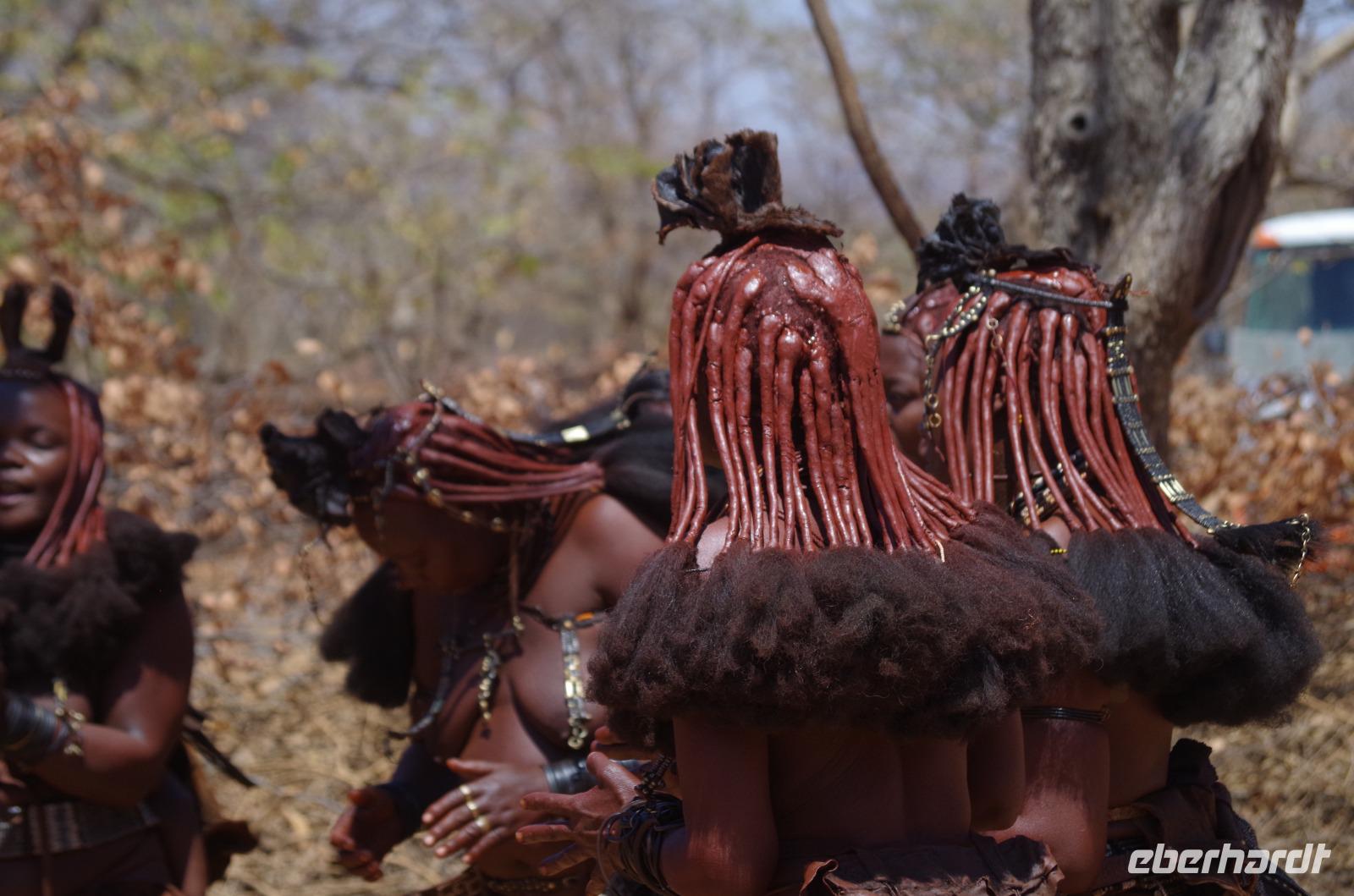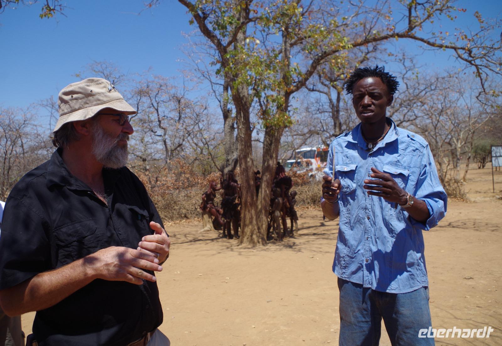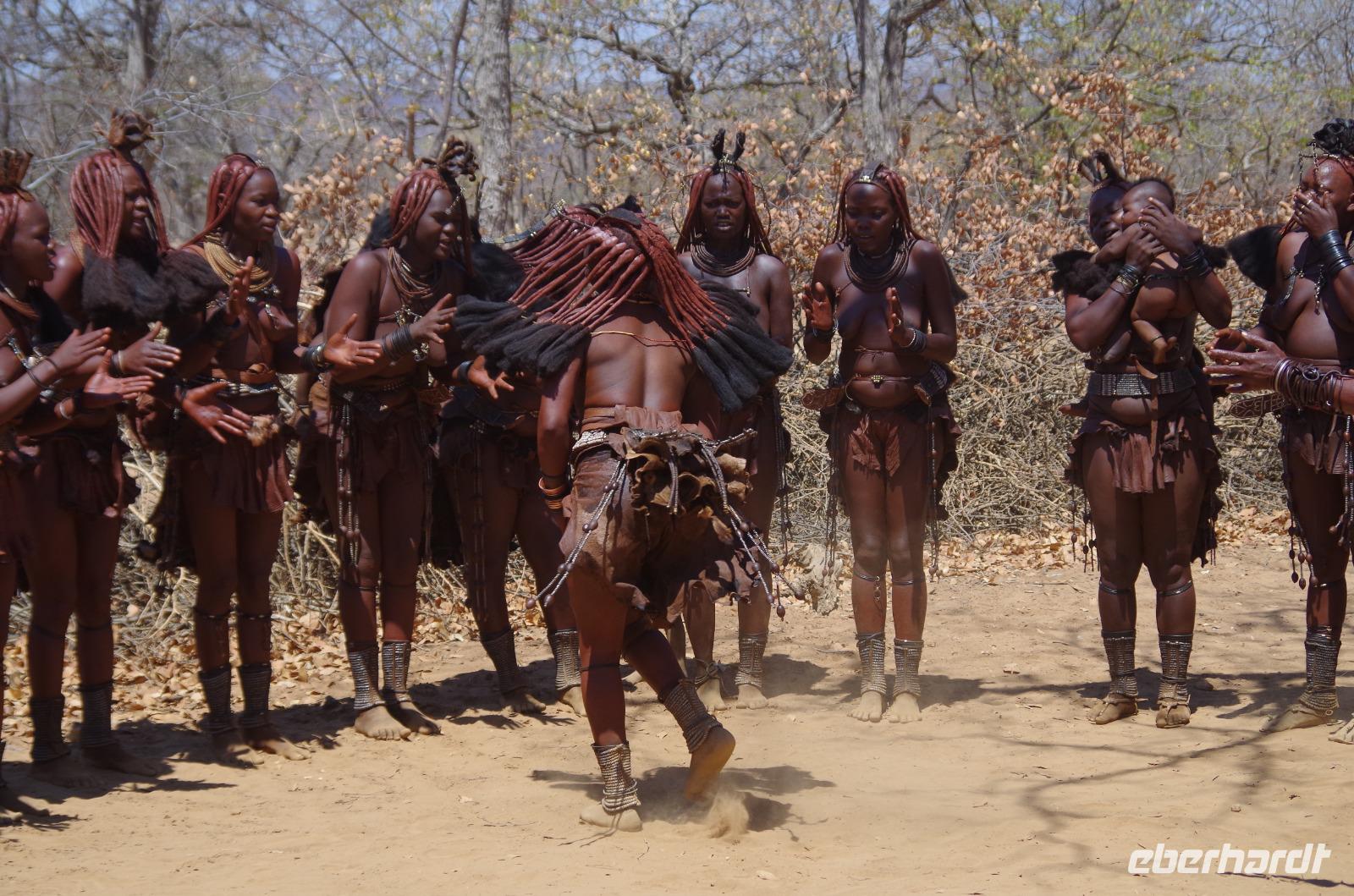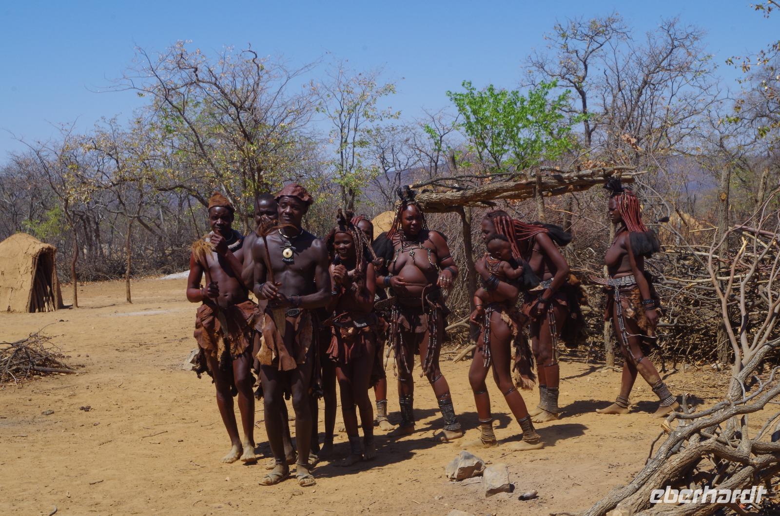 Alle haben gut geschlafen und freuen sich auf einen entspannten Ausflug ins Himabland. In dieser Region leben Himbas, Hereros sowie die aus Angola stammenden Zemba. Himbas und Hereros stammen aus der gleichen Volksgruppe. Bei der Wanderung der Bantuvölker trennten sich dann ihre Wege. Während die Himbas gen Nordwesten wanderten, sind die Hereros weiter nach Süden gegangen. Später sind wir am Dorf der Ovahimba angekommen. Es ist ein richtiges Dorf, aber auch ein sogenanntes lebendes Museum. Neugierig begrüßt man uns - wir sind willkommen! Chief des Dorfes ist Robert, der sich extra europäisch für uns schick gemacht hat. Er begrüßt uns im guten englisch. Sein Vater ist Herero und seine Mutter Himba, deshalb sind sie alle relativ groß gewachsen. Der Dorfälteste und viele Männer sind nicht anwesend, denn sie sind zu Trauerfeierlichkeiten in ein weit entferntes Dorf aufgebrochen oder hüten draußen die Rinder. Moro, Moro, periwi? Naua, okukepa! Das heißt soviel wie: Hallo, wie geht es Dir? Danke, gut. Robert erklärt uns wie die Himbas traditionell leben, so fast ohne die moderne Welt. Für uns fremd und unvorstellbar. Doch das Eis zwischen den Kulturen ist schnell gebrochen. Trotz Sprachdefiziten kommt man sich näher. Kein Wunder! Uns faszinieren sofort die künstlerischen Haartrachten der Frauen. Hübsche Gesichter lächeln uns entgegen. Ja, gutes Aussehen ist auch für die Himba-Frauen wichtig. So erkennt man beispielsweise an den Frisuren das Alter und den Familienstand und am Schmuck der Frauen, besonders an den Füßen, ob man bereits Kinder sie bereits zur Welt gebracht haben. Uns wird alles gezeigt und erklärt und wir dürfen auch fotografieren. Was mir sofort auffällt, sind die glücklichen Gesichter. Eine junge Mutter scherzt mit ihrem Baby - kleine Kinder spielen im Schatten der Lehmhütte und streiten sich natürlich auch mal ein wenig dabei..... Der heilige Kraal steht in der Mitte des Dorfes, kleine Kälber springen herum. Ein Rinderhirt bläst auf einem Kuduhorn eine Melodie. Fast scheint es, als ob er den Kälbchen ein Ständchen bringt. Uns wird erklärt, dass es wichtig ist, die Kälber an diese spezielle Melodie zu gewöhnen, um zurück zu finden, falls sie sich mal verlaufen. Man zeigt uns die Dorfküche und wie Maismehl mit einem Stein zermahlen wird. Das ist Aufgabe der Frauen, doch Robert kann das auch und schneller. Zwischen Kraal und der Chief-Hütte brennt das Heilige Feuer, diese imaginäre Linie darf nicht übertreten werden. Wir werden eingeladen, die Lehmhütte zu betreten und finden alle zusammen Platz. Die Frauen zeigen uns, wie sie sich pflegen, Wasser dürfen sie nicht benutzen. Typisch auch deren die rote Färbung der Haut, die durch das Einreiben mit einem eisenhaltigen Steinmehl und Butterfett (heute Vaseline) entsteht. Die Hauptfrau hat Klein-Himba-Elvis auf dem Schoss, der uns mit leuchtenden Augen anschaut. Annett darf das stählerne Röckchen anziehen, was einem Keuchheitsgürtel aus dem Mittelalter ähnelt. Zum Schluß Singen und Tanzen die Himbas für uns, eine ganz private Veranstaltung, nur für uns. Das scheint ihnen besonders großen Spaß zu machen und uns natürlich auch. Jedes Lied, jeder Tanz hat eine Bedeutung und ist einem besonderen Anlass gewidmet. Manchmal können Männer und Frauen zusammen tanzen und singen, manchmal ist es nur den Frauen vorbehalten. Nach fast 3 h verabschieden wir uns herzlich bei den freundlichen Himbas. Nach jedem Besuch bei den Himbas hoffe ich, dass dieses liebenswerte Urvolk noch lange so, in seinen Traditionen leben kann und ihnen durch die moderne Welt ihre Lebensgrundlage nicht entzogen wird. Danach fahren wir zu unserer schönen Lodge zurück und genießen den weiteren Nachmittag. Zum Abendessen wird heute gegrillt - hier nennt man es Braai. Das Wildfleisch ist saftig und die Bratwürste schmecken himmlich, auch der Sonnenuntergang ist wieder wunderschön! - Tagesetappe: 96 km