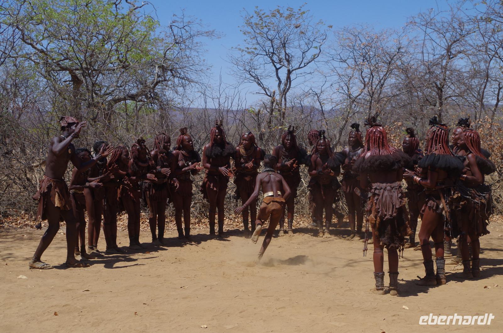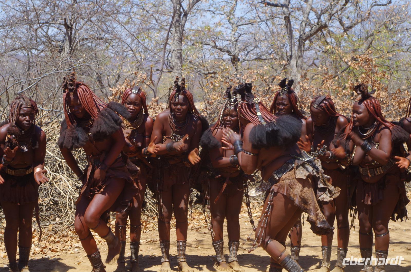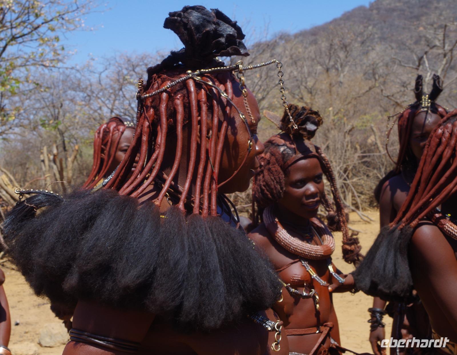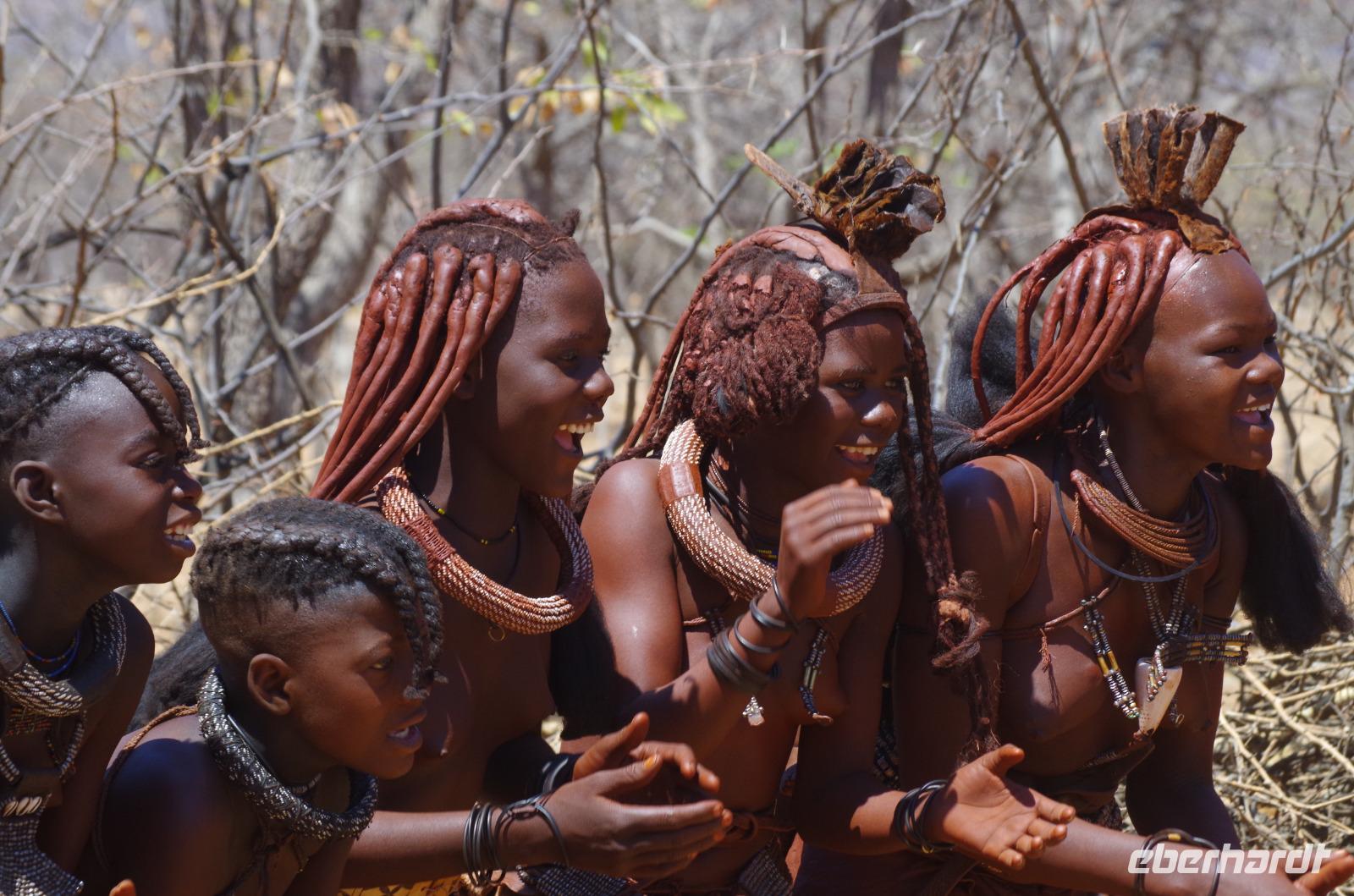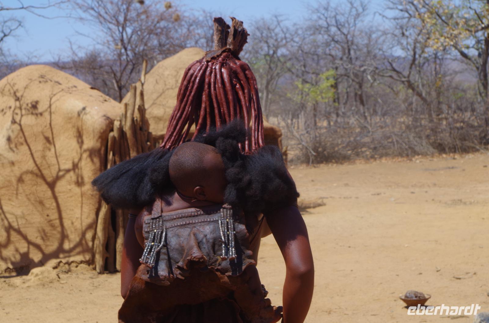 Alle haben gut geschlafen und freuen sich auf einen entspannten Ausflug ins Himabland. In dieser Region leben Himbas, Hereros sowie die aus Angola stammenden Zemba. Himbas und Hereros stammen aus der gleichen Volksgruppe. Bei der Wanderung der Bantuvölker trennten sich dann ihre Wege. Während die Himbas gen Nordwesten wanderten, sind die Hereros weiter nach Süden gegangen. Später sind wir am Dorf der Ovahimba angekommen. Es ist ein richtiges Dorf, aber auch ein sogenanntes lebendes Museum. Neugierig begrüßt man uns - wir sind willkommen! Chief des Dorfes ist Robert, der sich extra europäisch für uns schick gemacht hat. Er begrüßt uns im guten englisch. Sein Vater ist Herero und seine Mutter Himba, deshalb sind sie alle relativ groß gewachsen. Der Dorfälteste und viele Männer sind nicht anwesend, denn sie sind zu Trauerfeierlichkeiten in ein weit entferntes Dorf aufgebrochen oder hüten draußen die Rinder. Moro, Moro, periwi? Naua, okukepa! Das heißt soviel wie: Hallo, wie geht es Dir? Danke, gut. Robert erklärt uns wie die Himbas traditionell leben, so fast ohne die moderne Welt. Für uns fremd und unvorstellbar. Doch das Eis zwischen den Kulturen ist schnell gebrochen. Trotz Sprachdefiziten kommt man sich näher. Kein Wunder! Uns faszinieren sofort die künstlerischen Haartrachten der Frauen. Hübsche Gesichter lächeln uns entgegen. Ja, gutes Aussehen ist auch für die Himba-Frauen wichtig. So erkennt man beispielsweise an den Frisuren das Alter und den Familienstand und am Schmuck der Frauen, besonders an den Füßen, ob man bereits Kinder sie bereits zur Welt gebracht haben. Uns wird alles gezeigt und erklärt und wir dürfen auch fotografieren. Was mir sofort auffällt, sind die glücklichen Gesichter. Eine junge Mutter scherzt mit ihrem Baby - kleine Kinder spielen im Schatten der Lehmhütte und streiten sich natürlich auch mal ein wenig dabei..... Der heilige Kraal steht in der Mitte des Dorfes, kleine Kälber springen herum. Ein Rinderhirt bläst auf einem Kuduhorn eine Melodie. Fast scheint es, als ob er den Kälbchen ein Ständchen bringt. Uns wird erklärt, dass es wichtig ist, die Kälber an diese spezielle Melodie zu gewöhnen, um zurück zu finden, falls sie sich mal verlaufen. Man zeigt uns die Dorfküche und wie Maismehl mit einem Stein zermahlen wird. Das ist Aufgabe der Frauen, doch Robert kann das auch und schneller. Zwischen Kraal und der Chief-Hütte brennt das Heilige Feuer, diese imaginäre Linie darf nicht übertreten werden. Wir werden eingeladen, die Lehmhütte zu betreten und finden alle zusammen Platz. Die Frauen zeigen uns, wie sie sich pflegen, Wasser dürfen sie nicht benutzen. Typisch auch deren die rote Färbung der Haut, die durch das Einreiben mit einem eisenhaltigen Steinmehl und Butterfett (heute Vaseline) entsteht. Die Hauptfrau hat Klein-Himba-Elvis auf dem Schoss, der uns mit leuchtenden Augen anschaut. Annett darf das stählerne Röckchen anziehen, was einem Keuchheitsgürtel aus dem Mittelalter ähnelt. Zum Schluß Singen und Tanzen die Himbas für uns, eine ganz private Veranstaltung, nur für uns. Das scheint ihnen besonders großen Spaß zu machen und uns natürlich auch. Jedes Lied, jeder Tanz hat eine Bedeutung und ist einem besonderen Anlass gewidmet. Manchmal können Männer und Frauen zusammen tanzen und singen, manchmal ist es nur den Frauen vorbehalten. Nach fast 3 h verabschieden wir uns herzlich bei den freundlichen Himbas. Nach jedem Besuch bei den Himbas hoffe ich, dass dieses liebenswerte Urvolk noch lange so, in seinen Traditionen leben kann und ihnen durch die moderne Welt ihre Lebensgrundlage nicht entzogen wird. Danach fahren wir zu unserer schönen Lodge zurück und genießen den weiteren Nachmittag. Zum Abendessen wird heute gegrillt - hier nennt man es Braai. Das Wildfleisch ist saftig und die Bratwürste schmecken himmlich, auch der Sonnenuntergang ist wieder wunderschön! - Tagesetappe: 96 km