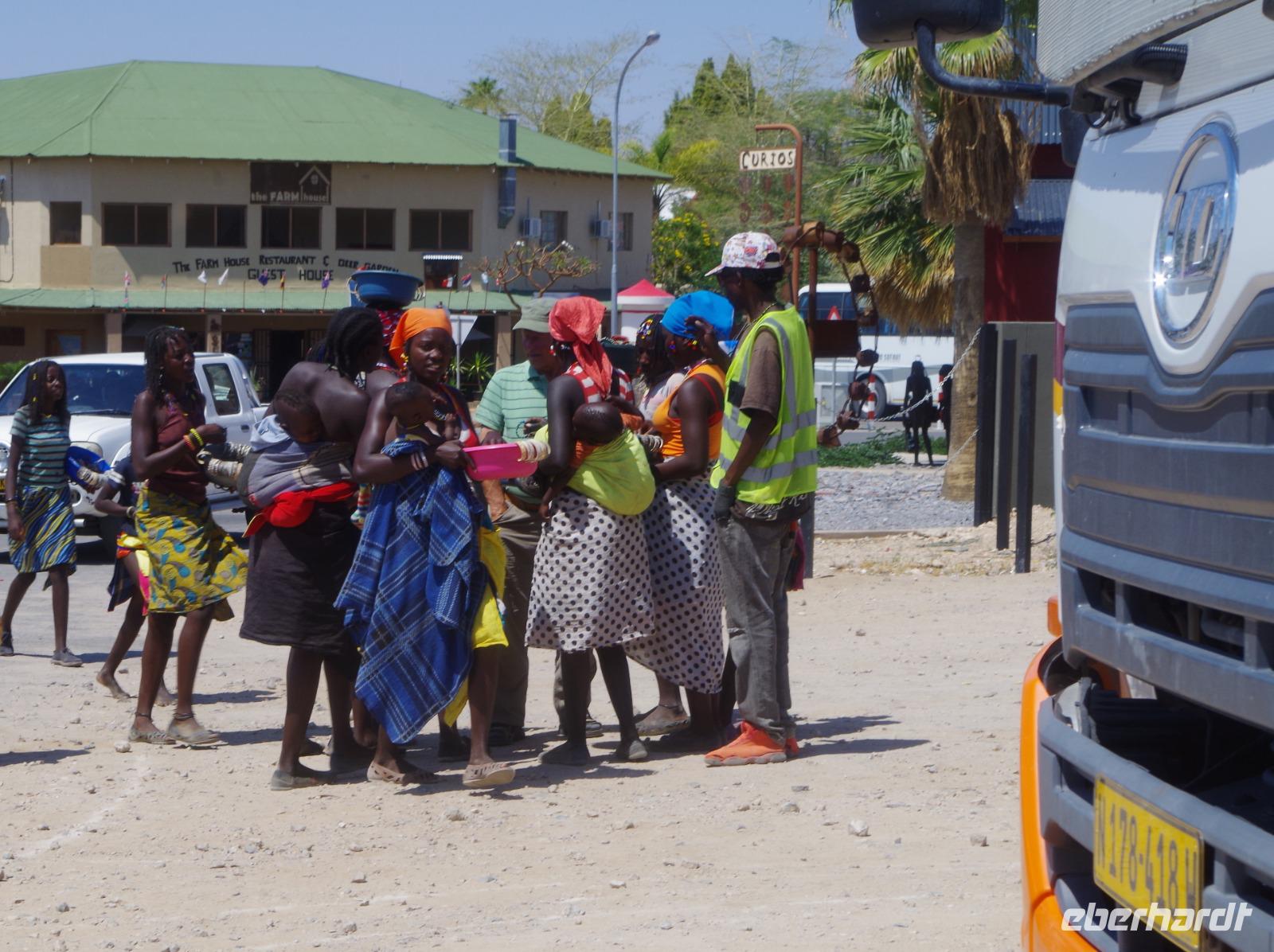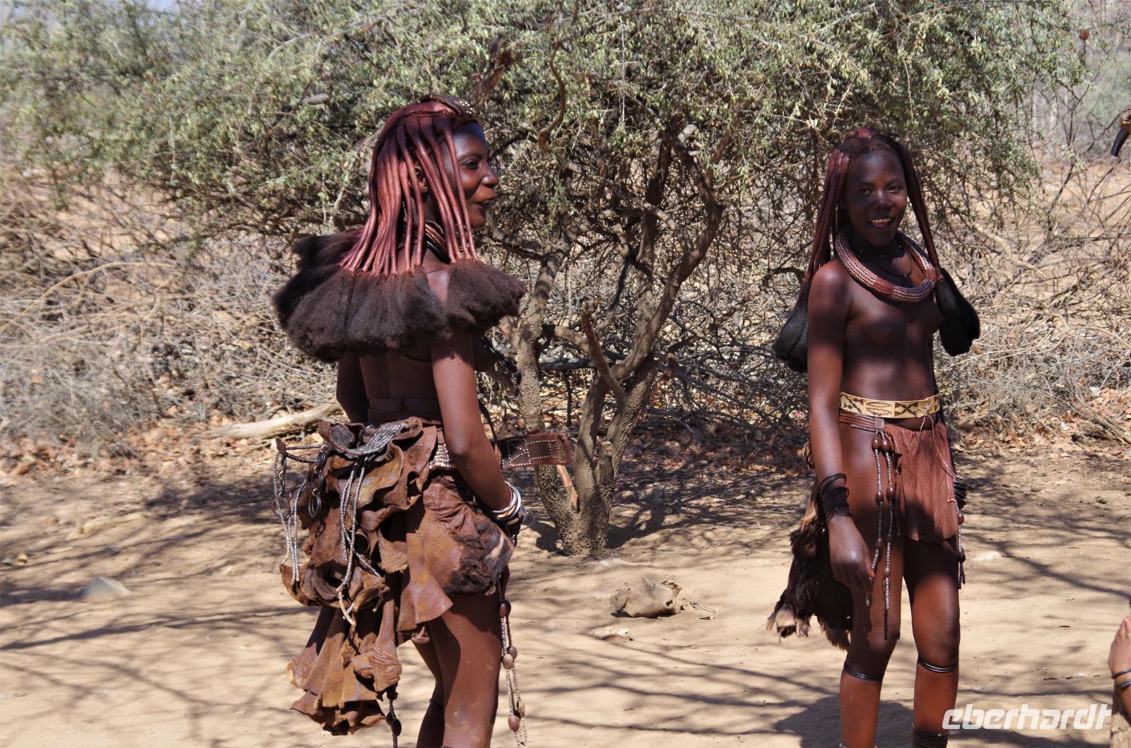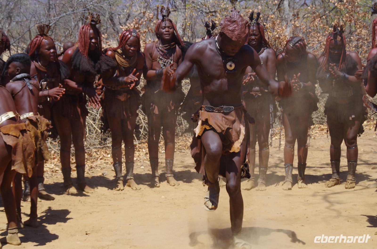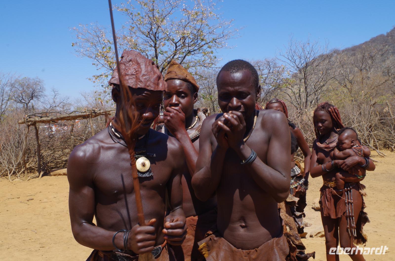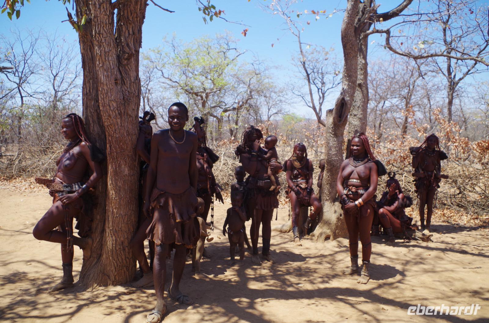 Alle haben gut geschlafen und freuen sich auf einen entspannten Ausflug ins Himabland. In dieser Region leben Himbas, Hereros sowie die aus Angola stammenden Zemba. Himbas und Hereros stammen aus der gleichen Volksgruppe. Bei der Wanderung der Bantuvölker trennten sich dann ihre Wege. Während die Himbas gen Nordwesten wanderten, sind die Hereros weiter nach Süden gegangen. Später sind wir am Dorf der Ovahimba angekommen. Es ist ein richtiges Dorf, aber auch ein sogenanntes lebendes Museum. Neugierig begrüßt man uns - wir sind willkommen! Chief des Dorfes ist Robert, der sich extra europäisch für uns schick gemacht hat. Er begrüßt uns im guten englisch. Sein Vater ist Herero und seine Mutter Himba, deshalb sind sie alle relativ groß gewachsen. Der Dorfälteste und viele Männer sind nicht anwesend, denn sie sind zu Trauerfeierlichkeiten in ein weit entferntes Dorf aufgebrochen oder hüten draußen die Rinder. Moro, Moro, periwi? Naua, okukepa! Das heißt soviel wie: Hallo, wie geht es Dir? Danke, gut. Robert erklärt uns wie die Himbas traditionell leben, so fast ohne die moderne Welt. Für uns fremd und unvorstellbar. Doch das Eis zwischen den Kulturen ist schnell gebrochen. Trotz Sprachdefiziten kommt man sich näher. Kein Wunder! Uns faszinieren sofort die künstlerischen Haartrachten der Frauen. Hübsche Gesichter lächeln uns entgegen. Ja, gutes Aussehen ist auch für die Himba-Frauen wichtig. So erkennt man beispielsweise an den Frisuren das Alter und den Familienstand und am Schmuck der Frauen, besonders an den Füßen, ob man bereits Kinder sie bereits zur Welt gebracht haben. Uns wird alles gezeigt und erklärt und wir dürfen auch fotografieren. Was mir sofort auffällt, sind die glücklichen Gesichter. Eine junge Mutter scherzt mit ihrem Baby - kleine Kinder spielen im Schatten der Lehmhütte und streiten sich natürlich auch mal ein wenig dabei..... Der heilige Kraal steht in der Mitte des Dorfes, kleine Kälber springen herum. Ein Rinderhirt bläst auf einem Kuduhorn eine Melodie. Fast scheint es, als ob er den Kälbchen ein Ständchen bringt. Uns wird erklärt, dass es wichtig ist, die Kälber an diese spezielle Melodie zu gewöhnen, um zurück zu finden, falls sie sich mal verlaufen. Man zeigt uns die Dorfküche und wie Maismehl mit einem Stein zermahlen wird. Das ist Aufgabe der Frauen, doch Robert kann das auch und schneller. Zwischen Kraal und der Chief-Hütte brennt das Heilige Feuer, diese imaginäre Linie darf nicht übertreten werden. Wir werden eingeladen, die Lehmhütte zu betreten und finden alle zusammen Platz. Die Frauen zeigen uns, wie sie sich pflegen, Wasser dürfen sie nicht benutzen. Typisch auch deren die rote Färbung der Haut, die durch das Einreiben mit einem eisenhaltigen Steinmehl und Butterfett (heute Vaseline) entsteht. Die Hauptfrau hat Klein-Himba-Elvis auf dem Schoss, der uns mit leuchtenden Augen anschaut. Annett darf das stählerne Röckchen anziehen, was einem Keuchheitsgürtel aus dem Mittelalter ähnelt. Zum Schluß Singen und Tanzen die Himbas für uns, eine ganz private Veranstaltung, nur für uns. Das scheint ihnen besonders großen Spaß zu machen und uns natürlich auch. Jedes Lied, jeder Tanz hat eine Bedeutung und ist einem besonderen Anlass gewidmet. Manchmal können Männer und Frauen zusammen tanzen und singen, manchmal ist es nur den Frauen vorbehalten. Nach fast 3 h verabschieden wir uns herzlich bei den freundlichen Himbas. Nach jedem Besuch bei den Himbas hoffe ich, dass dieses liebenswerte Urvolk noch lange so, in seinen Traditionen leben kann und ihnen durch die moderne Welt ihre Lebensgrundlage nicht entzogen wird. Danach fahren wir zu unserer schönen Lodge zurück und genießen den weiteren Nachmittag. Zum Abendessen wird heute gegrillt - hier nennt man es Braai. Das Wildfleisch ist saftig und die Bratwürste schmecken himmlich, auch der Sonnenuntergang ist wieder wunderschön! - Tagesetappe: 96 km