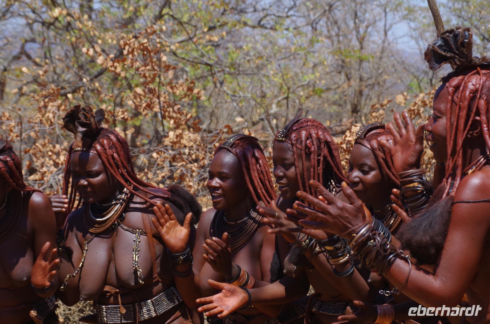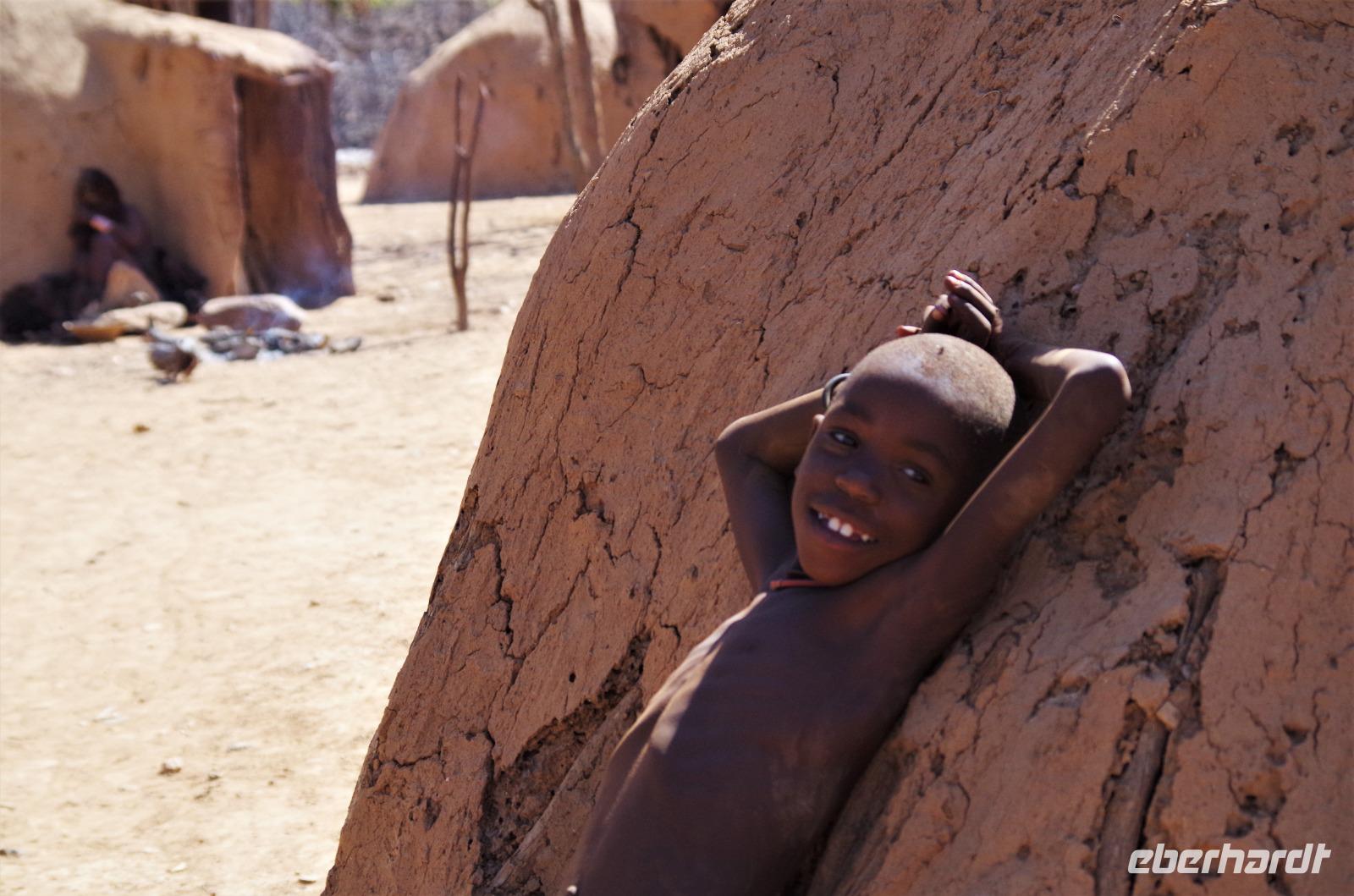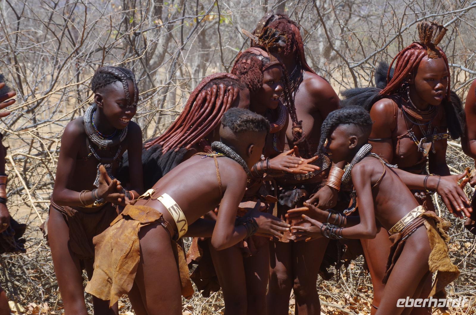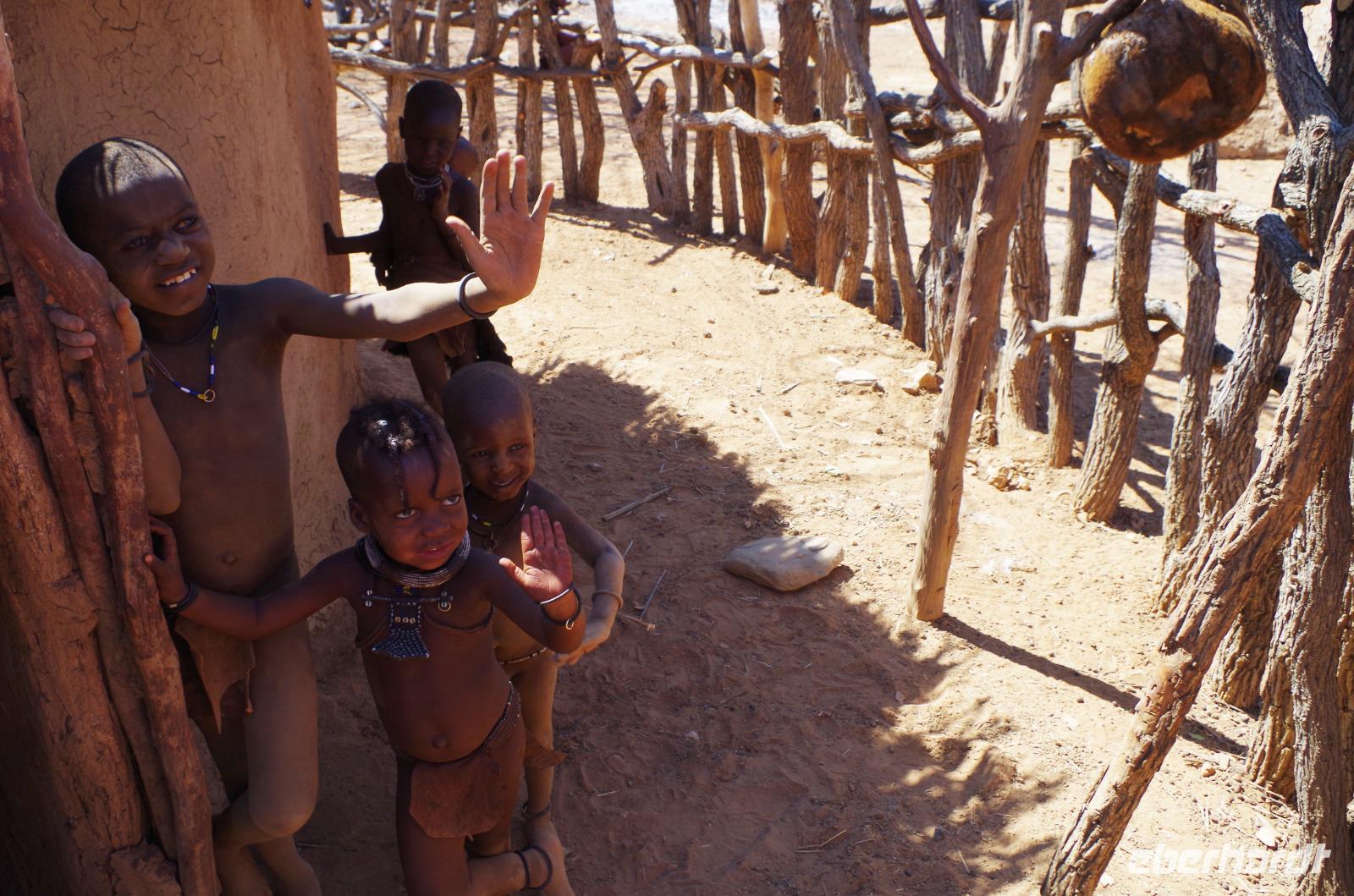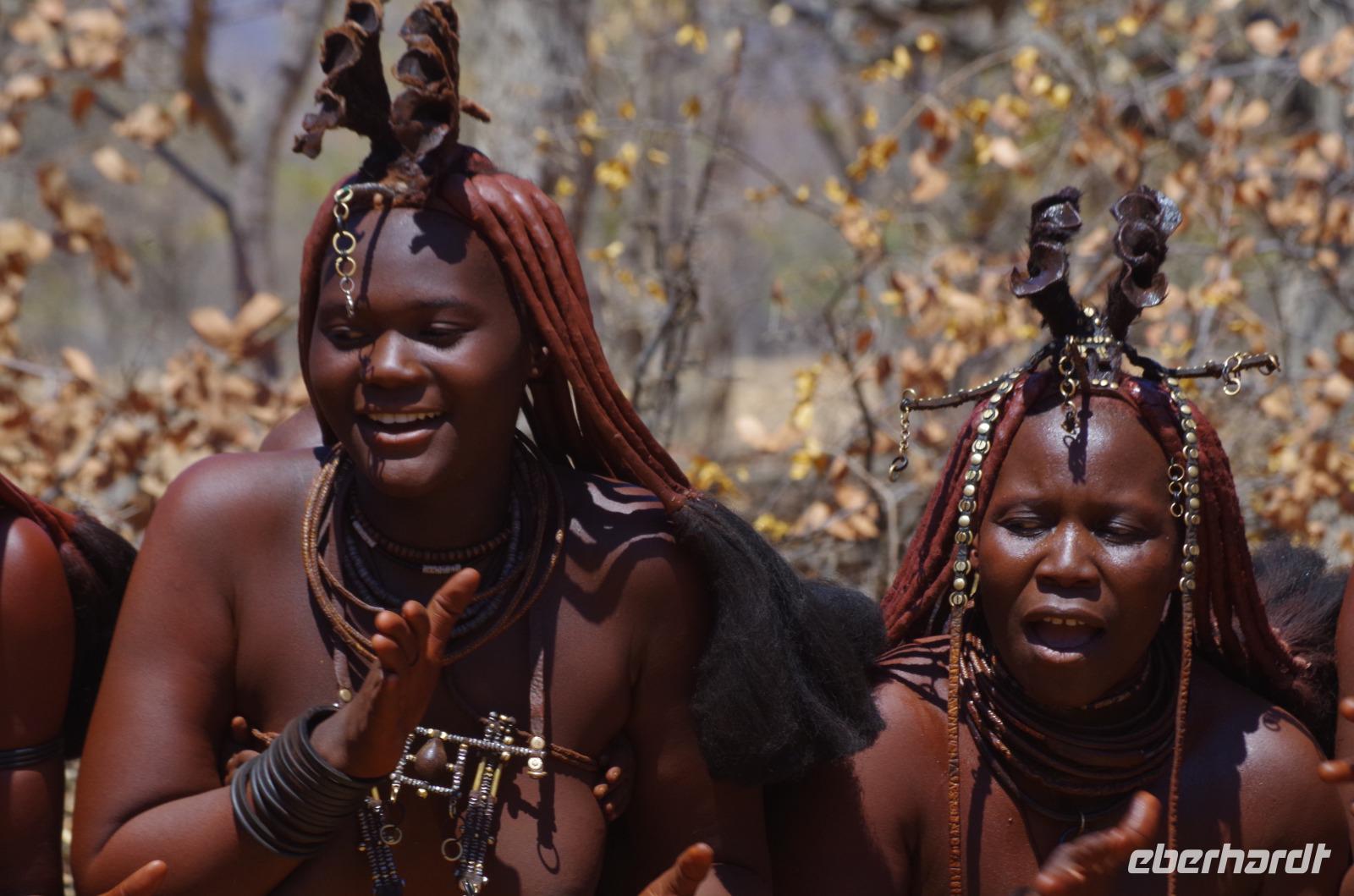 Alle haben gut geschlafen und freuen sich auf einen entspannten Ausflug ins Himabland. In dieser Region leben Himbas, Hereros sowie die aus Angola stammenden Zemba. Himbas und Hereros stammen aus der gleichen Volksgruppe. Bei der Wanderung der Bantuvölker trennten sich dann ihre Wege. Während die Himbas gen Nordwesten wanderten, sind die Hereros weiter nach Süden gegangen. Später sind wir am Dorf der Ovahimba angekommen. Es ist ein richtiges Dorf, aber auch ein sogenanntes lebendes Museum. Neugierig begrüßt man uns - wir sind willkommen! Chief des Dorfes ist Robert, der sich extra europäisch für uns schick gemacht hat. Er begrüßt uns im guten englisch. Sein Vater ist Herero und seine Mutter Himba, deshalb sind sie alle relativ groß gewachsen. Der Dorfälteste und viele Männer sind nicht anwesend, denn sie sind zu Trauerfeierlichkeiten in ein weit entferntes Dorf aufgebrochen oder hüten draußen die Rinder. Moro, Moro, periwi? Naua, okukepa! Das heißt soviel wie: Hallo, wie geht es Dir? Danke, gut. Robert erklärt uns wie die Himbas traditionell leben, so fast ohne die moderne Welt. Für uns fremd und unvorstellbar. Doch das Eis zwischen den Kulturen ist schnell gebrochen. Trotz Sprachdefiziten kommt man sich näher. Kein Wunder! Uns faszinieren sofort die künstlerischen Haartrachten der Frauen. Hübsche Gesichter lächeln uns entgegen. Ja, gutes Aussehen ist auch für die Himba-Frauen wichtig. So erkennt man beispielsweise an den Frisuren das Alter und den Familienstand und am Schmuck der Frauen, besonders an den Füßen, ob man bereits Kinder sie bereits zur Welt gebracht haben. Uns wird alles gezeigt und erklärt und wir dürfen auch fotografieren. Was mir sofort auffällt, sind die glücklichen Gesichter. Eine junge Mutter scherzt mit ihrem Baby - kleine Kinder spielen im Schatten der Lehmhütte und streiten sich natürlich auch mal ein wenig dabei..... Der heilige Kraal steht in der Mitte des Dorfes, kleine Kälber springen herum. Ein Rinderhirt bläst auf einem Kuduhorn eine Melodie. Fast scheint es, als ob er den Kälbchen ein Ständchen bringt. Uns wird erklärt, dass es wichtig ist, die Kälber an diese spezielle Melodie zu gewöhnen, um zurück zu finden, falls sie sich mal verlaufen. Man zeigt uns die Dorfküche und wie Maismehl mit einem Stein zermahlen wird. Das ist Aufgabe der Frauen, doch Robert kann das auch und schneller. Zwischen Kraal und der Chief-Hütte brennt das Heilige Feuer, diese imaginäre Linie darf nicht übertreten werden. Wir werden eingeladen, die Lehmhütte zu betreten und finden alle zusammen Platz. Die Frauen zeigen uns, wie sie sich pflegen, Wasser dürfen sie nicht benutzen. Typisch auch deren die rote Färbung der Haut, die durch das Einreiben mit einem eisenhaltigen Steinmehl und Butterfett (heute Vaseline) entsteht. Die Hauptfrau hat Klein-Himba-Elvis auf dem Schoss, der uns mit leuchtenden Augen anschaut. Annett darf das stählerne Röckchen anziehen, was einem Keuchheitsgürtel aus dem Mittelalter ähnelt. Zum Schluß Singen und Tanzen die Himbas für uns, eine ganz private Veranstaltung, nur für uns. Das scheint ihnen besonders großen Spaß zu machen und uns natürlich auch. Jedes Lied, jeder Tanz hat eine Bedeutung und ist einem besonderen Anlass gewidmet. Manchmal können Männer und Frauen zusammen tanzen und singen, manchmal ist es nur den Frauen vorbehalten. Nach fast 3 h verabschieden wir uns herzlich bei den freundlichen Himbas. Nach jedem Besuch bei den Himbas hoffe ich, dass dieses liebenswerte Urvolk noch lange so, in seinen Traditionen leben kann und ihnen durch die moderne Welt ihre Lebensgrundlage nicht entzogen wird. Danach fahren wir zu unserer schönen Lodge zurück und genießen den weiteren Nachmittag. Zum Abendessen wird heute gegrillt - hier nennt man es Braai. Das Wildfleisch ist saftig und die Bratwürste schmecken himmlich, auch der Sonnenuntergang ist wieder wunderschön! - Tagesetappe: 96 km