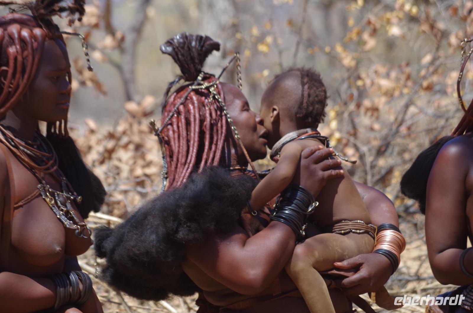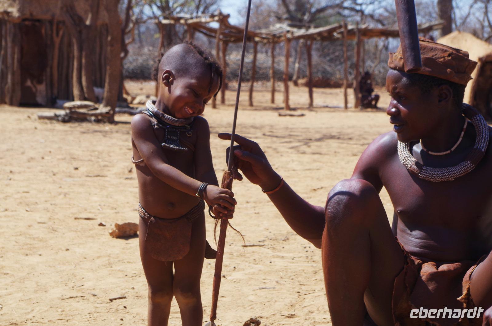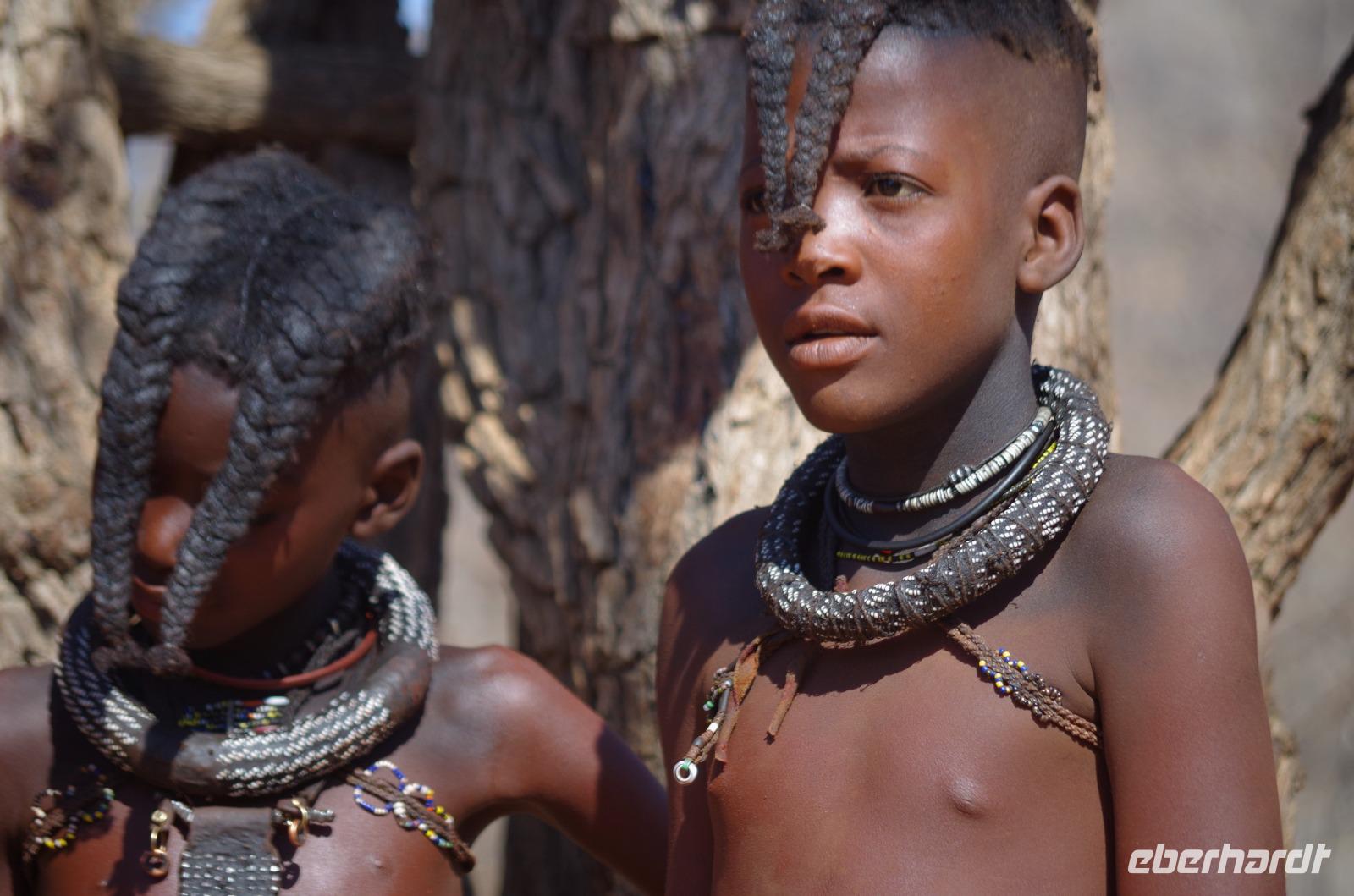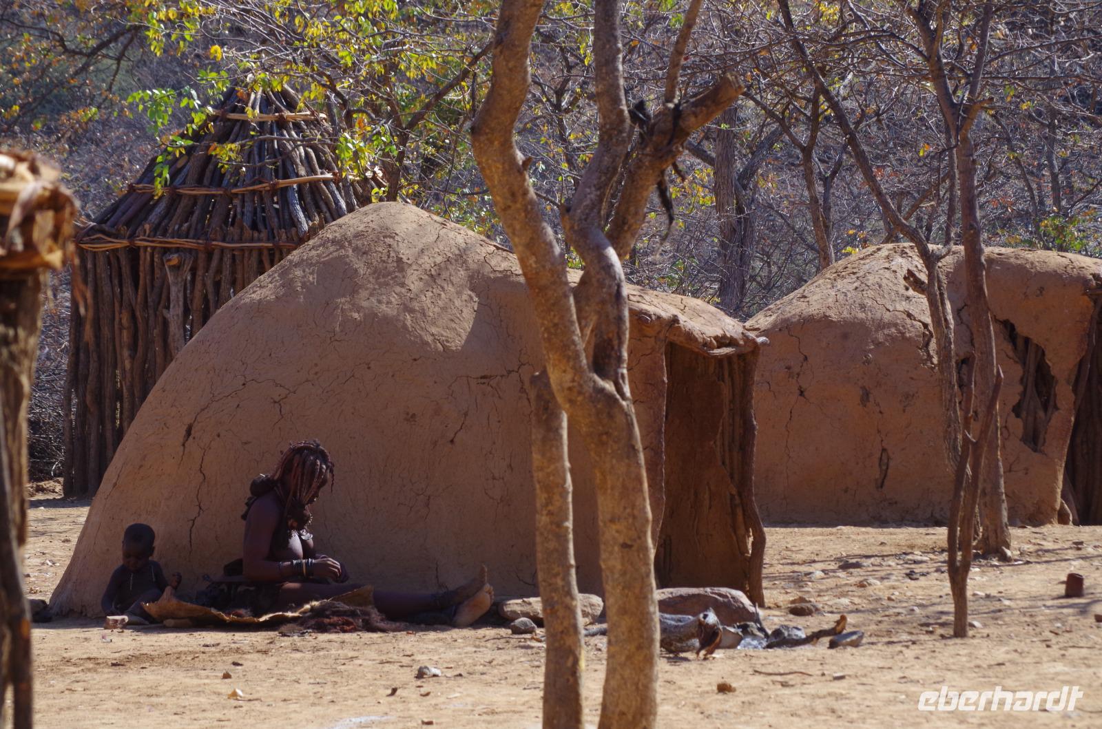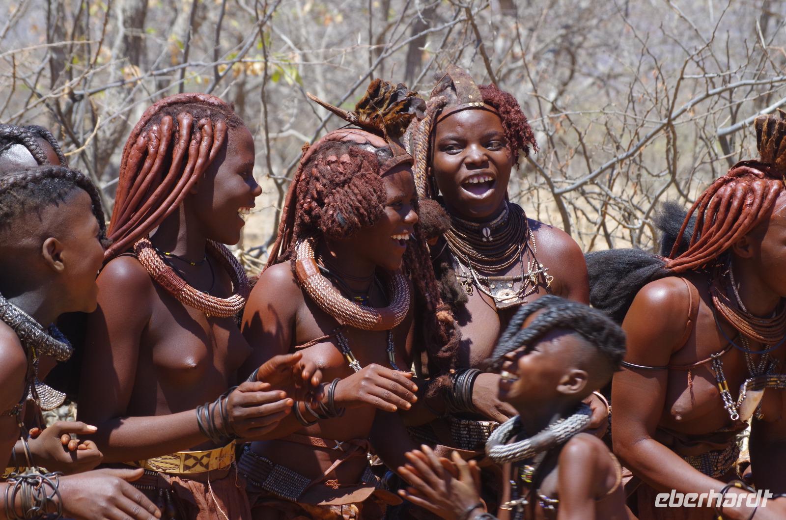 Alle haben gut geschlafen und freuen sich auf einen entspannten Ausflug ins Himabland. In dieser Region leben Himbas, Hereros sowie die aus Angola stammenden Zemba. Himbas und Hereros stammen aus der gleichen Volksgruppe. Bei der Wanderung der Bantuvölker trennten sich dann ihre Wege. Während die Himbas gen Nordwesten wanderten, sind die Hereros weiter nach Süden gegangen. Später sind wir am Dorf der Ovahimba angekommen. Es ist ein richtiges Dorf, aber auch ein sogenanntes lebendes Museum. Neugierig begrüßt man uns - wir sind willkommen! Chief des Dorfes ist Robert, der sich extra europäisch für uns schick gemacht hat. Er begrüßt uns im guten englisch. Sein Vater ist Herero und seine Mutter Himba, deshalb sind sie alle relativ groß gewachsen. Der Dorfälteste und viele Männer sind nicht anwesend, denn sie sind zu Trauerfeierlichkeiten in ein weit entferntes Dorf aufgebrochen oder hüten draußen die Rinder. Moro, Moro, periwi? Naua, okukepa! Das heißt soviel wie: Hallo, wie geht es Dir? Danke, gut. Robert erklärt uns wie die Himbas traditionell leben, so fast ohne die moderne Welt. Für uns fremd und unvorstellbar. Doch das Eis zwischen den Kulturen ist schnell gebrochen. Trotz Sprachdefiziten kommt man sich näher. Kein Wunder! Uns faszinieren sofort die künstlerischen Haartrachten der Frauen. Hübsche Gesichter lächeln uns entgegen. Ja, gutes Aussehen ist auch für die Himba-Frauen wichtig. So erkennt man beispielsweise an den Frisuren das Alter und den Familienstand und am Schmuck der Frauen, besonders an den Füßen, ob man bereits Kinder sie bereits zur Welt gebracht haben. Uns wird alles gezeigt und erklärt und wir dürfen auch fotografieren. Was mir sofort auffällt, sind die glücklichen Gesichter. Eine junge Mutter scherzt mit ihrem Baby - kleine Kinder spielen im Schatten der Lehmhütte und streiten sich natürlich auch mal ein wenig dabei..... Der heilige Kraal steht in der Mitte des Dorfes, kleine Kälber springen herum. Ein Rinderhirt bläst auf einem Kuduhorn eine Melodie. Fast scheint es, als ob er den Kälbchen ein Ständchen bringt. Uns wird erklärt, dass es wichtig ist, die Kälber an diese spezielle Melodie zu gewöhnen, um zurück zu finden, falls sie sich mal verlaufen. Man zeigt uns die Dorfküche und wie Maismehl mit einem Stein zermahlen wird. Das ist Aufgabe der Frauen, doch Robert kann das auch und schneller. Zwischen Kraal und der Chief-Hütte brennt das Heilige Feuer, diese imaginäre Linie darf nicht übertreten werden. Wir werden eingeladen, die Lehmhütte zu betreten und finden alle zusammen Platz. Die Frauen zeigen uns, wie sie sich pflegen, Wasser dürfen sie nicht benutzen. Typisch auch deren die rote Färbung der Haut, die durch das Einreiben mit einem eisenhaltigen Steinmehl und Butterfett (heute Vaseline) entsteht. Die Hauptfrau hat Klein-Himba-Elvis auf dem Schoss, der uns mit leuchtenden Augen anschaut. Annett darf das stählerne Röckchen anziehen, was einem Keuchheitsgürtel aus dem Mittelalter ähnelt. Zum Schluß Singen und Tanzen die Himbas für uns, eine ganz private Veranstaltung, nur für uns. Das scheint ihnen besonders großen Spaß zu machen und uns natürlich auch. Jedes Lied, jeder Tanz hat eine Bedeutung und ist einem besonderen Anlass gewidmet. Manchmal können Männer und Frauen zusammen tanzen und singen, manchmal ist es nur den Frauen vorbehalten. Nach fast 3 h verabschieden wir uns herzlich bei den freundlichen Himbas. Nach jedem Besuch bei den Himbas hoffe ich, dass dieses liebenswerte Urvolk noch lange so, in seinen Traditionen leben kann und ihnen durch die moderne Welt ihre Lebensgrundlage nicht entzogen wird. Danach fahren wir zu unserer schönen Lodge zurück und genießen den weiteren Nachmittag. Zum Abendessen wird heute gegrillt - hier nennt man es Braai. Das Wildfleisch ist saftig und die Bratwürste schmecken himmlich, auch der Sonnenuntergang ist wieder wunderschön! - Tagesetappe: 96 km
