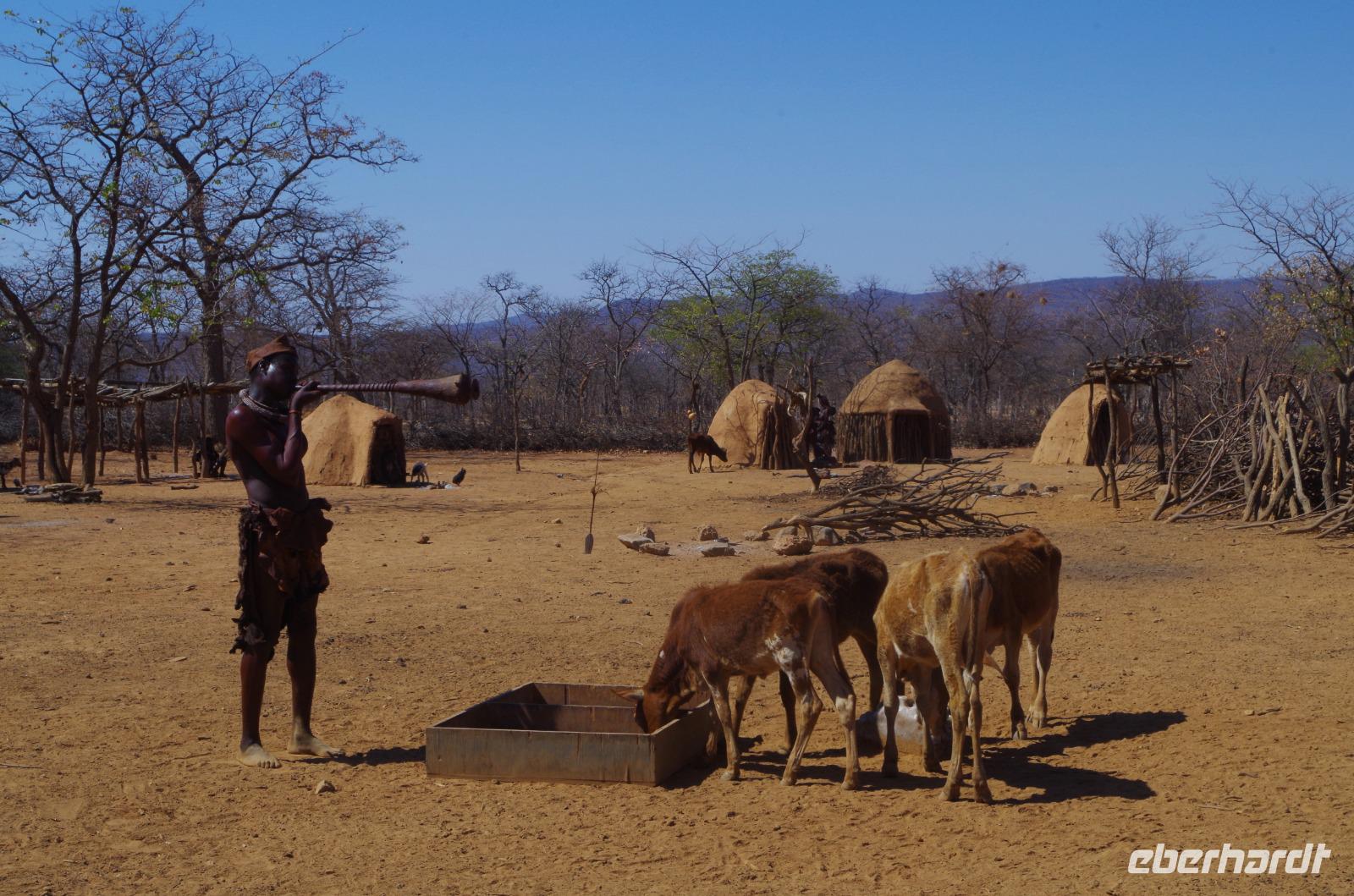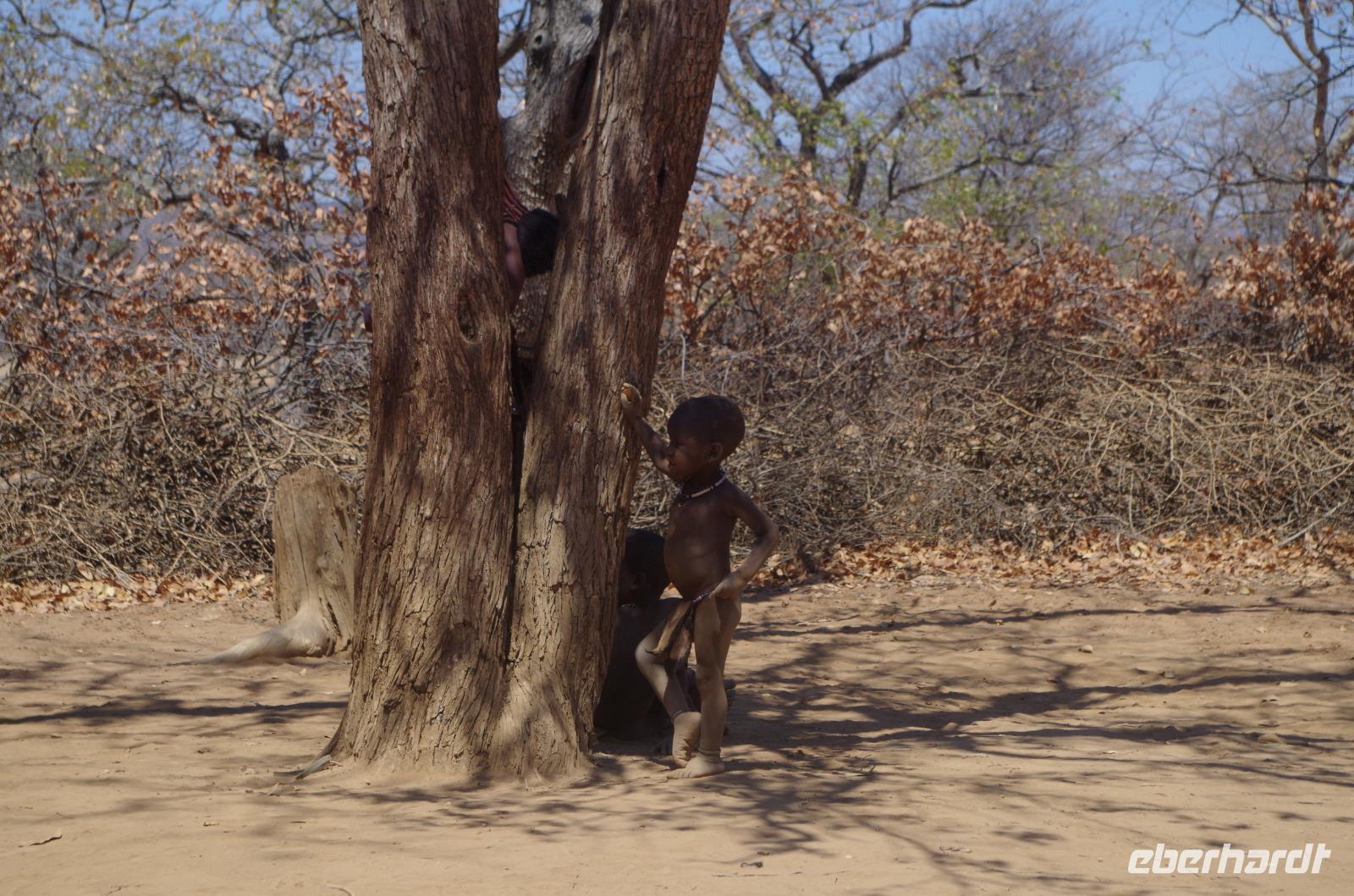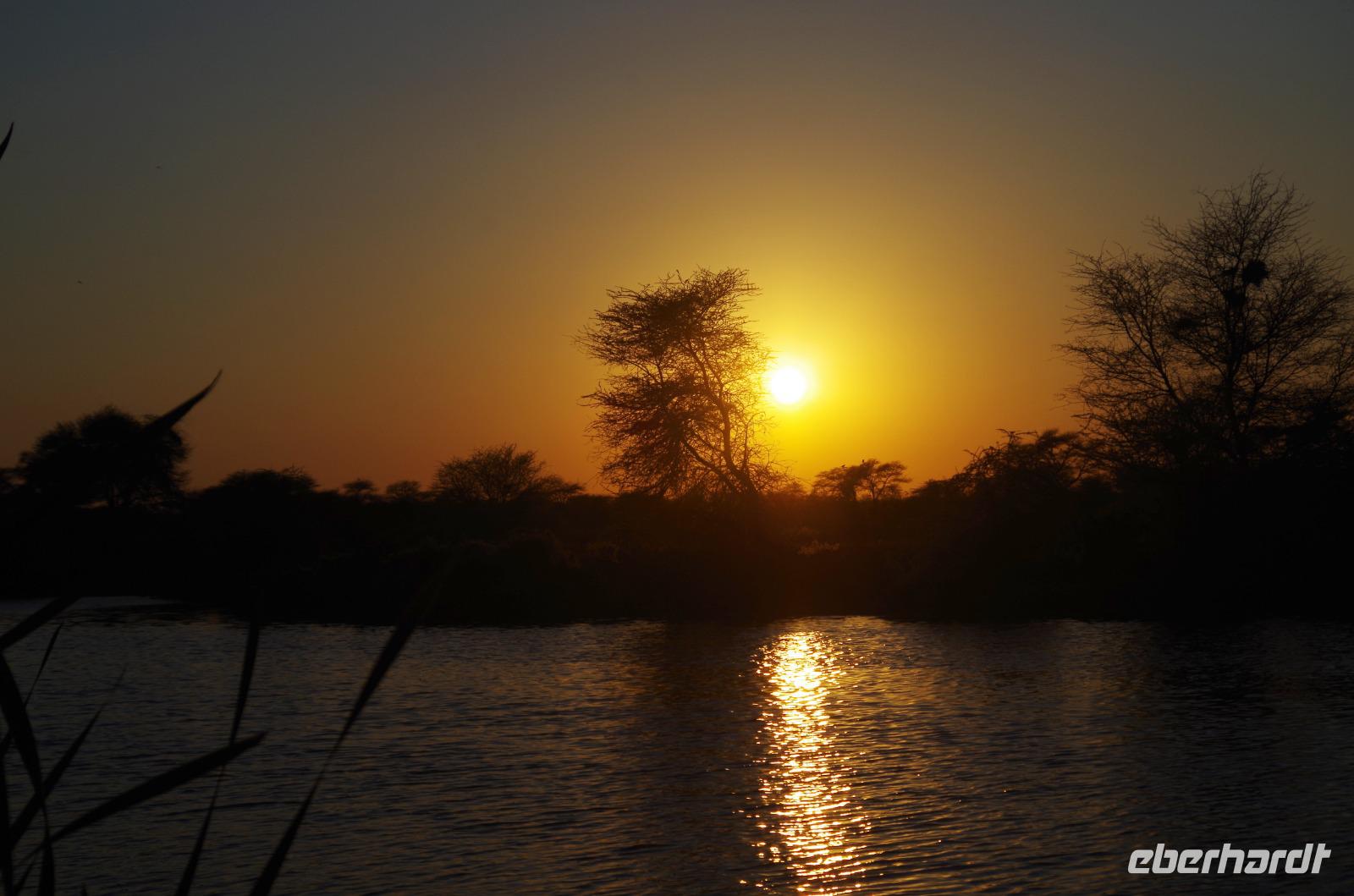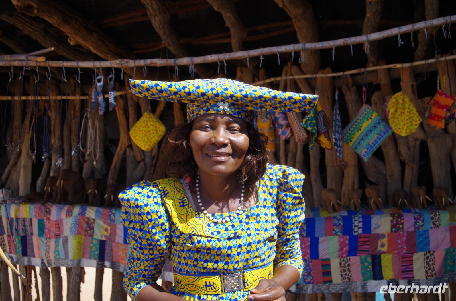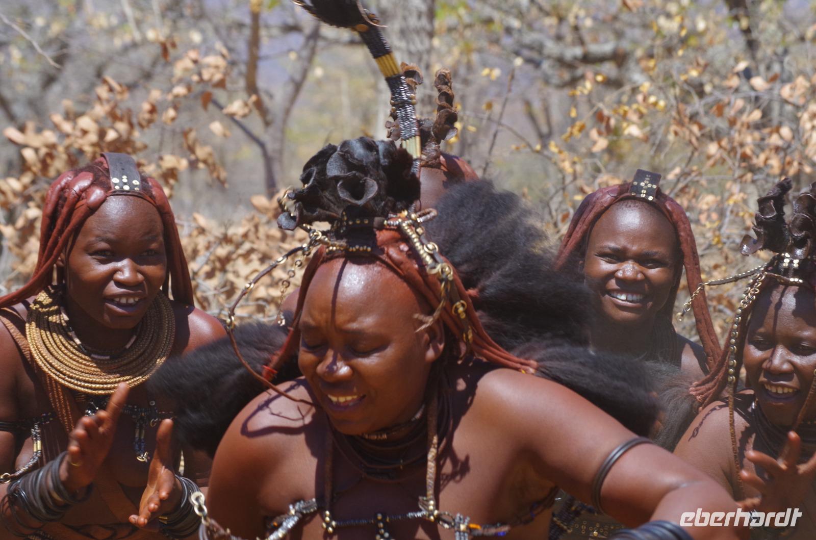 Alle haben gut geschlafen und freuen sich auf einen entspannten Ausflug ins Himabland. In dieser Region leben Himbas, Hereros sowie die aus Angola stammenden Zemba. Himbas und Hereros stammen aus der gleichen Volksgruppe. Bei der Wanderung der Bantuvölker trennten sich dann ihre Wege. Während die Himbas gen Nordwesten wanderten, sind die Hereros weiter nach Süden gegangen. Später sind wir am Dorf der Ovahimba angekommen. Es ist ein richtiges Dorf, aber auch ein sogenanntes lebendes Museum. Neugierig begrüßt man uns - wir sind willkommen! Chief des Dorfes ist Robert, der sich extra europäisch für uns schick gemacht hat. Er begrüßt uns im guten englisch. Sein Vater ist Herero und seine Mutter Himba, deshalb sind sie alle relativ groß gewachsen. Der Dorfälteste und viele Männer sind nicht anwesend, denn sie sind zu Trauerfeierlichkeiten in ein weit entferntes Dorf aufgebrochen oder hüten draußen die Rinder. Moro, Moro, periwi? Naua, okukepa! Das heißt soviel wie: Hallo, wie geht es Dir? Danke, gut. Robert erklärt uns wie die Himbas traditionell leben, so fast ohne die moderne Welt. Für uns fremd und unvorstellbar. Doch das Eis zwischen den Kulturen ist schnell gebrochen. Trotz Sprachdefiziten kommt man sich näher. Kein Wunder! Uns faszinieren sofort die künstlerischen Haartrachten der Frauen. Hübsche Gesichter lächeln uns entgegen. Ja, gutes Aussehen ist auch für die Himba-Frauen wichtig. So erkennt man beispielsweise an den Frisuren das Alter und den Familienstand und am Schmuck der Frauen, besonders an den Füßen, ob man bereits Kinder sie bereits zur Welt gebracht haben. Uns wird alles gezeigt und erklärt und wir dürfen auch fotografieren. Was mir sofort auffällt, sind die glücklichen Gesichter. Eine junge Mutter scherzt mit ihrem Baby - kleine Kinder spielen im Schatten der Lehmhütte und streiten sich natürlich auch mal ein wenig dabei..... Der heilige Kraal steht in der Mitte des Dorfes, kleine Kälber springen herum. Ein Rinderhirt bläst auf einem Kuduhorn eine Melodie. Fast scheint es, als ob er den Kälbchen ein Ständchen bringt. Uns wird erklärt, dass es wichtig ist, die Kälber an diese spezielle Melodie zu gewöhnen, um zurück zu finden, falls sie sich mal verlaufen. Man zeigt uns die Dorfküche und wie Maismehl mit einem Stein zermahlen wird. Das ist Aufgabe der Frauen, doch Robert kann das auch und schneller. Zwischen Kraal und der Chief-Hütte brennt das Heilige Feuer, diese imaginäre Linie darf nicht übertreten werden. Wir werden eingeladen, die Lehmhütte zu betreten und finden alle zusammen Platz. Die Frauen zeigen uns, wie sie sich pflegen, Wasser dürfen sie nicht benutzen. Typisch auch deren die rote Färbung der Haut, die durch das Einreiben mit einem eisenhaltigen Steinmehl und Butterfett (heute Vaseline) entsteht. Die Hauptfrau hat Klein-Himba-Elvis auf dem Schoss, der uns mit leuchtenden Augen anschaut. Annett darf das stählerne Röckchen anziehen, was einem Keuchheitsgürtel aus dem Mittelalter ähnelt. Zum Schluß Singen und Tanzen die Himbas für uns, eine ganz private Veranstaltung, nur für uns. Das scheint ihnen besonders großen Spaß zu machen und uns natürlich auch. Jedes Lied, jeder Tanz hat eine Bedeutung und ist einem besonderen Anlass gewidmet. Manchmal können Männer und Frauen zusammen tanzen und singen, manchmal ist es nur den Frauen vorbehalten. Nach fast 3 h verabschieden wir uns herzlich bei den freundlichen Himbas. Nach jedem Besuch bei den Himbas hoffe ich, dass dieses liebenswerte Urvolk noch lange so, in seinen Traditionen leben kann und ihnen durch die moderne Welt ihre Lebensgrundlage nicht entzogen wird. Danach fahren wir zu unserer schönen Lodge zurück und genießen den weiteren Nachmittag. Zum Abendessen wird heute gegrillt - hier nennt man es Braai. Das Wildfleisch ist saftig und die Bratwürste schmecken himmlich, auch der Sonnenuntergang ist wieder wunderschön! - Tagesetappe: 96 km