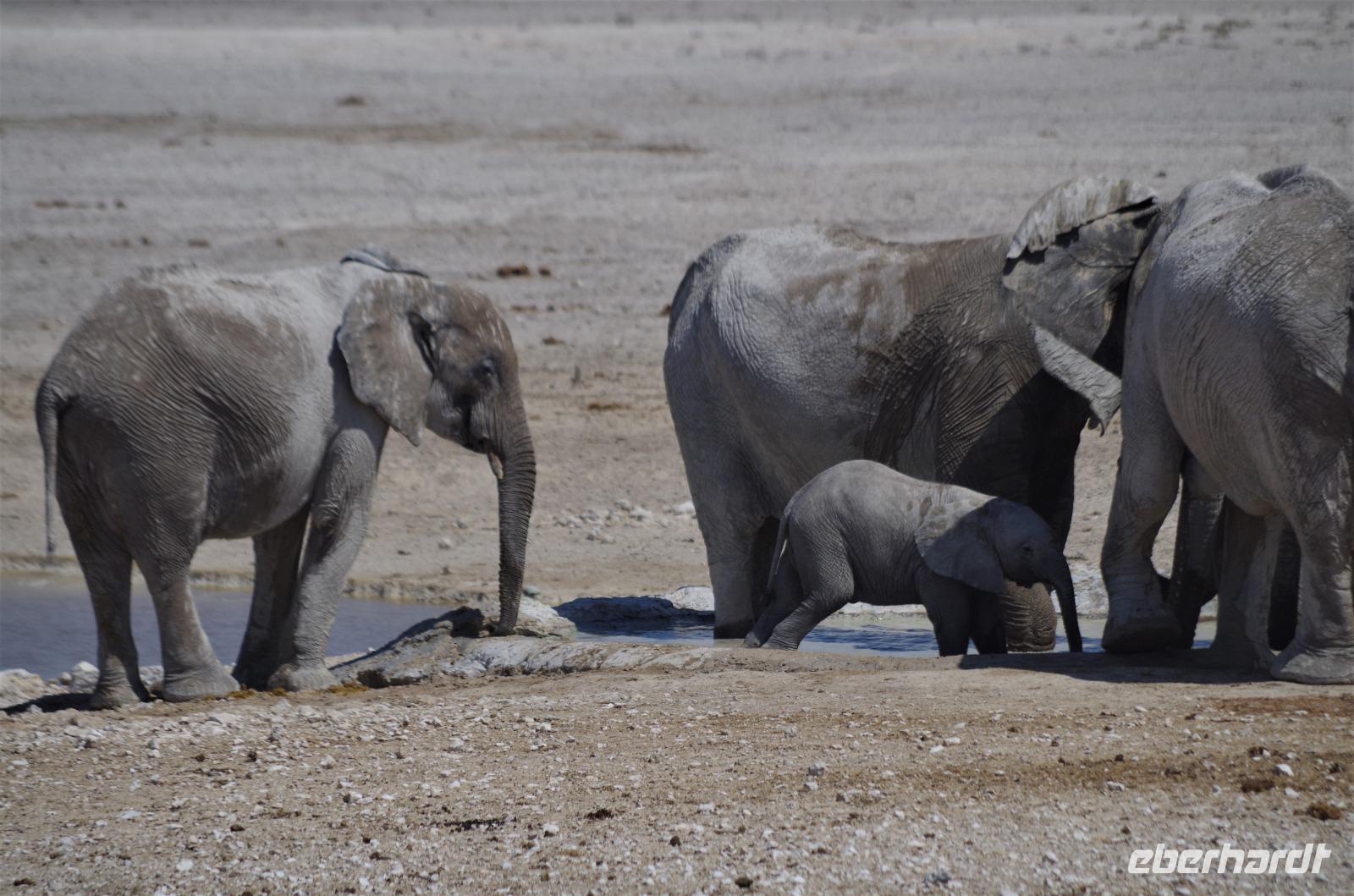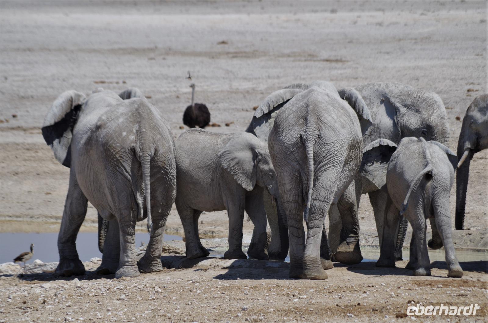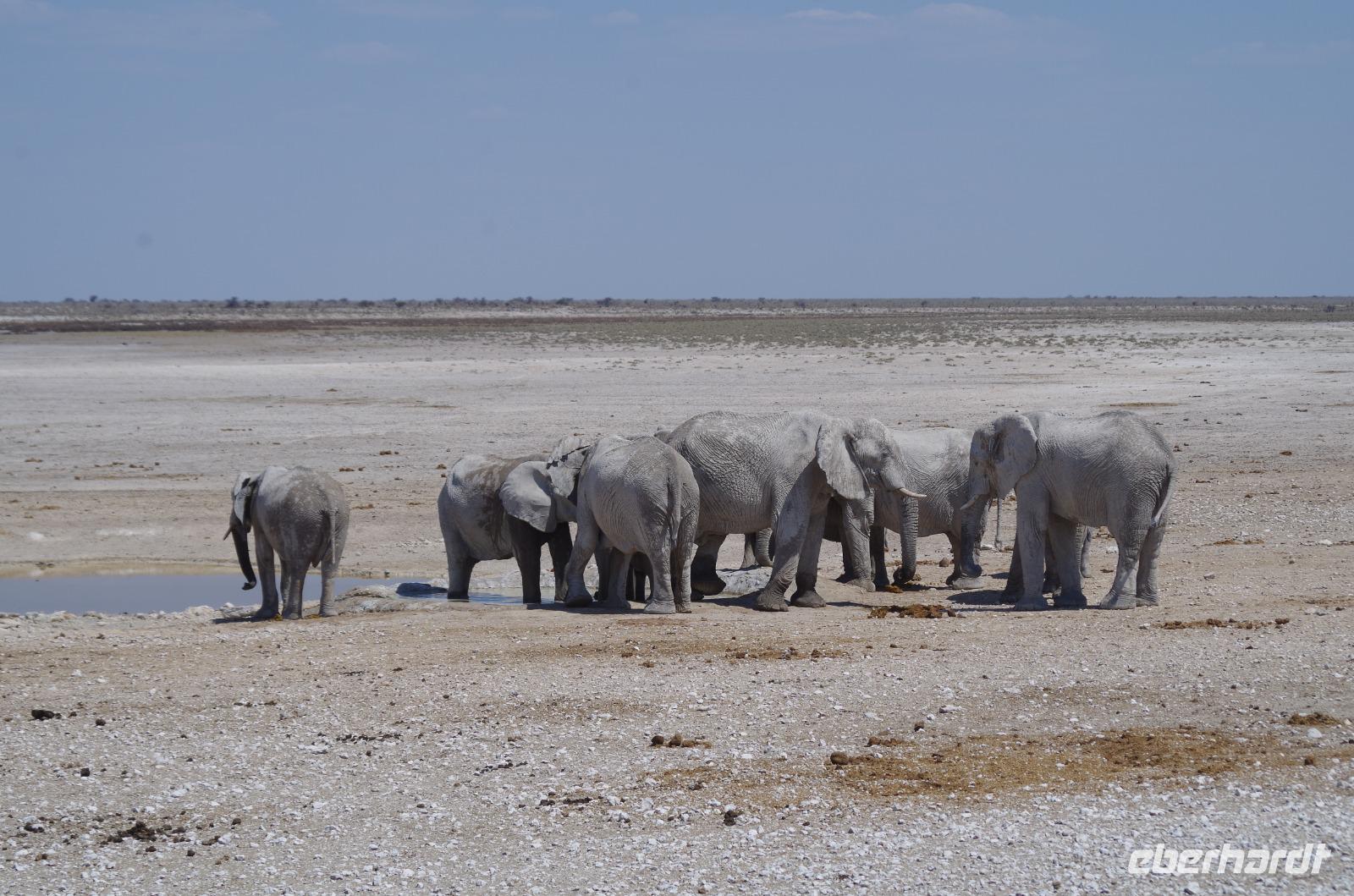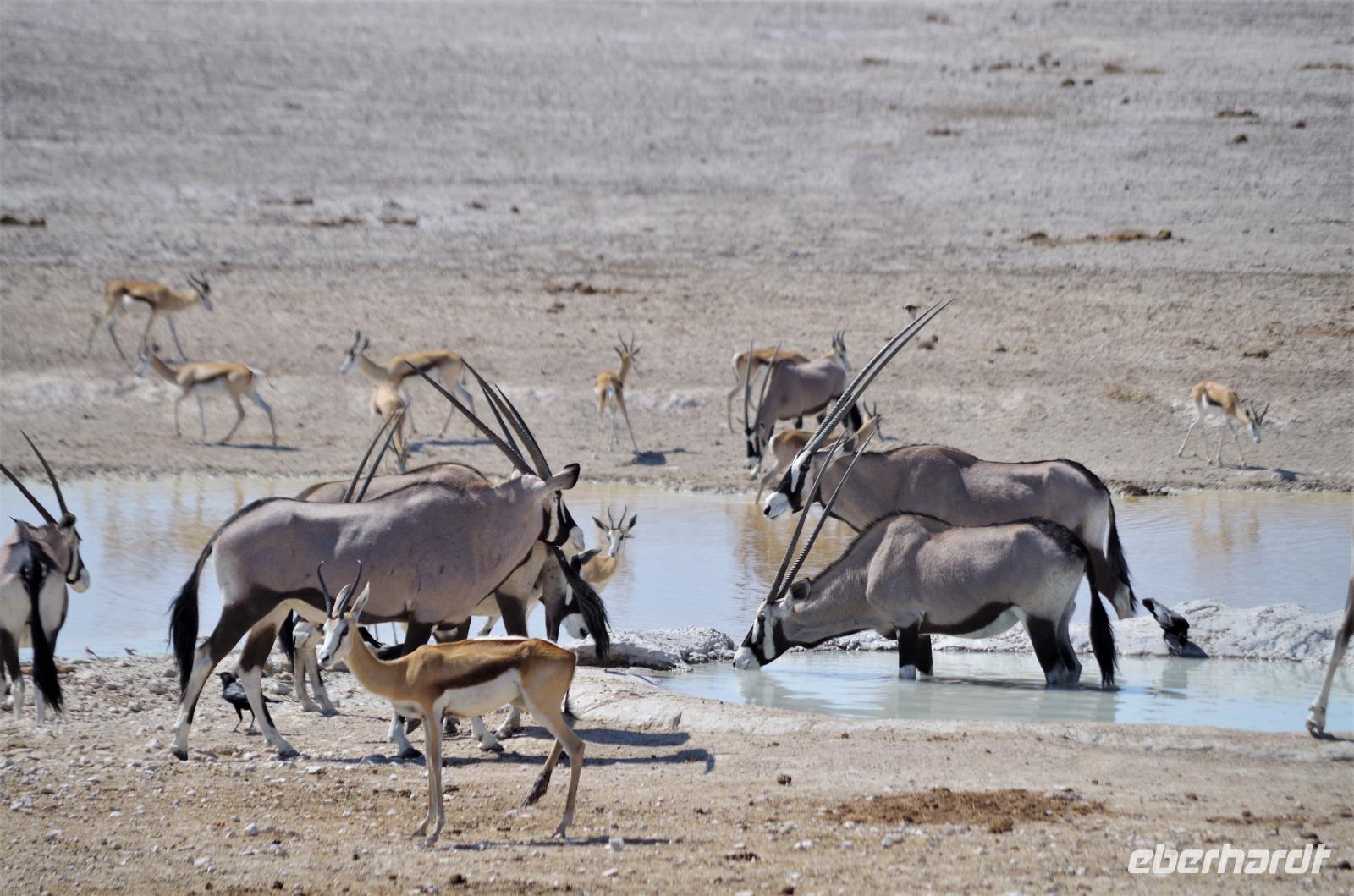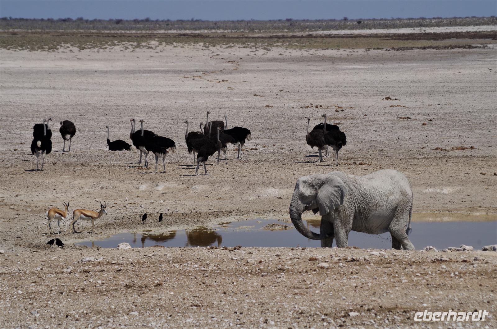 Etosha Nationalpark, wir kommen! Nach einer kurzen und warmen Nacht verließen wir unseren Berg und fuhren zum Anderson-Gate, einem der Eingangstore in den Etosha Nationalpark. Auch heute war es wieder heiß und die Temperaturen erreichten fast wieder magische Werte. Der Etosha war sehr trocken, alles grau und das Gras vertrocknet. Doch schienen die Tiere immer noch etwas zu fressen zu finden. Am ersten Wasserloch Ombika sahen wir Kudus und Sprinkböcke. Zebraherden zogen durch die Weite. Am Wasserloch Nebrowni angekommen, hofften wir auf Löwen. Doch die schienen sich bereits einen Schattenplatz gesucht zu haben. Dennoch gab es viel zu beobachten: stattliche Oryxe, Sprinkböckchen, Zebras und Strauße - eine große, tierrische Ansammlung. Ja, das ist der Vorteil während dieser Trockenheit. Viele Tiere müssen täglich an die Wasserlöcher, um zu trinken. Das ist überlebensnotwendig. Und um Energie zu sparen, halten sie sich den ganzen Tag meist in der Nähe auf. Wir pirschten also weiter zum nächsten Wasserloch. Die Sonne stieg höher und es wurde zunehmend heißer. Springböcke suchten bereits unter dürren, blattlosen Akazienbüschen nach etwas Schatten. Wir fuhren zum Rand der Etosha Pfanne und blickten fasziniert in die weite Weite. Bis zum Horizont nur weißer Sand - Etosha machten seinem Namen alle Ehre: ...großer weißer Platz.... Danach pirschten wir zum nächsten Wasserloch Gemsbokvlakte. Auch hier gaben sich wieder viele Tiere ein StellDichEin: jede Menge Springböcke, Strauße, Zebras und Schiraffen. Wir schauten begeistert zu, wie sich die Tiere am Wasserloch abwechselten. Auf steinigem, trockenen Gelände stolziert später ein Sekretär an uns vorbei. Doch wir hofften auf Elefanten, sahen wir doch überall deren Spuren. Und Fritz, unser Reiseleiter sollte Recht behalten. In den heißen Mittagsstunden kommen die Elefanten ans Wasserloch. Elefanten, Elefanten, Elefanten - juchhu! Ja, wir sahen viele graue, sanfte Riesen. Ein große Herde mit Babyfanten versammelte sich am Wasserloch. Wir betrachteten sie begeistert und mit einem Lächeln auf dem Gesicht. Die eine Herde ging und machte der nächsten Platz..... Eine Herde Gnus stand etwas abseits und wagte sich nicht ans besetzte Wasserloch. Nach einen Stopp in Camp Okaukuejo fuhren wir in unsere Lodge zurück. Tagesetappe: 215 km