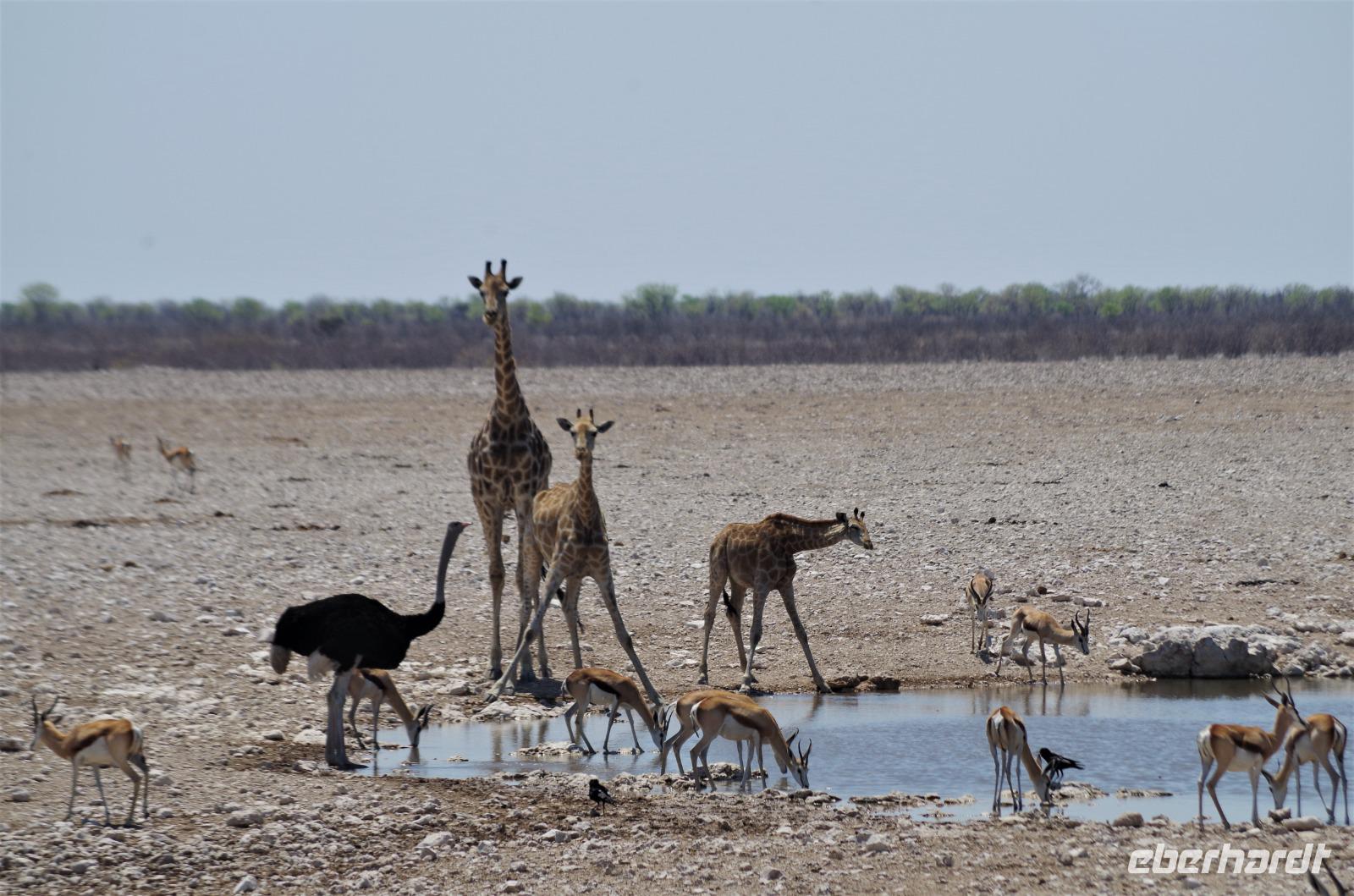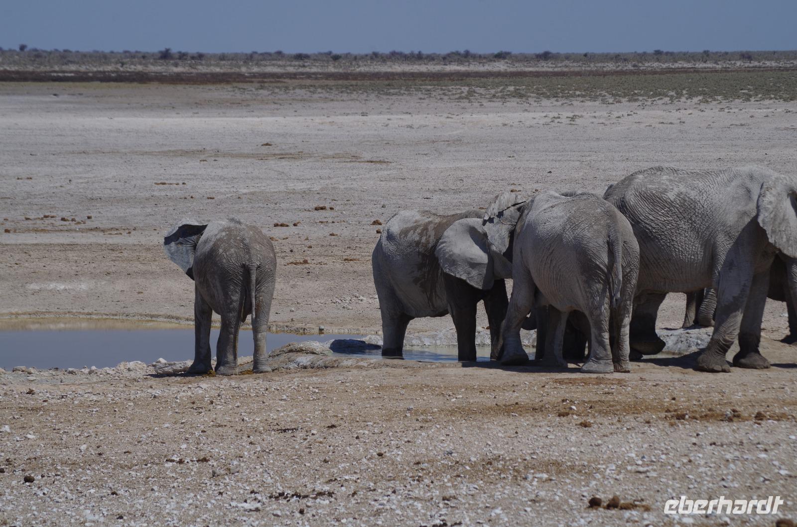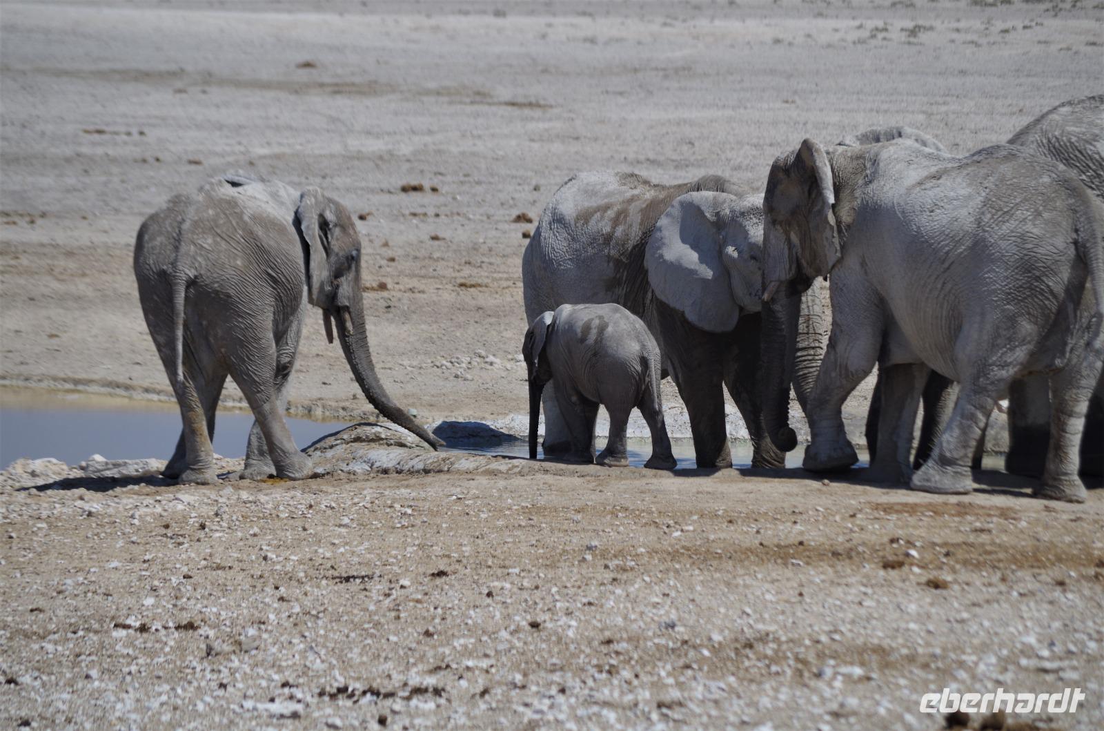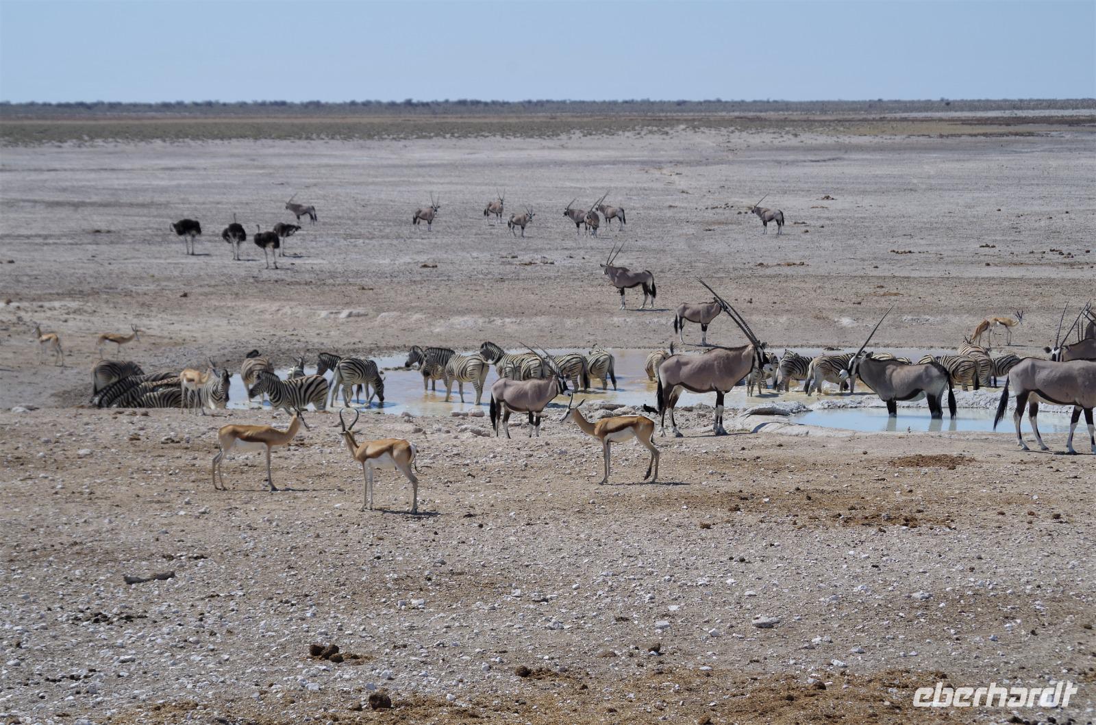 Etosha Nationalpark, wir kommen! Nach einer kurzen und warmen Nacht verließen wir unseren Berg und fuhren zum Anderson-Gate, einem der Eingangstore in den Etosha Nationalpark. Auch heute war es wieder heiß und die Temperaturen erreichten fast wieder magische Werte. Der Etosha war sehr trocken, alles grau und das Gras vertrocknet. Doch schienen die Tiere immer noch etwas zu fressen zu finden. Am ersten Wasserloch Ombika sahen wir Kudus und Sprinkböcke. Zebraherden zogen durch die Weite. Am Wasserloch Nebrowni angekommen, hofften wir auf Löwen. Doch die schienen sich bereits einen Schattenplatz gesucht zu haben. Dennoch gab es viel zu beobachten: stattliche Oryxe, Sprinkböckchen, Zebras und Strauße - eine große, tierrische Ansammlung. Ja, das ist der Vorteil während dieser Trockenheit. Viele Tiere müssen täglich an die Wasserlöcher, um zu trinken. Das ist überlebensnotwendig. Und um Energie zu sparen, halten sie sich den ganzen Tag meist in der Nähe auf. Wir pirschten also weiter zum nächsten Wasserloch. Die Sonne stieg höher und es wurde zunehmend heißer. Springböcke suchten bereits unter dürren, blattlosen Akazienbüschen nach etwas Schatten. Wir fuhren zum Rand der Etosha Pfanne und blickten fasziniert in die weite Weite. Bis zum Horizont nur weißer Sand - Etosha machten seinem Namen alle Ehre: ...großer weißer Platz.... Danach pirschten wir zum nächsten Wasserloch Gemsbokvlakte. Auch hier gaben sich wieder viele Tiere ein StellDichEin: jede Menge Springböcke, Strauße, Zebras und Schiraffen. Wir schauten begeistert zu, wie sich die Tiere am Wasserloch abwechselten. Auf steinigem, trockenen Gelände stolziert später ein Sekretär an uns vorbei. Doch wir hofften auf Elefanten, sahen wir doch überall deren Spuren. Und Fritz, unser Reiseleiter sollte Recht behalten. In den heißen Mittagsstunden kommen die Elefanten ans Wasserloch. Elefanten, Elefanten, Elefanten - juchhu! Ja, wir sahen viele graue, sanfte Riesen. Ein große Herde mit Babyfanten versammelte sich am Wasserloch. Wir betrachteten sie begeistert und mit einem Lächeln auf dem Gesicht. Die eine Herde ging und machte der nächsten Platz..... Eine Herde Gnus stand etwas abseits und wagte sich nicht ans besetzte Wasserloch. Nach einen Stopp in Camp Okaukuejo fuhren wir in unsere Lodge zurück. Tagesetappe: 215 km
