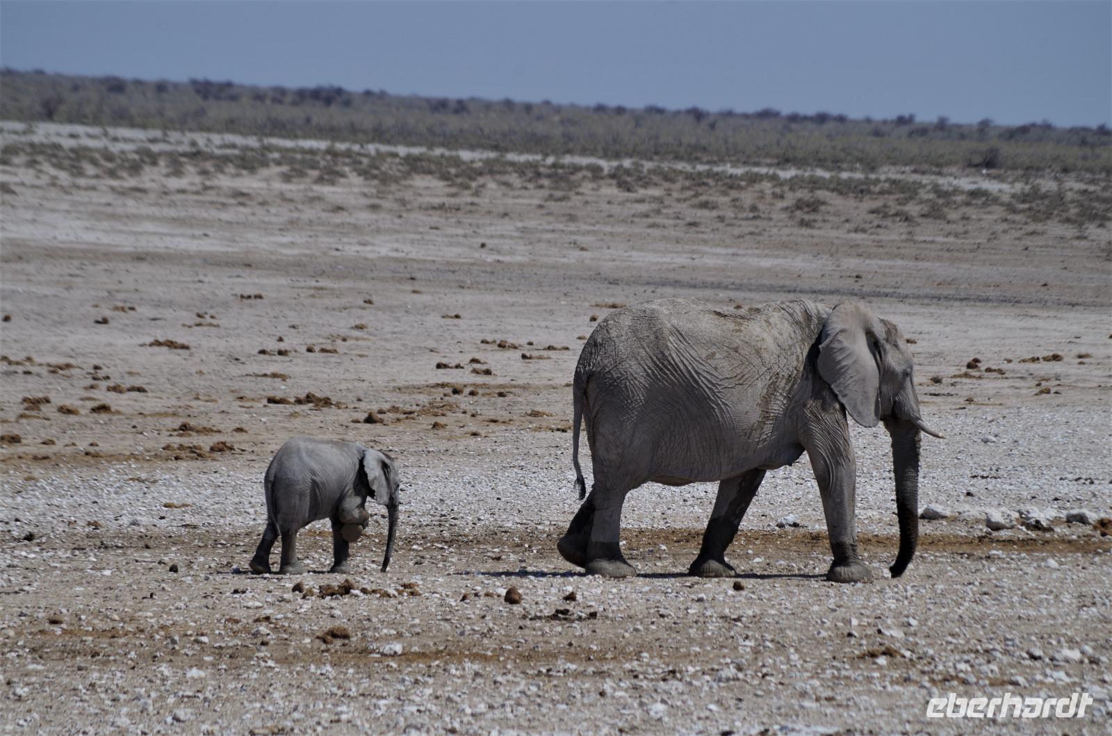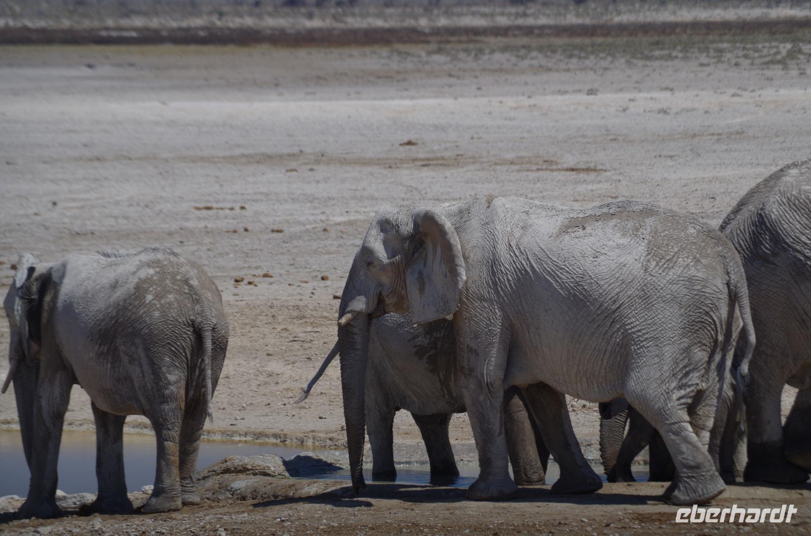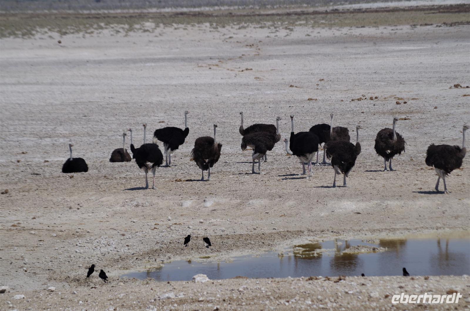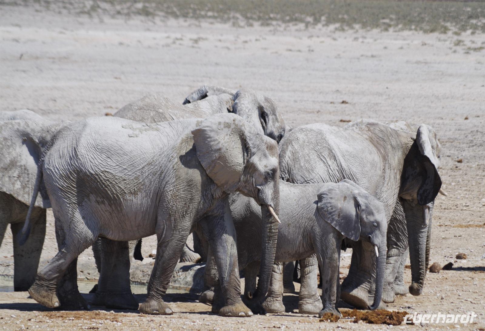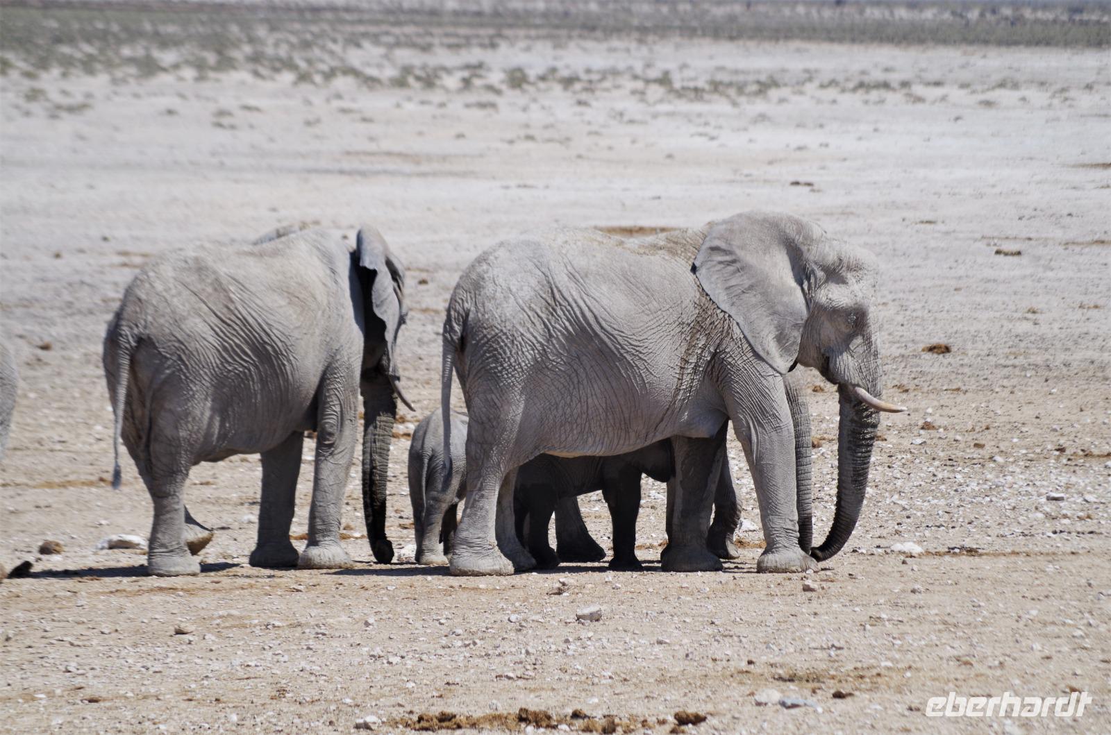 Etosha Nationalpark, wir kommen! Nach einer kurzen und warmen Nacht verließen wir unseren Berg und fuhren zum Anderson-Gate, einem der Eingangstore in den Etosha Nationalpark. Auch heute war es wieder heiß und die Temperaturen erreichten fast wieder magische Werte. Der Etosha war sehr trocken, alles grau und das Gras vertrocknet. Doch schienen die Tiere immer noch etwas zu fressen zu finden. Am ersten Wasserloch Ombika sahen wir Kudus und Sprinkböcke. Zebraherden zogen durch die Weite. Am Wasserloch Nebrowni angekommen, hofften wir auf Löwen. Doch die schienen sich bereits einen Schattenplatz gesucht zu haben. Dennoch gab es viel zu beobachten: stattliche Oryxe, Sprinkböckchen, Zebras und Strauße - eine große, tierrische Ansammlung. Ja, das ist der Vorteil während dieser Trockenheit. Viele Tiere müssen täglich an die Wasserlöcher, um zu trinken. Das ist überlebensnotwendig. Und um Energie zu sparen, halten sie sich den ganzen Tag meist in der Nähe auf. Wir pirschten also weiter zum nächsten Wasserloch. Die Sonne stieg höher und es wurde zunehmend heißer. Springböcke suchten bereits unter dürren, blattlosen Akazienbüschen nach etwas Schatten. Wir fuhren zum Rand der Etosha Pfanne und blickten fasziniert in die weite Weite. Bis zum Horizont nur weißer Sand - Etosha machten seinem Namen alle Ehre: ...großer weißer Platz.... Danach pirschten wir zum nächsten Wasserloch Gemsbokvlakte. Auch hier gaben sich wieder viele Tiere ein StellDichEin: jede Menge Springböcke, Strauße, Zebras und Schiraffen. Wir schauten begeistert zu, wie sich die Tiere am Wasserloch abwechselten. Auf steinigem, trockenen Gelände stolziert später ein Sekretär an uns vorbei. Doch wir hofften auf Elefanten, sahen wir doch überall deren Spuren. Und Fritz, unser Reiseleiter sollte Recht behalten. In den heißen Mittagsstunden kommen die Elefanten ans Wasserloch. Elefanten, Elefanten, Elefanten - juchhu! Ja, wir sahen viele graue, sanfte Riesen. Ein große Herde mit Babyfanten versammelte sich am Wasserloch. Wir betrachteten sie begeistert und mit einem Lächeln auf dem Gesicht. Die eine Herde ging und machte der nächsten Platz..... Eine Herde Gnus stand etwas abseits und wagte sich nicht ans besetzte Wasserloch. Nach einen Stopp in Camp Okaukuejo fuhren wir in unsere Lodge zurück. Tagesetappe: 215 km