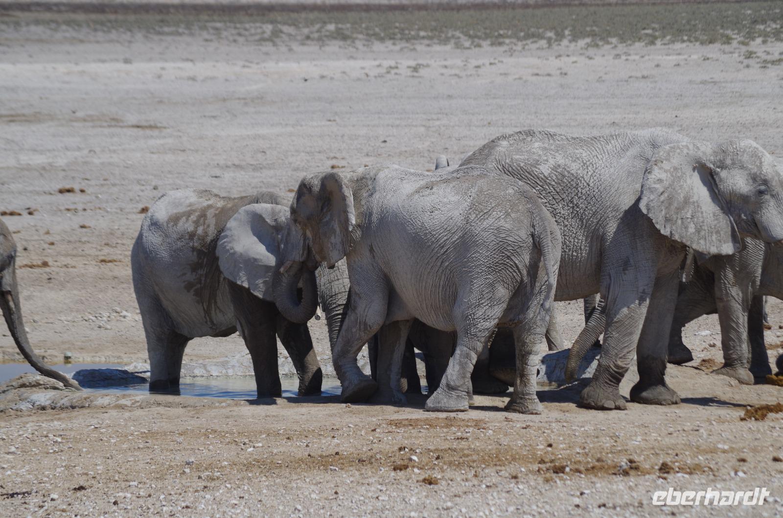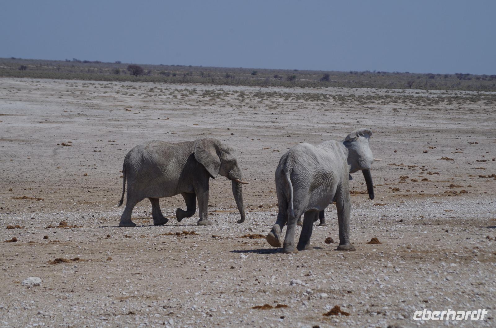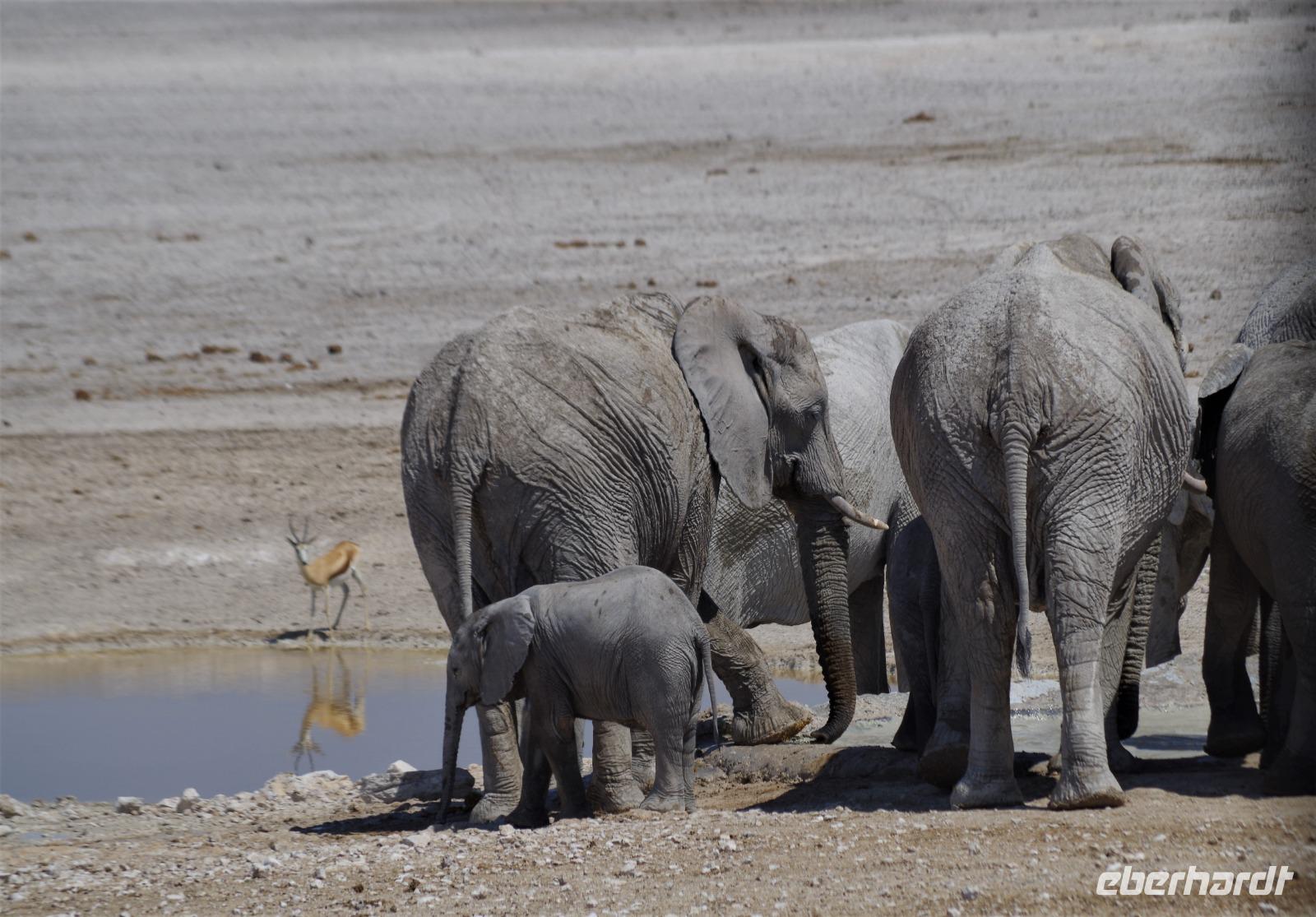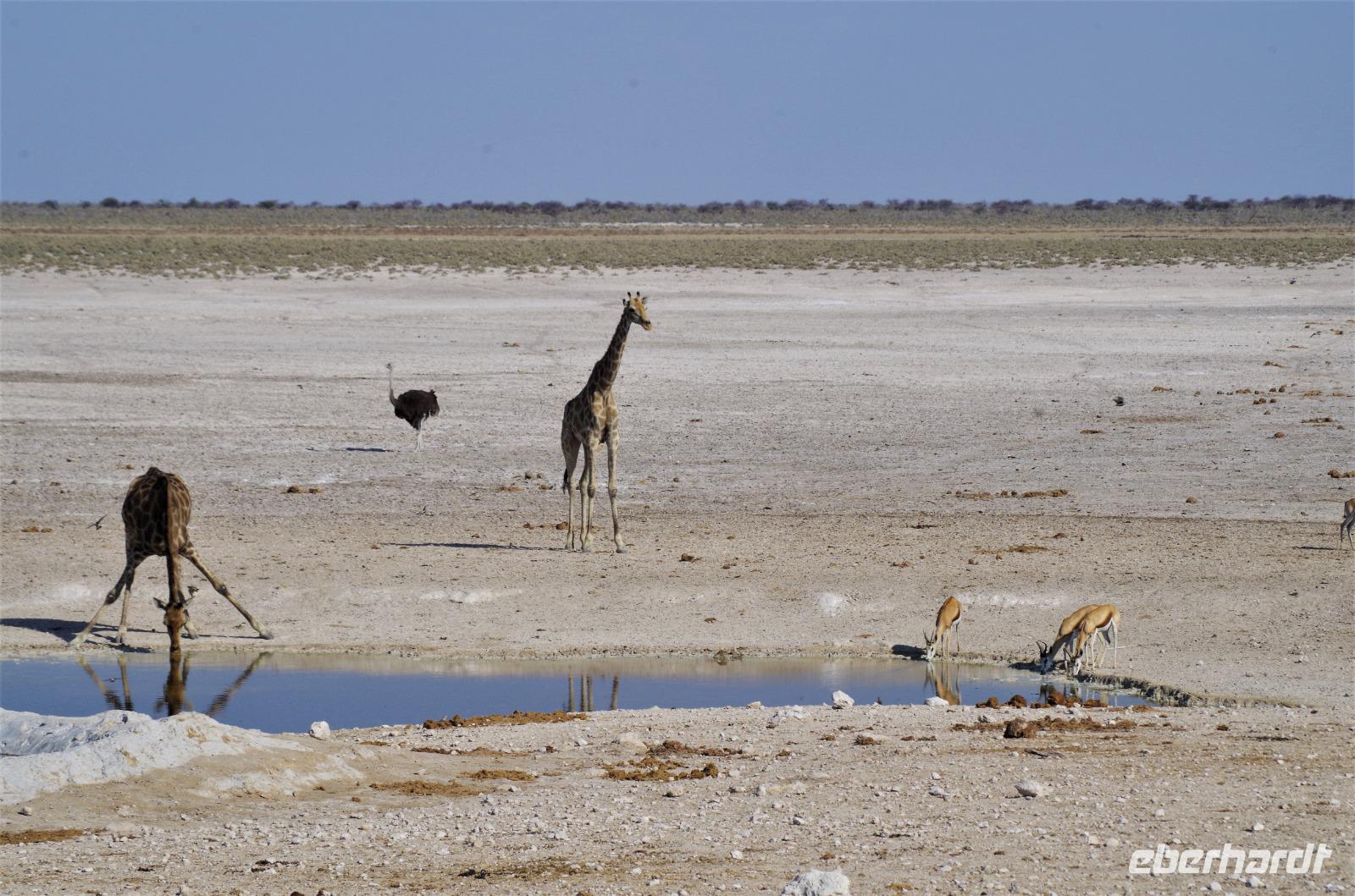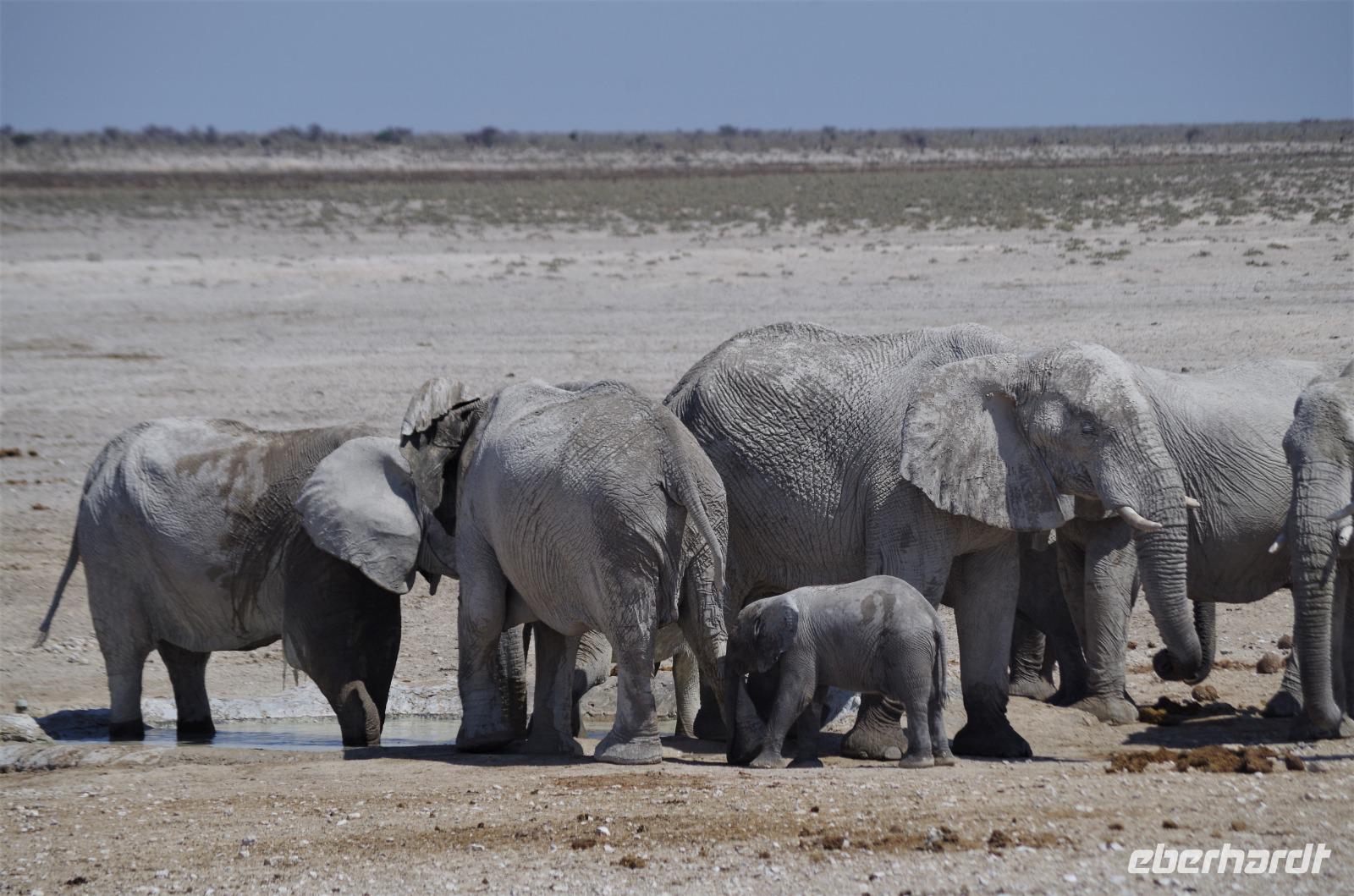 Etosha Nationalpark, wir kommen! Nach einer kurzen und warmen Nacht verließen wir unseren Berg und fuhren zum Anderson-Gate, einem der Eingangstore in den Etosha Nationalpark. Auch heute war es wieder heiß und die Temperaturen erreichten fast wieder magische Werte. Der Etosha war sehr trocken, alles grau und das Gras vertrocknet. Doch schienen die Tiere immer noch etwas zu fressen zu finden. Am ersten Wasserloch Ombika sahen wir Kudus und Sprinkböcke. Zebraherden zogen durch die Weite. Am Wasserloch Nebrowni angekommen, hofften wir auf Löwen. Doch die schienen sich bereits einen Schattenplatz gesucht zu haben. Dennoch gab es viel zu beobachten: stattliche Oryxe, Sprinkböckchen, Zebras und Strauße - eine große, tierrische Ansammlung. Ja, das ist der Vorteil während dieser Trockenheit. Viele Tiere müssen täglich an die Wasserlöcher, um zu trinken. Das ist überlebensnotwendig. Und um Energie zu sparen, halten sie sich den ganzen Tag meist in der Nähe auf. Wir pirschten also weiter zum nächsten Wasserloch. Die Sonne stieg höher und es wurde zunehmend heißer. Springböcke suchten bereits unter dürren, blattlosen Akazienbüschen nach etwas Schatten. Wir fuhren zum Rand der Etosha Pfanne und blickten fasziniert in die weite Weite. Bis zum Horizont nur weißer Sand - Etosha machten seinem Namen alle Ehre: ...großer weißer Platz.... Danach pirschten wir zum nächsten Wasserloch Gemsbokvlakte. Auch hier gaben sich wieder viele Tiere ein StellDichEin: jede Menge Springböcke, Strauße, Zebras und Schiraffen. Wir schauten begeistert zu, wie sich die Tiere am Wasserloch abwechselten. Auf steinigem, trockenen Gelände stolziert später ein Sekretär an uns vorbei. Doch wir hofften auf Elefanten, sahen wir doch überall deren Spuren. Und Fritz, unser Reiseleiter sollte Recht behalten. In den heißen Mittagsstunden kommen die Elefanten ans Wasserloch. Elefanten, Elefanten, Elefanten - juchhu! Ja, wir sahen viele graue, sanfte Riesen. Ein große Herde mit Babyfanten versammelte sich am Wasserloch. Wir betrachteten sie begeistert und mit einem Lächeln auf dem Gesicht. Die eine Herde ging und machte der nächsten Platz..... Eine Herde Gnus stand etwas abseits und wagte sich nicht ans besetzte Wasserloch. Nach einen Stopp in Camp Okaukuejo fuhren wir in unsere Lodge zurück. Tagesetappe: 215 km