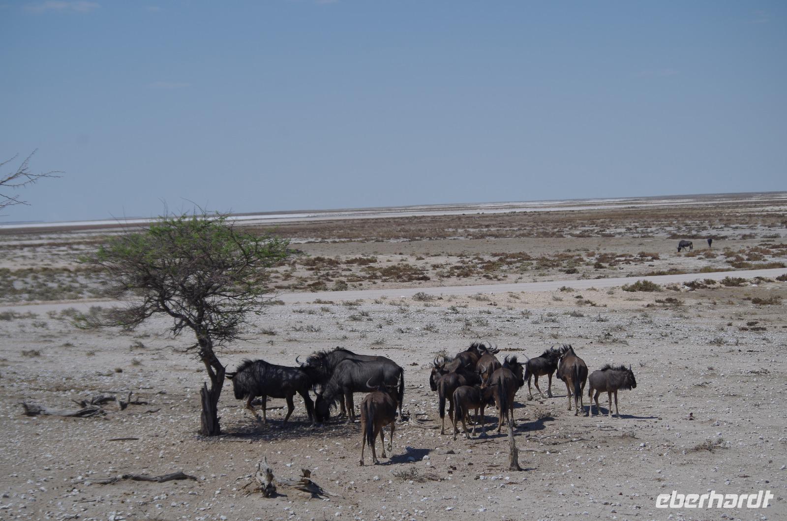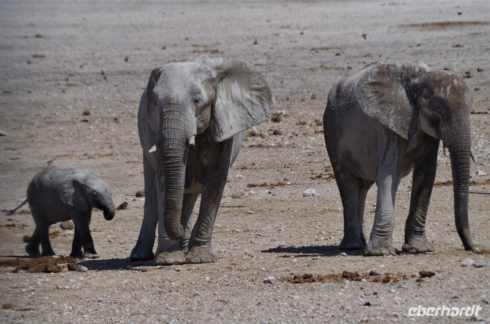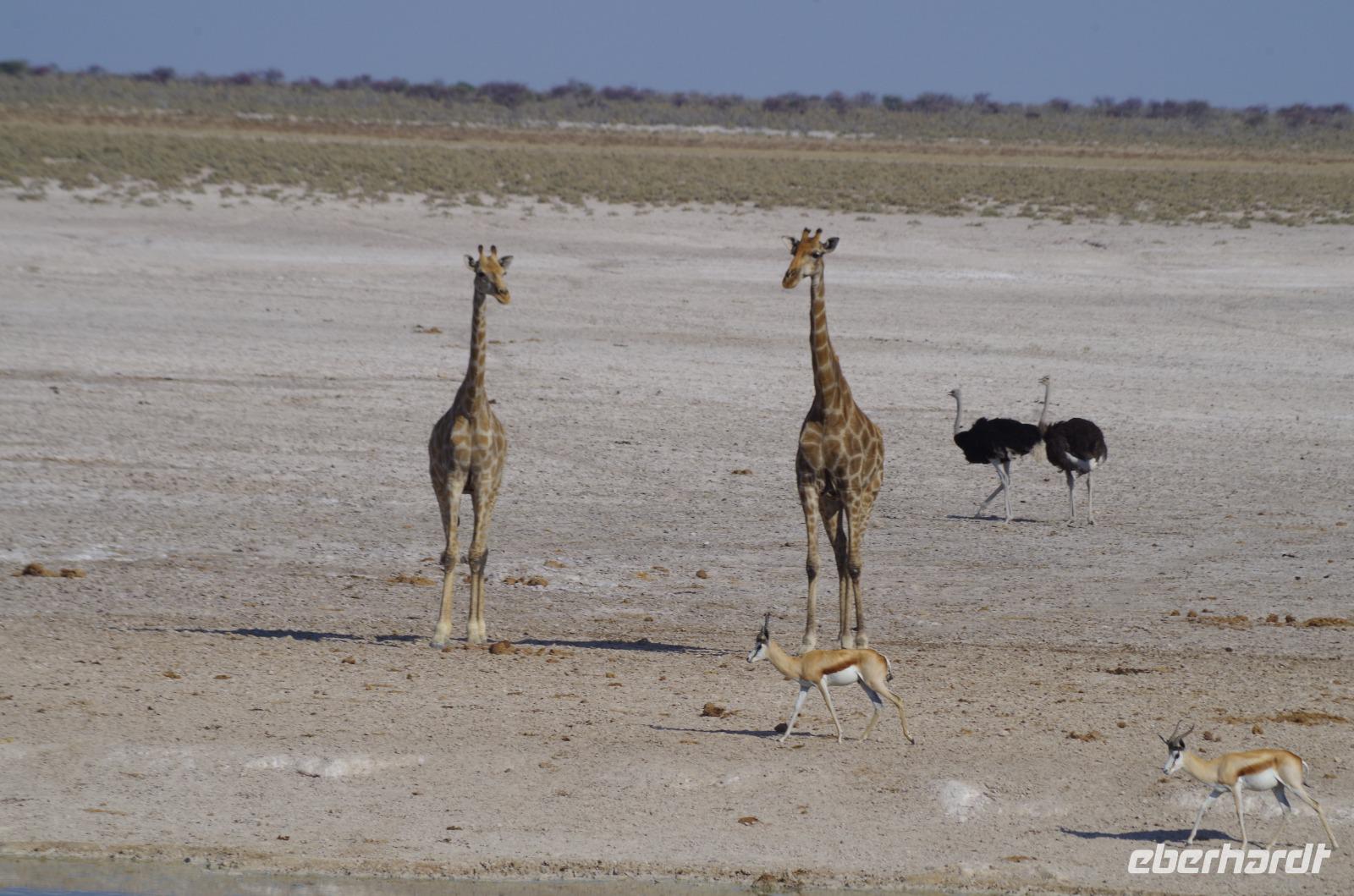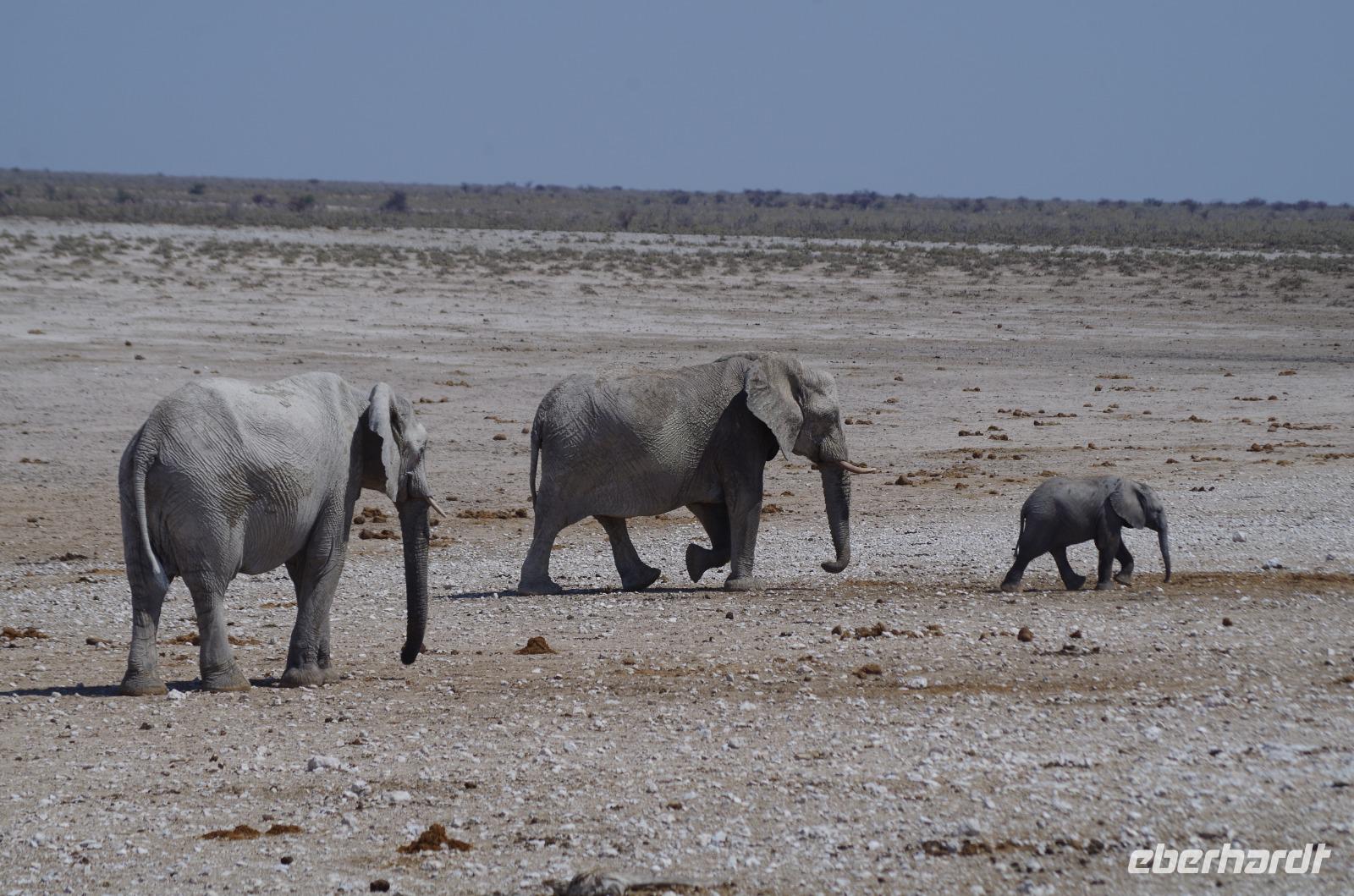 Etosha Nationalpark, wir kommen! Nach einer kurzen und warmen Nacht verließen wir unseren Berg und fuhren zum Anderson-Gate, einem der Eingangstore in den Etosha Nationalpark. Auch heute war es wieder heiß und die Temperaturen erreichten fast wieder magische Werte. Der Etosha war sehr trocken, alles grau und das Gras vertrocknet. Doch schienen die Tiere immer noch etwas zu fressen zu finden. Am ersten Wasserloch Ombika sahen wir Kudus und Sprinkböcke. Zebraherden zogen durch die Weite. Am Wasserloch Nebrowni angekommen, hofften wir auf Löwen. Doch die schienen sich bereits einen Schattenplatz gesucht zu haben. Dennoch gab es viel zu beobachten: stattliche Oryxe, Sprinkböckchen, Zebras und Strauße - eine große, tierrische Ansammlung. Ja, das ist der Vorteil während dieser Trockenheit. Viele Tiere müssen täglich an die Wasserlöcher, um zu trinken. Das ist überlebensnotwendig. Und um Energie zu sparen, halten sie sich den ganzen Tag meist in der Nähe auf. Wir pirschten also weiter zum nächsten Wasserloch. Die Sonne stieg höher und es wurde zunehmend heißer. Springböcke suchten bereits unter dürren, blattlosen Akazienbüschen nach etwas Schatten. Wir fuhren zum Rand der Etosha Pfanne und blickten fasziniert in die weite Weite. Bis zum Horizont nur weißer Sand - Etosha machten seinem Namen alle Ehre: ...großer weißer Platz.... Danach pirschten wir zum nächsten Wasserloch Gemsbokvlakte. Auch hier gaben sich wieder viele Tiere ein StellDichEin: jede Menge Springböcke, Strauße, Zebras und Schiraffen. Wir schauten begeistert zu, wie sich die Tiere am Wasserloch abwechselten. Auf steinigem, trockenen Gelände stolziert später ein Sekretär an uns vorbei. Doch wir hofften auf Elefanten, sahen wir doch überall deren Spuren. Und Fritz, unser Reiseleiter sollte Recht behalten. In den heißen Mittagsstunden kommen die Elefanten ans Wasserloch. Elefanten, Elefanten, Elefanten - juchhu! Ja, wir sahen viele graue, sanfte Riesen. Ein große Herde mit Babyfanten versammelte sich am Wasserloch. Wir betrachteten sie begeistert und mit einem Lächeln auf dem Gesicht. Die eine Herde ging und machte der nächsten Platz..... Eine Herde Gnus stand etwas abseits und wagte sich nicht ans besetzte Wasserloch. Nach einen Stopp in Camp Okaukuejo fuhren wir in unsere Lodge zurück. Tagesetappe: 215 km