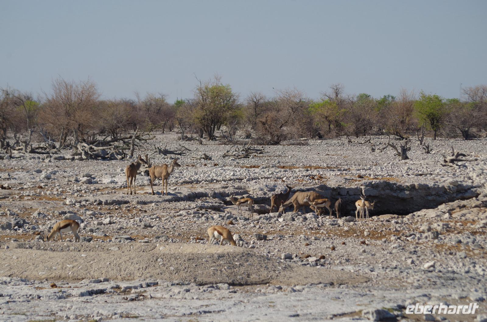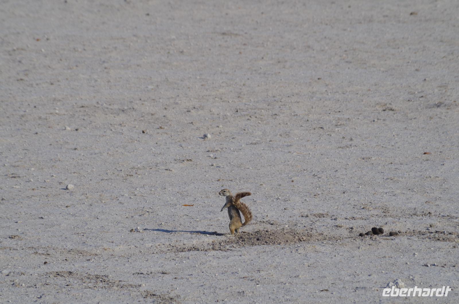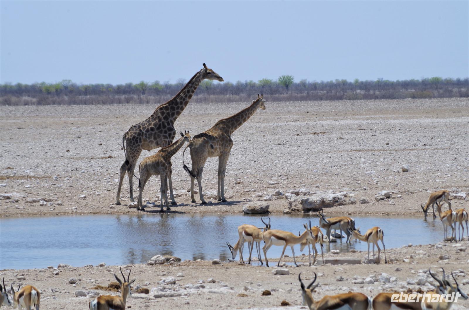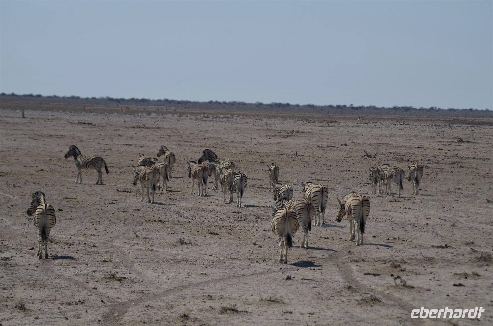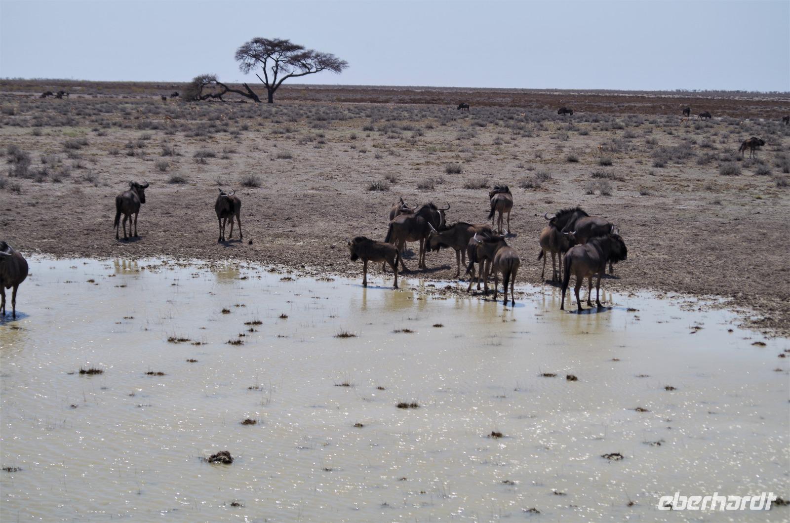Etosha Nationalpark, wir kommen! Nach einer kurzen und warmen Nacht verließen wir unseren Berg und fuhren zum Anderson-Gate, einem der Eingangstore in den Etosha Nationalpark. Auch heute war es wieder heiß und die Temperaturen erreichten fast wieder magische Werte. Der Etosha war sehr trocken, alles grau und das Gras vertrocknet. Doch schienen die Tiere immer noch etwas zu fressen zu finden. Am ersten Wasserloch Ombika sahen wir Kudus und Sprinkböcke. Zebraherden zogen durch die Weite. Am Wasserloch Nebrowni angekommen, hofften wir auf Löwen. Doch die schienen sich bereits einen Schattenplatz gesucht zu haben. Dennoch gab es viel zu beobachten: stattliche Oryxe, Sprinkböckchen, Zebras und Strauße - eine große, tierrische Ansammlung. Ja, das ist der Vorteil während dieser Trockenheit. Viele Tiere müssen täglich an die Wasserlöcher, um zu trinken. Das ist überlebensnotwendig. Und um Energie zu sparen, halten sie sich den ganzen Tag meist in der Nähe auf. Wir pirschten also weiter zum nächsten Wasserloch. Die Sonne stieg höher und es wurde zunehmend heißer. Springböcke suchten bereits unter dürren, blattlosen Akazienbüschen nach etwas Schatten. Wir fuhren zum Rand der Etosha Pfanne und blickten fasziniert in die weite Weite. Bis zum Horizont nur weißer Sand - Etosha machten seinem Namen alle Ehre: ...großer weißer Platz.... Danach pirschten wir zum nächsten Wasserloch Gemsbokvlakte. Auch hier gaben sich wieder viele Tiere ein StellDichEin: jede Menge Springböcke, Strauße, Zebras und Schiraffen. Wir schauten begeistert zu, wie sich die Tiere am Wasserloch abwechselten. Auf steinigem, trockenen Gelände stolziert später ein Sekretär an uns vorbei. Doch wir hofften auf Elefanten, sahen wir doch überall deren Spuren. Und Fritz, unser Reiseleiter sollte Recht behalten. In den heißen Mittagsstunden kommen die Elefanten ans Wasserloch. Elefanten, Elefanten, Elefanten - juchhu! Ja, wir sahen viele graue, sanfte Riesen. Ein große Herde mit Babyfanten versammelte sich am Wasserloch. Wir betrachteten sie begeistert und mit einem Lächeln auf dem Gesicht. Die eine Herde ging und machte der nächsten Platz..... Eine Herde Gnus stand etwas abseits und wagte sich nicht ans besetzte Wasserloch. Nach einen Stopp in Camp Okaukuejo fuhren wir in unsere Lodge zurück. Tagesetappe: 215 km