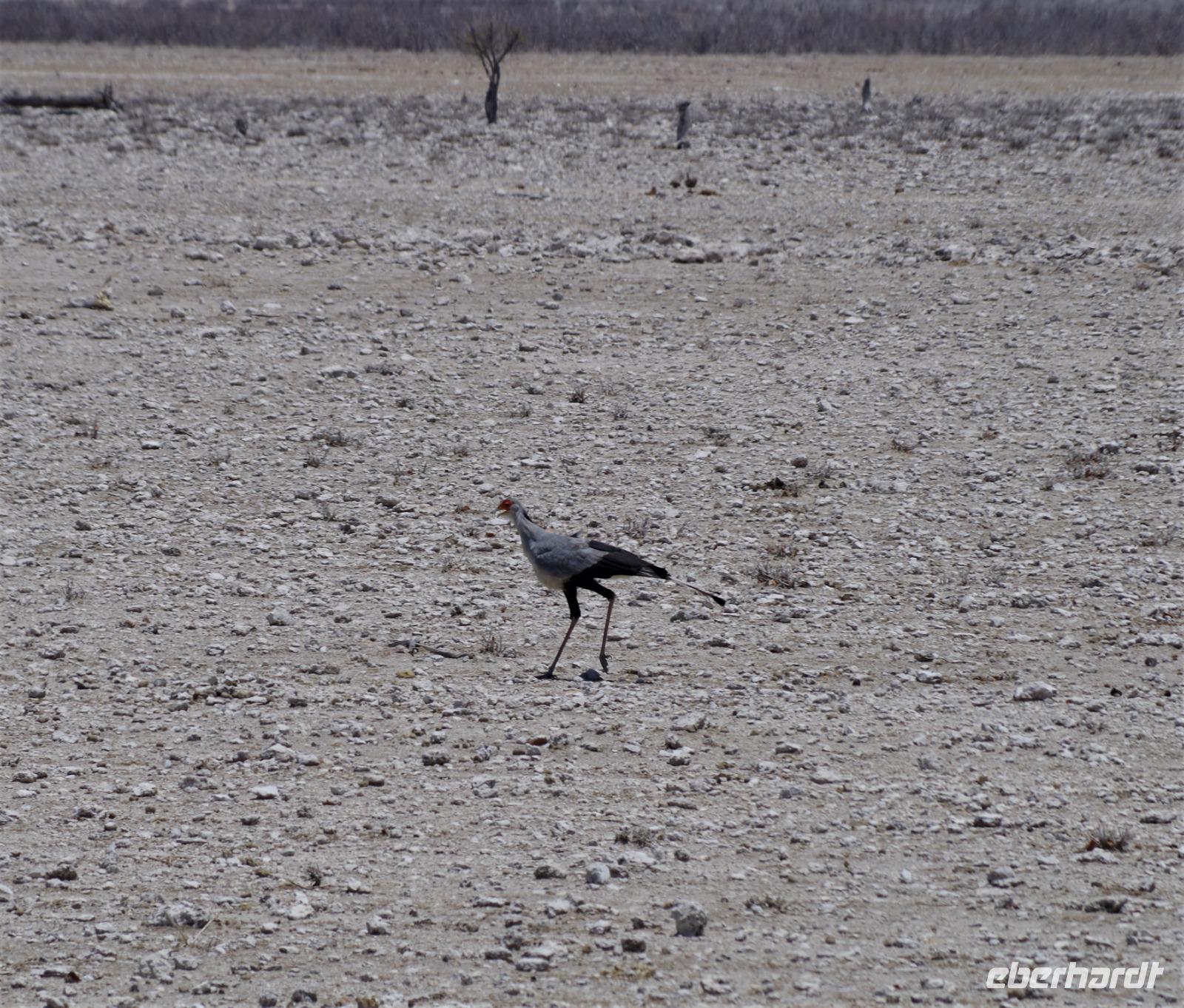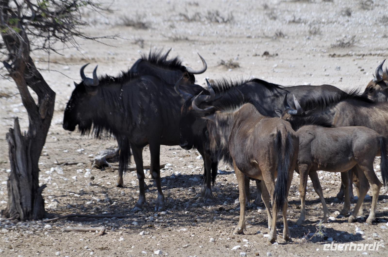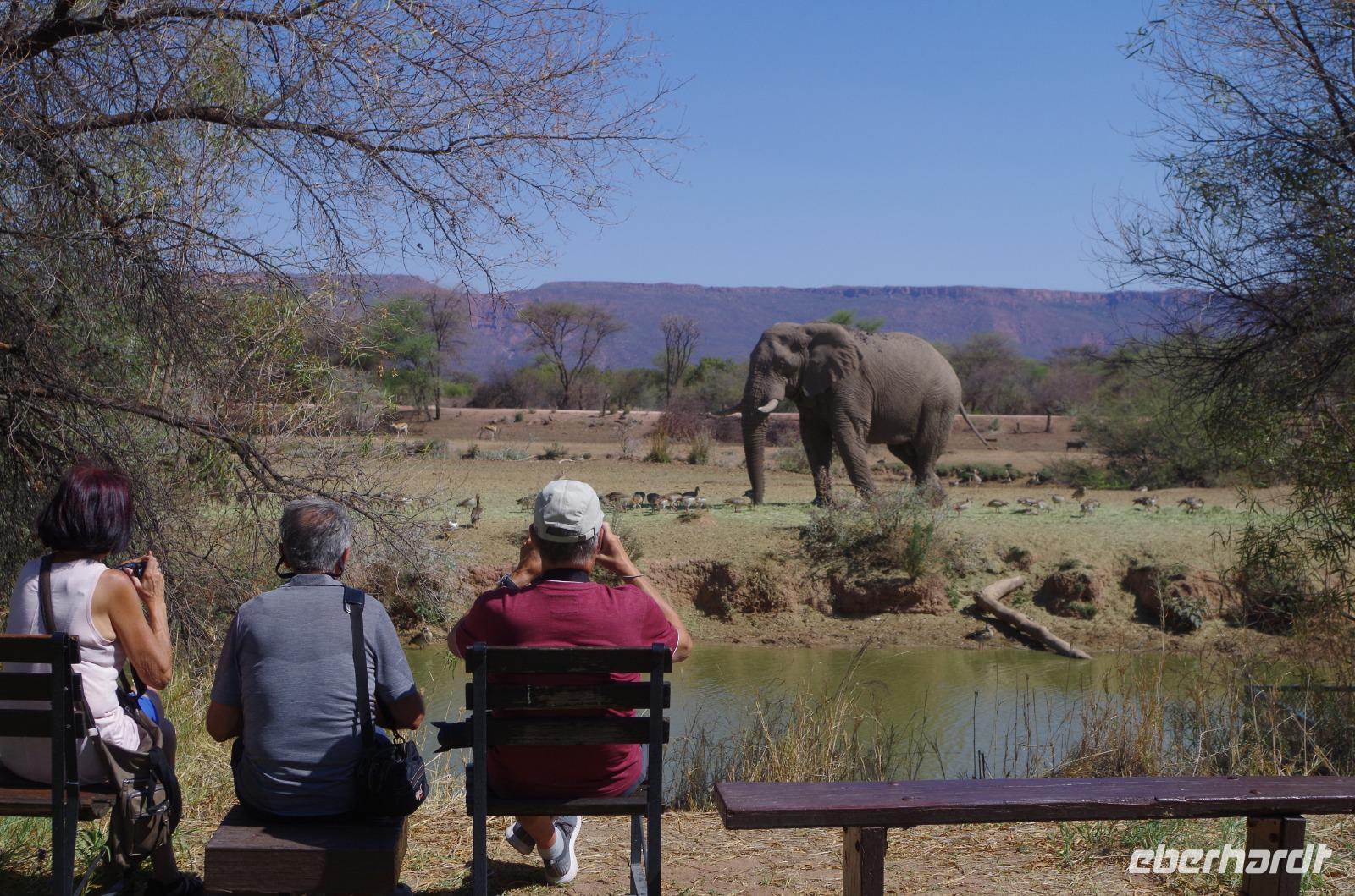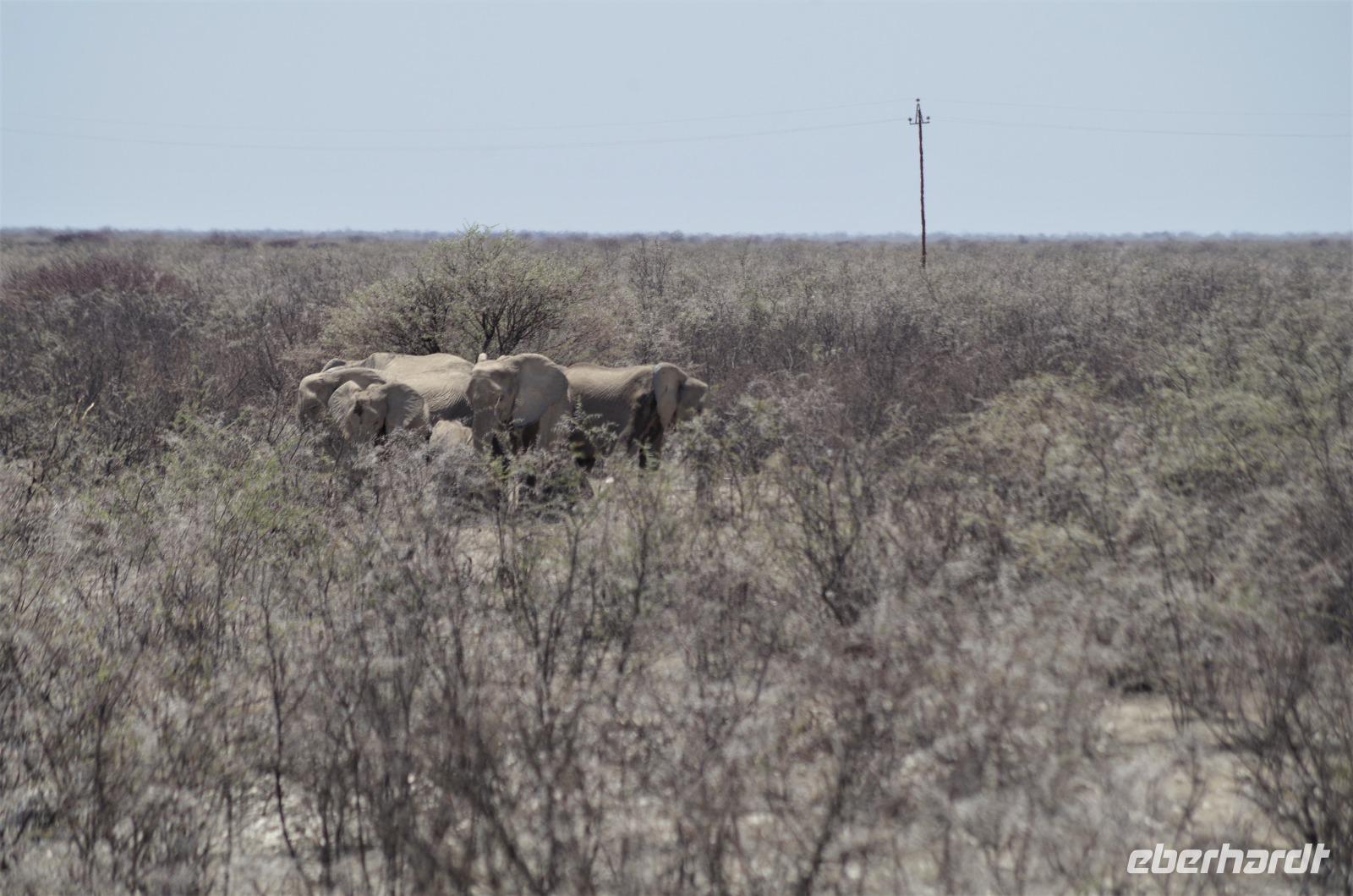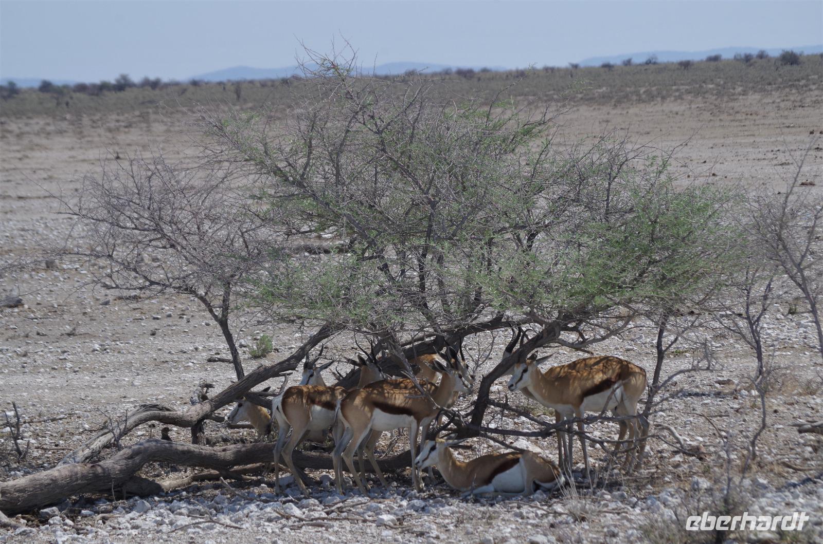 Etosha Nationalpark, wir kommen! Nach einer kurzen und warmen Nacht verließen wir unseren Berg und fuhren zum Anderson-Gate, einem der Eingangstore in den Etosha Nationalpark. Auch heute war es wieder heiß und die Temperaturen erreichten fast wieder magische Werte. Der Etosha war sehr trocken, alles grau und das Gras vertrocknet. Doch schienen die Tiere immer noch etwas zu fressen zu finden. Am ersten Wasserloch Ombika sahen wir Kudus und Sprinkböcke. Zebraherden zogen durch die Weite. Am Wasserloch Nebrowni angekommen, hofften wir auf Löwen. Doch die schienen sich bereits einen Schattenplatz gesucht zu haben. Dennoch gab es viel zu beobachten: stattliche Oryxe, Sprinkböckchen, Zebras und Strauße - eine große, tierrische Ansammlung. Ja, das ist der Vorteil während dieser Trockenheit. Viele Tiere müssen täglich an die Wasserlöcher, um zu trinken. Das ist überlebensnotwendig. Und um Energie zu sparen, halten sie sich den ganzen Tag meist in der Nähe auf. Wir pirschten also weiter zum nächsten Wasserloch. Die Sonne stieg höher und es wurde zunehmend heißer. Springböcke suchten bereits unter dürren, blattlosen Akazienbüschen nach etwas Schatten. Wir fuhren zum Rand der Etosha Pfanne und blickten fasziniert in die weite Weite. Bis zum Horizont nur weißer Sand - Etosha machten seinem Namen alle Ehre: ...großer weißer Platz.... Danach pirschten wir zum nächsten Wasserloch Gemsbokvlakte. Auch hier gaben sich wieder viele Tiere ein StellDichEin: jede Menge Springböcke, Strauße, Zebras und Schiraffen. Wir schauten begeistert zu, wie sich die Tiere am Wasserloch abwechselten. Auf steinigem, trockenen Gelände stolziert später ein Sekretär an uns vorbei. Doch wir hofften auf Elefanten, sahen wir doch überall deren Spuren. Und Fritz, unser Reiseleiter sollte Recht behalten. In den heißen Mittagsstunden kommen die Elefanten ans Wasserloch. Elefanten, Elefanten, Elefanten - juchhu! Ja, wir sahen viele graue, sanfte Riesen. Ein große Herde mit Babyfanten versammelte sich am Wasserloch. Wir betrachteten sie begeistert und mit einem Lächeln auf dem Gesicht. Die eine Herde ging und machte der nächsten Platz..... Eine Herde Gnus stand etwas abseits und wagte sich nicht ans besetzte Wasserloch. Nach einen Stopp in Camp Okaukuejo fuhren wir in unsere Lodge zurück. Tagesetappe: 215 km