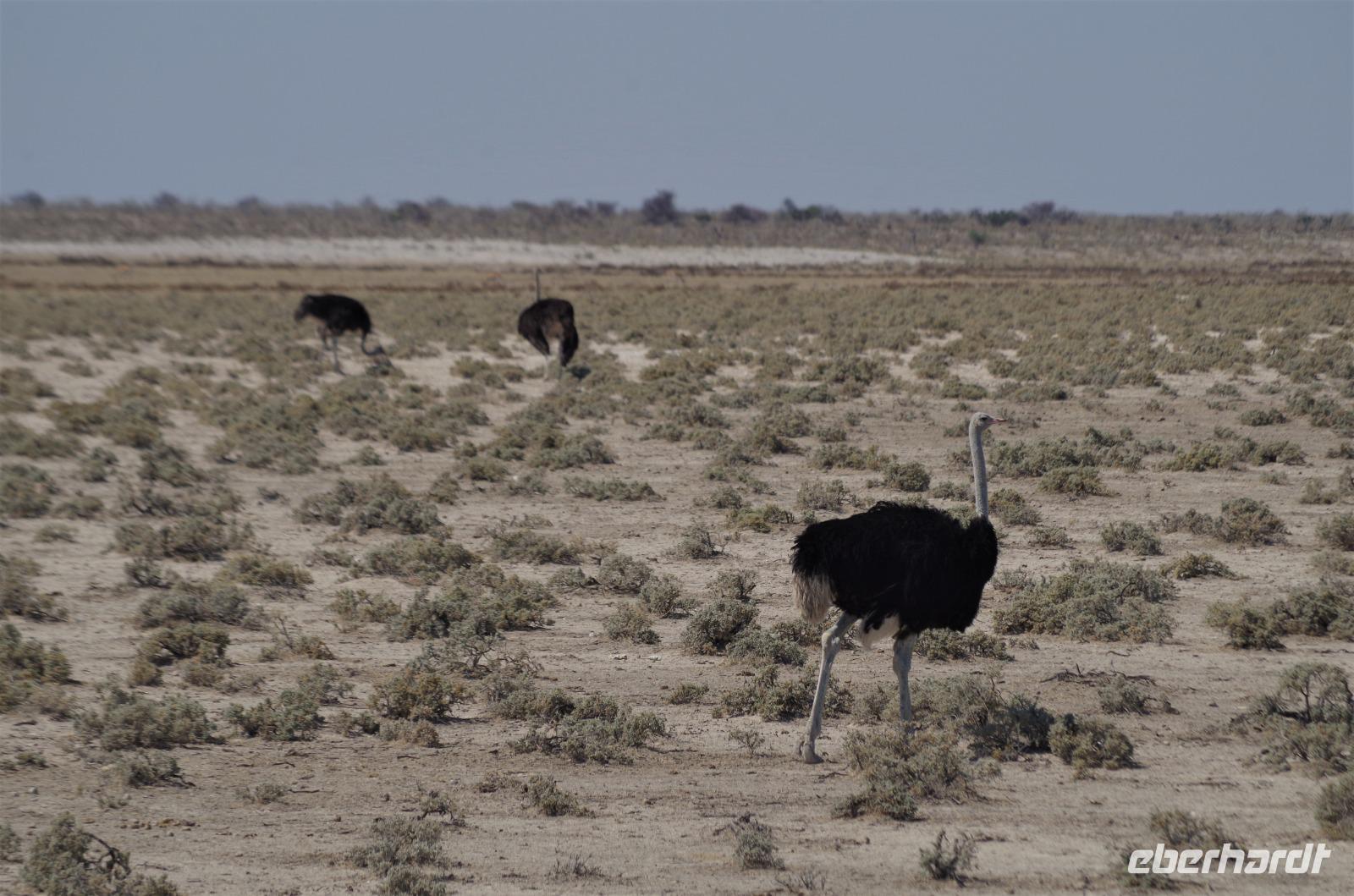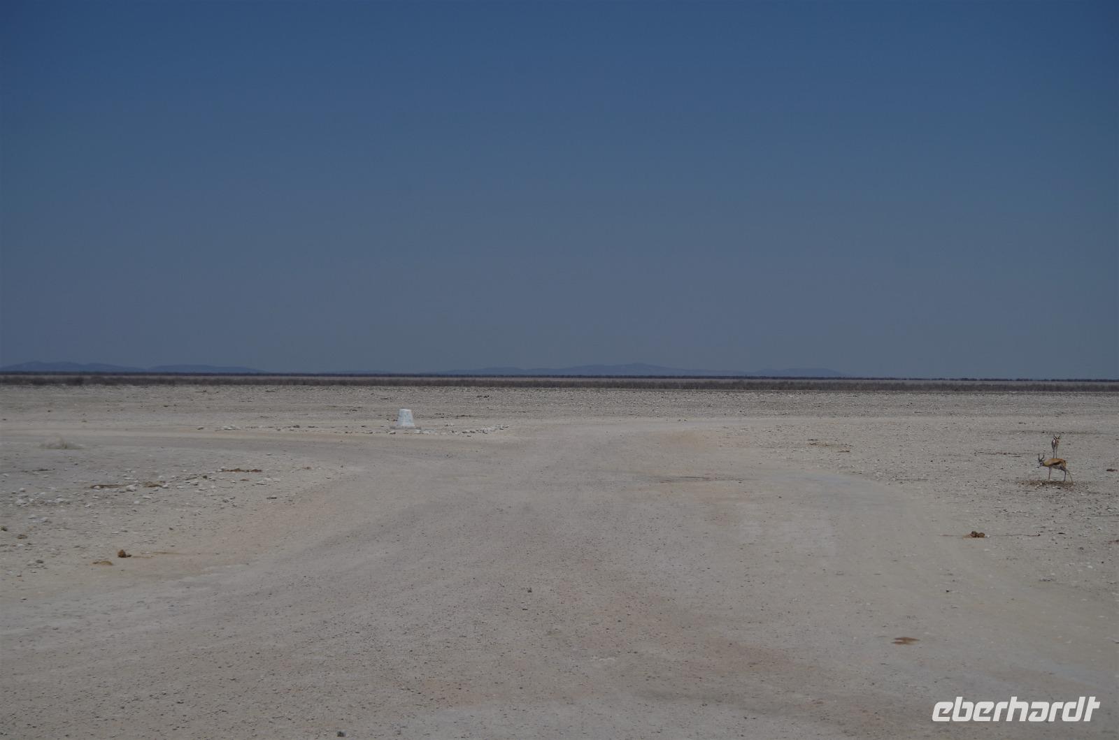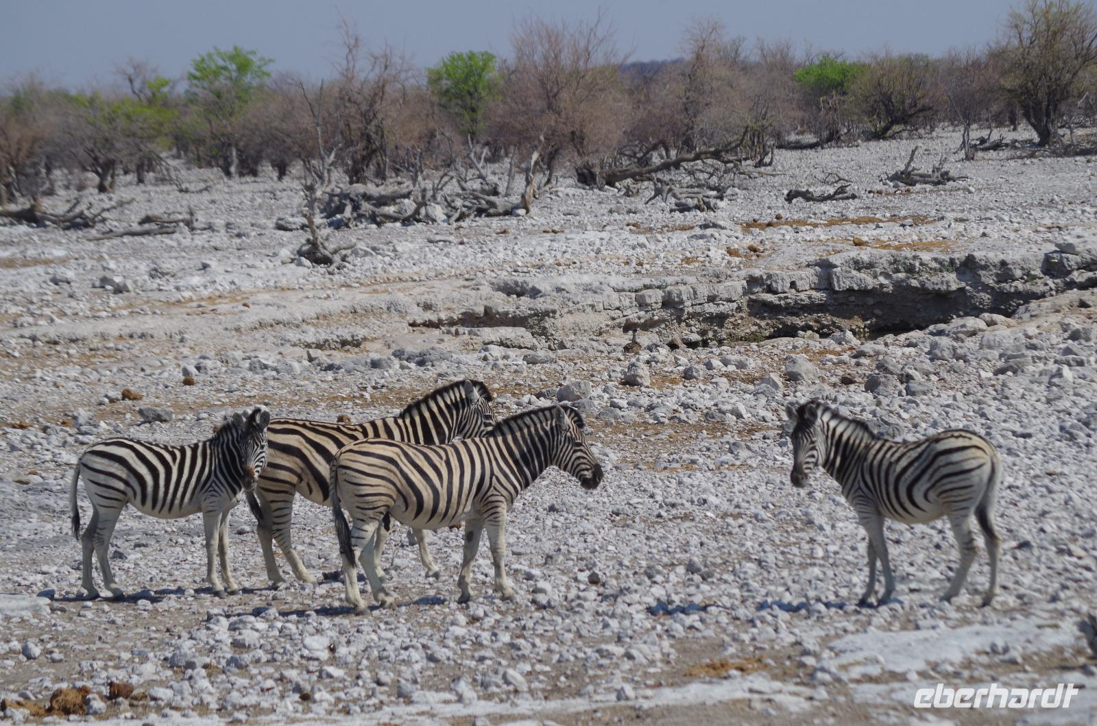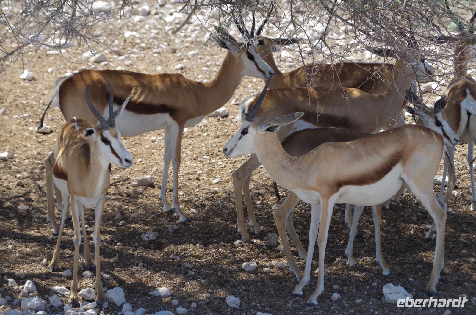 Etosha Nationalpark, wir kommen! Nach einer kurzen und warmen Nacht verließen wir unseren Berg und fuhren zum Anderson-Gate, einem der Eingangstore in den Etosha Nationalpark. Auch heute war es wieder heiß und die Temperaturen erreichten fast wieder magische Werte. Der Etosha war sehr trocken, alles grau und das Gras vertrocknet. Doch schienen die Tiere immer noch etwas zu fressen zu finden. Am ersten Wasserloch Ombika sahen wir Kudus und Sprinkböcke. Zebraherden zogen durch die Weite. Am Wasserloch Nebrowni angekommen, hofften wir auf Löwen. Doch die schienen sich bereits einen Schattenplatz gesucht zu haben. Dennoch gab es viel zu beobachten: stattliche Oryxe, Sprinkböckchen, Zebras und Strauße - eine große, tierrische Ansammlung. Ja, das ist der Vorteil während dieser Trockenheit. Viele Tiere müssen täglich an die Wasserlöcher, um zu trinken. Das ist überlebensnotwendig. Und um Energie zu sparen, halten sie sich den ganzen Tag meist in der Nähe auf. Wir pirschten also weiter zum nächsten Wasserloch. Die Sonne stieg höher und es wurde zunehmend heißer. Springböcke suchten bereits unter dürren, blattlosen Akazienbüschen nach etwas Schatten. Wir fuhren zum Rand der Etosha Pfanne und blickten fasziniert in die weite Weite. Bis zum Horizont nur weißer Sand - Etosha machten seinem Namen alle Ehre: ...großer weißer Platz.... Danach pirschten wir zum nächsten Wasserloch Gemsbokvlakte. Auch hier gaben sich wieder viele Tiere ein StellDichEin: jede Menge Springböcke, Strauße, Zebras und Schiraffen. Wir schauten begeistert zu, wie sich die Tiere am Wasserloch abwechselten. Auf steinigem, trockenen Gelände stolziert später ein Sekretär an uns vorbei. Doch wir hofften auf Elefanten, sahen wir doch überall deren Spuren. Und Fritz, unser Reiseleiter sollte Recht behalten. In den heißen Mittagsstunden kommen die Elefanten ans Wasserloch. Elefanten, Elefanten, Elefanten - juchhu! Ja, wir sahen viele graue, sanfte Riesen. Ein große Herde mit Babyfanten versammelte sich am Wasserloch. Wir betrachteten sie begeistert und mit einem Lächeln auf dem Gesicht. Die eine Herde ging und machte der nächsten Platz..... Eine Herde Gnus stand etwas abseits und wagte sich nicht ans besetzte Wasserloch. Nach einen Stopp in Camp Okaukuejo fuhren wir in unsere Lodge zurück. Tagesetappe: 215 km