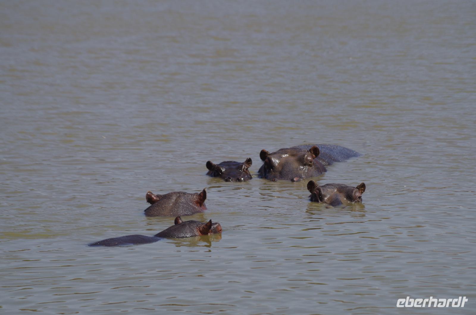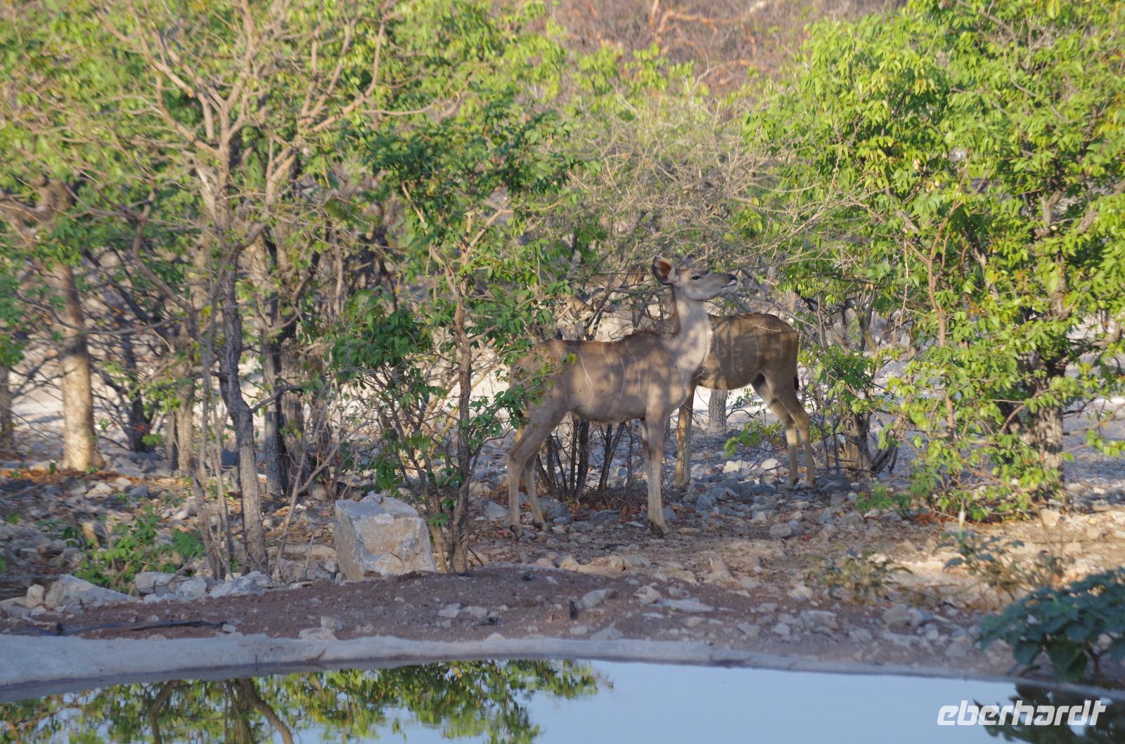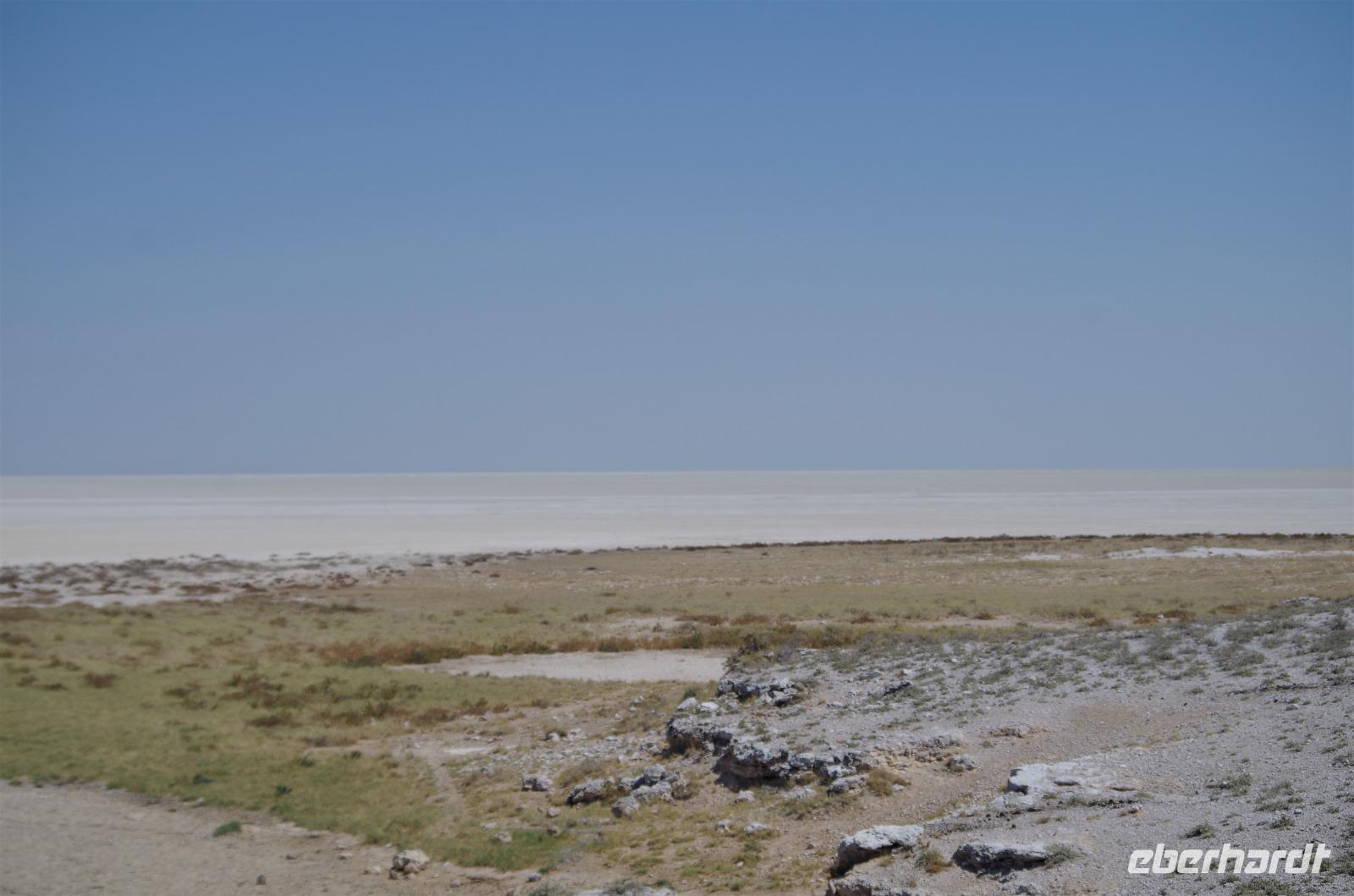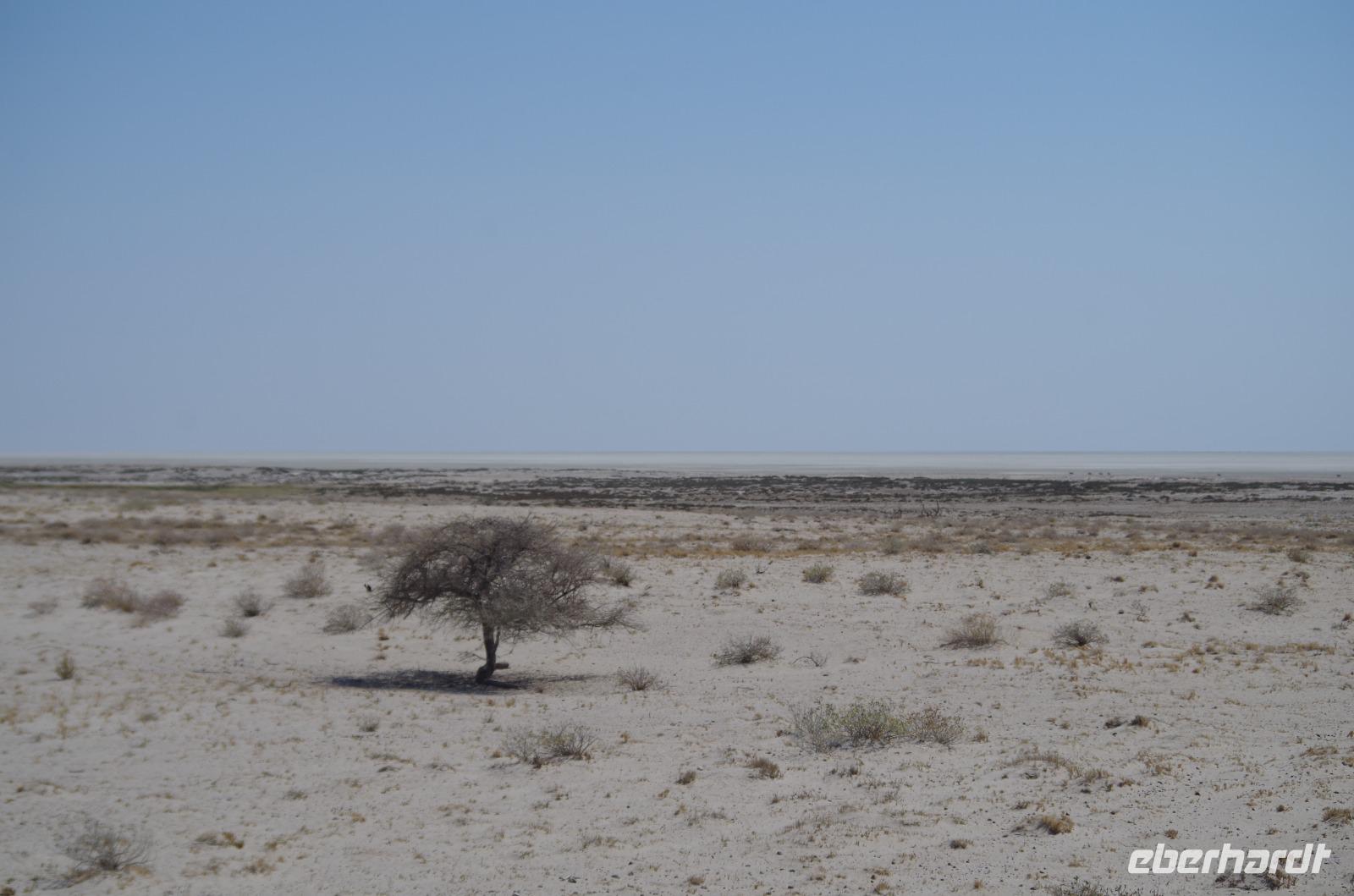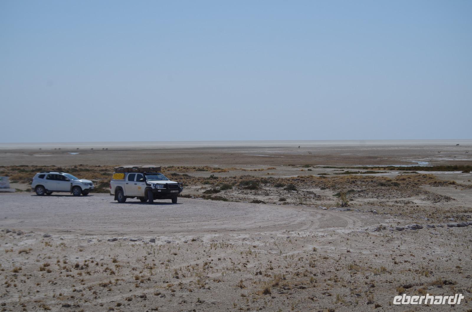Etosha Nationalpark, wir kommen! Nach einer kurzen und warmen Nacht verließen wir unseren Berg und fuhren zum Anderson-Gate, einem der Eingangstore in den Etosha Nationalpark. Auch heute war es wieder heiß und die Temperaturen erreichten fast wieder magische Werte. Der Etosha war sehr trocken, alles grau und das Gras vertrocknet. Doch schienen die Tiere immer noch etwas zu fressen zu finden. Am ersten Wasserloch Ombika sahen wir Kudus und Sprinkböcke. Zebraherden zogen durch die Weite. Am Wasserloch Nebrowni angekommen, hofften wir auf Löwen. Doch die schienen sich bereits einen Schattenplatz gesucht zu haben. Dennoch gab es viel zu beobachten: stattliche Oryxe, Sprinkböckchen, Zebras und Strauße - eine große, tierrische Ansammlung. Ja, das ist der Vorteil während dieser Trockenheit. Viele Tiere müssen täglich an die Wasserlöcher, um zu trinken. Das ist überlebensnotwendig. Und um Energie zu sparen, halten sie sich den ganzen Tag meist in der Nähe auf. Wir pirschten also weiter zum nächsten Wasserloch. Die Sonne stieg höher und es wurde zunehmend heißer. Springböcke suchten bereits unter dürren, blattlosen Akazienbüschen nach etwas Schatten. Wir fuhren zum Rand der Etosha Pfanne und blickten fasziniert in die weite Weite. Bis zum Horizont nur weißer Sand - Etosha machten seinem Namen alle Ehre: ...großer weißer Platz.... Danach pirschten wir zum nächsten Wasserloch Gemsbokvlakte. Auch hier gaben sich wieder viele Tiere ein StellDichEin: jede Menge Springböcke, Strauße, Zebras und Schiraffen. Wir schauten begeistert zu, wie sich die Tiere am Wasserloch abwechselten. Auf steinigem, trockenen Gelände stolziert später ein Sekretär an uns vorbei. Doch wir hofften auf Elefanten, sahen wir doch überall deren Spuren. Und Fritz, unser Reiseleiter sollte Recht behalten. In den heißen Mittagsstunden kommen die Elefanten ans Wasserloch. Elefanten, Elefanten, Elefanten - juchhu! Ja, wir sahen viele graue, sanfte Riesen. Ein große Herde mit Babyfanten versammelte sich am Wasserloch. Wir betrachteten sie begeistert und mit einem Lächeln auf dem Gesicht. Die eine Herde ging und machte der nächsten Platz..... Eine Herde Gnus stand etwas abseits und wagte sich nicht ans besetzte Wasserloch. Nach einen Stopp in Camp Okaukuejo fuhren wir in unsere Lodge zurück. Tagesetappe: 215 km